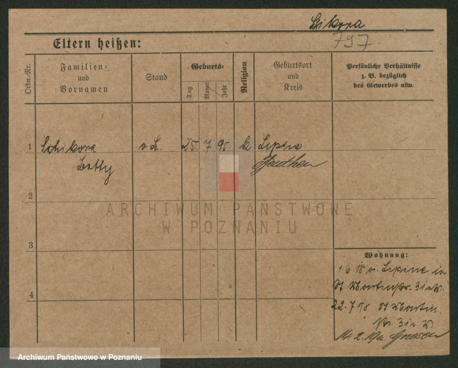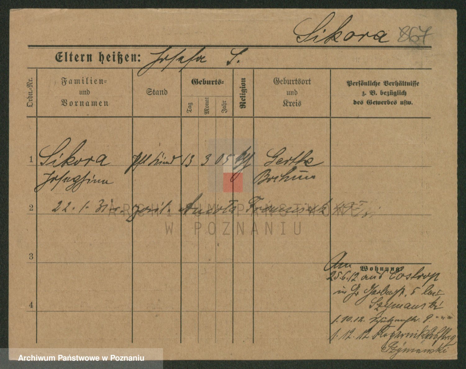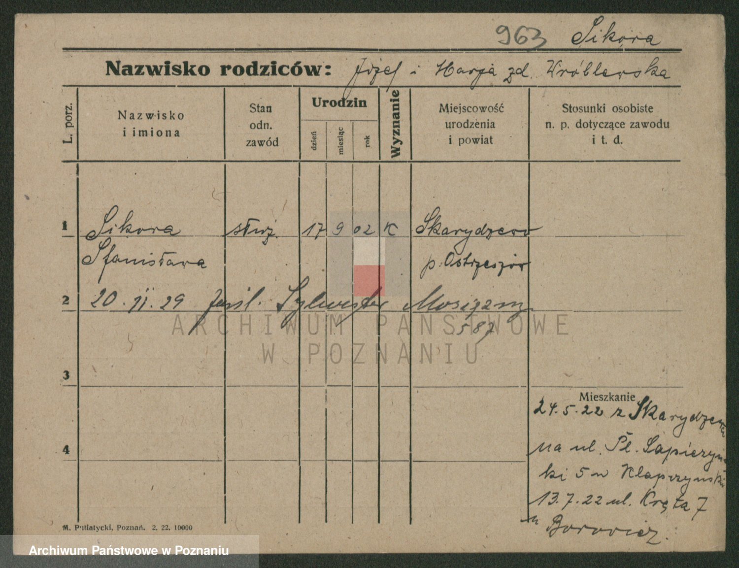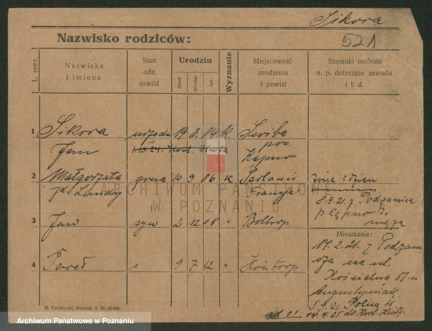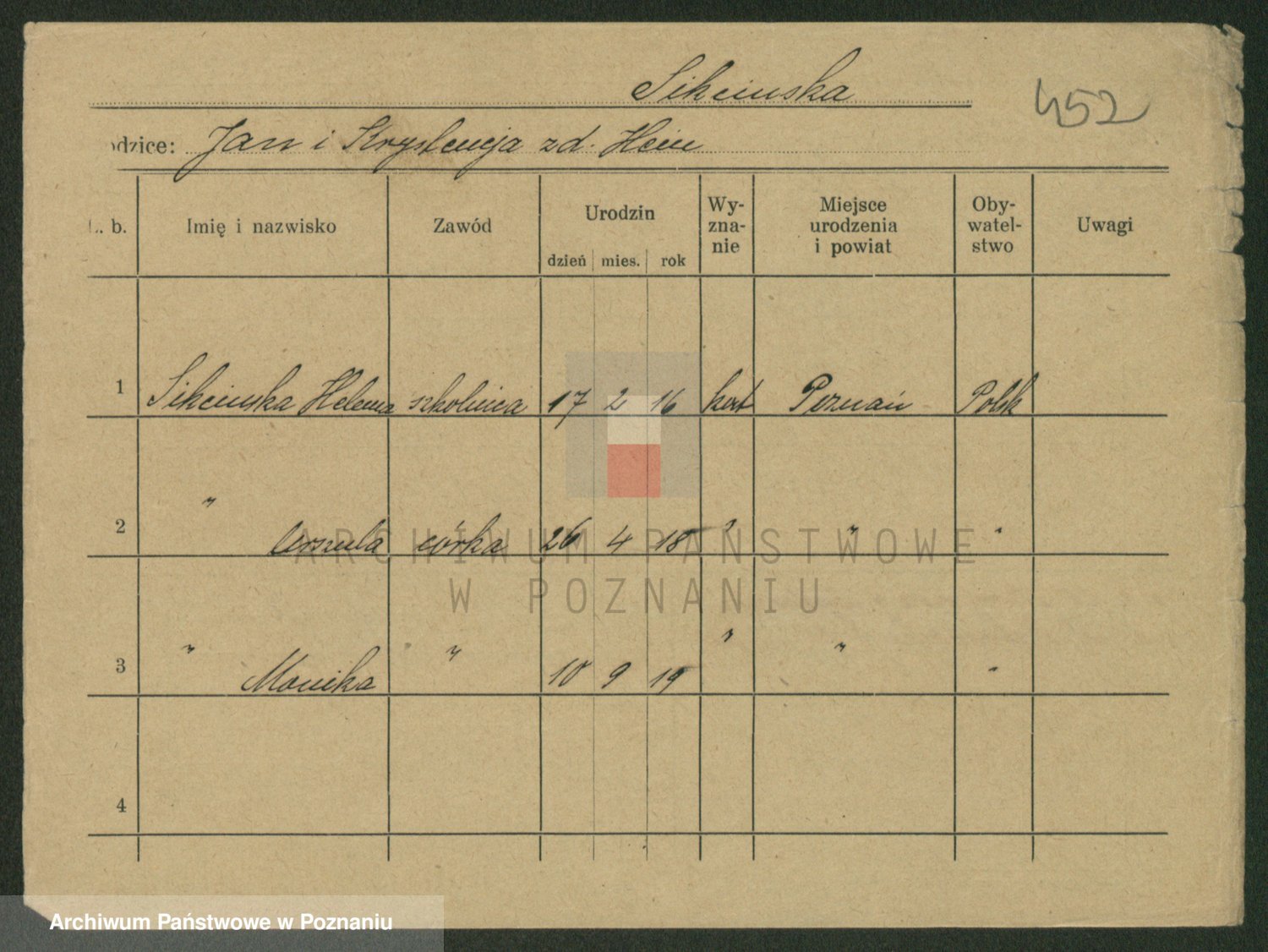 Podgląd karty osobowej dostępny jest po kliknięciu na nazwisko lub ikonkę karty. Można dokonywać powiększenia (ikony na górze) lub przechodzić między kolejnymi skanami (strzałki po bokach).