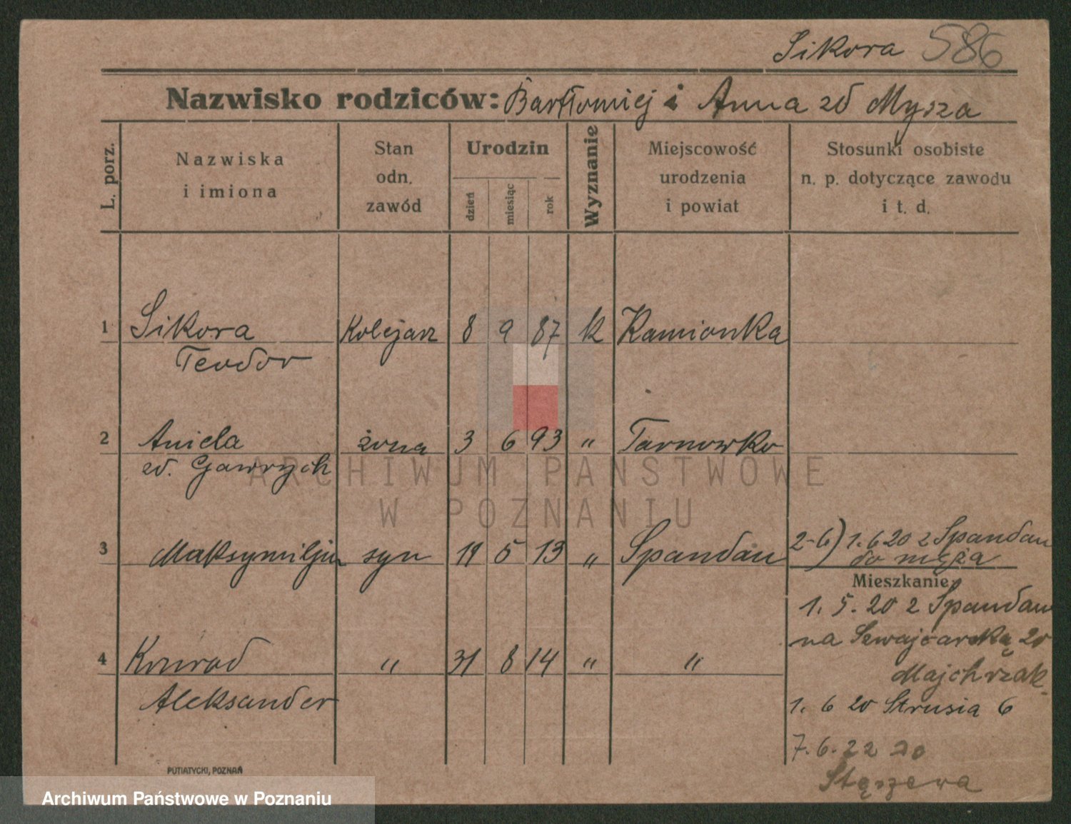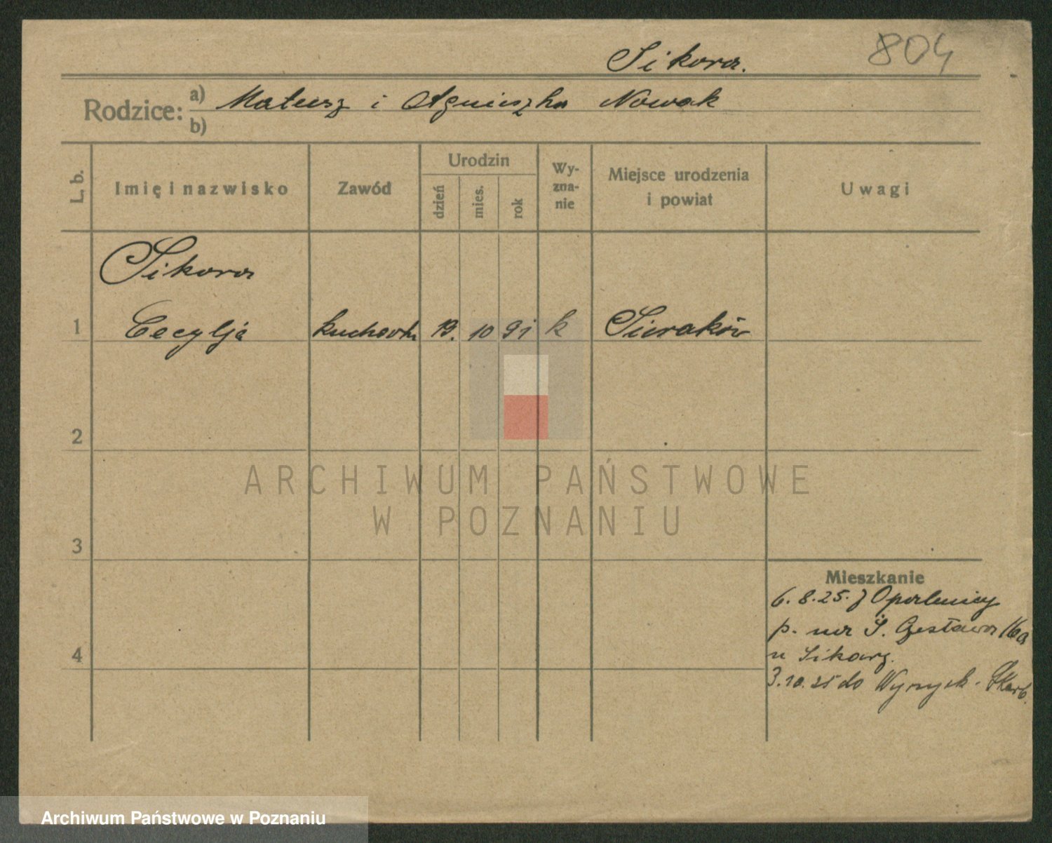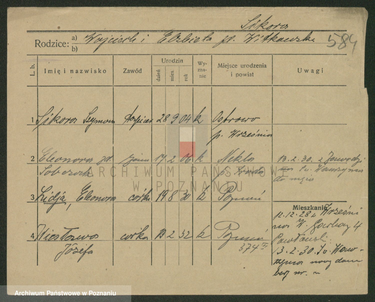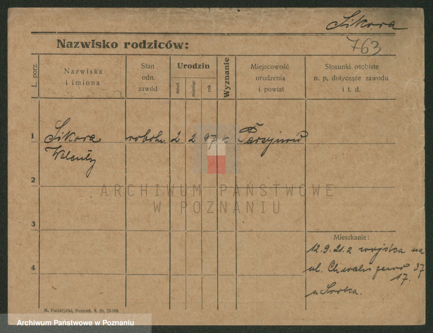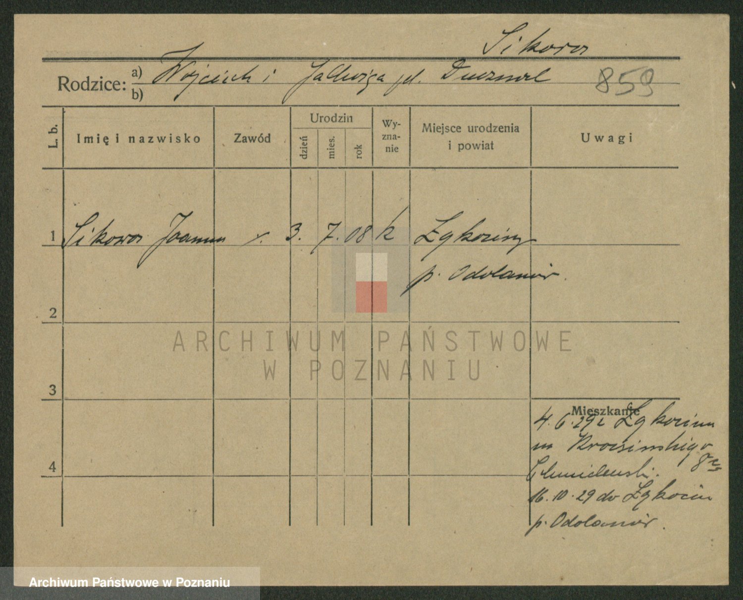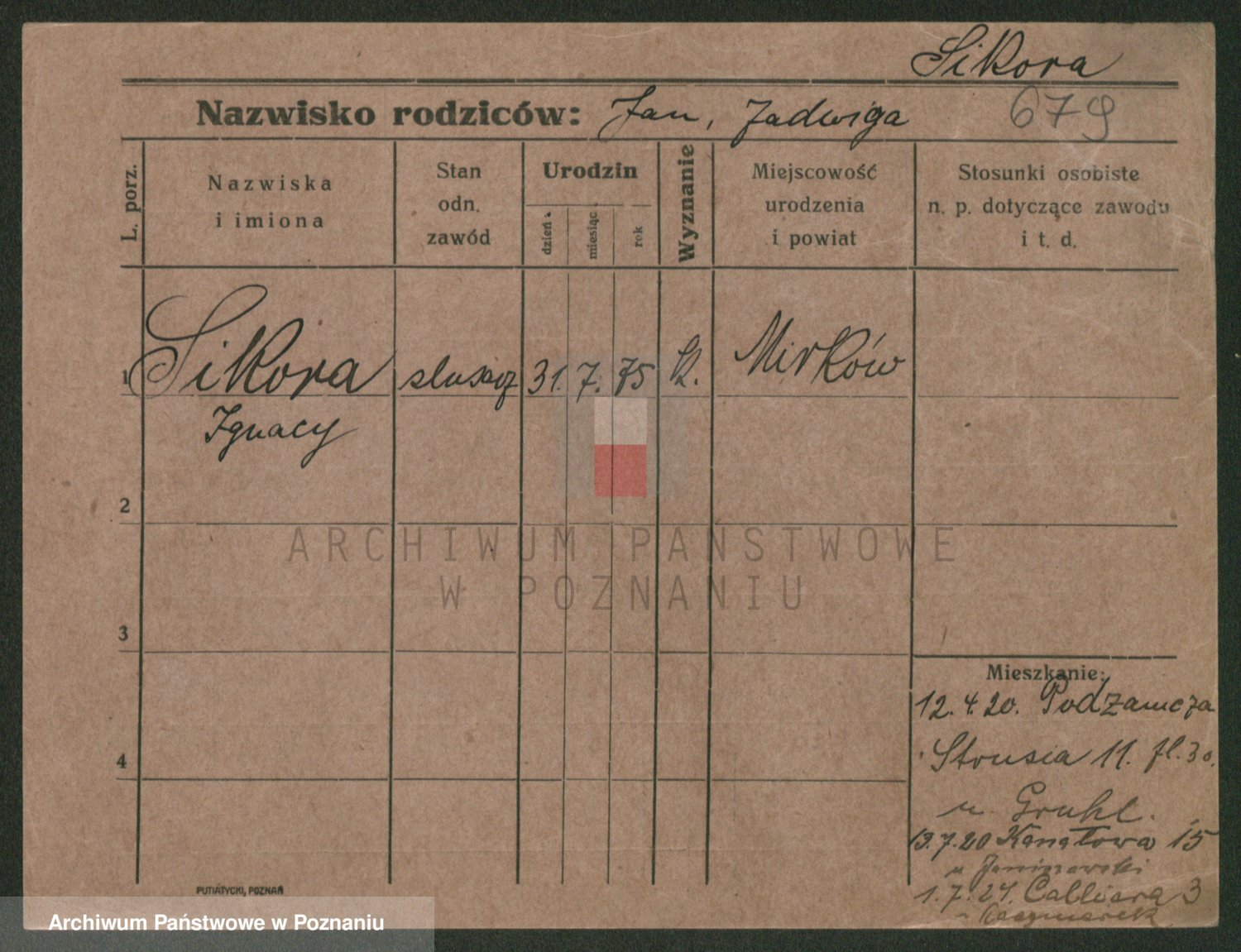 Podgląd karty osobowej dostępny jest po kliknięciu na nazwisko lub ikonkę karty. Można dokonywać powiększenia (ikony na górze) lub przechodzić między kolejnymi skanami (strzałki po bokach).
