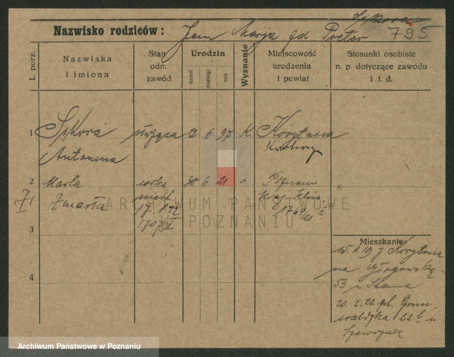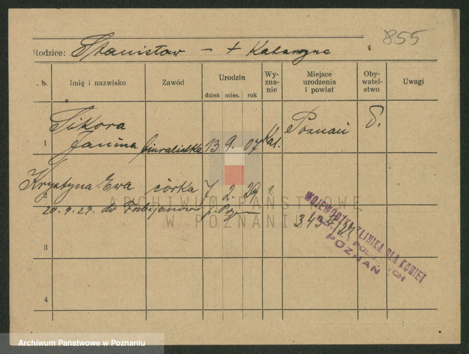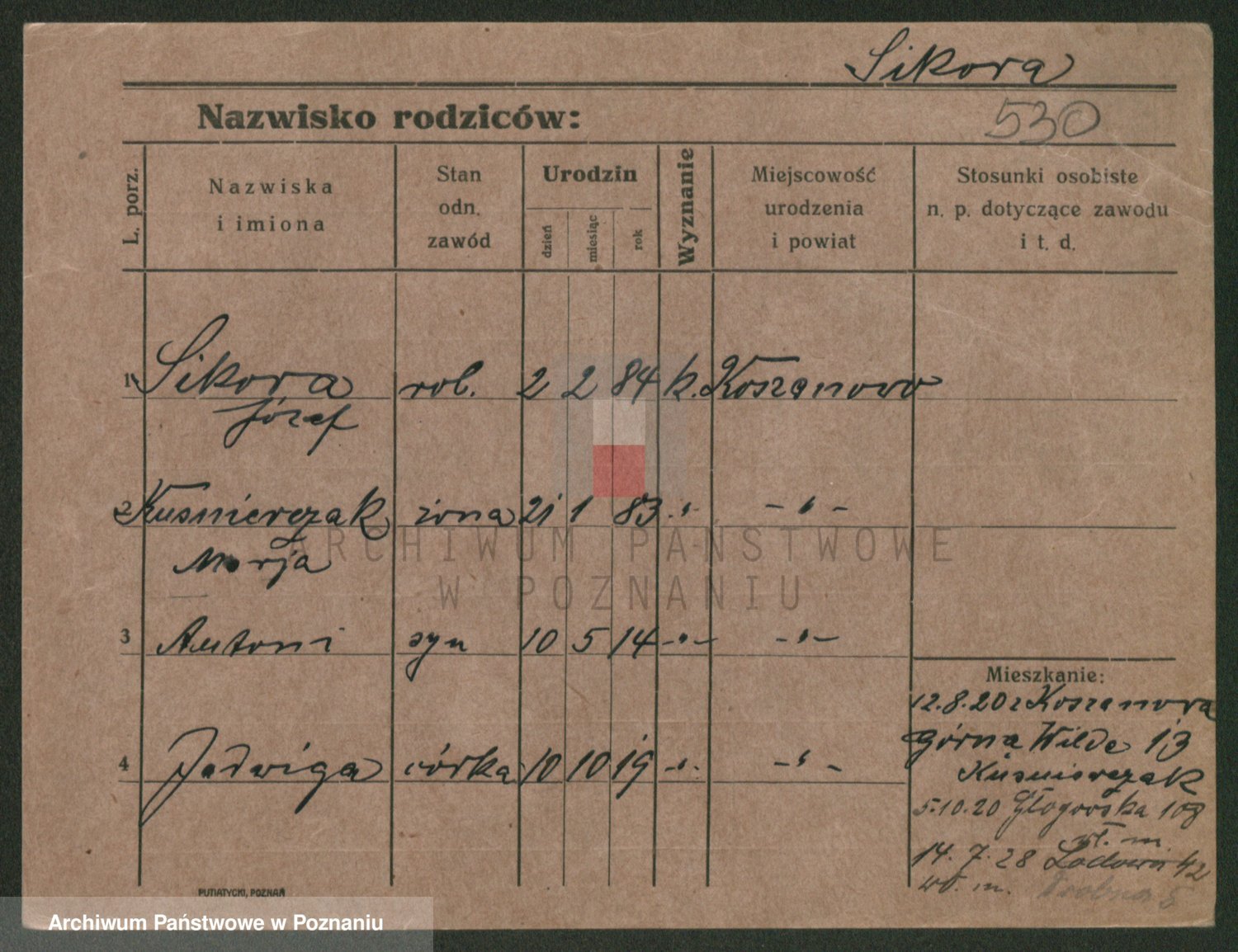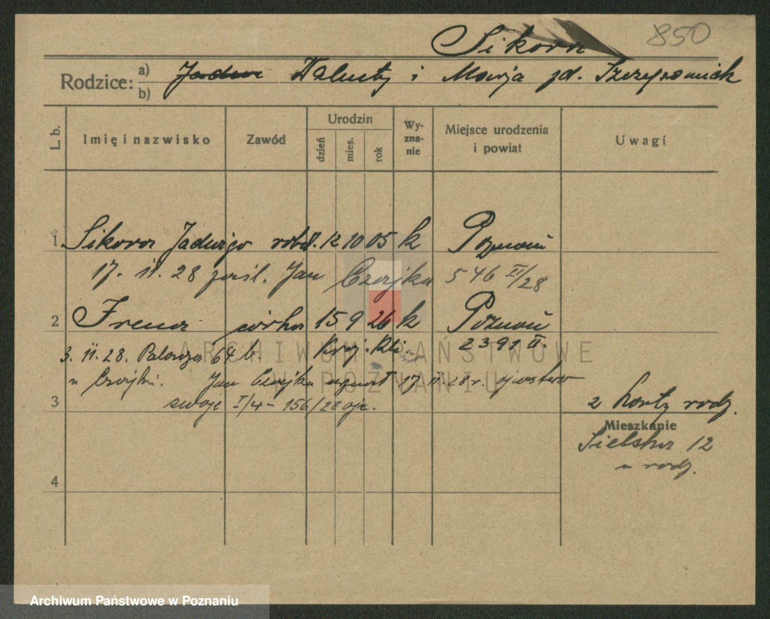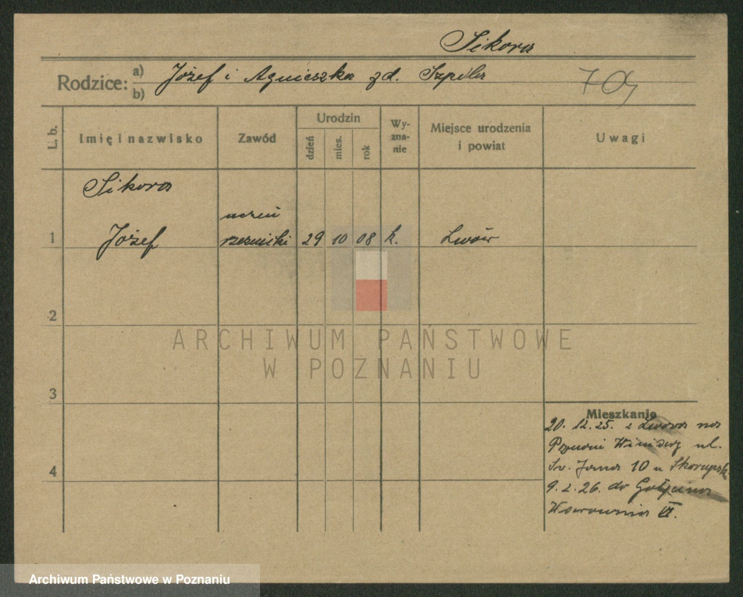 Podgląd karty osobowej dostępny jest po kliknięciu na nazwisko lub ikonkę karty. Można dokonywać powiększenia (ikony na górze) lub przechodzić między kolejnymi skanami (strzałki po bokach).
