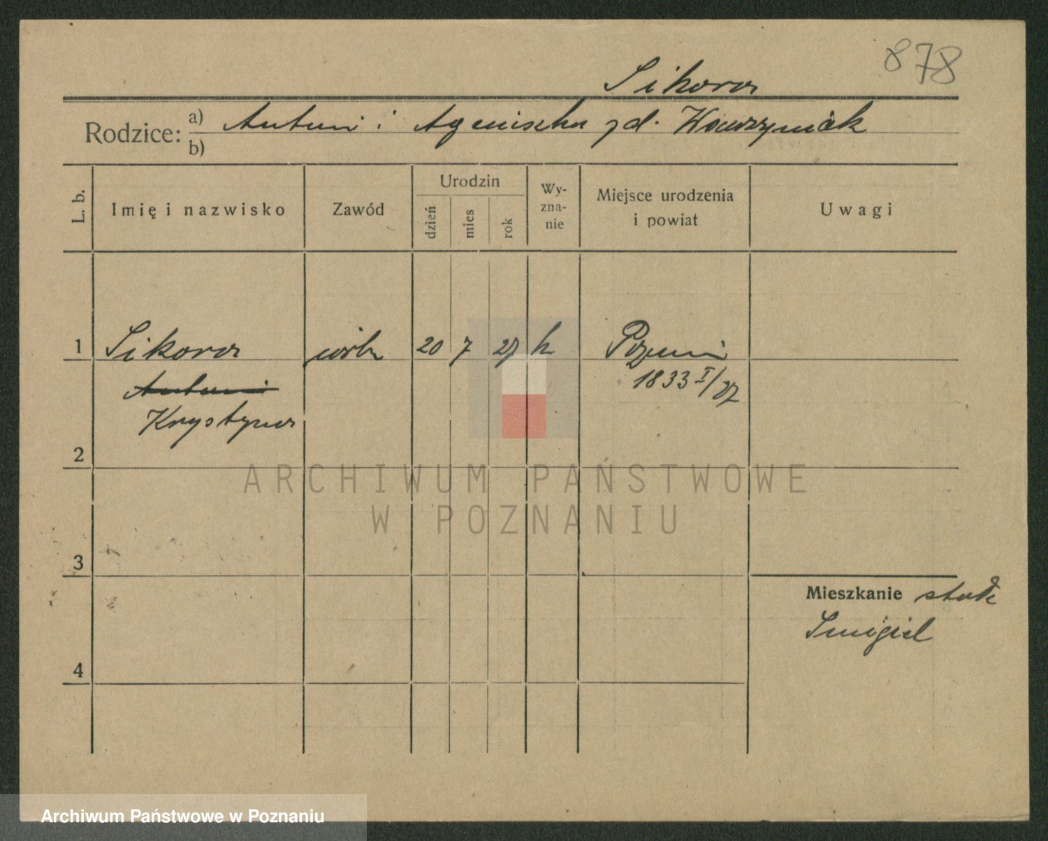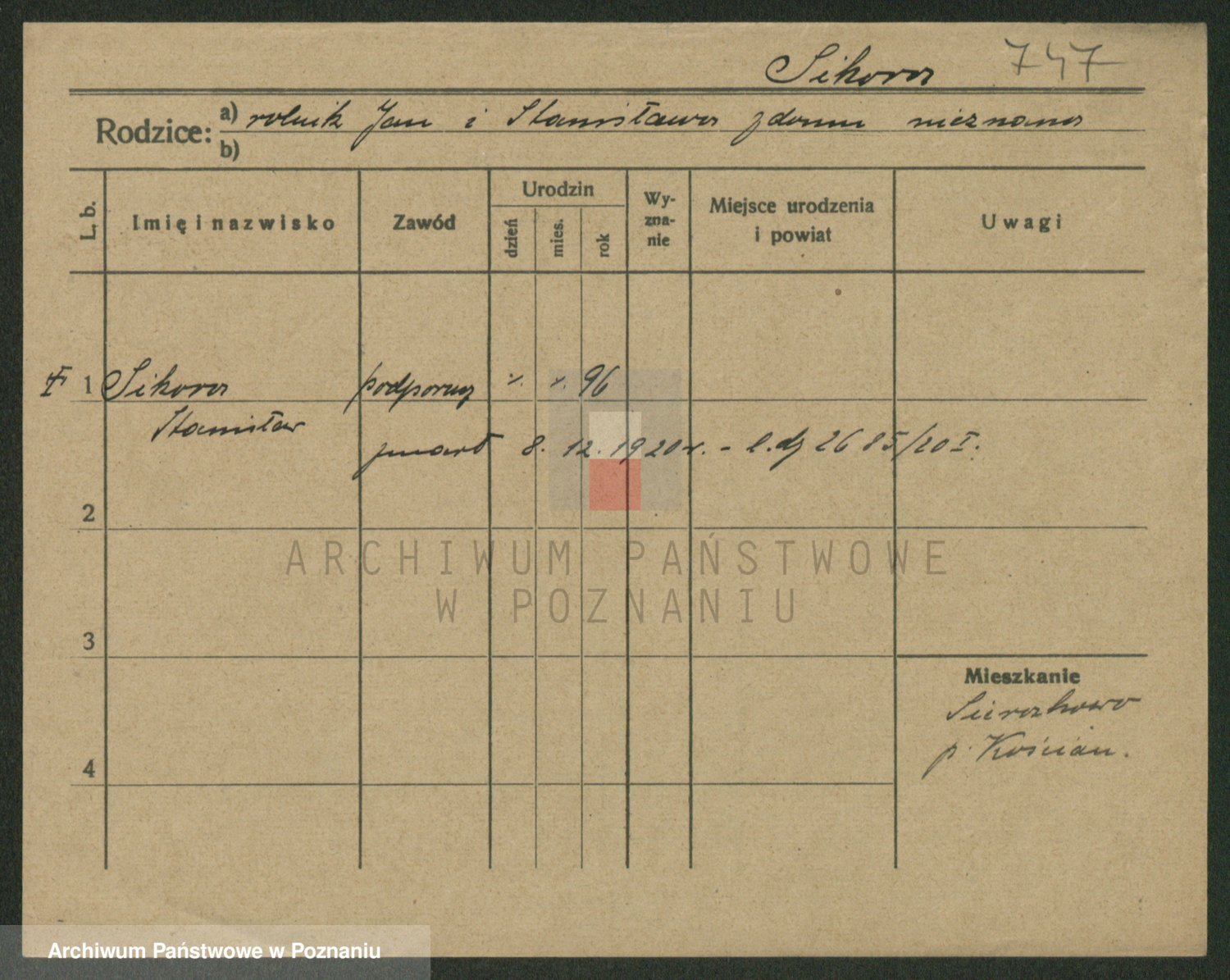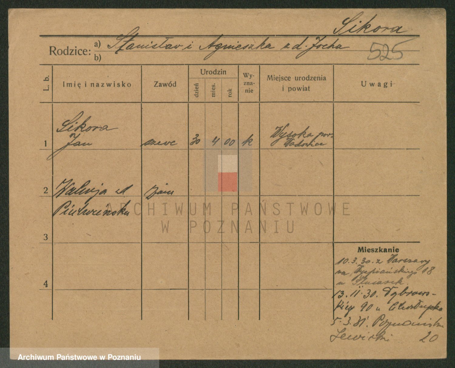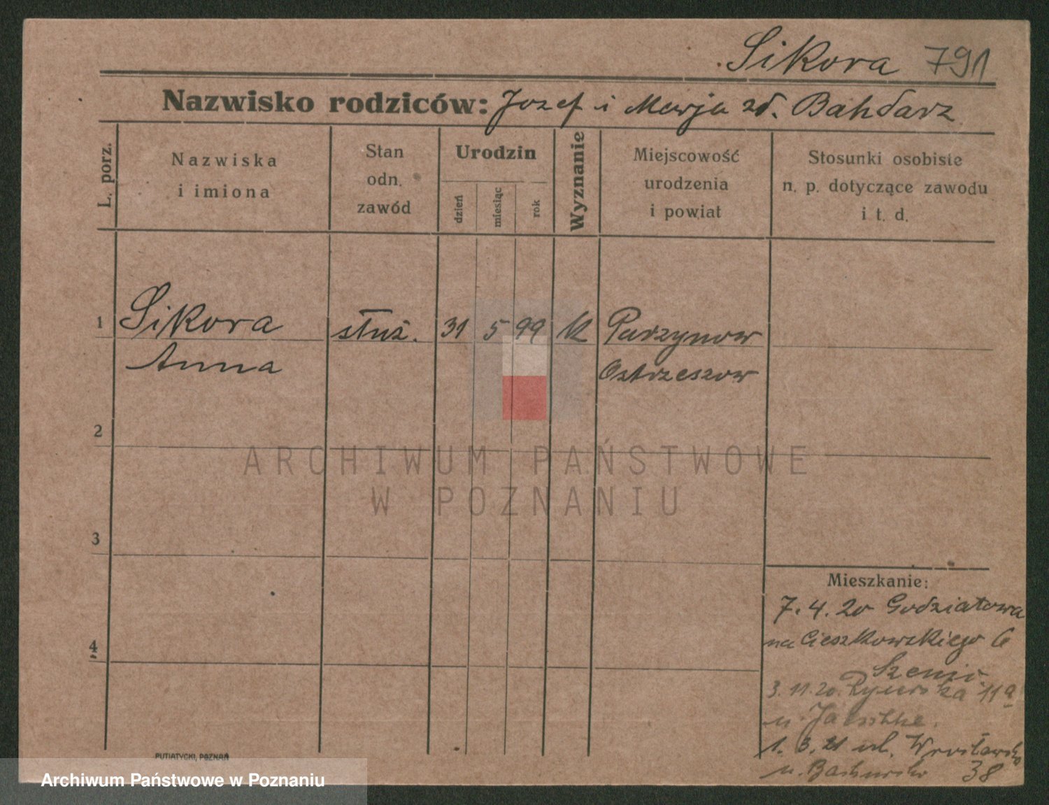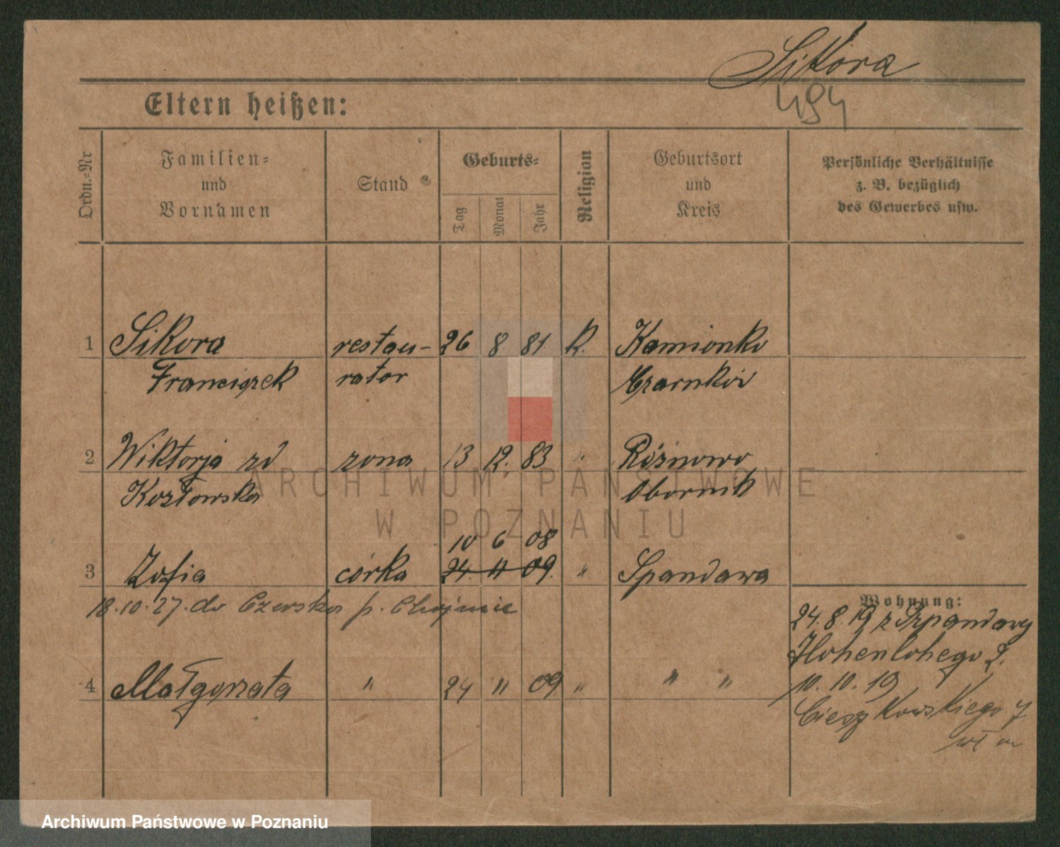 Podgląd karty osobowej dostępny jest po kliknięciu na nazwisko lub ikonkę karty. Można dokonywać powiększenia (ikony na górze) lub przechodzić między kolejnymi skanami (strzałki po bokach).