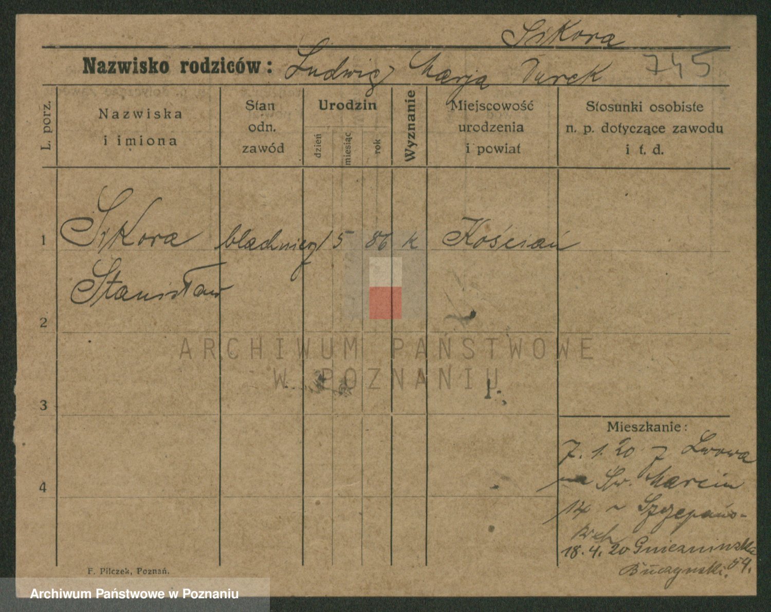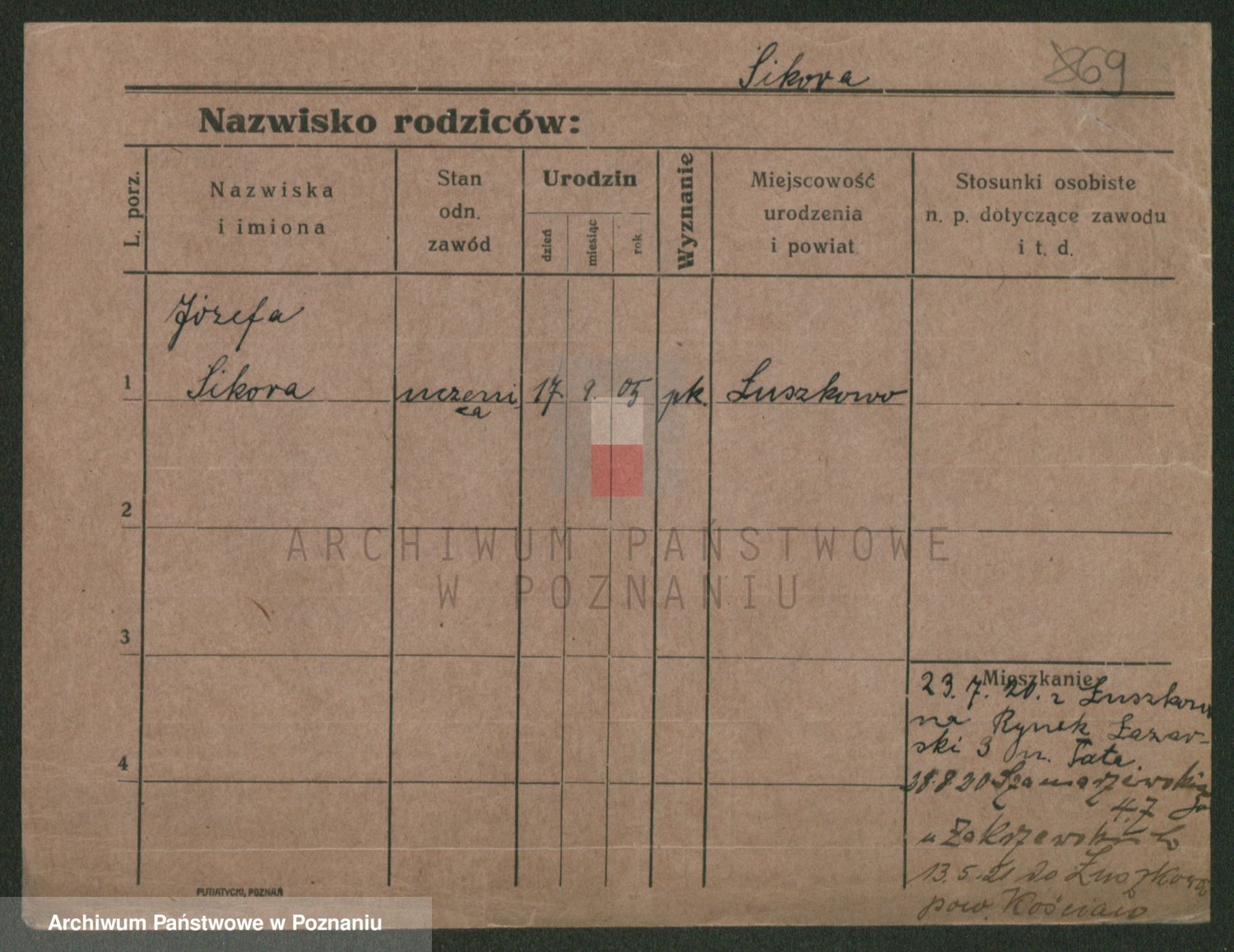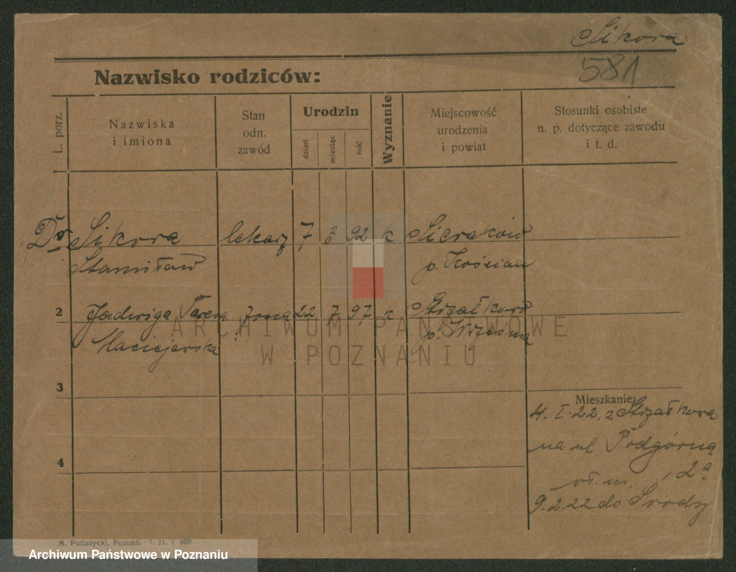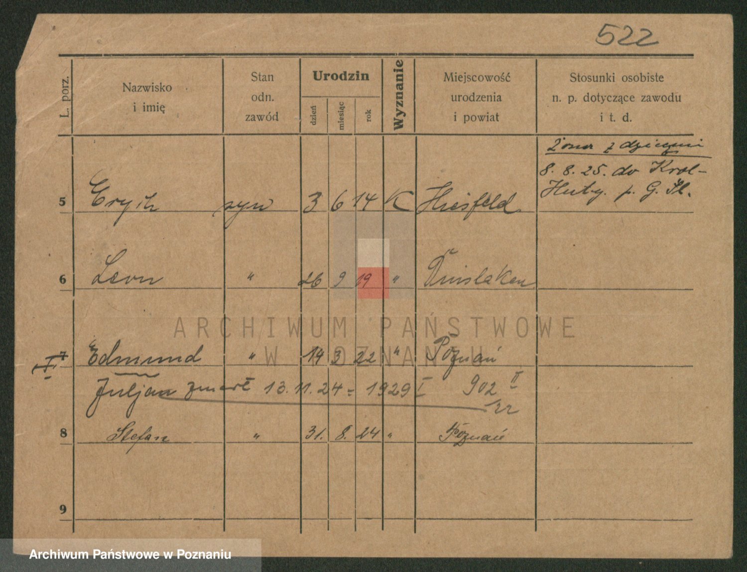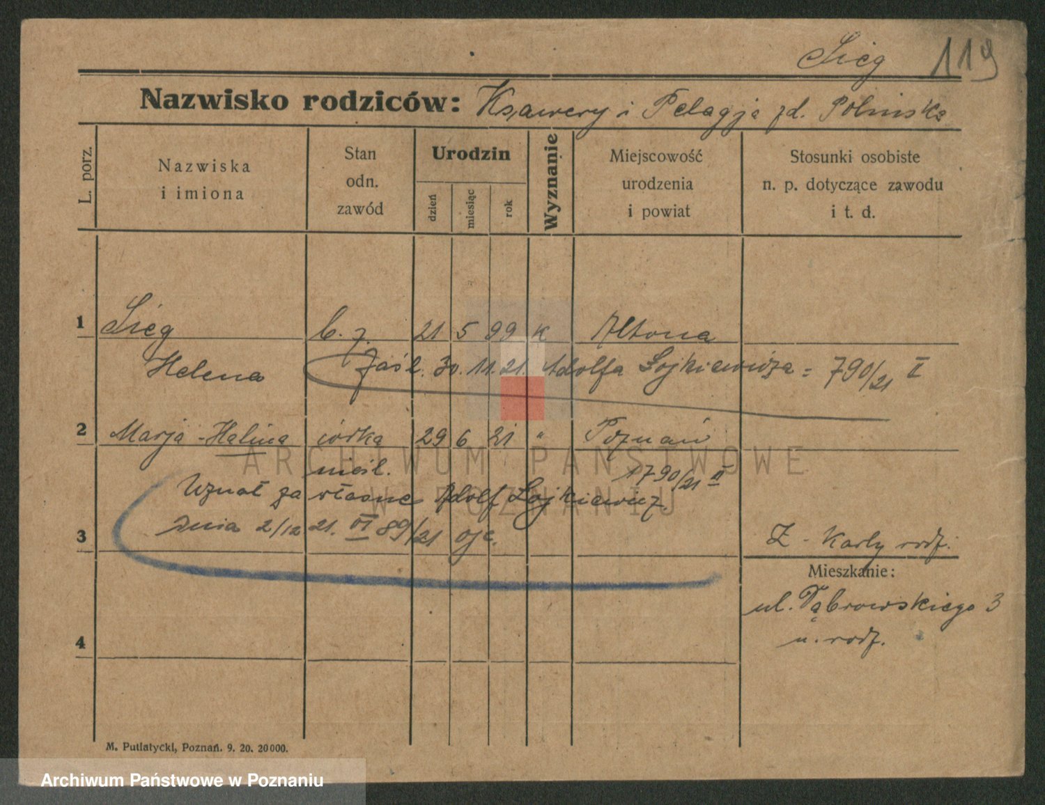 Podgląd karty osobowej dostępny jest po kliknięciu na nazwisko lub ikonkę karty. Można dokonywać powiększenia (ikony na górze) lub przechodzić między kolejnymi skanami (strzałki po bokach).