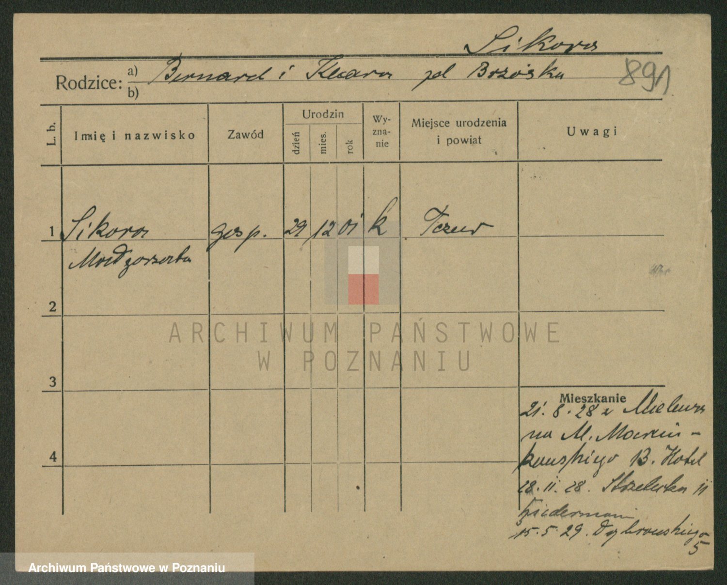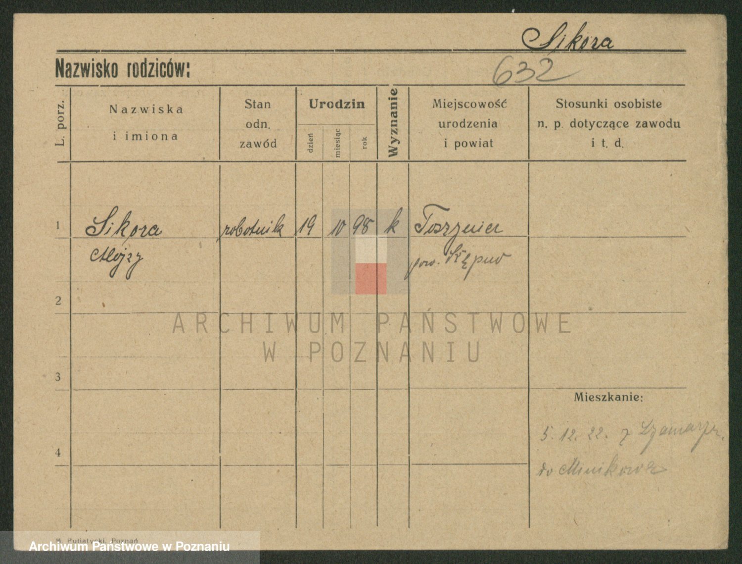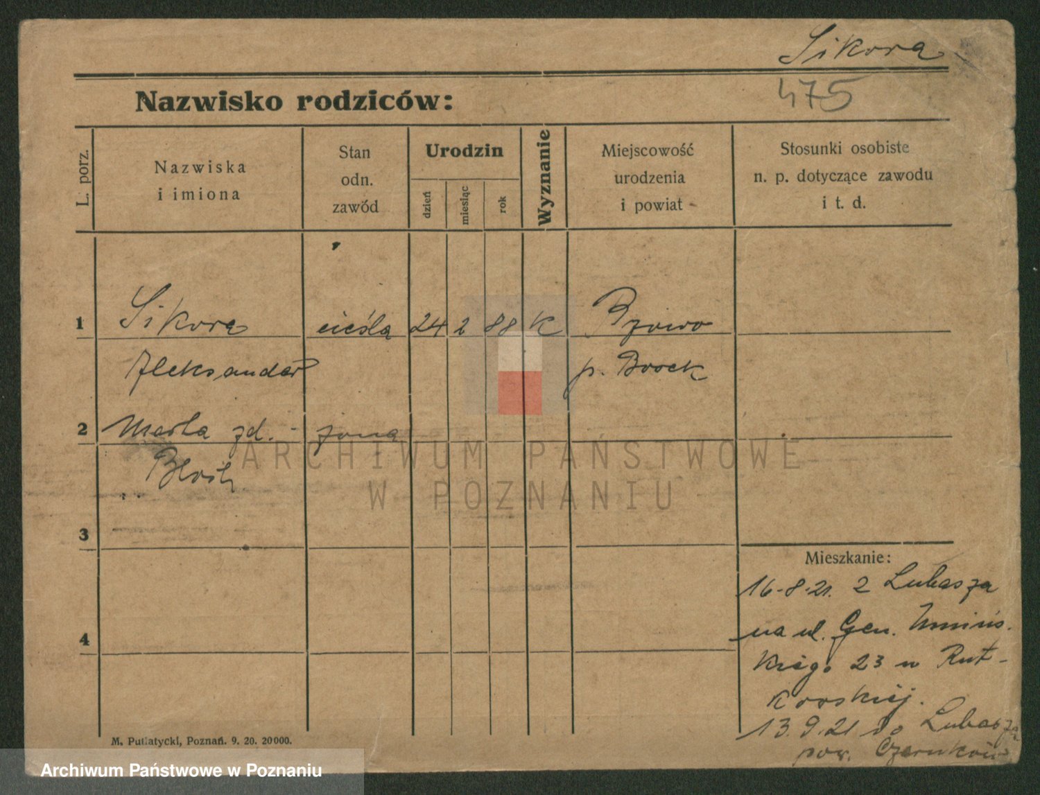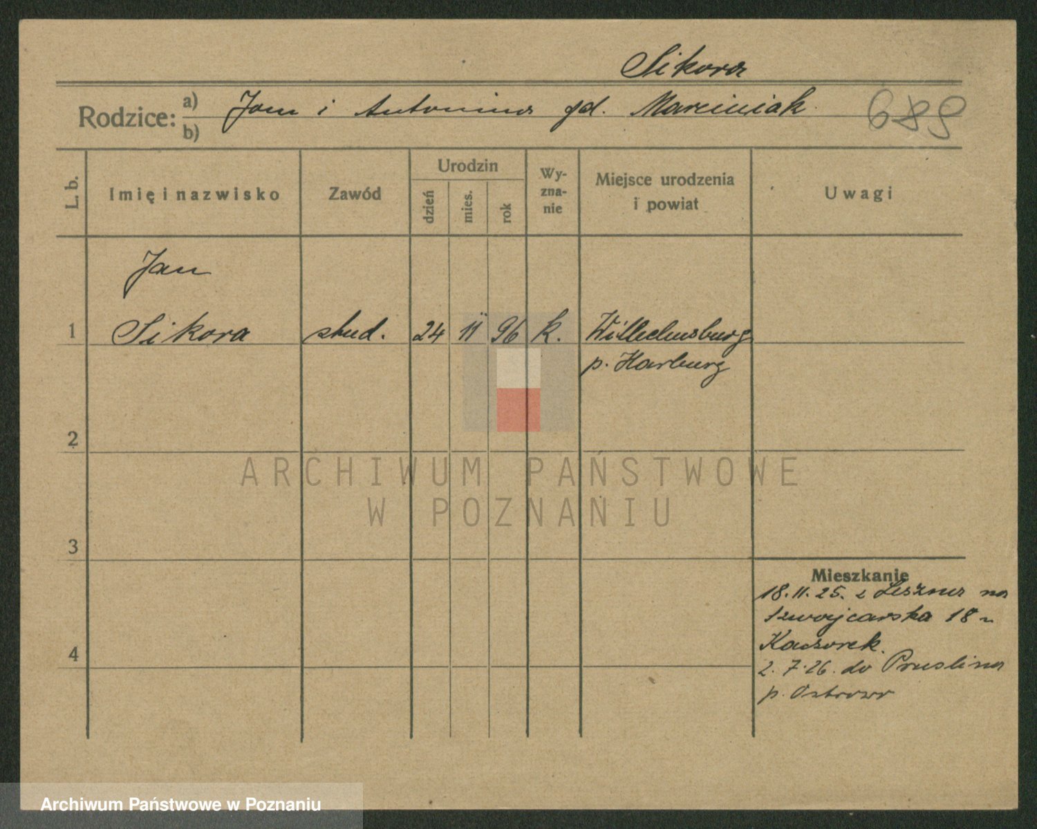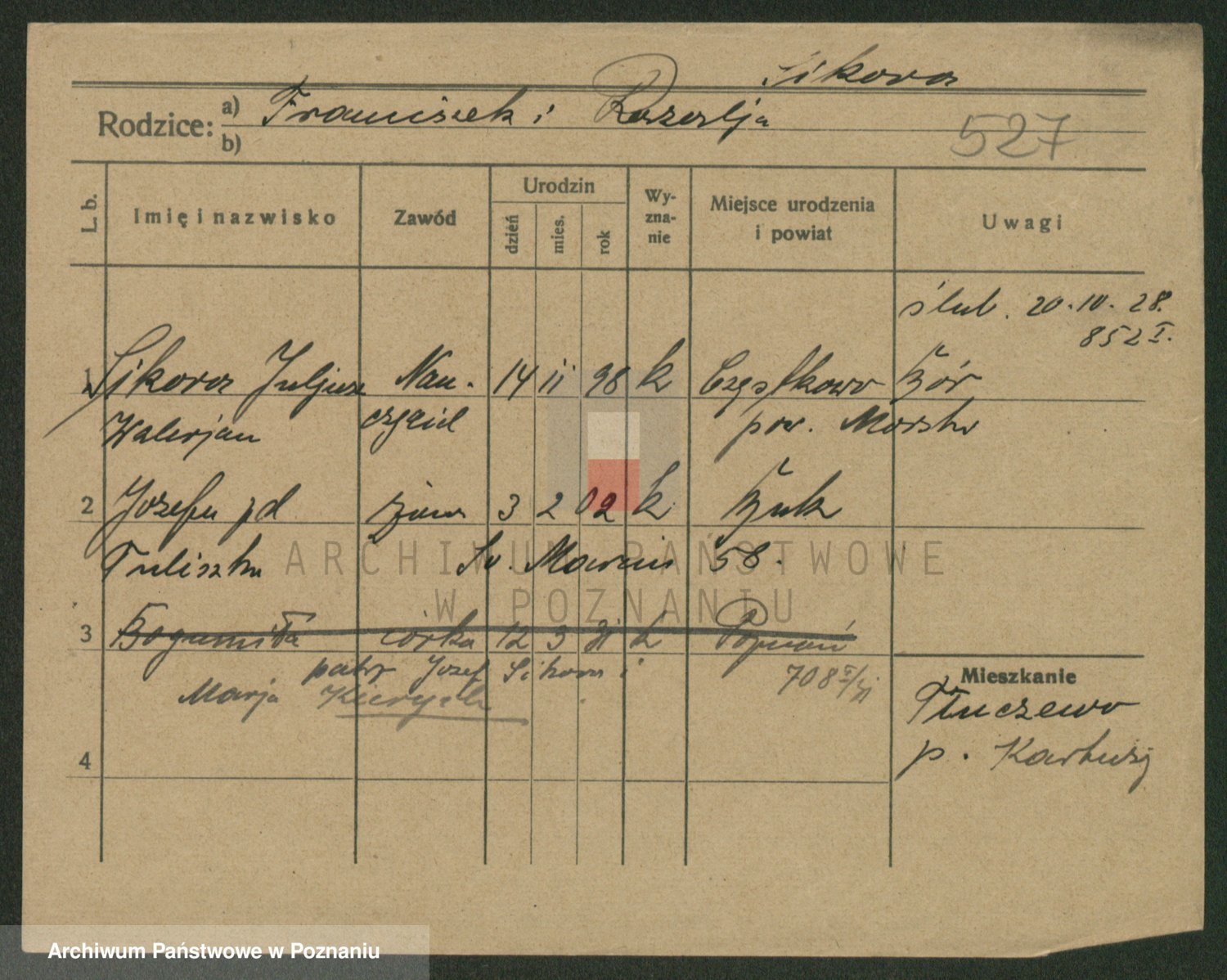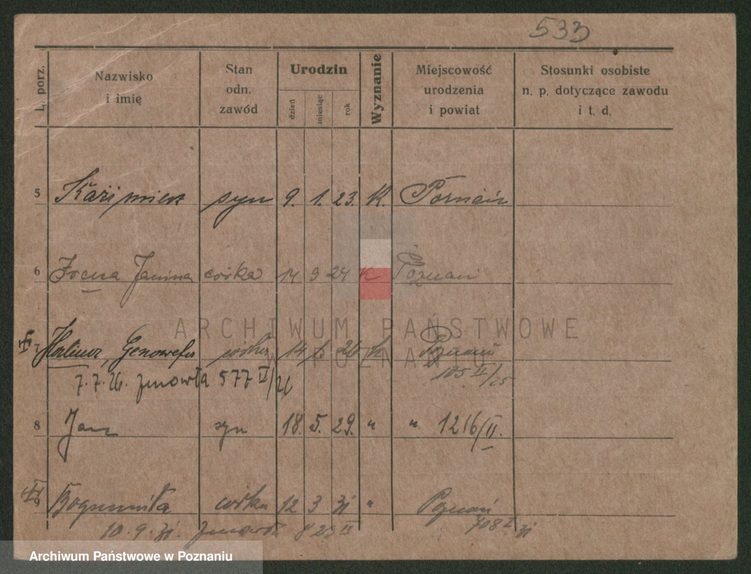 Podgląd karty osobowej dostępny jest po kliknięciu na nazwisko lub ikonkę karty. Można dokonywać powiększenia (ikony na górze) lub przechodzić między kolejnymi skanami (strzałki po bokach).