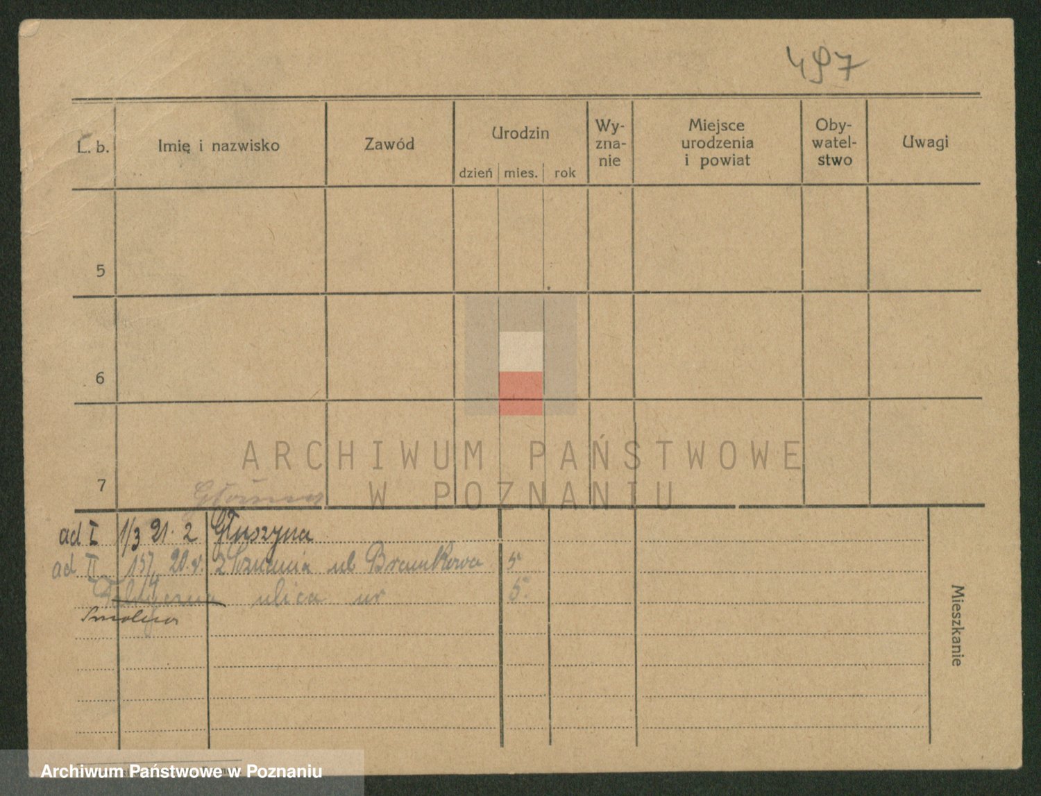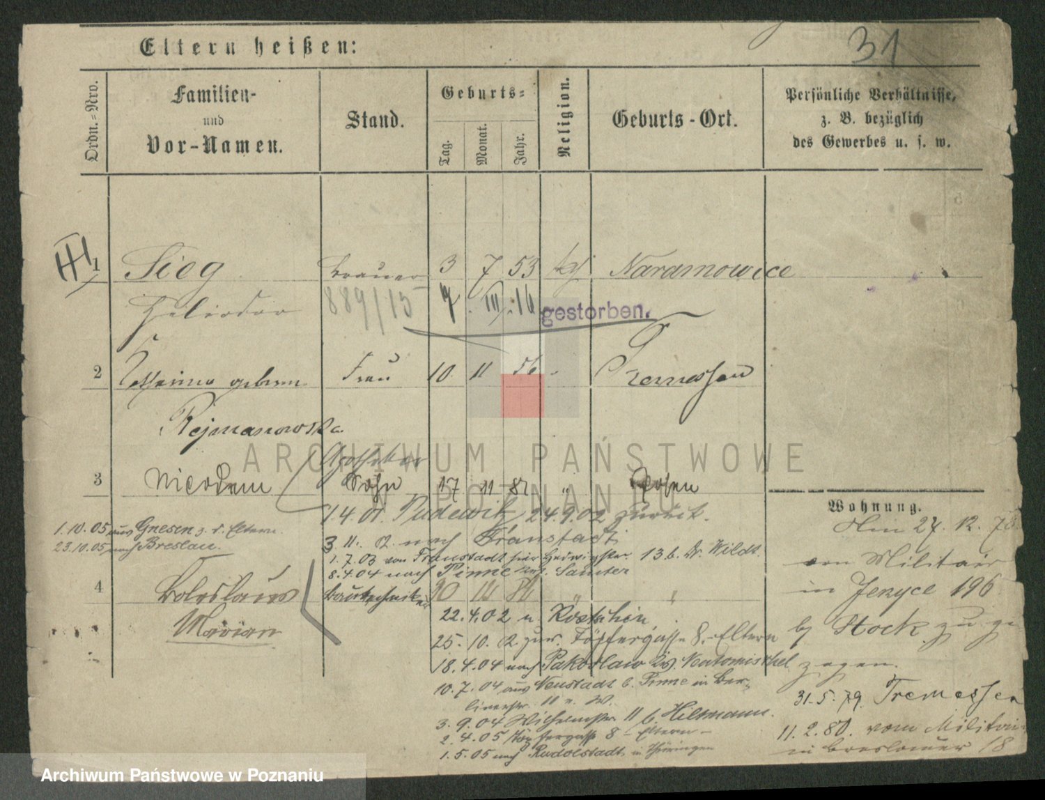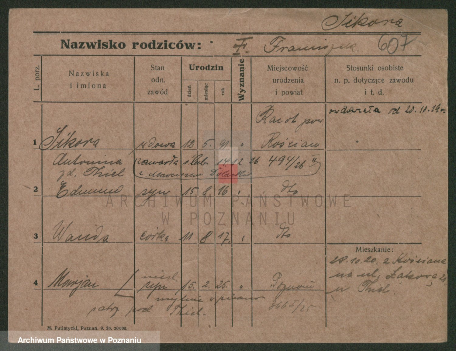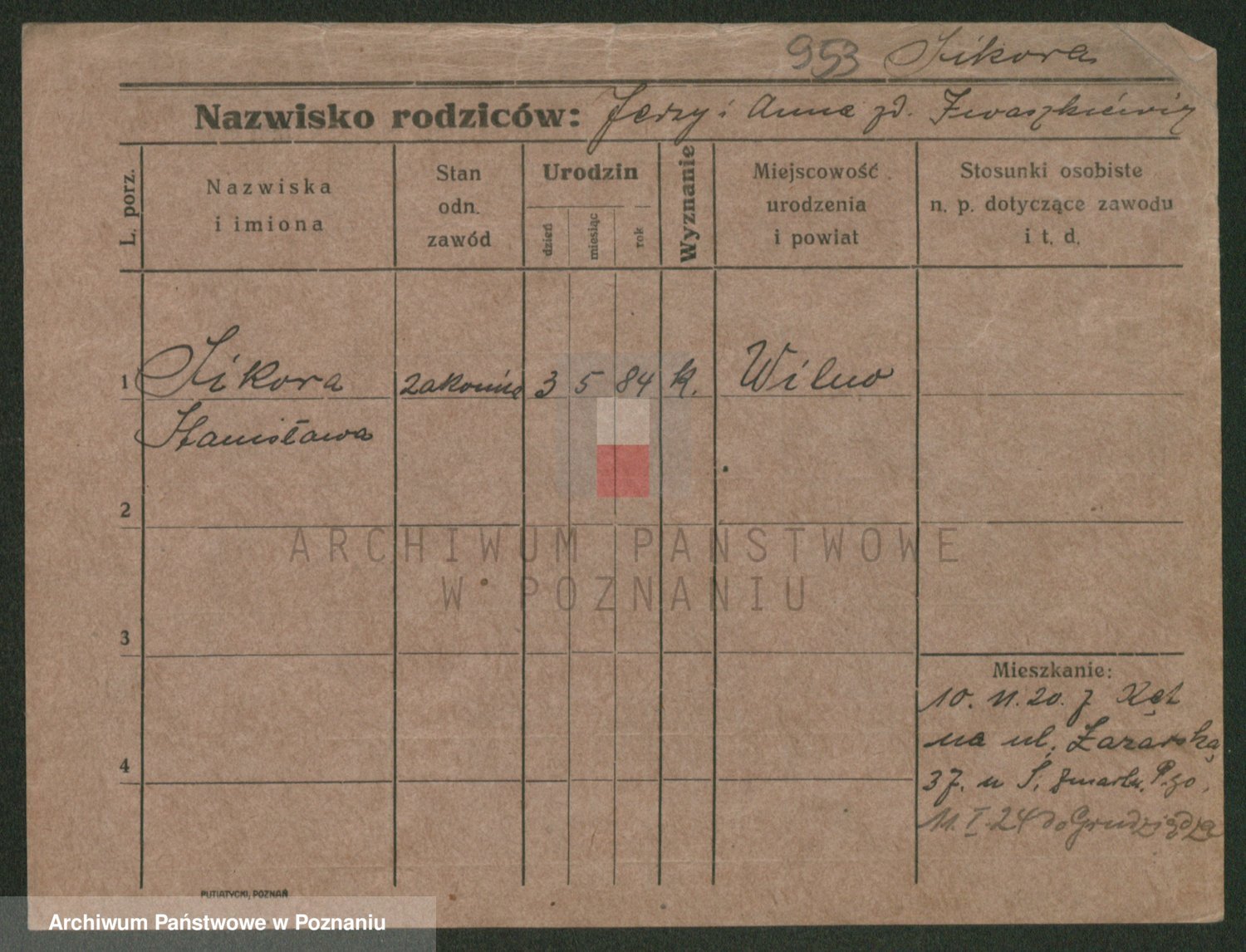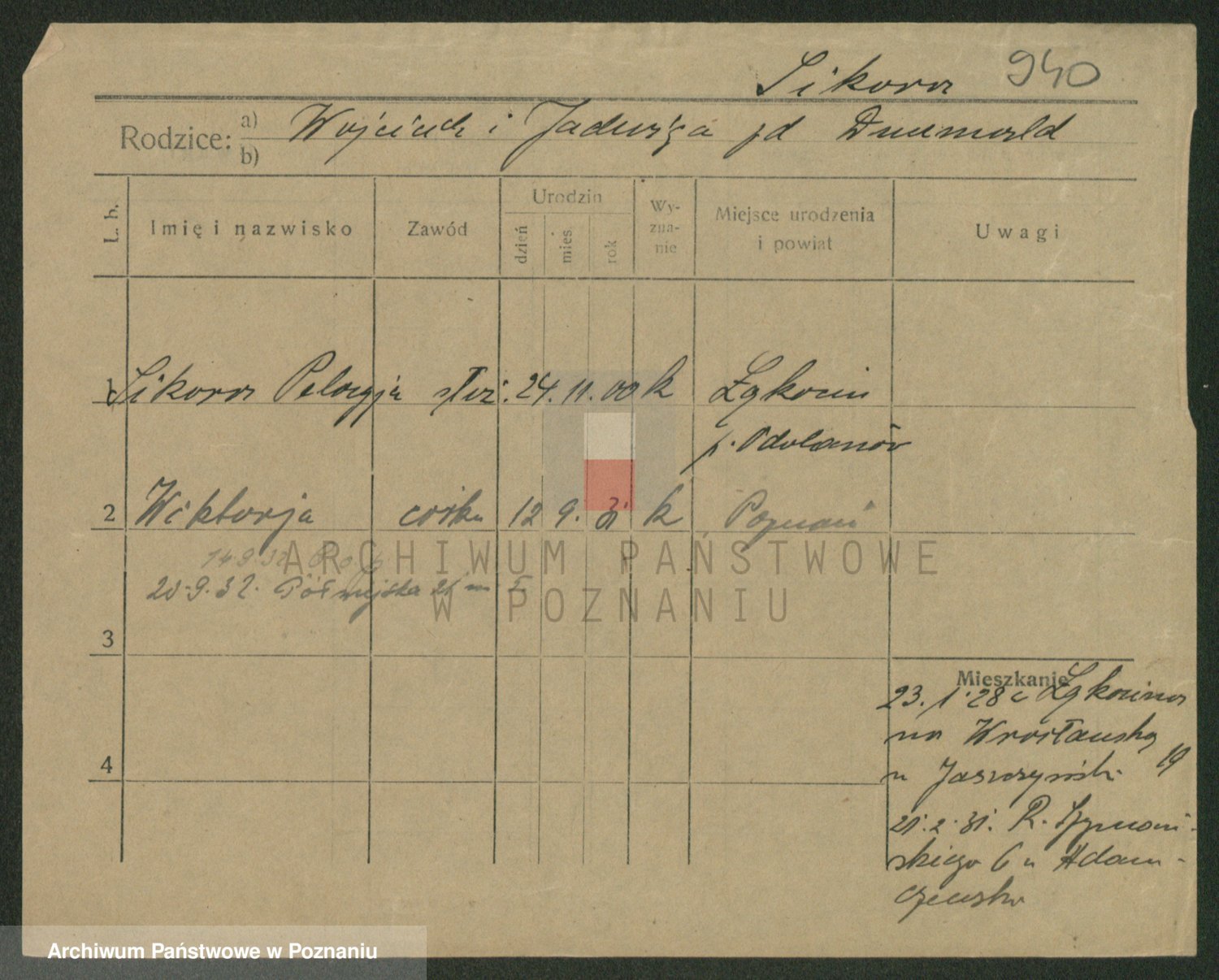 Podgląd karty osobowej dostępny jest po kliknięciu na nazwisko lub ikonkę karty. Można dokonywać powiększenia (ikony na górze) lub przechodzić między kolejnymi skanami (strzałki po bokach).