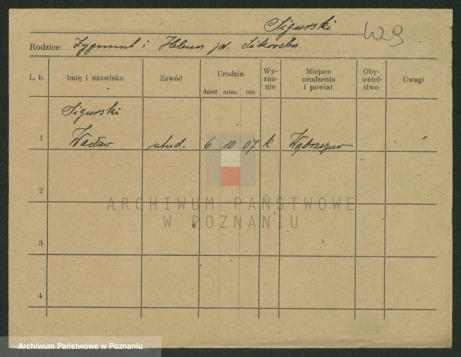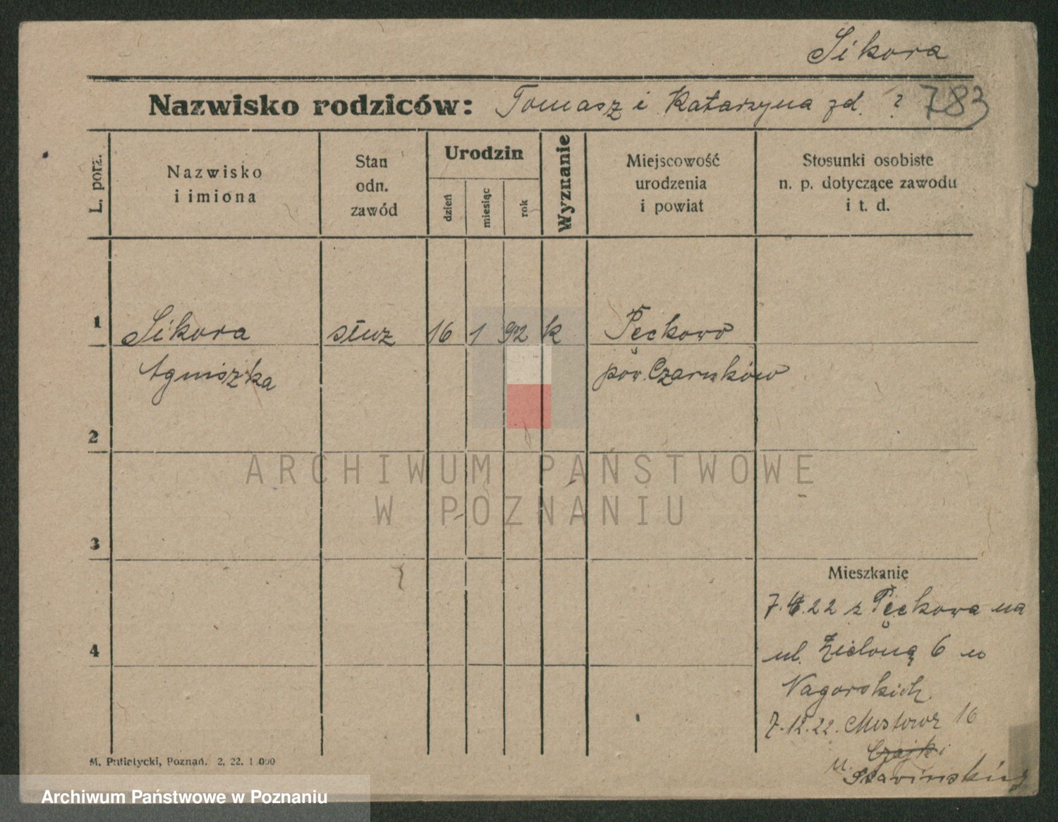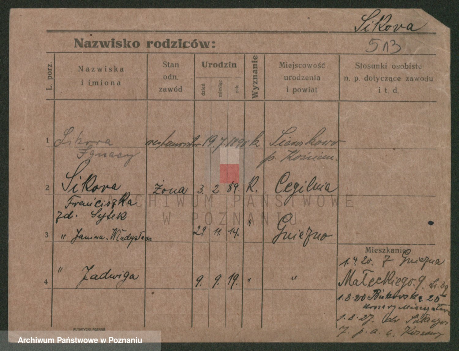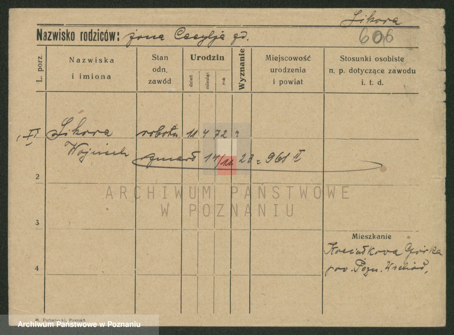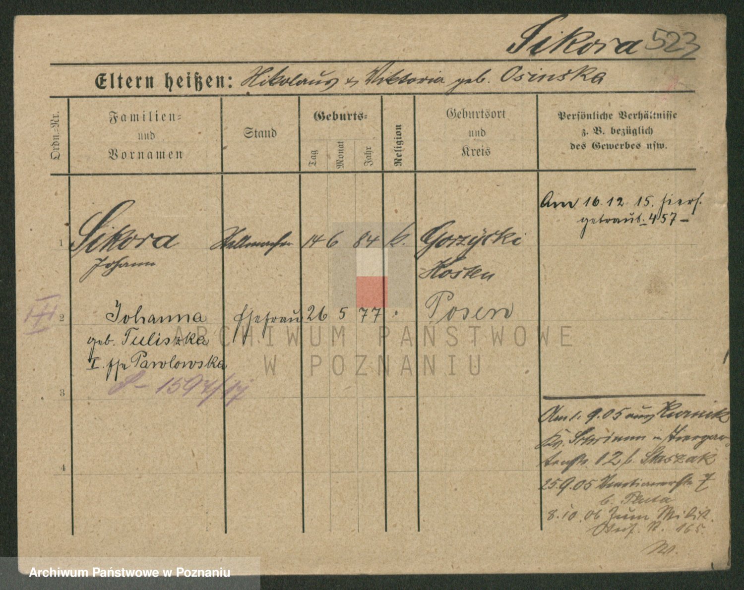 Podgląd karty osobowej dostępny jest po kliknięciu na nazwisko lub ikonkę karty. Można dokonywać powiększenia (ikony na górze) lub przechodzić między kolejnymi skanami (strzałki po bokach).