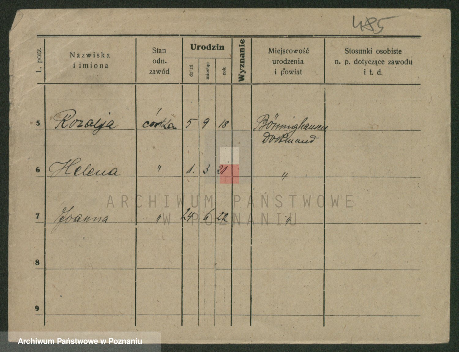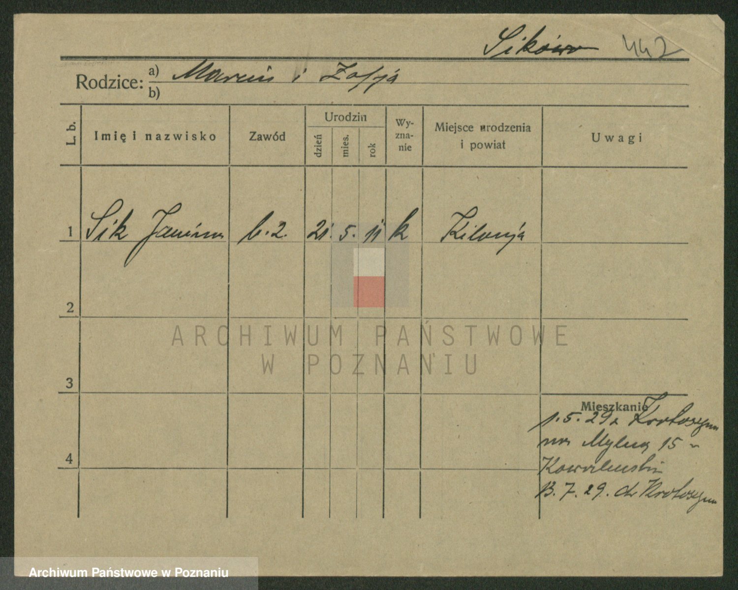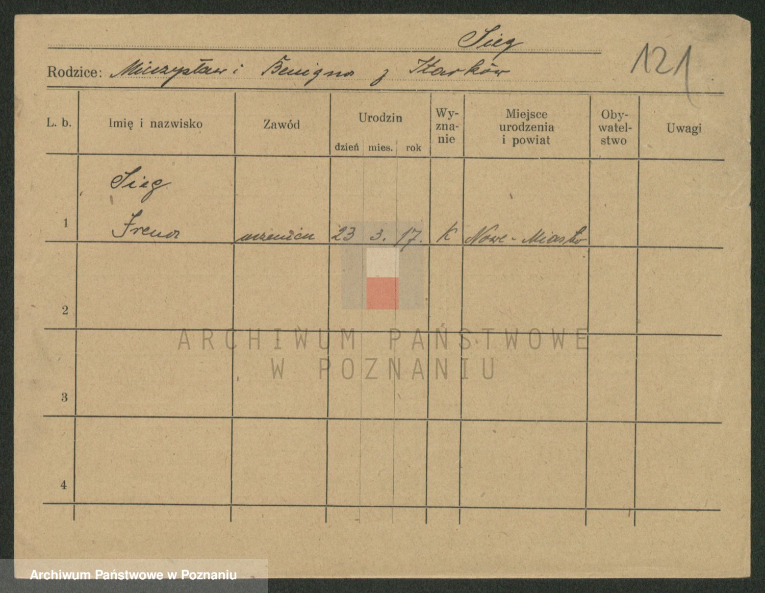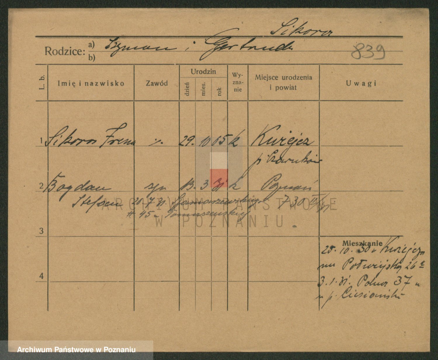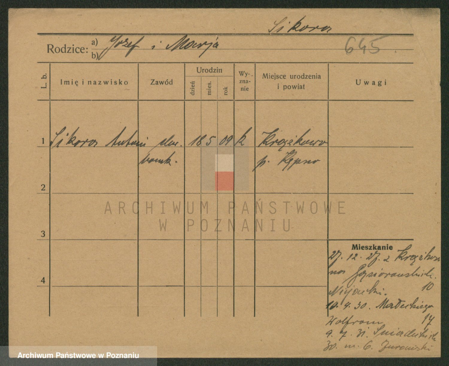 Podgląd karty osobowej dostępny jest po kliknięciu na nazwisko lub ikonkę karty. Można dokonywać powiększenia (ikony na górze) lub przechodzić między kolejnymi skanami (strzałki po bokach).