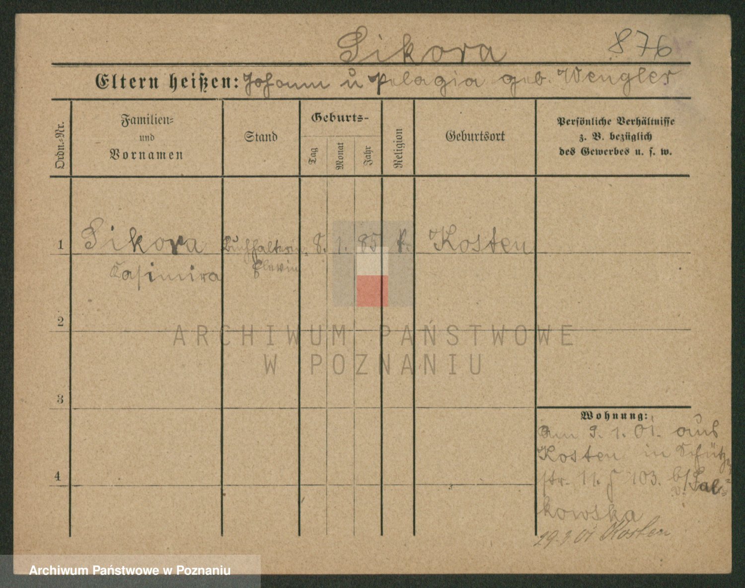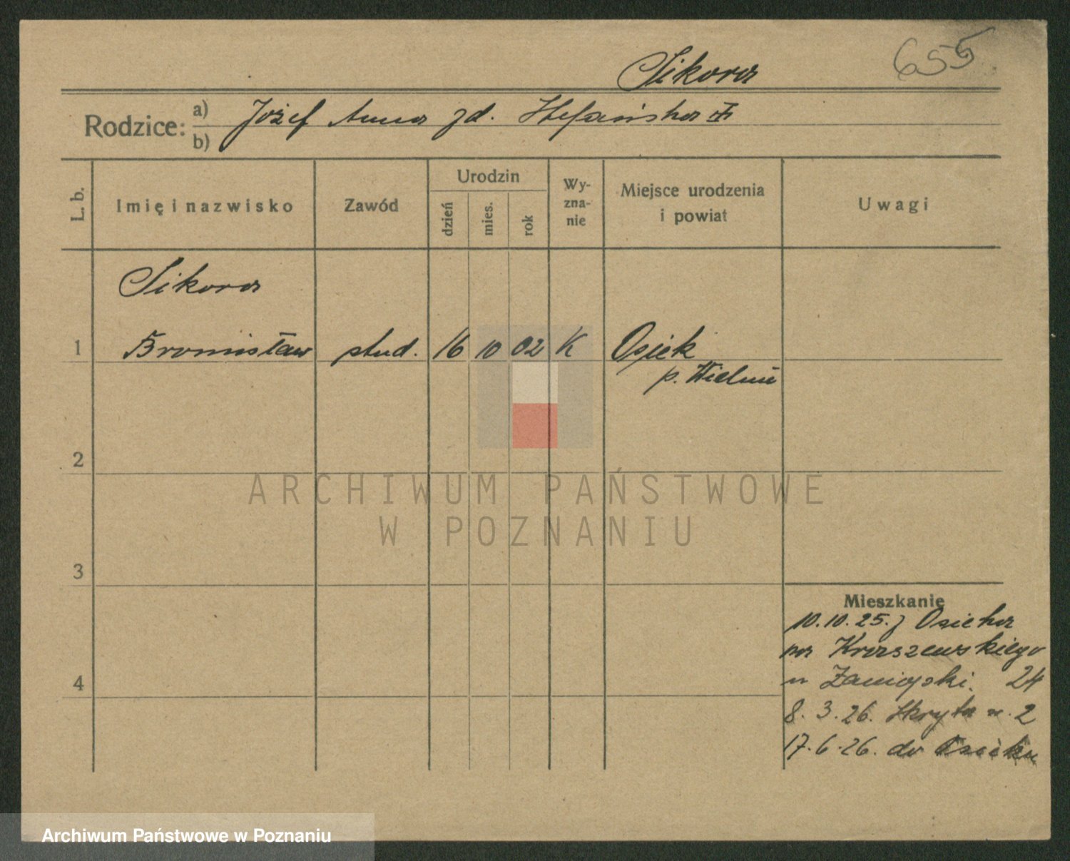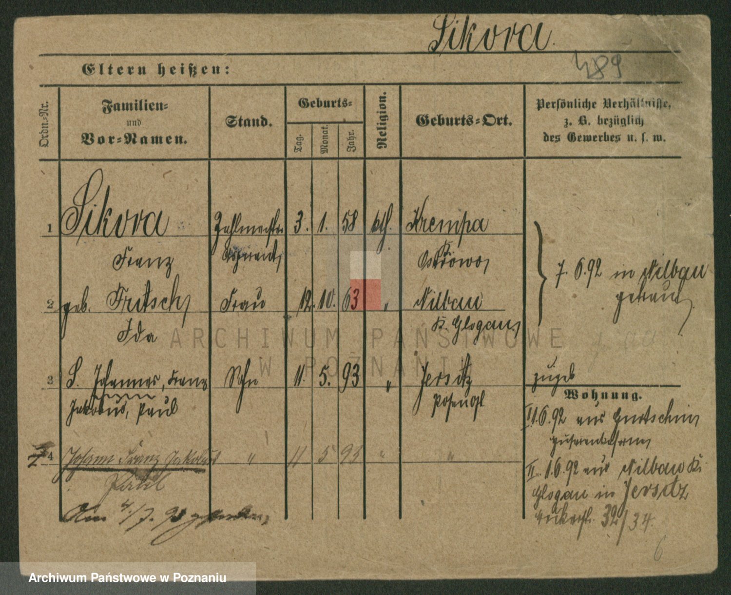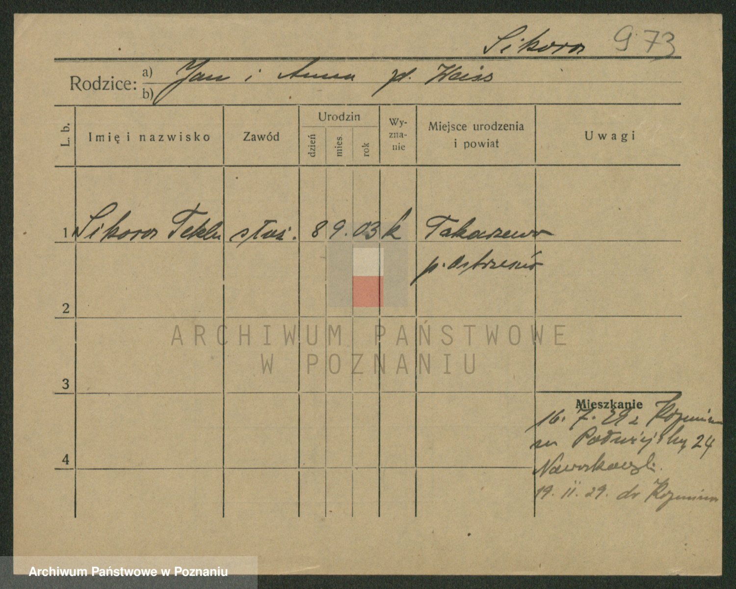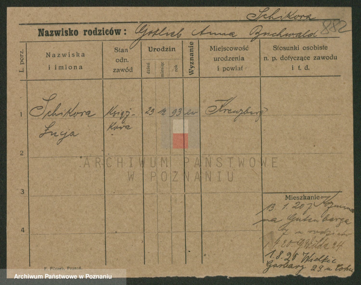 Podgląd karty osobowej dostępny jest po kliknięciu na nazwisko lub ikonkę karty. Można dokonywać powiększenia (ikony na górze) lub przechodzić między kolejnymi skanami (strzałki po bokach).