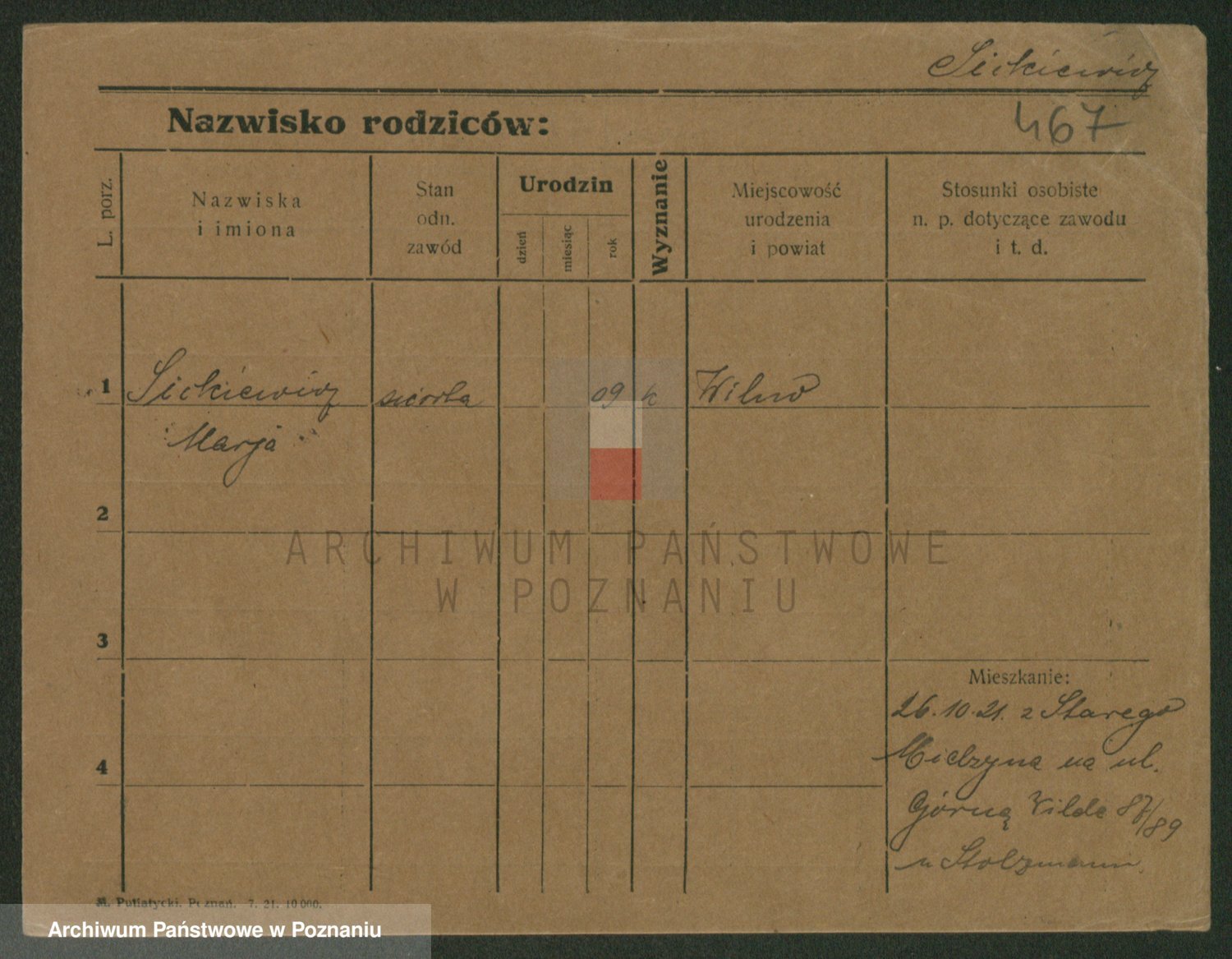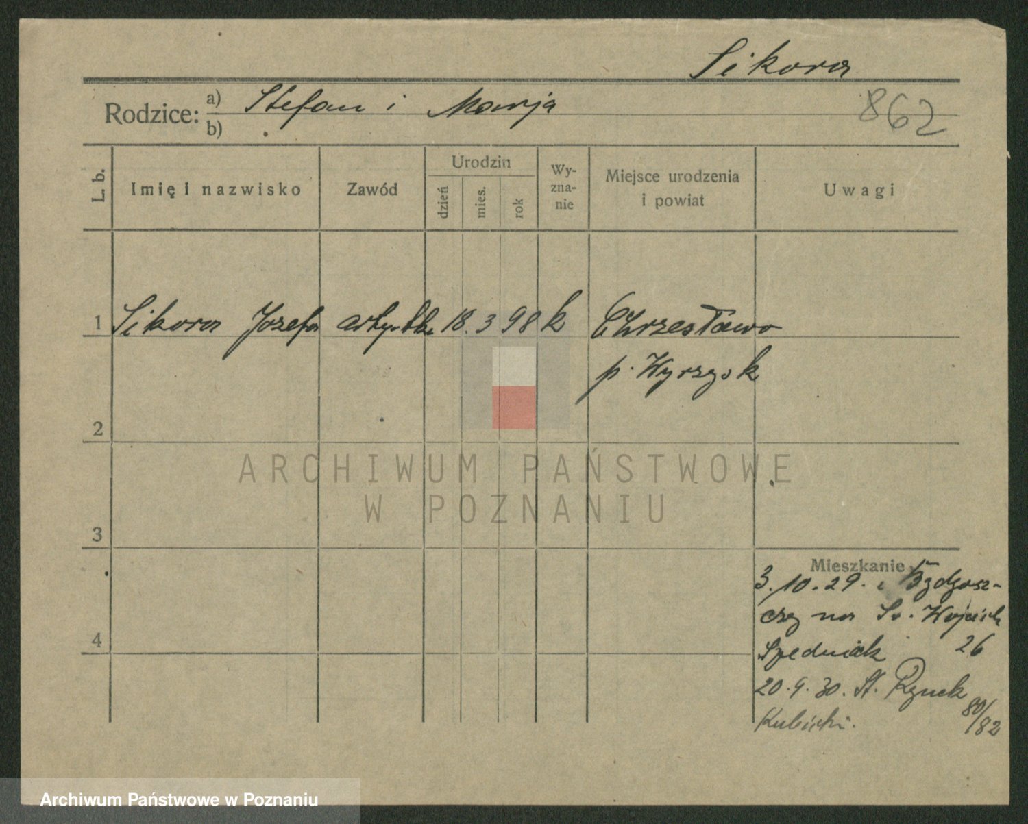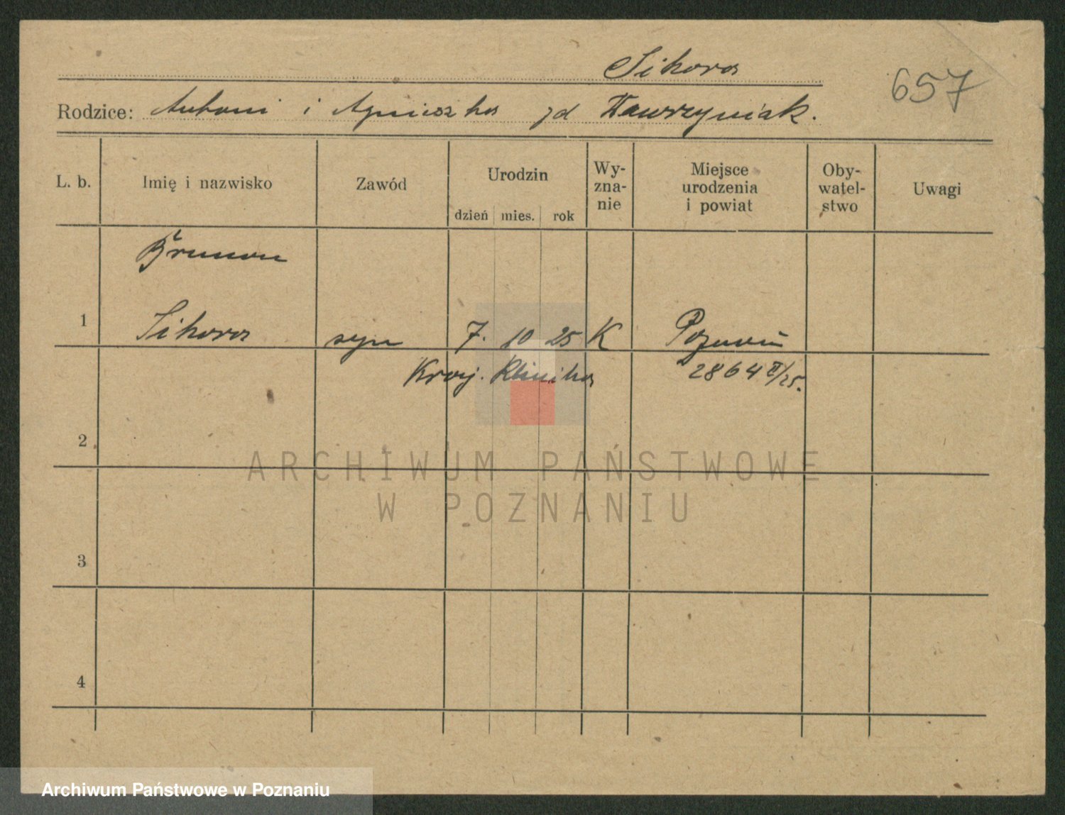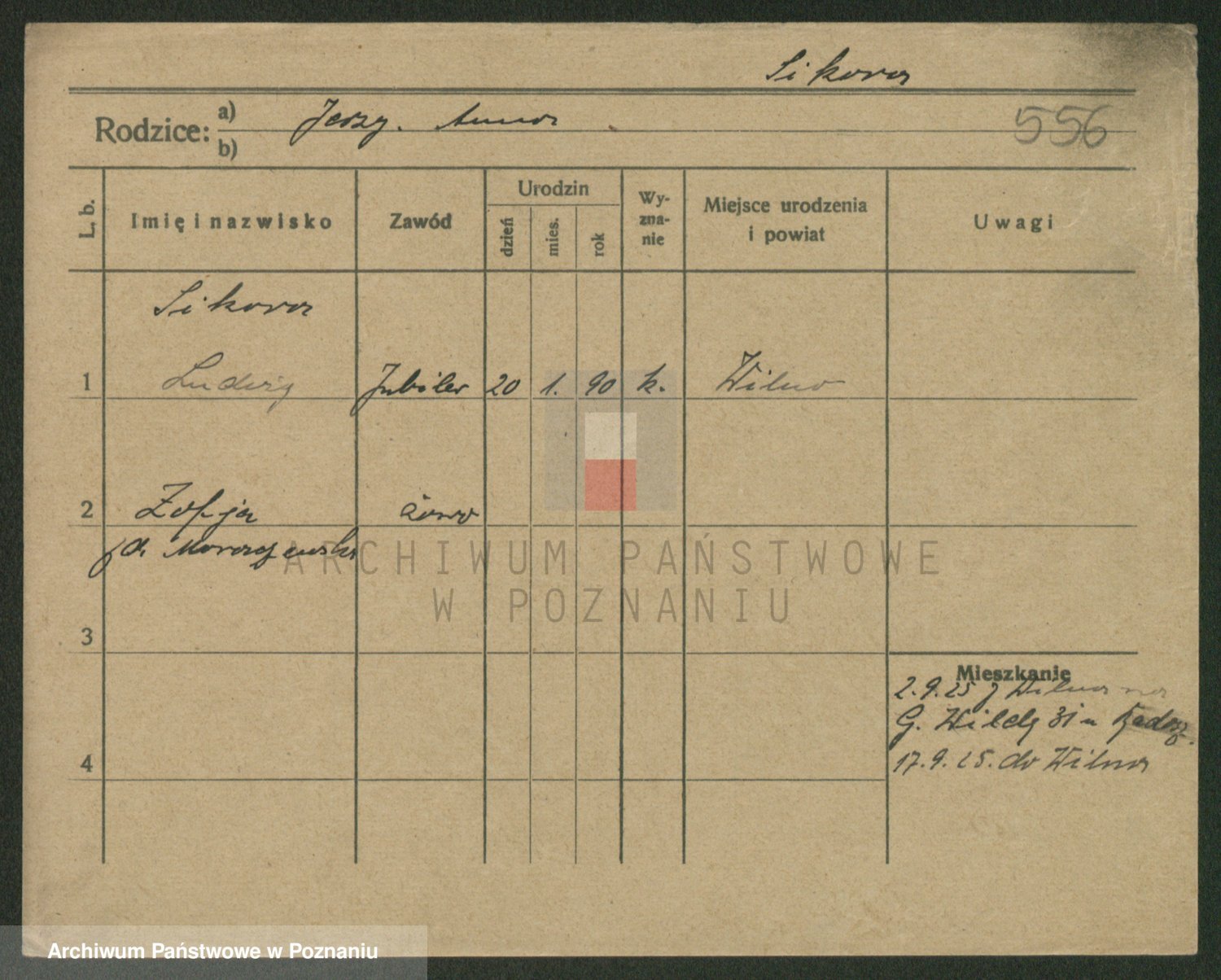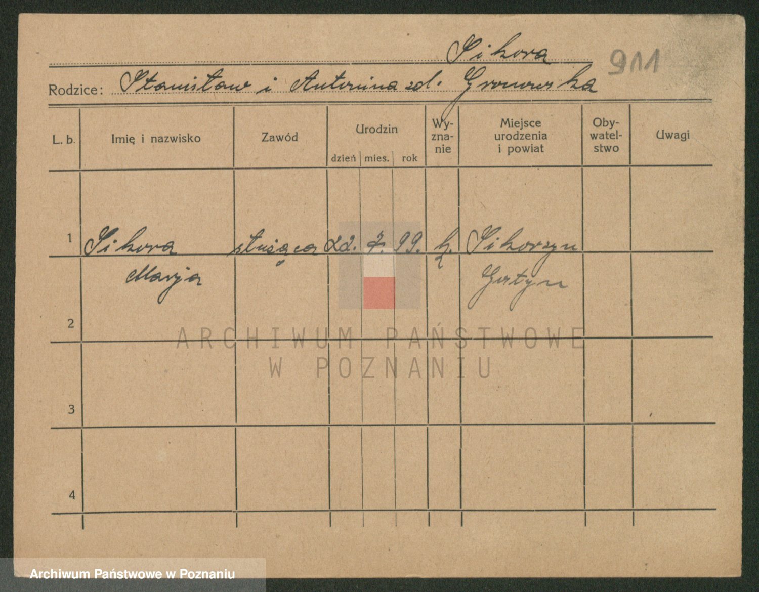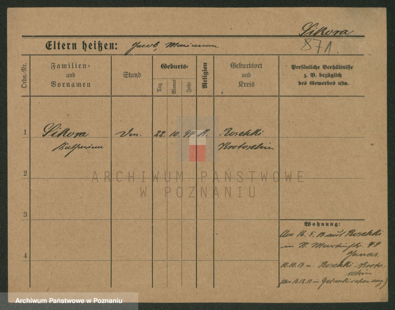 Podgląd karty osobowej dostępny jest po kliknięciu na nazwisko lub ikonkę karty. Można dokonywać powiększenia (ikony na górze) lub przechodzić między kolejnymi skanami (strzałki po bokach).