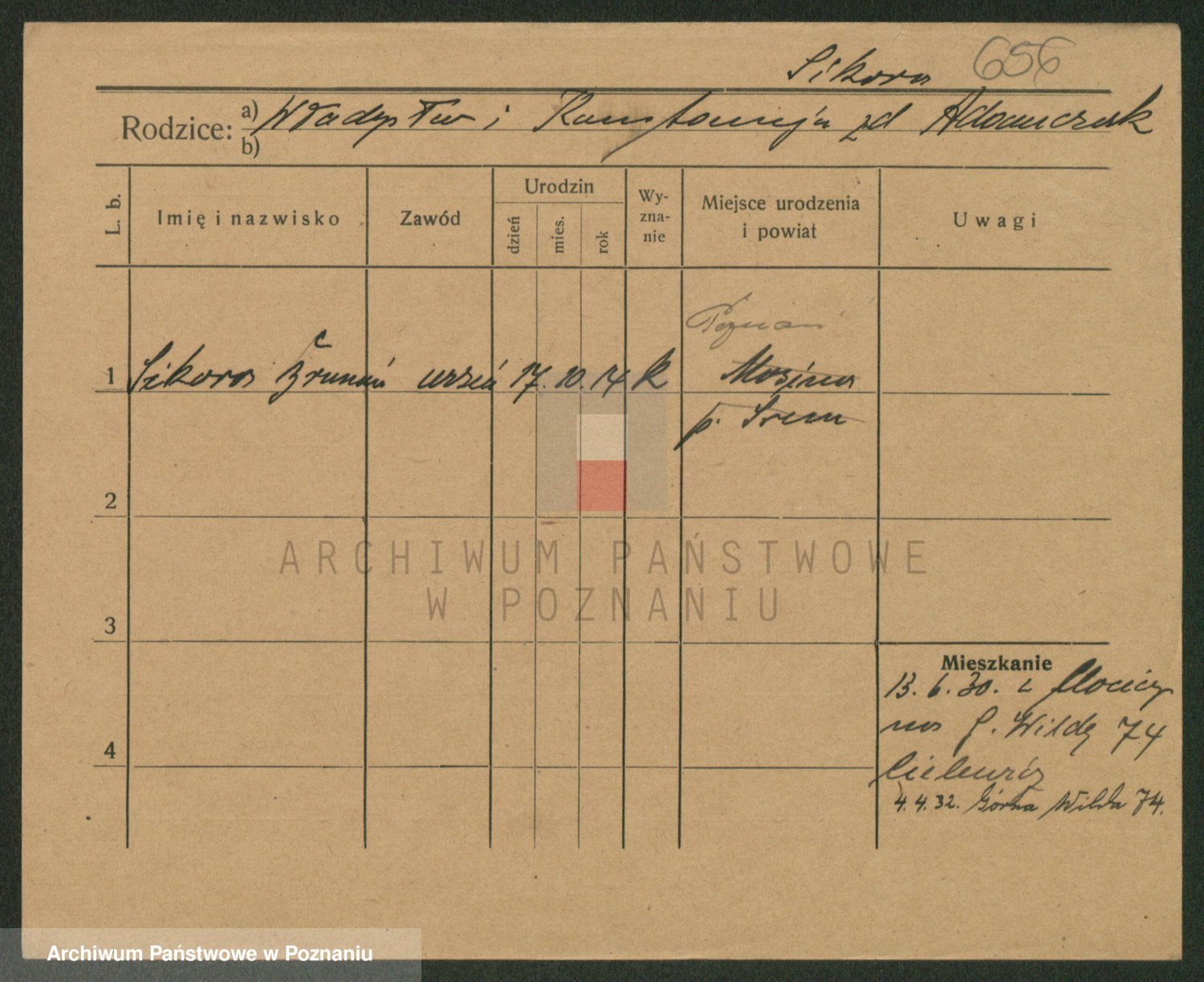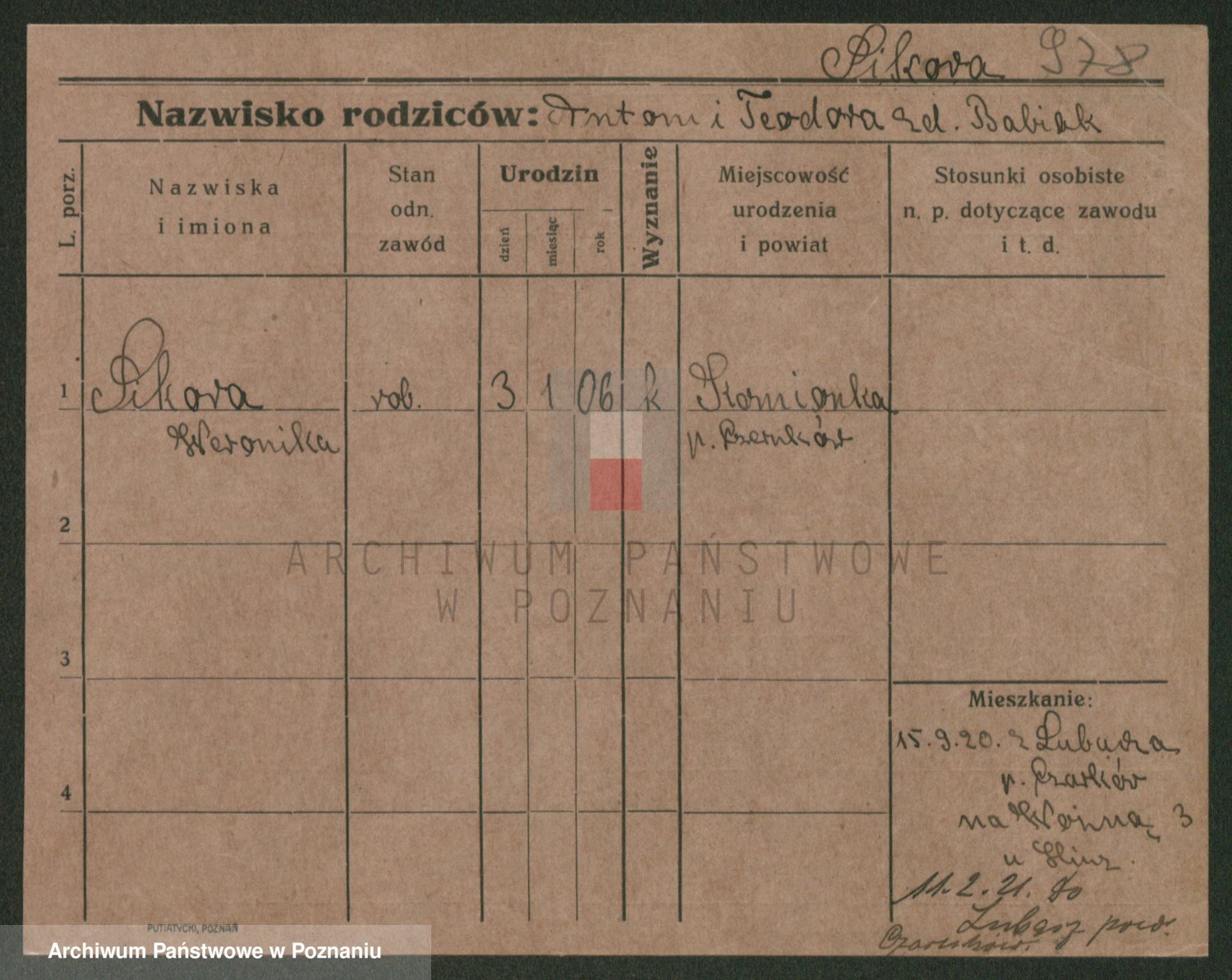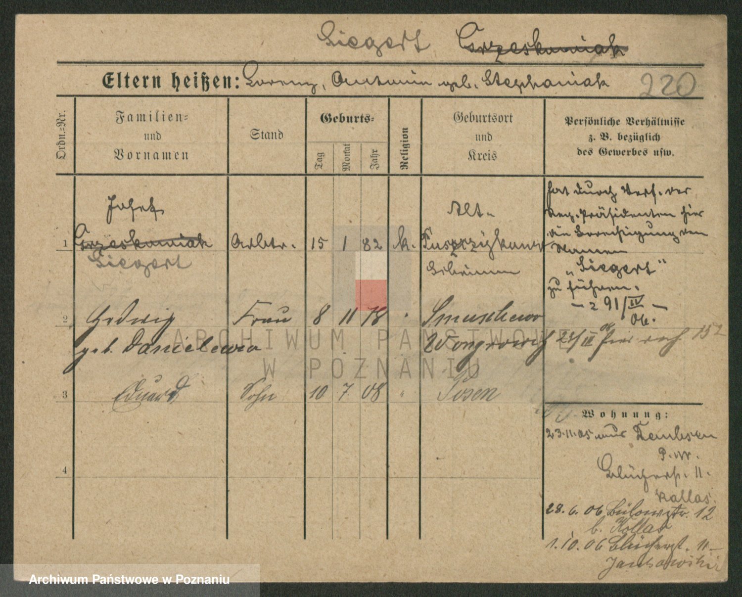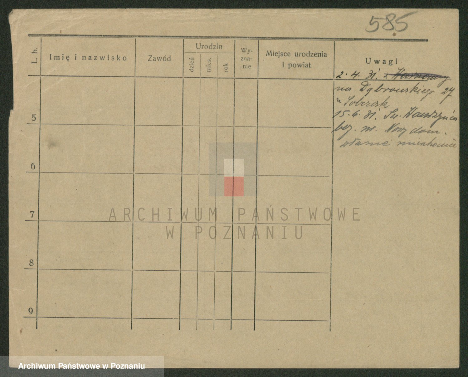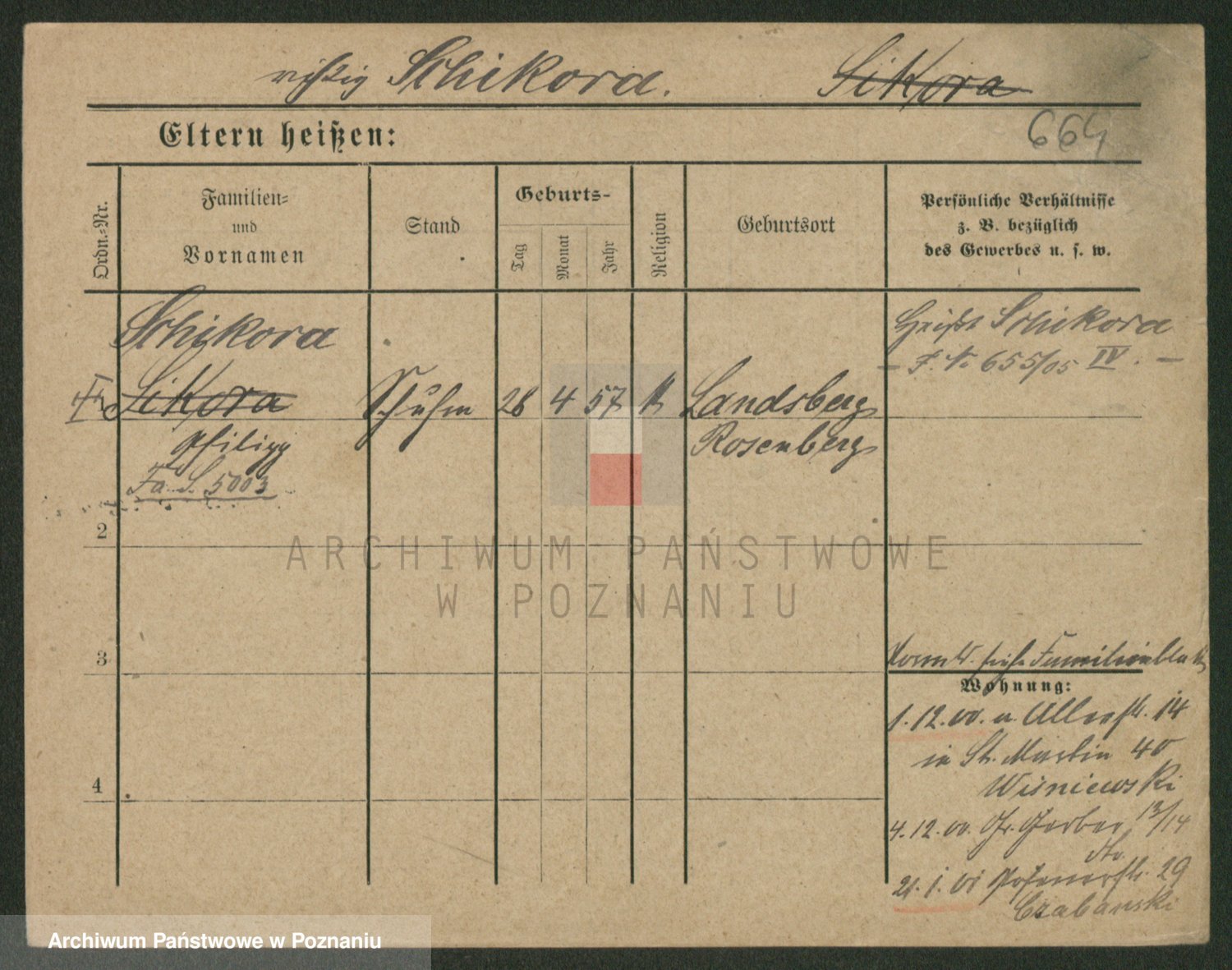 Podgląd karty osobowej dostępny jest po kliknięciu na nazwisko lub ikonkę karty. Można dokonywać powiększenia (ikony na górze) lub przechodzić między kolejnymi skanami (strzałki po bokach).