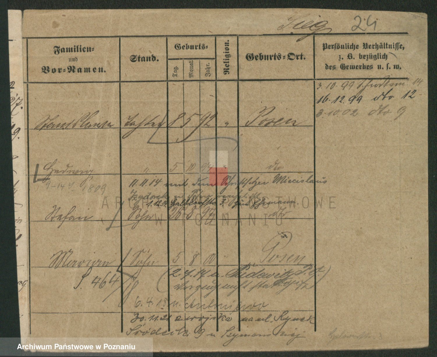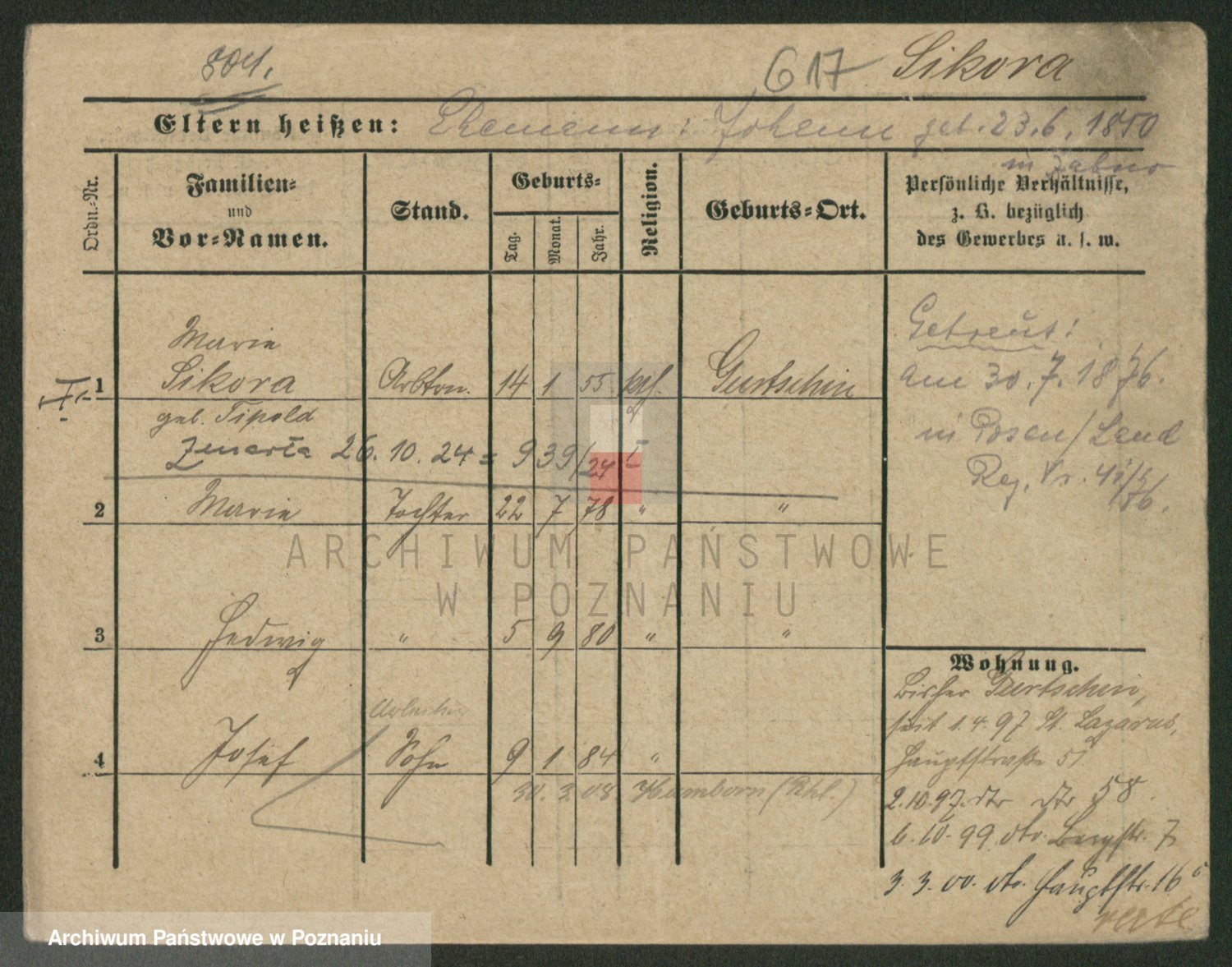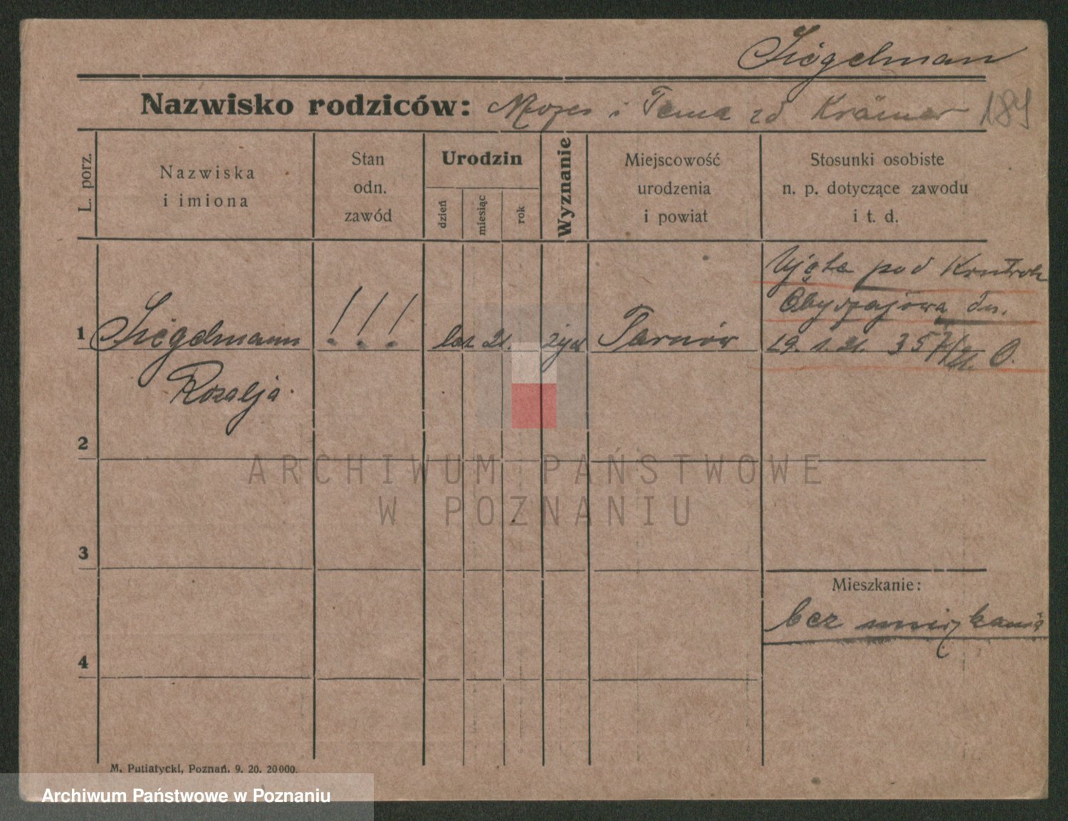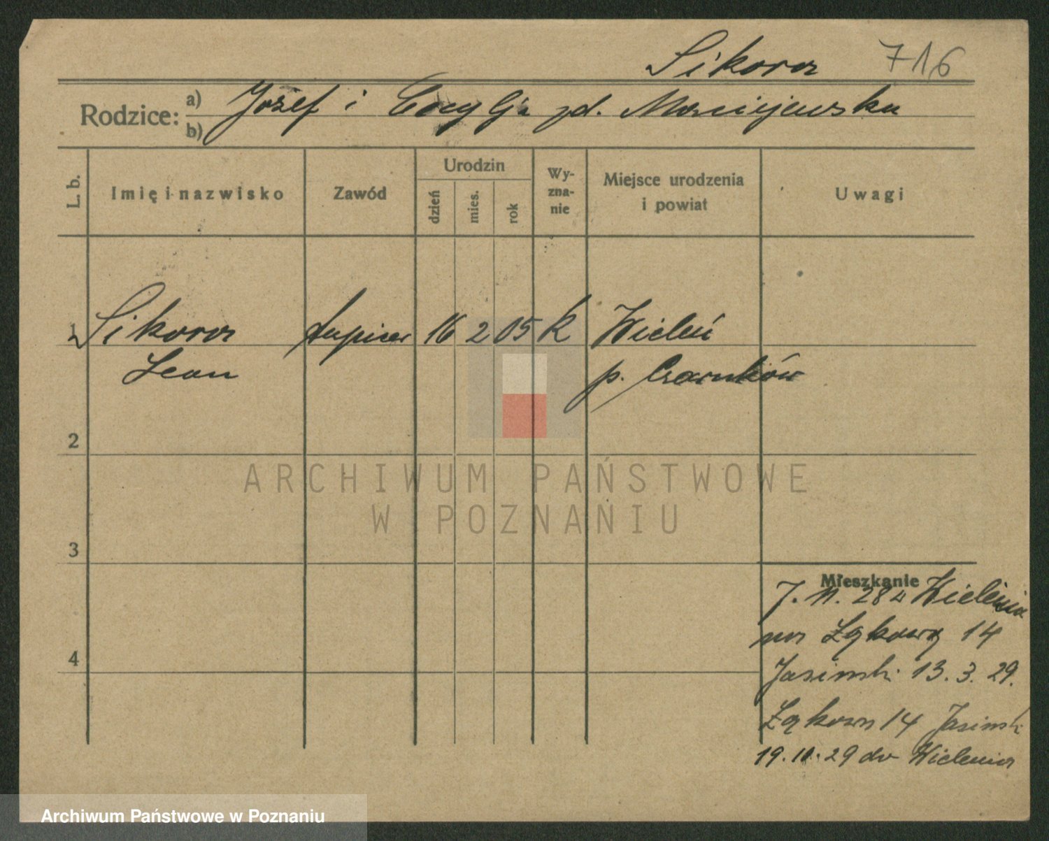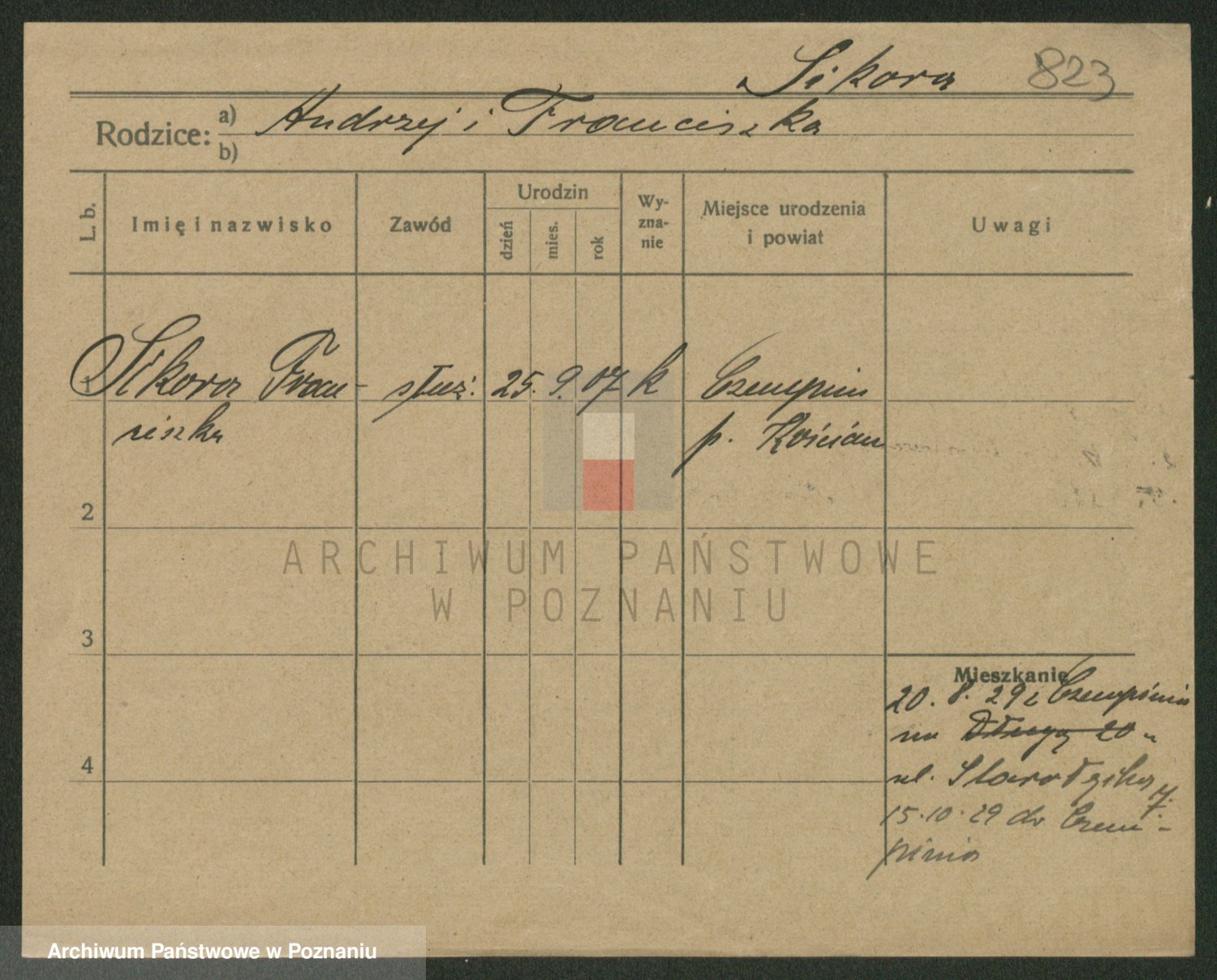 Podgląd karty osobowej dostępny jest po kliknięciu na nazwisko lub ikonkę karty. Można dokonywać powiększenia (ikony na górze) lub przechodzić między kolejnymi skanami (strzałki po bokach).