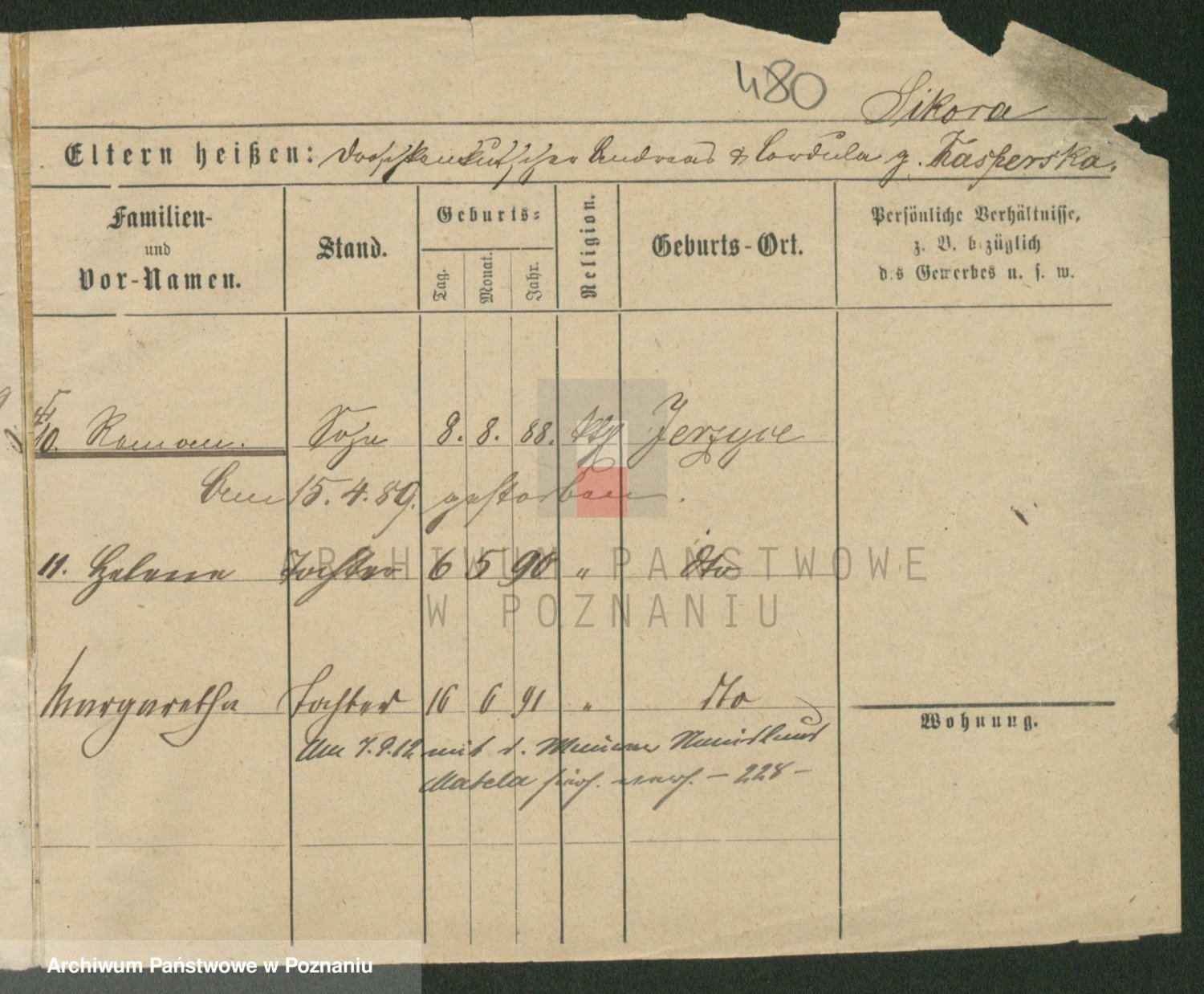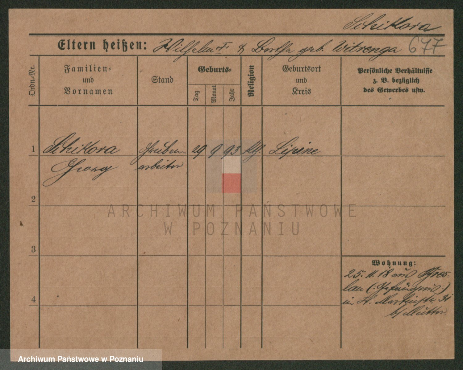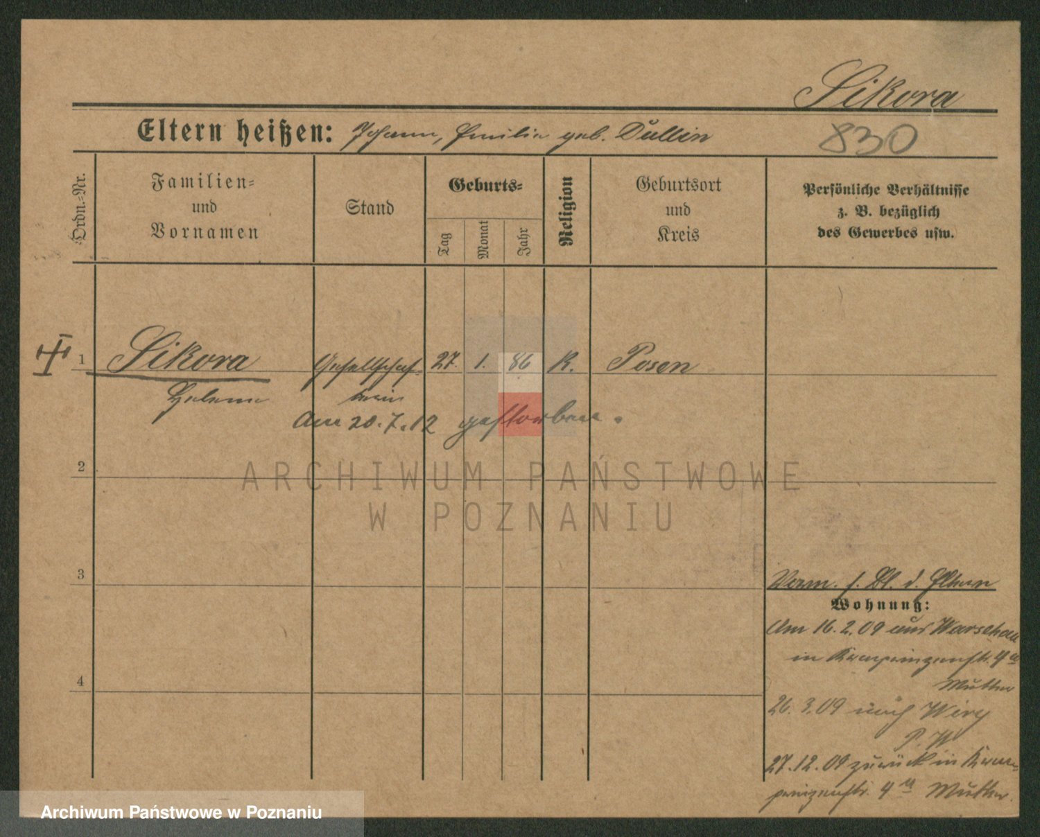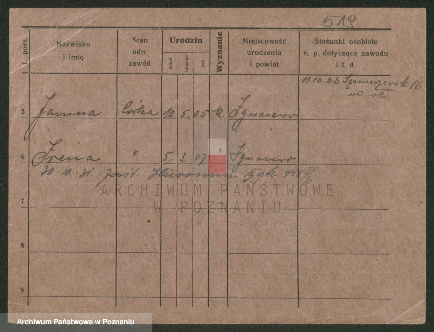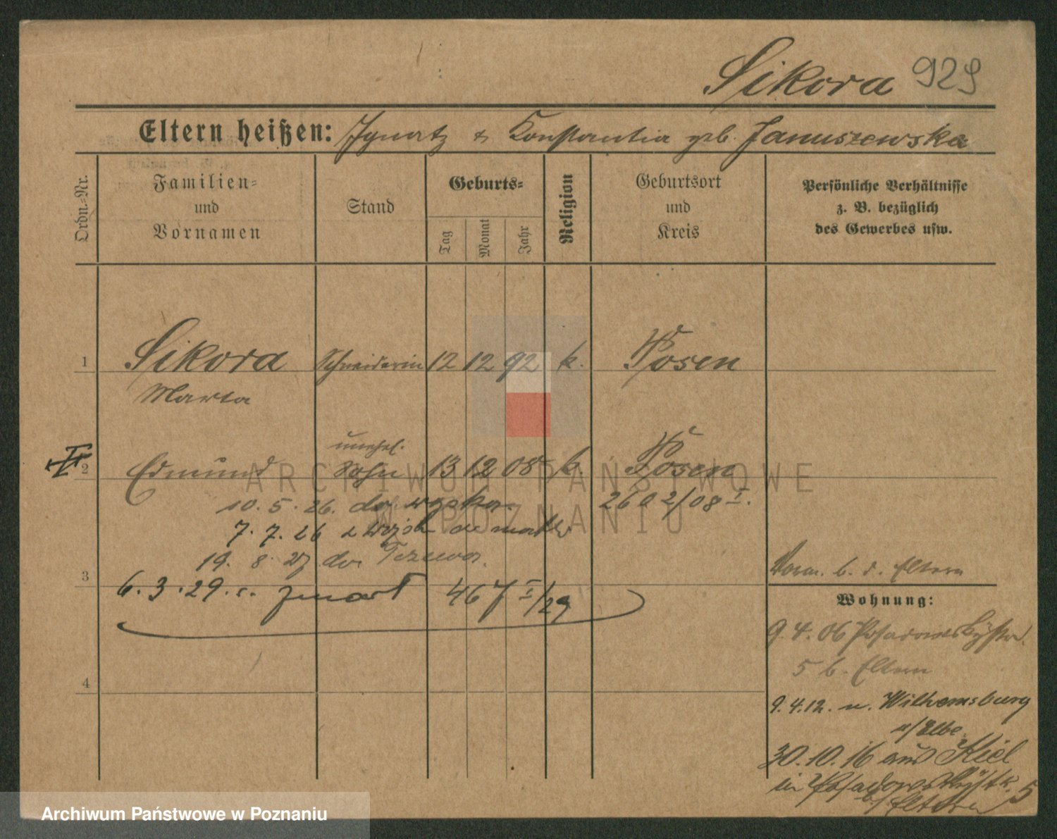 Podgląd karty osobowej dostępny jest po kliknięciu na nazwisko lub ikonkę karty. Można dokonywać powiększenia (ikony na górze) lub przechodzić między kolejnymi skanami (strzałki po bokach).
