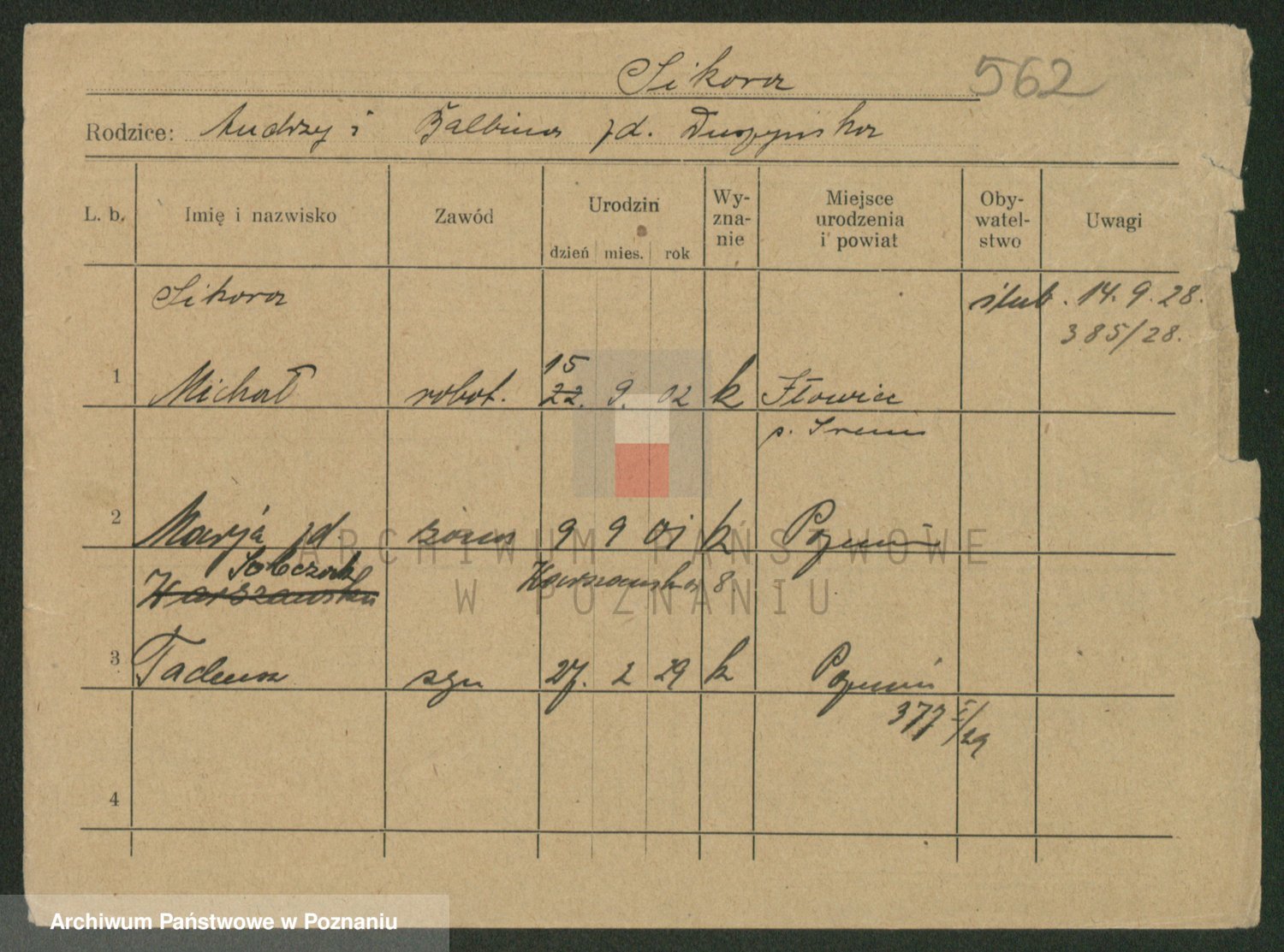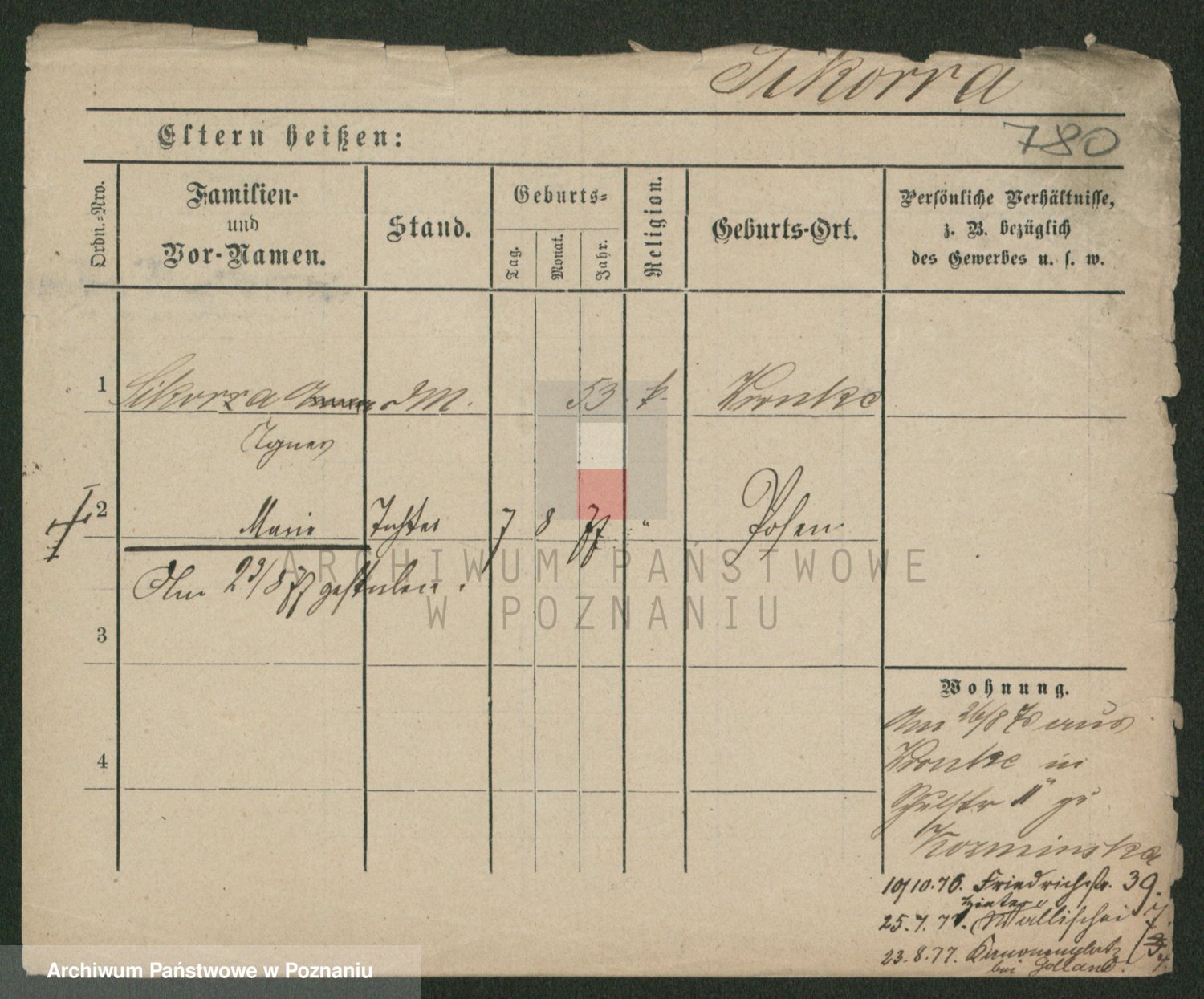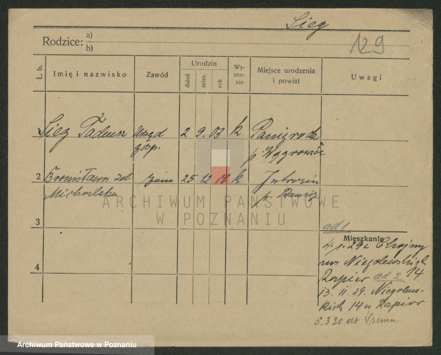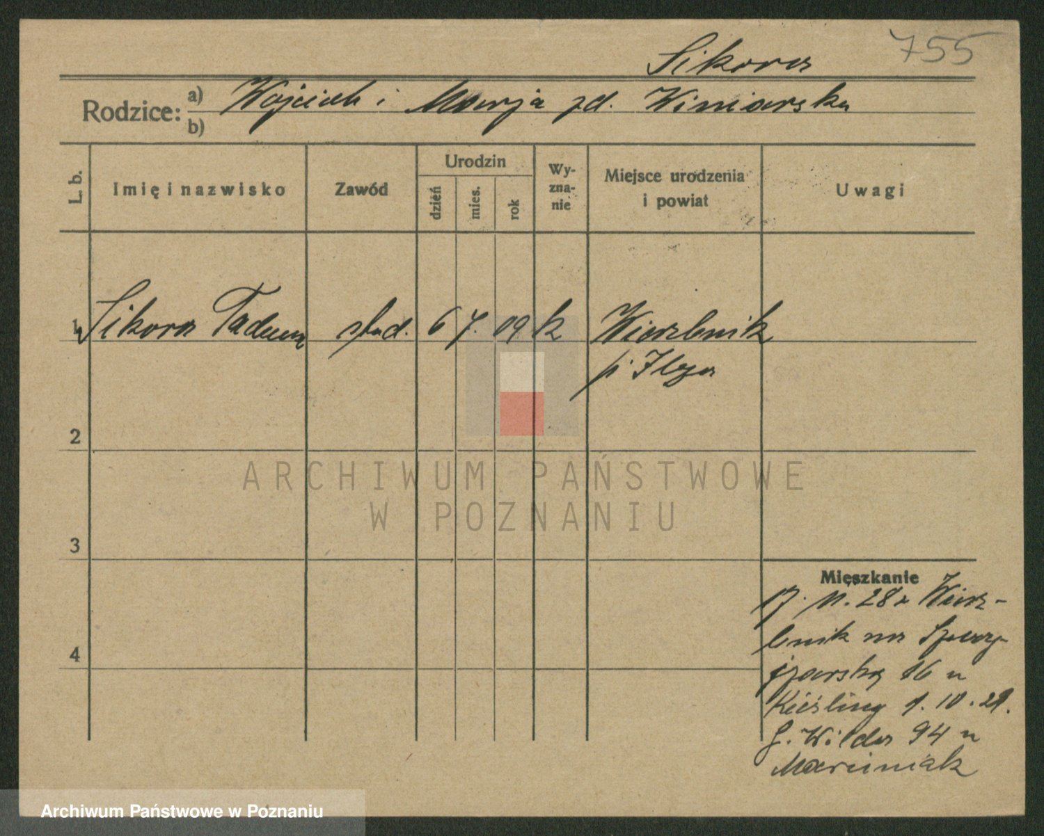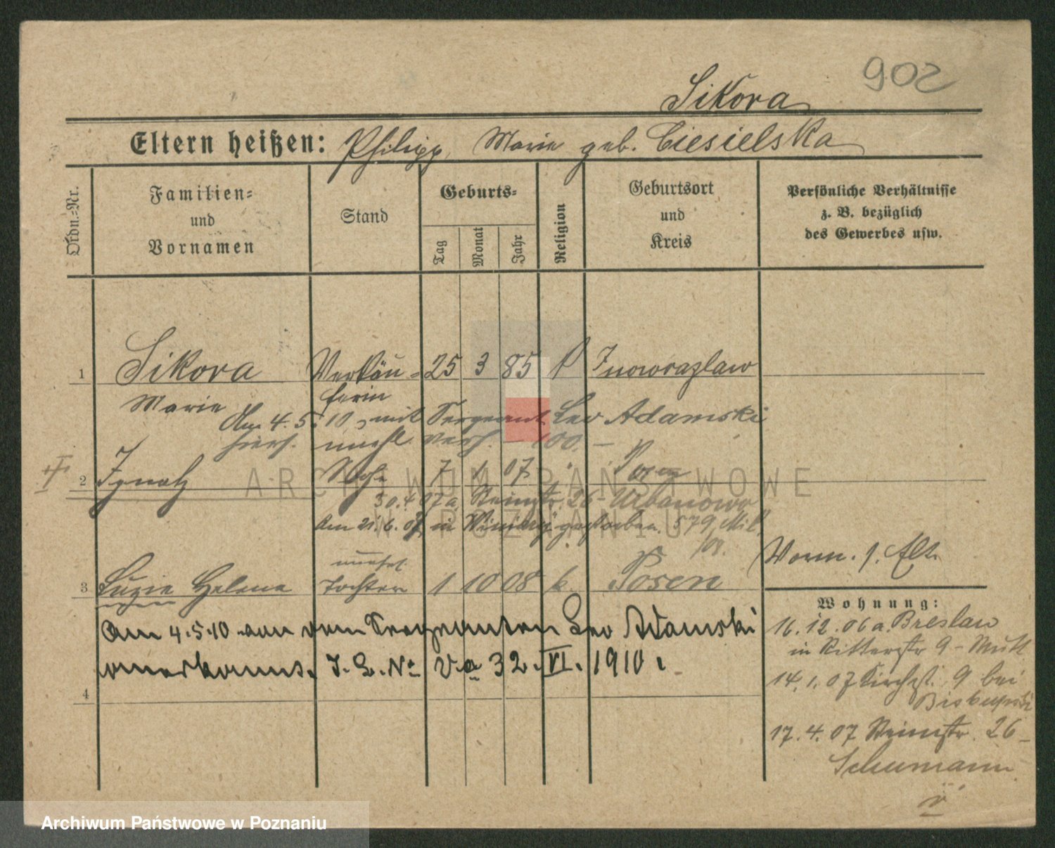 Podgląd karty osobowej dostępny jest po kliknięciu na nazwisko lub ikonkę karty. Można dokonywać powiększenia (ikony na górze) lub przechodzić między kolejnymi skanami (strzałki po bokach).