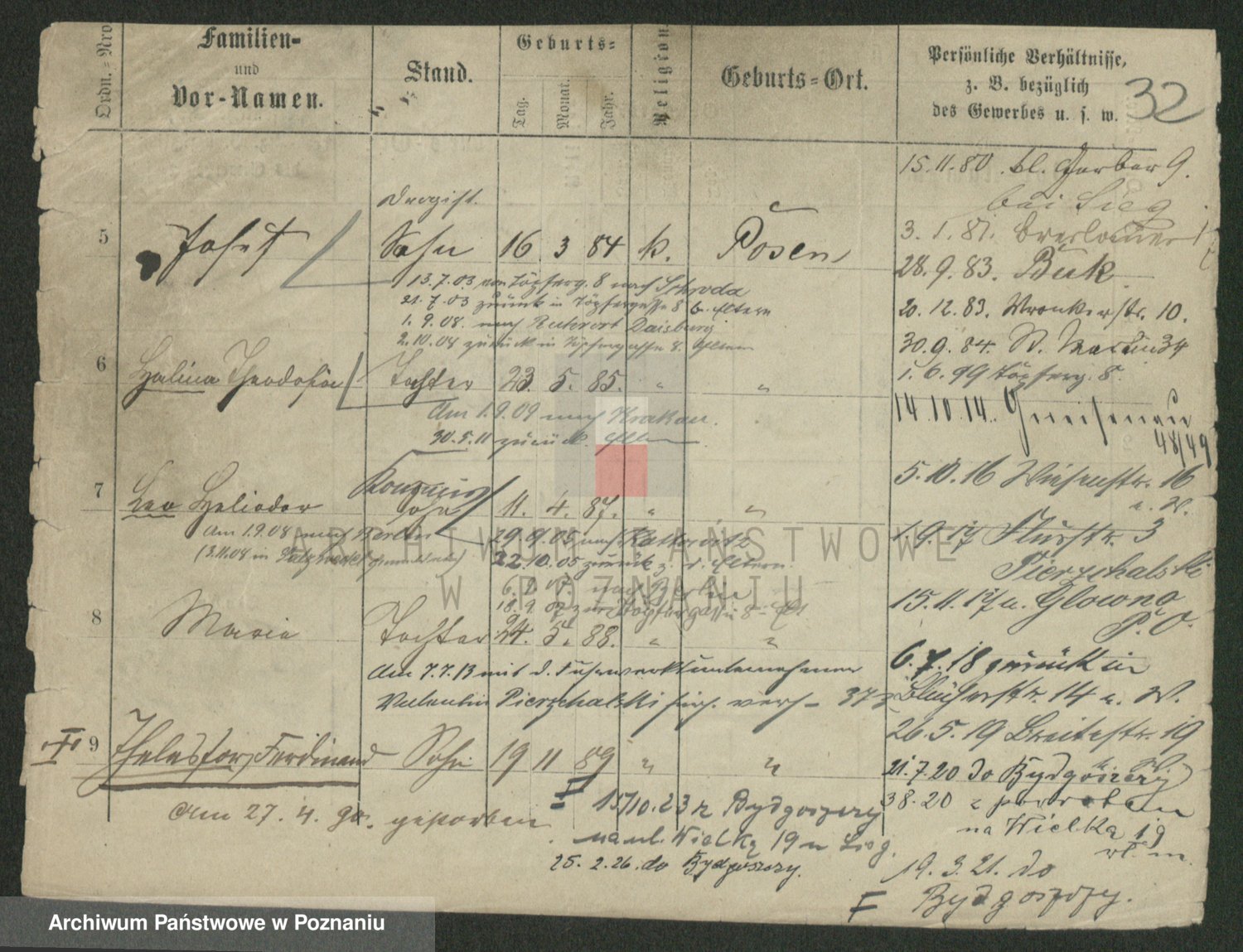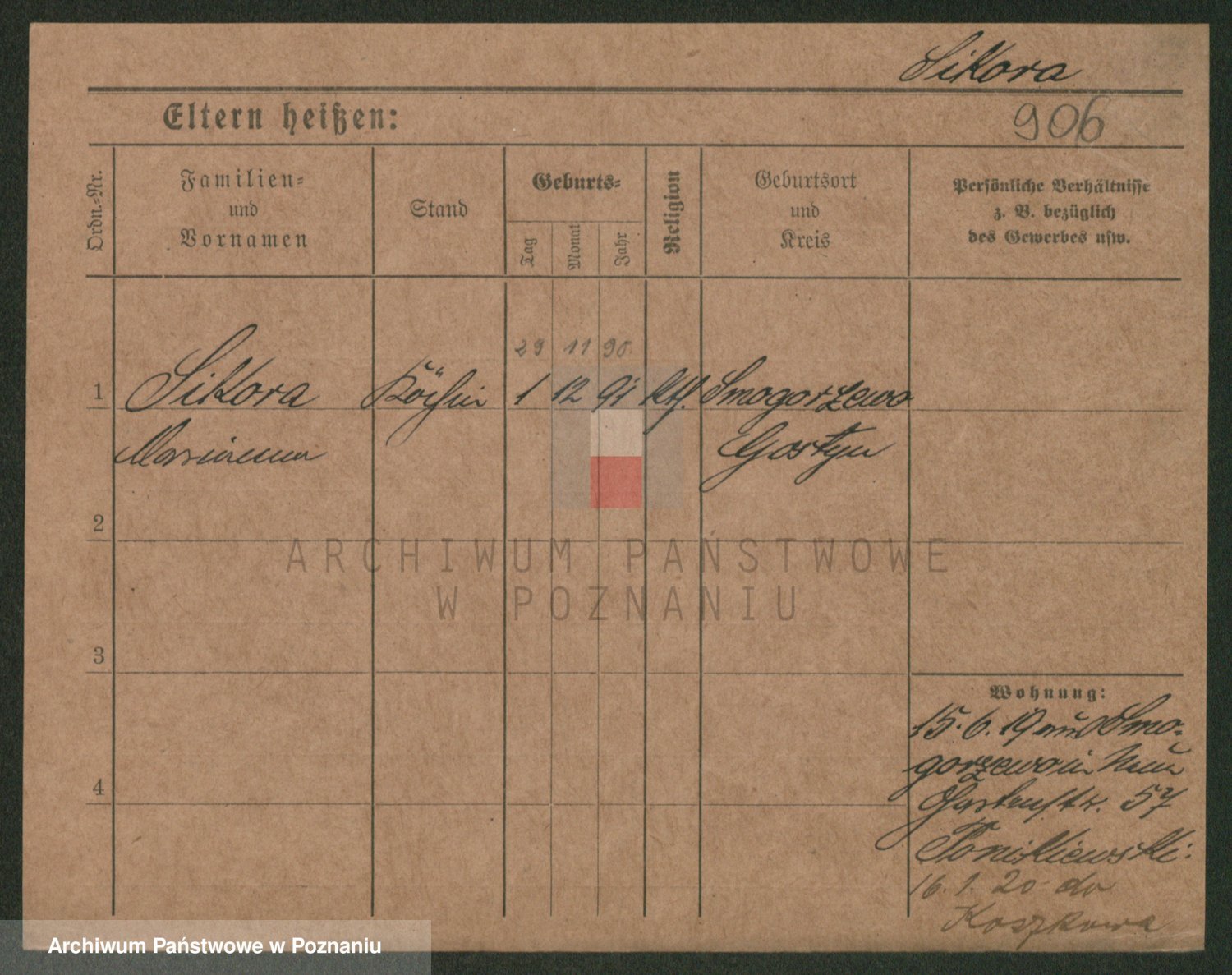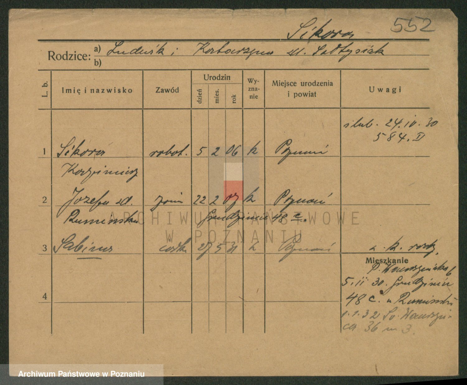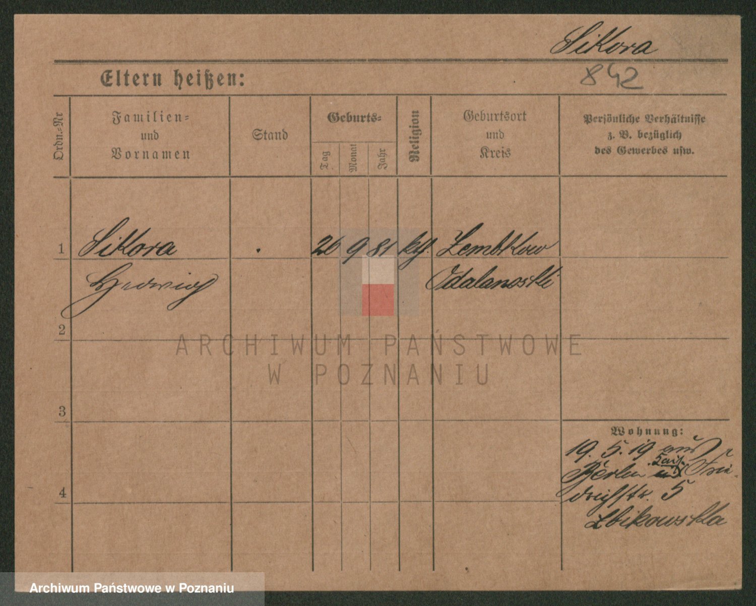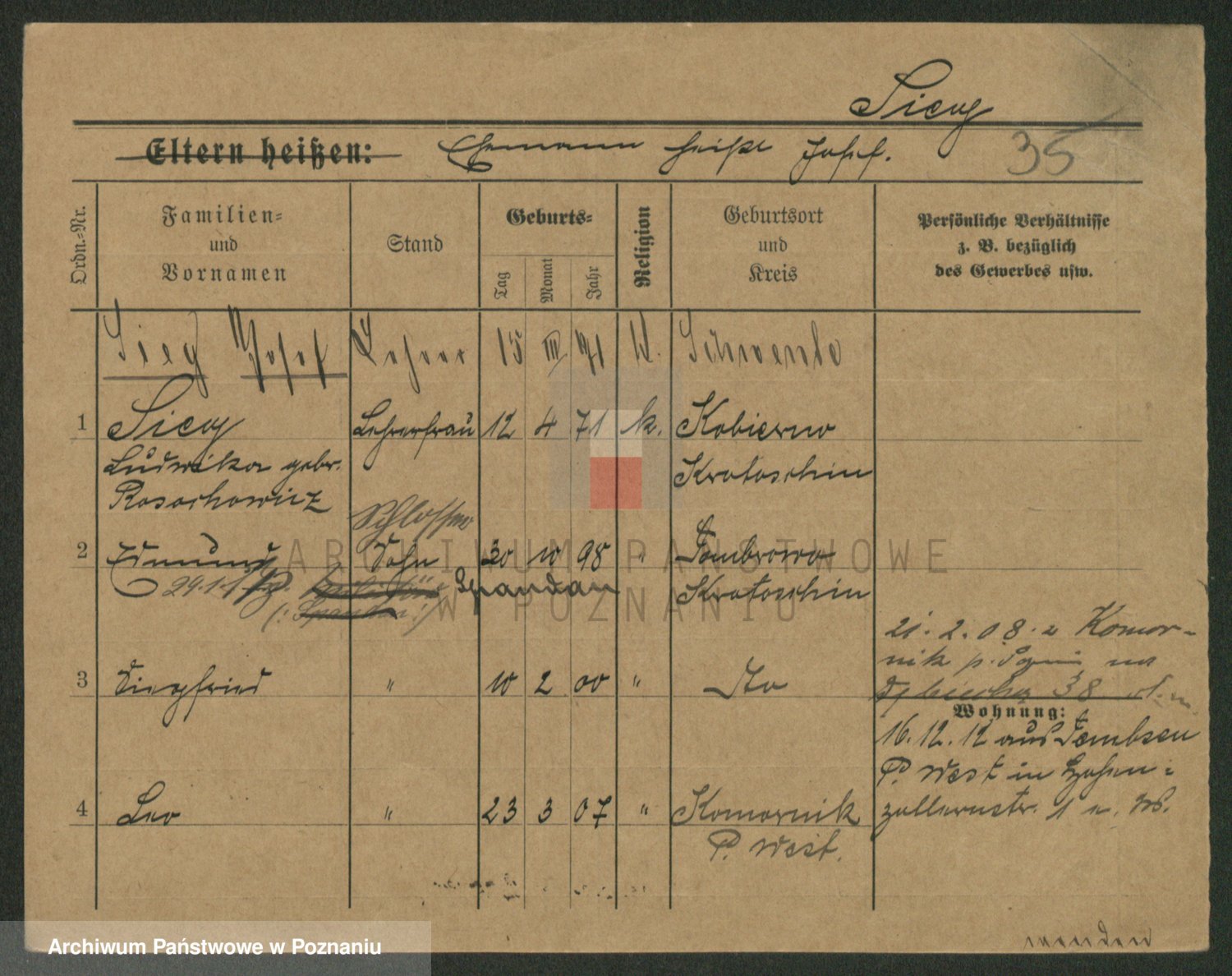 Podgląd karty osobowej dostępny jest po kliknięciu na nazwisko lub ikonkę karty. Można dokonywać powiększenia (ikony na górze) lub przechodzić między kolejnymi skanami (strzałki po bokach).