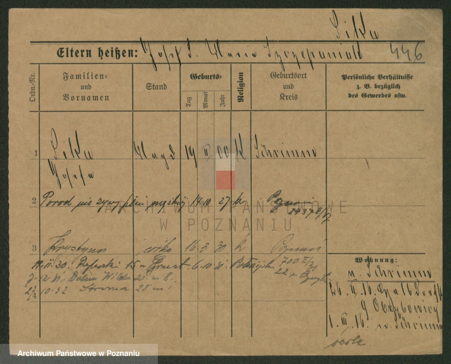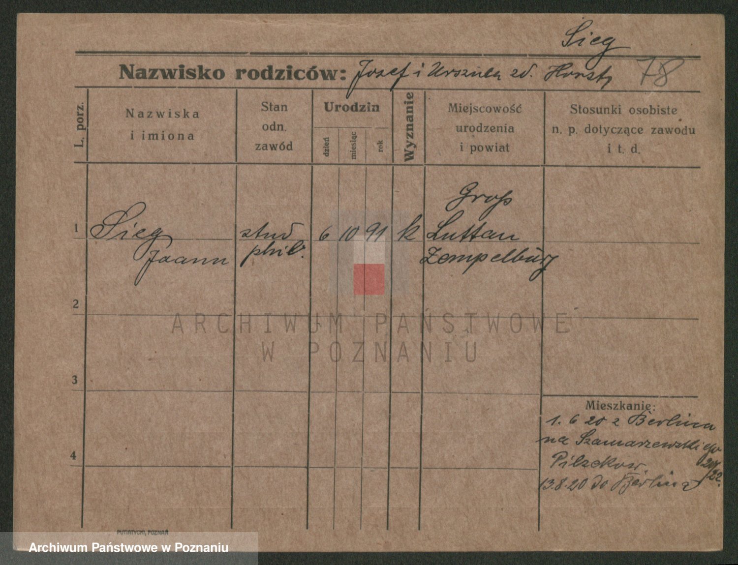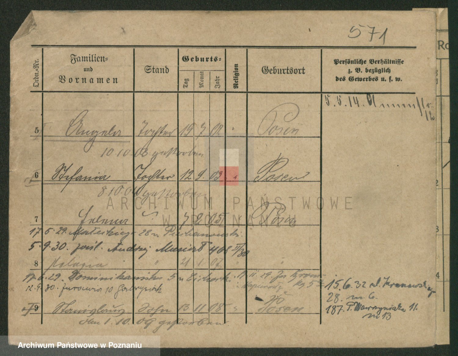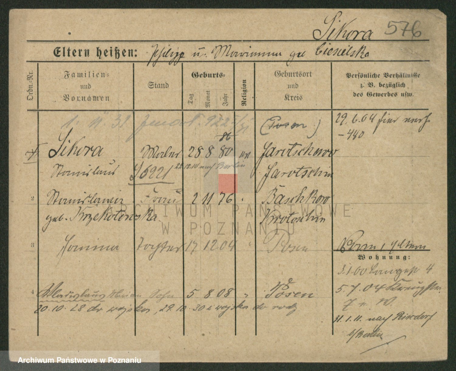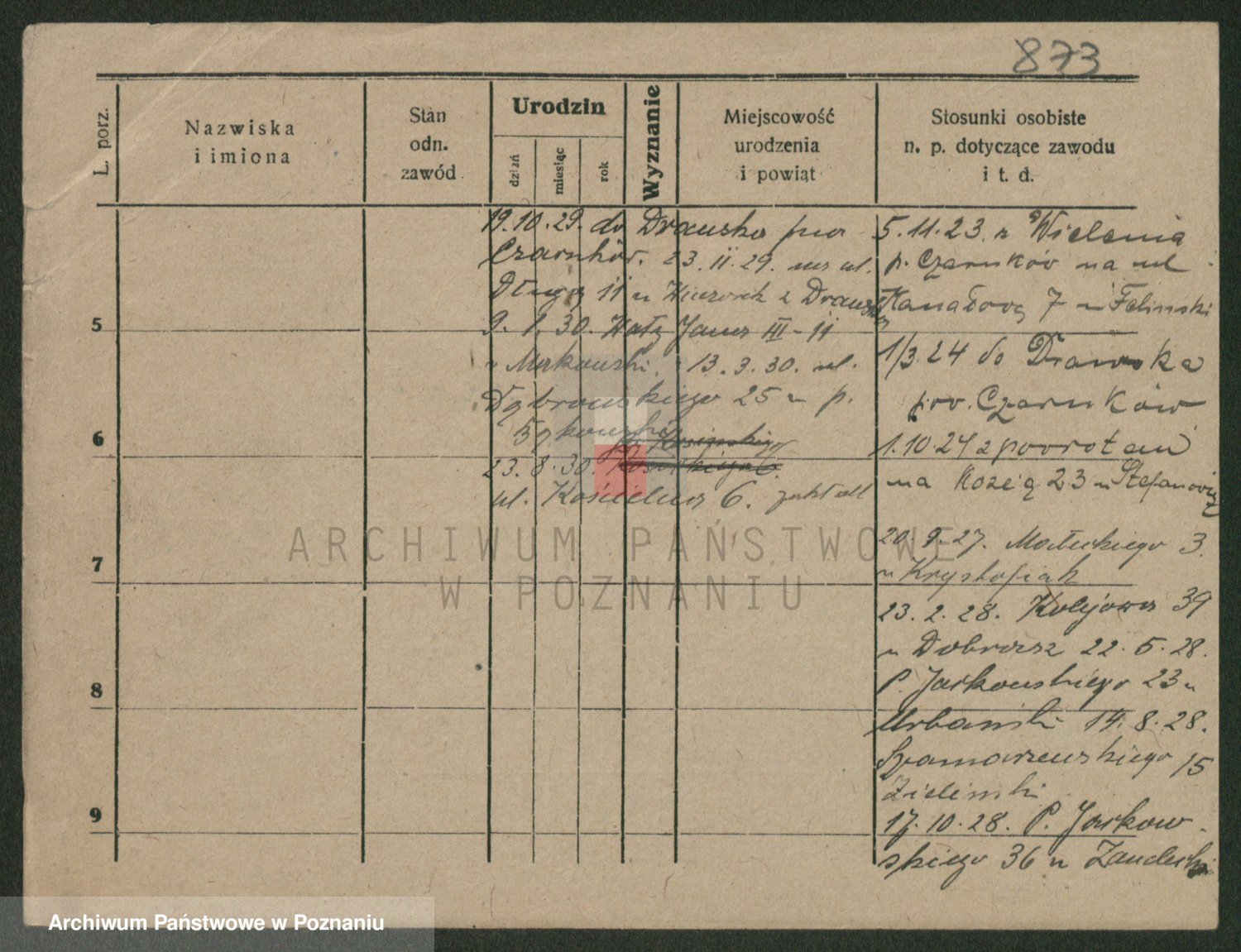 Podgląd karty osobowej dostępny jest po kliknięciu na nazwisko lub ikonkę karty. Można dokonywać powiększenia (ikony na górze) lub przechodzić między kolejnymi skanami (strzałki po bokach).