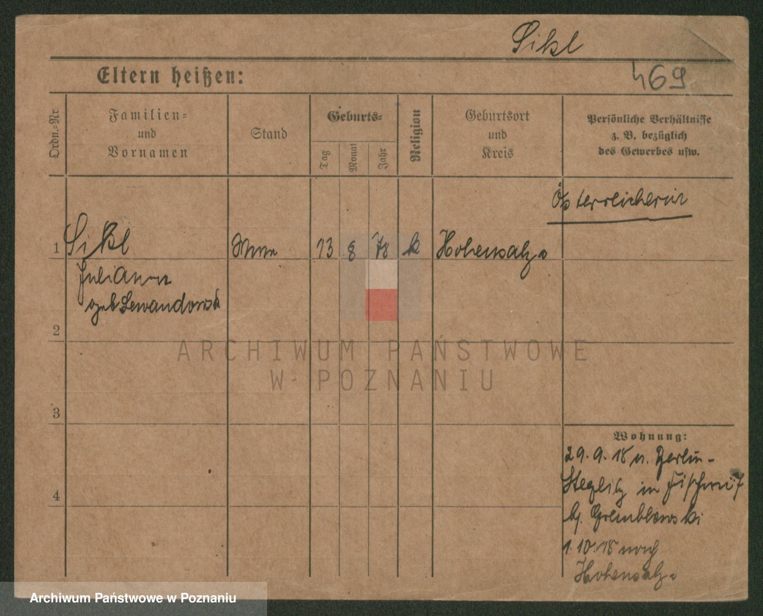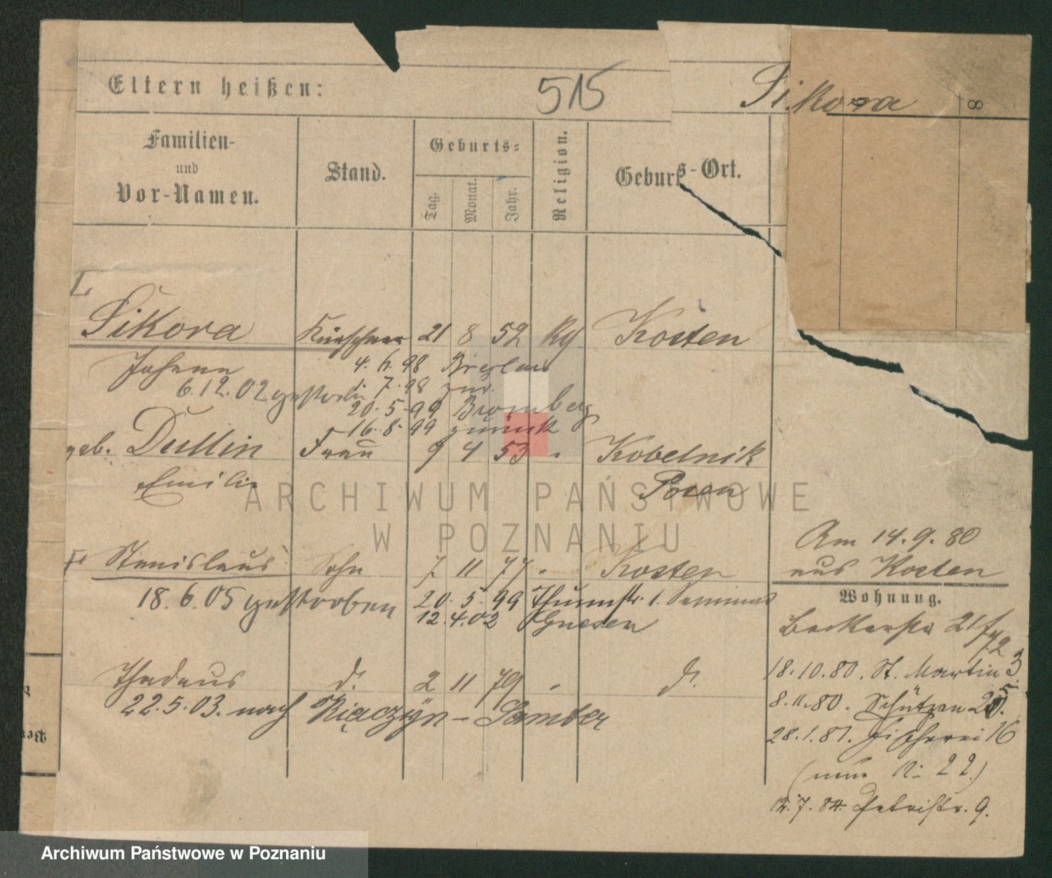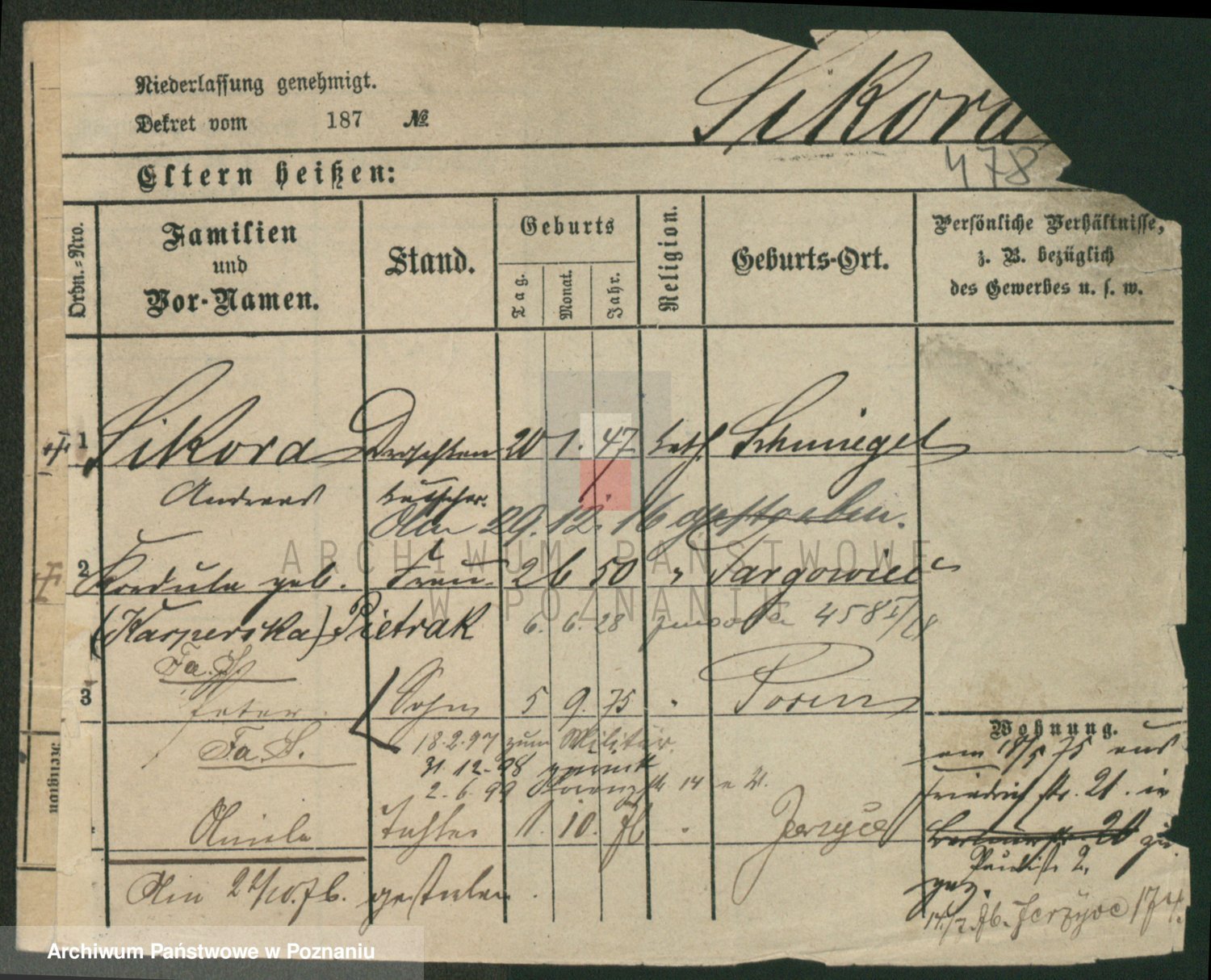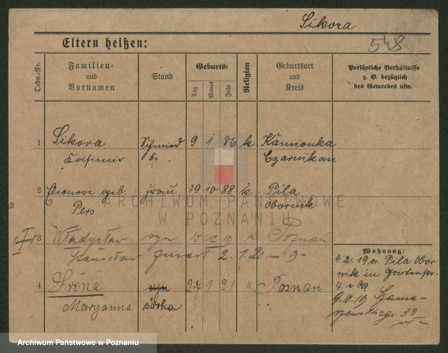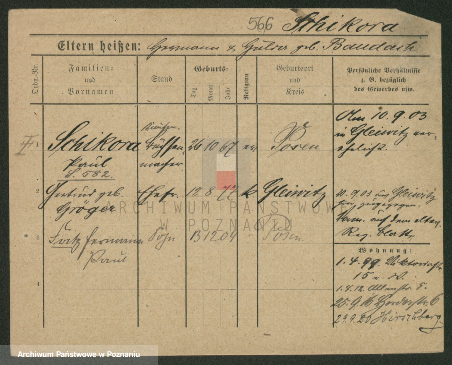 Podgląd karty osobowej dostępny jest po kliknięciu na nazwisko lub ikonkę karty. Można dokonywać powiększenia (ikony na górze) lub przechodzić między kolejnymi skanami (strzałki po bokach).