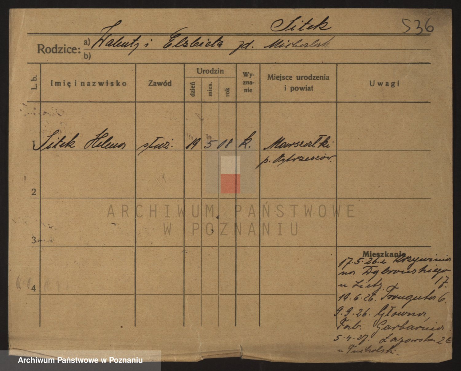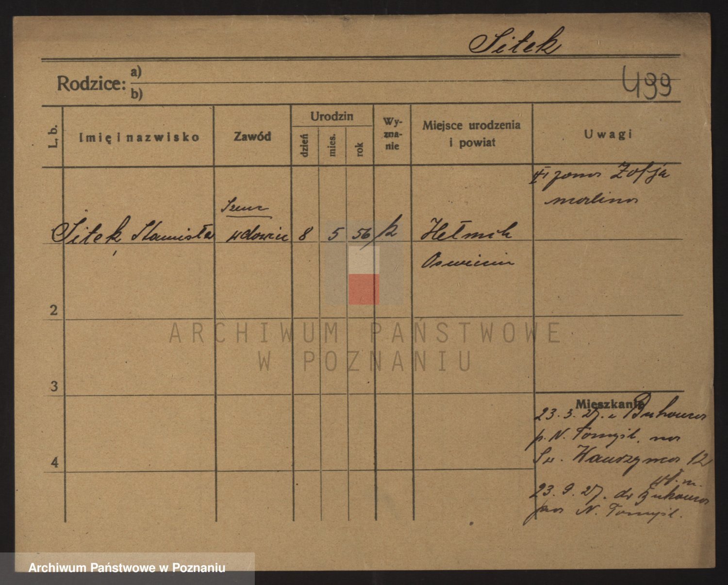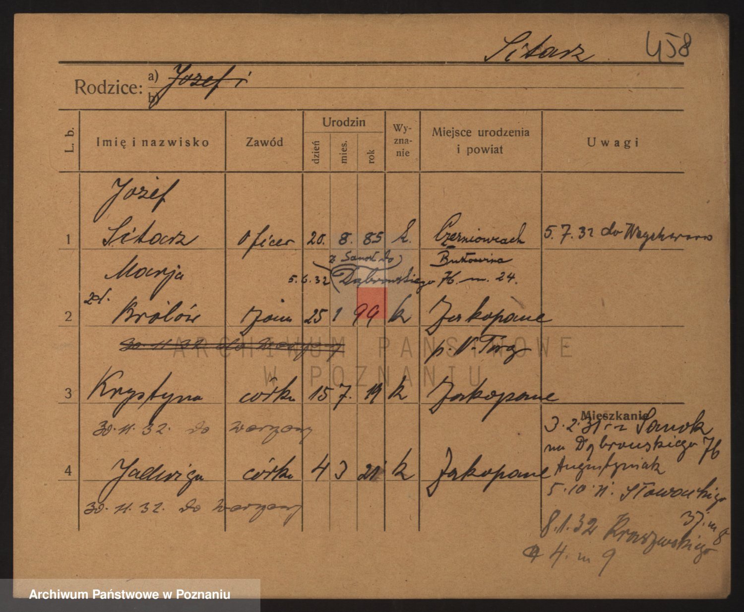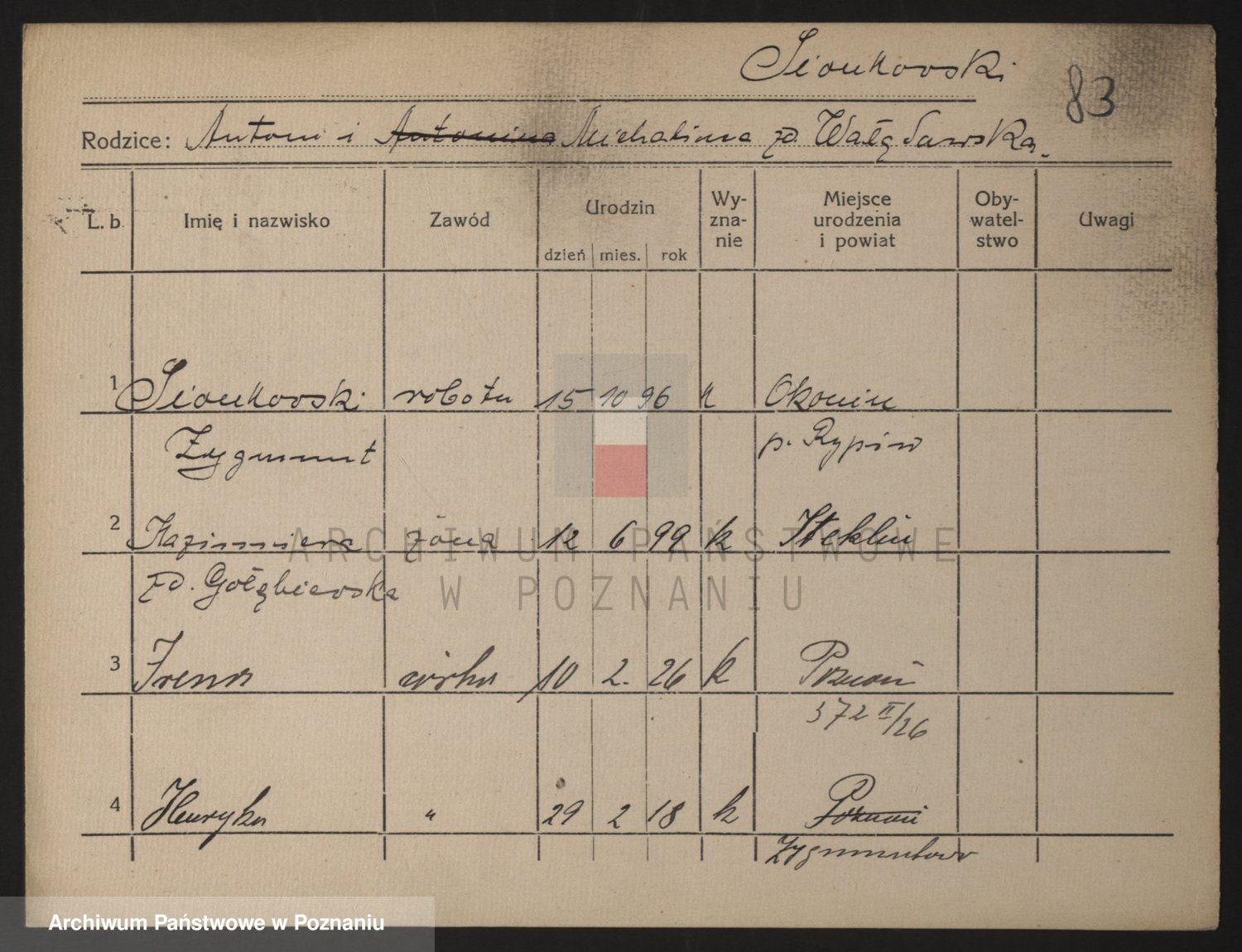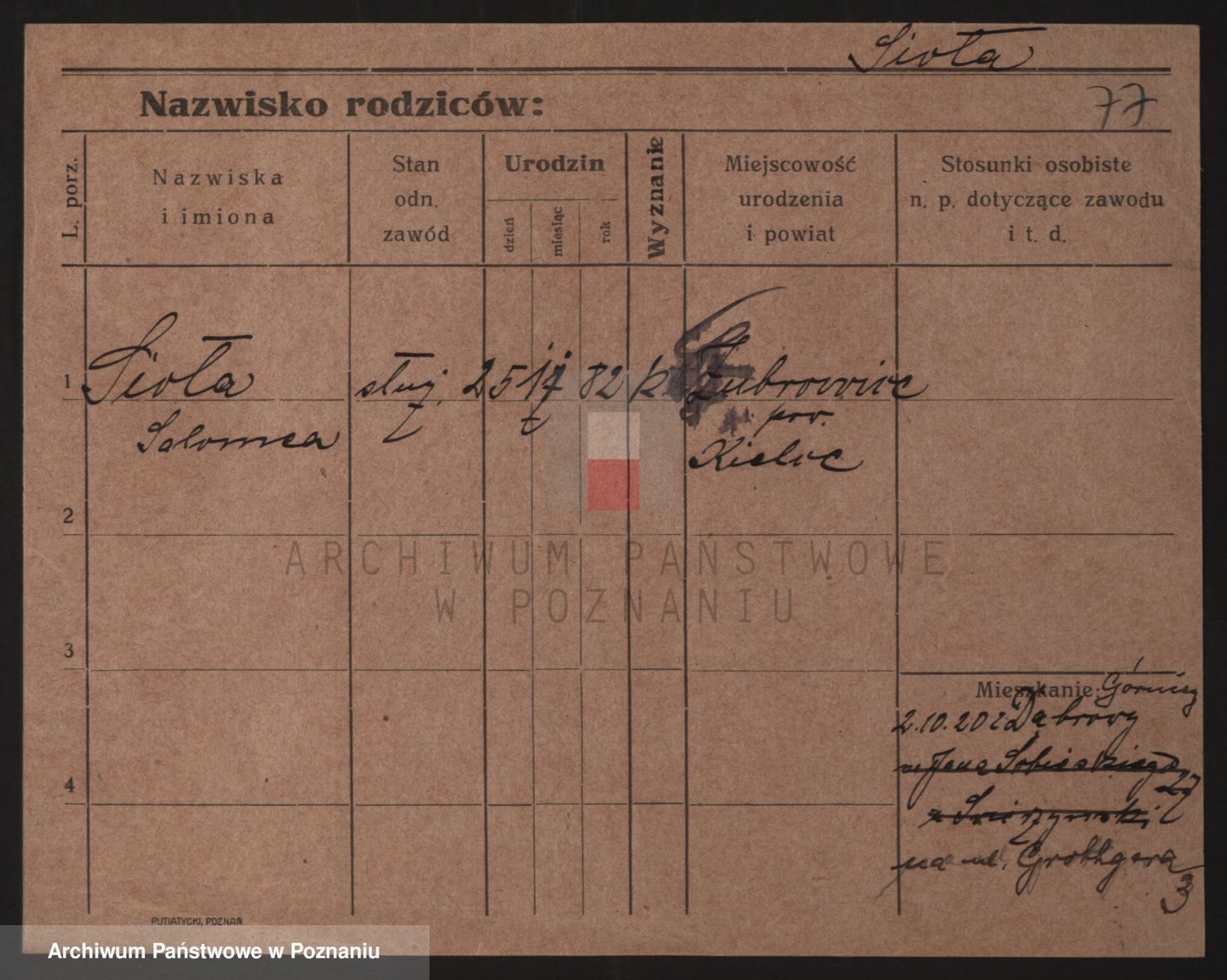 Podgląd karty osobowej dostępny jest po kliknięciu na nazwisko lub ikonkę karty. Można dokonywać powiększenia (ikony na górze) lub przechodzić między kolejnymi skanami (strzałki po bokach).