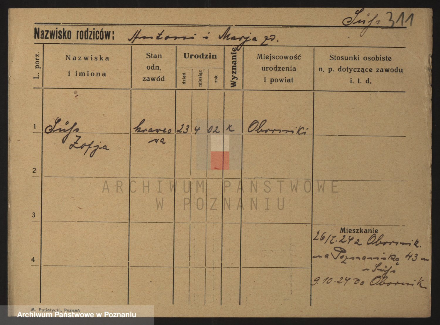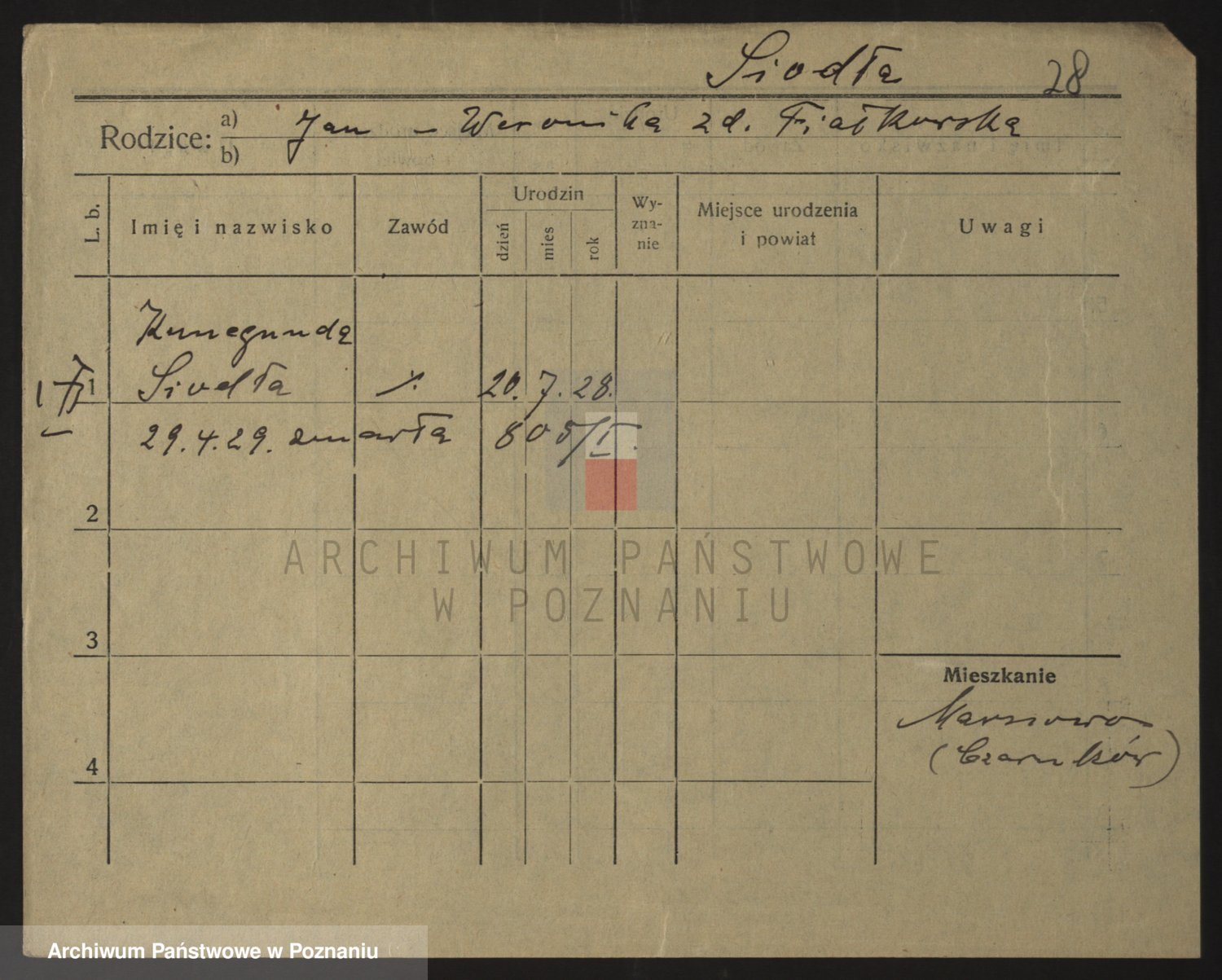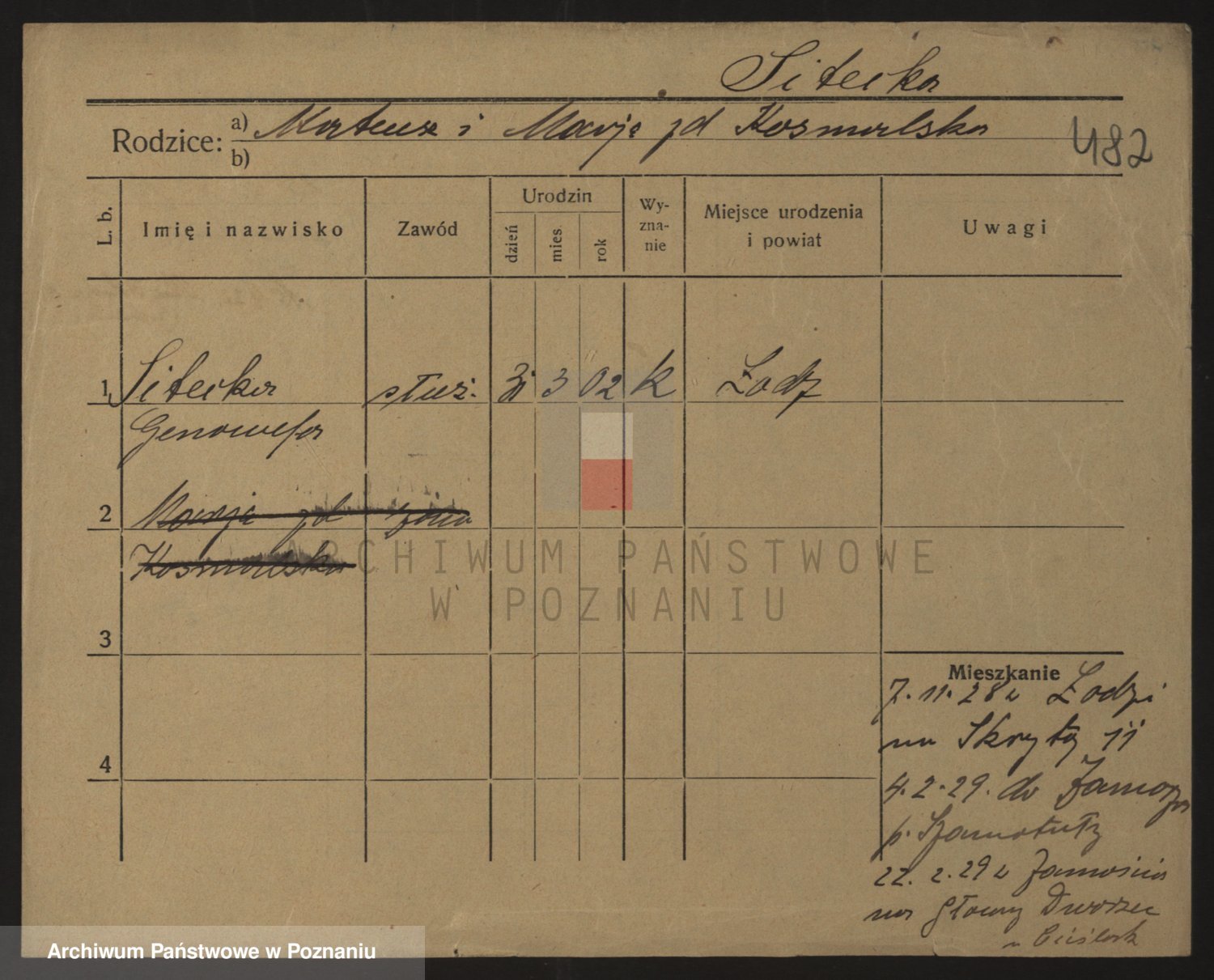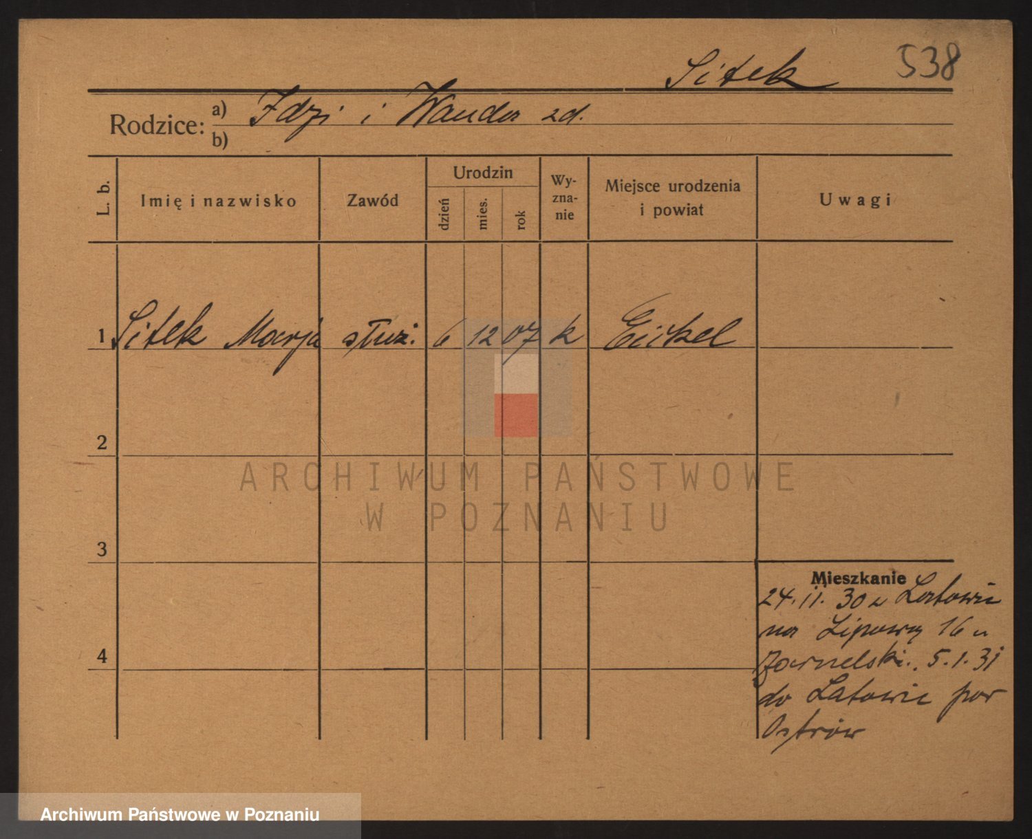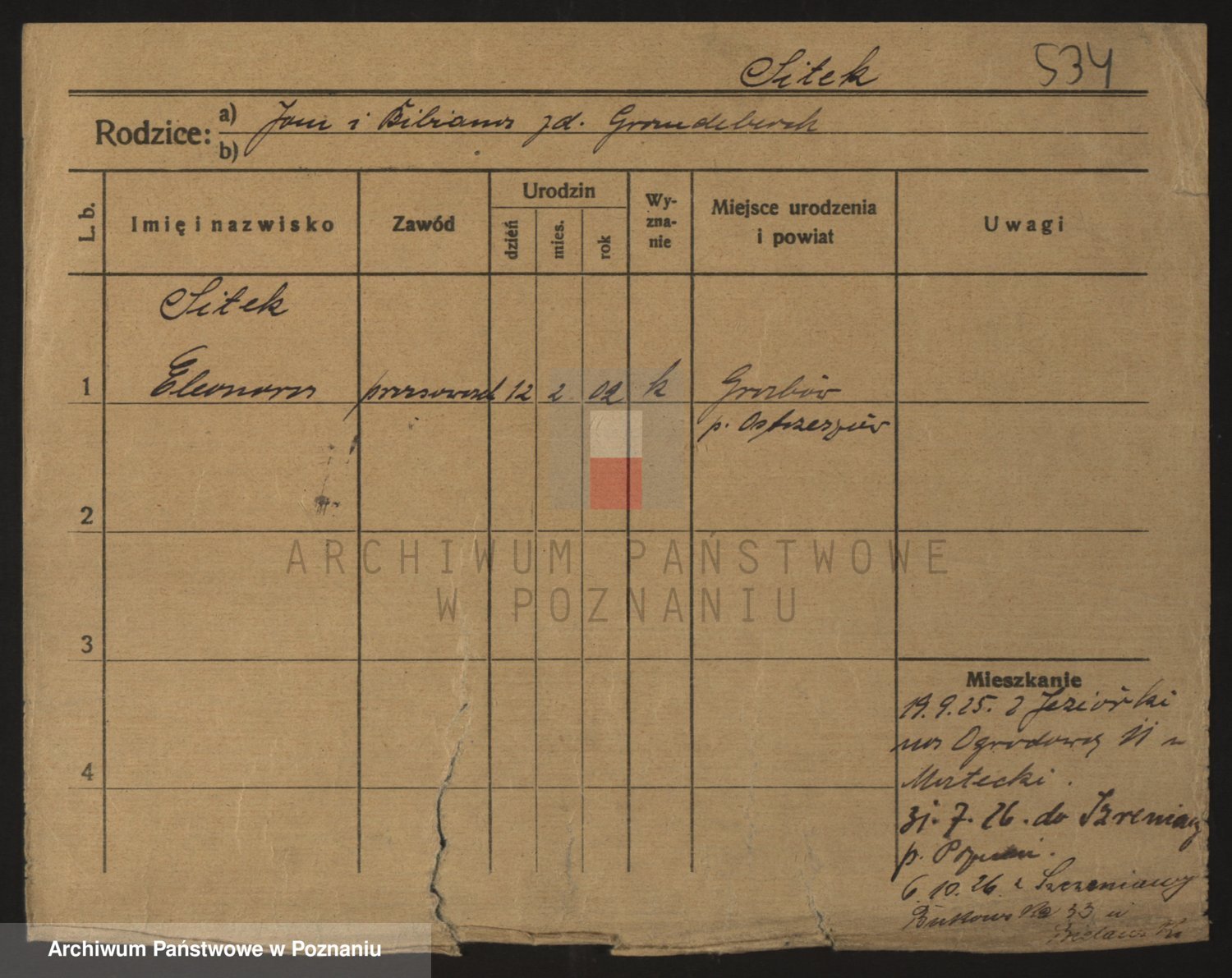 Podgląd karty osobowej dostępny jest po kliknięciu na nazwisko lub ikonkę karty. Można dokonywać powiększenia (ikony na górze) lub przechodzić między kolejnymi skanami (strzałki po bokach).