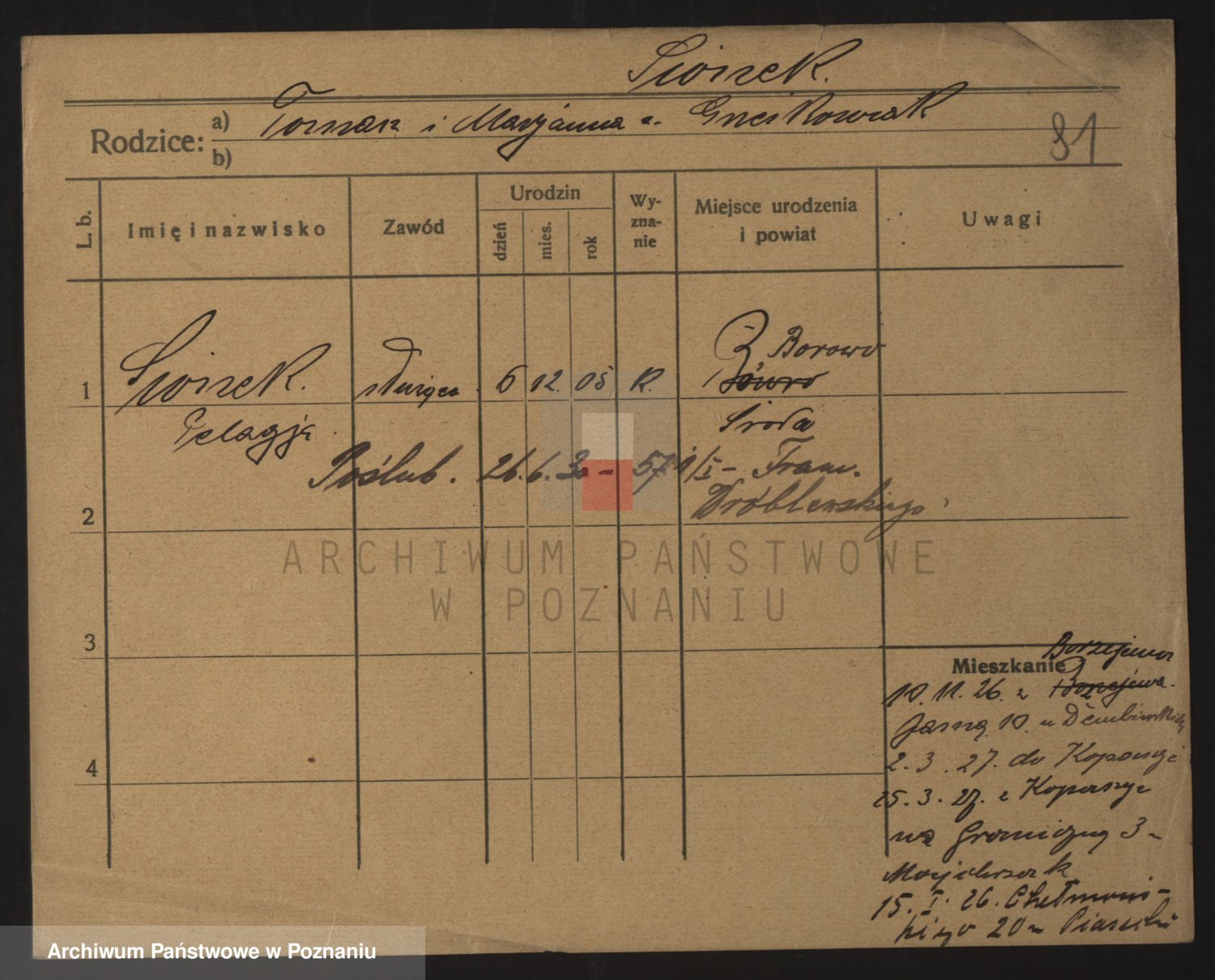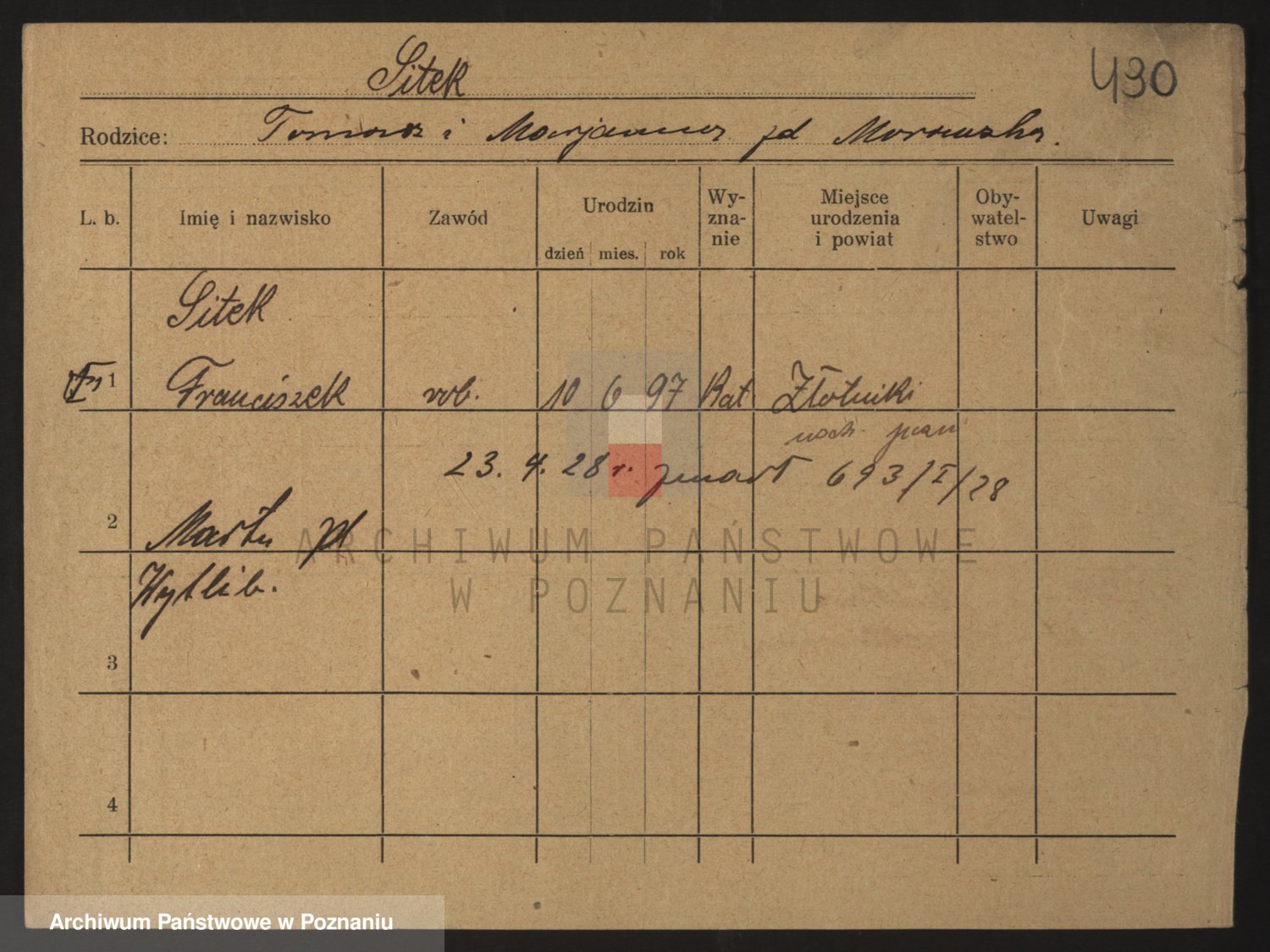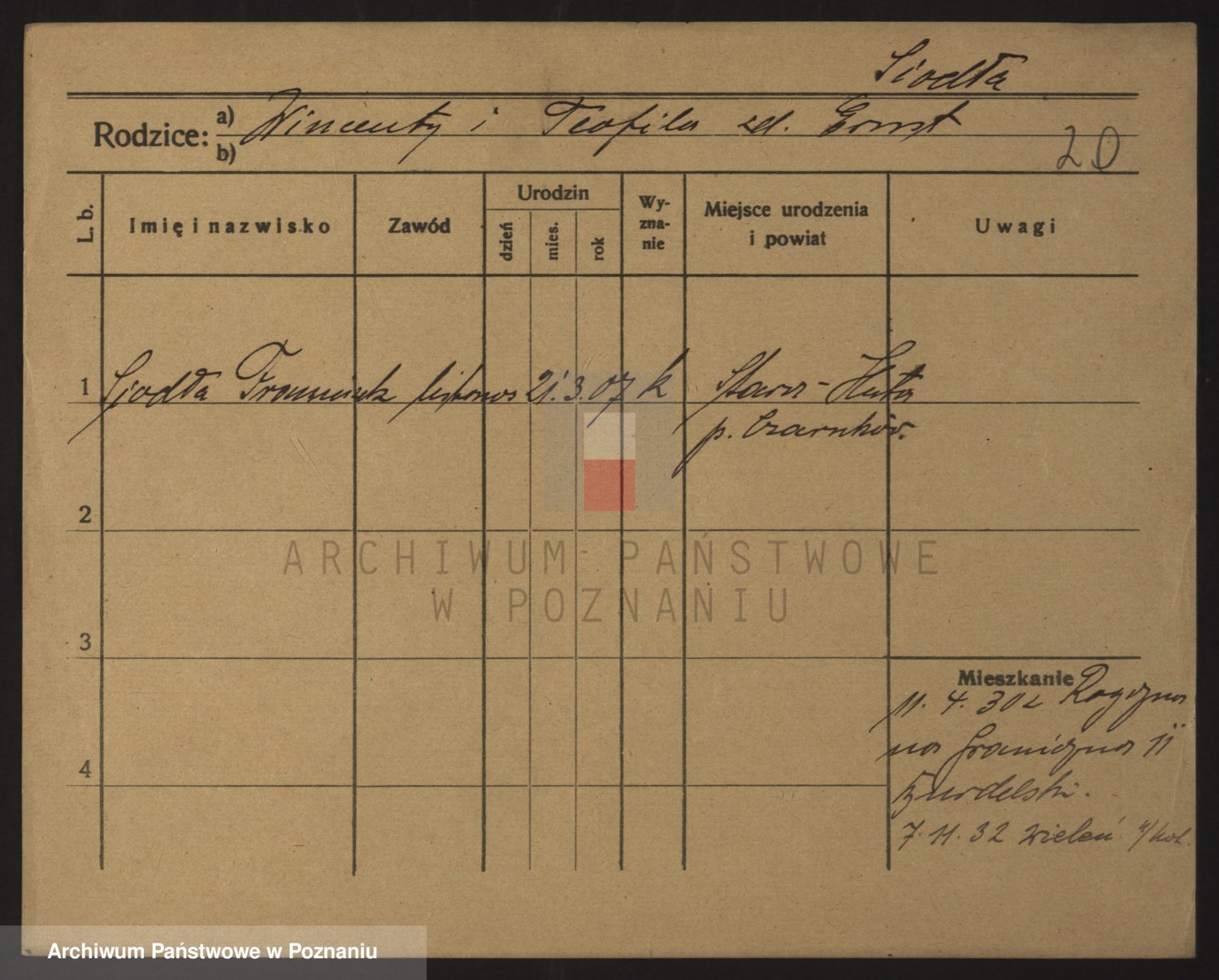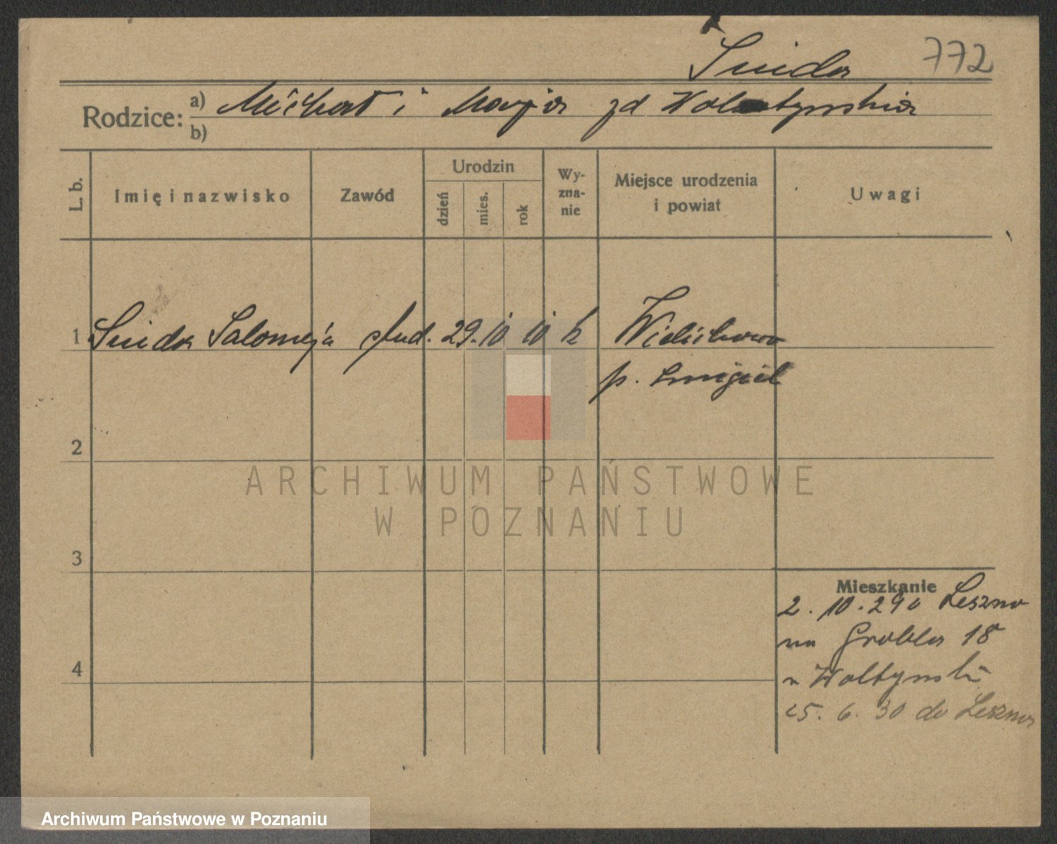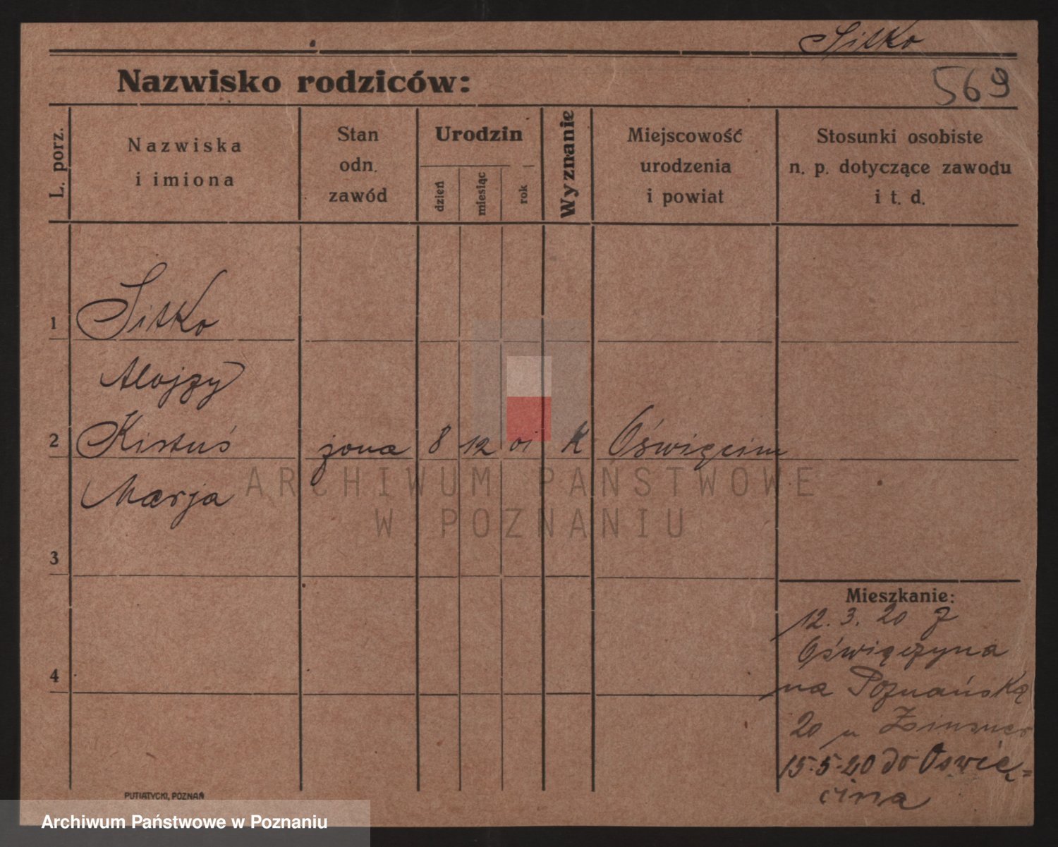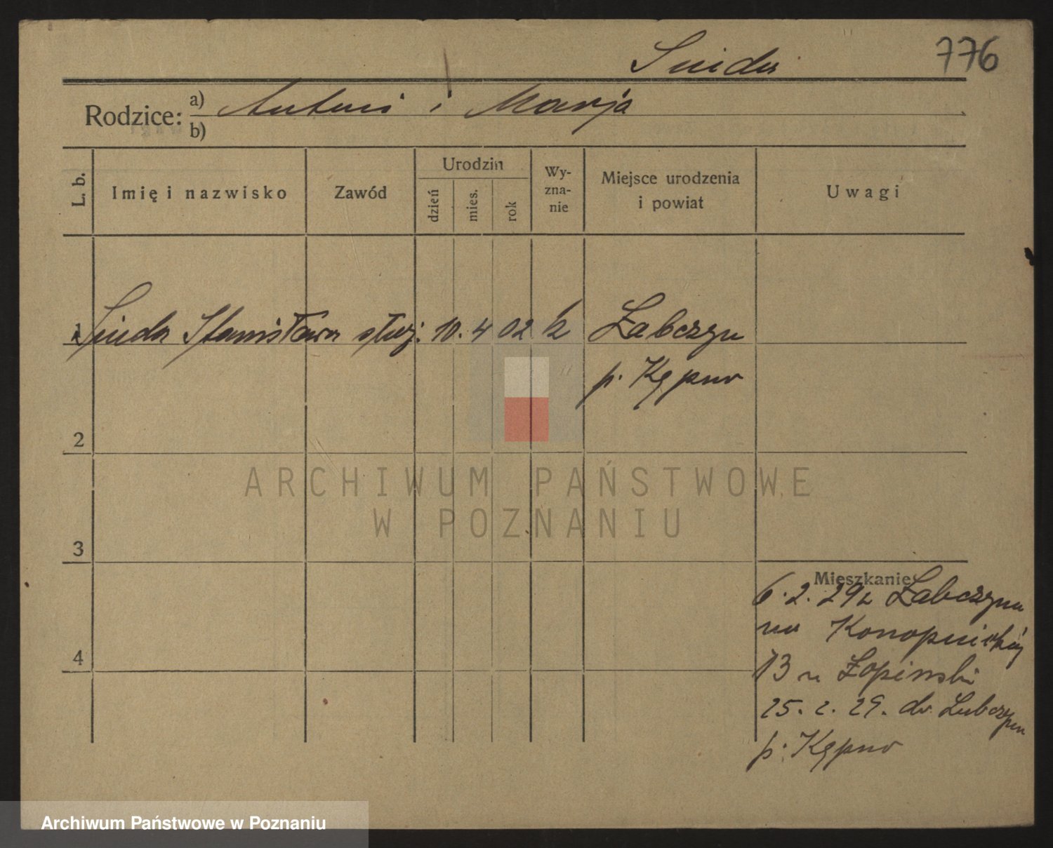 Podgląd karty osobowej dostępny jest po kliknięciu na nazwisko lub ikonkę karty. Można dokonywać powiększenia (ikony na górze) lub przechodzić między kolejnymi skanami (strzałki po bokach).