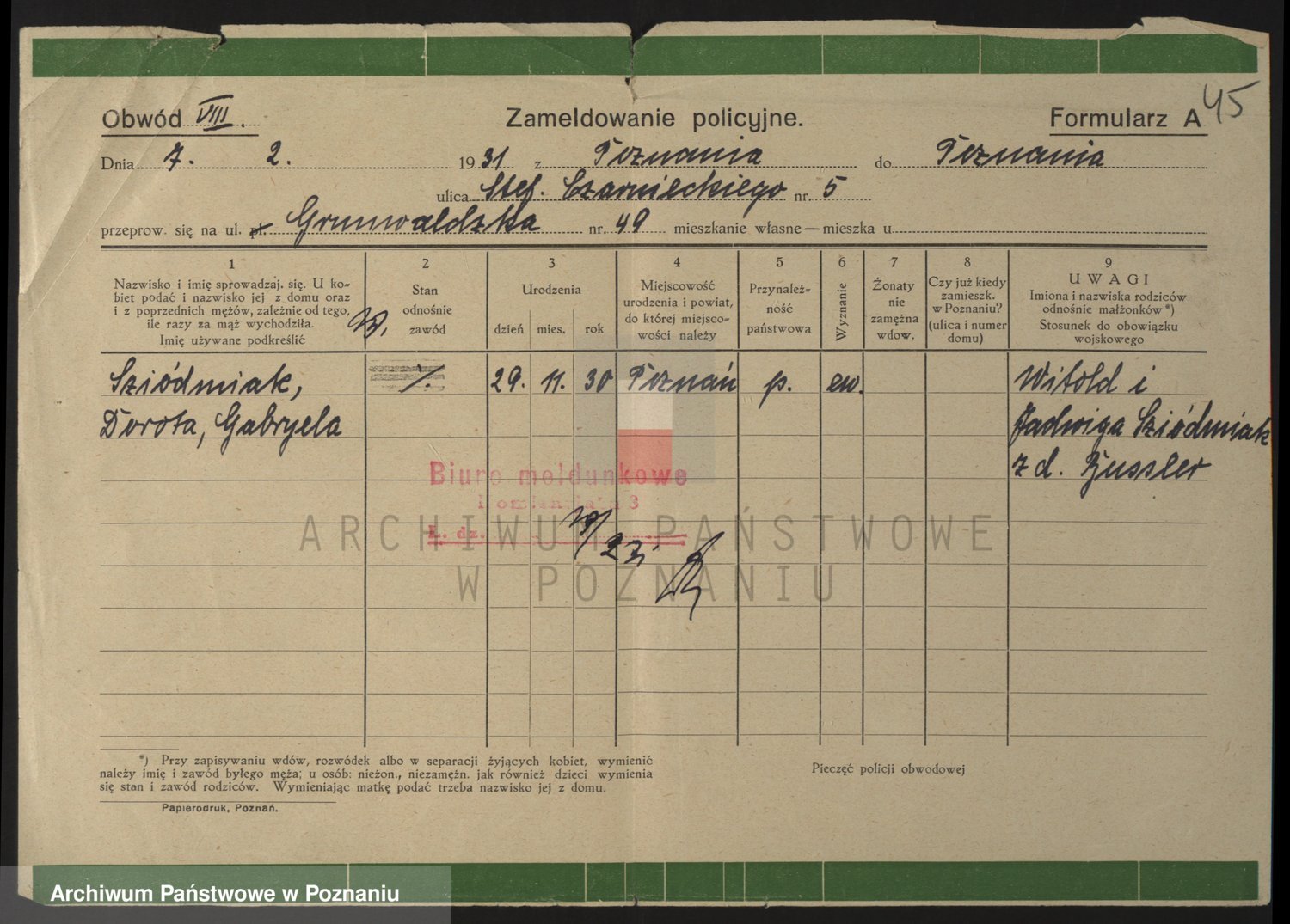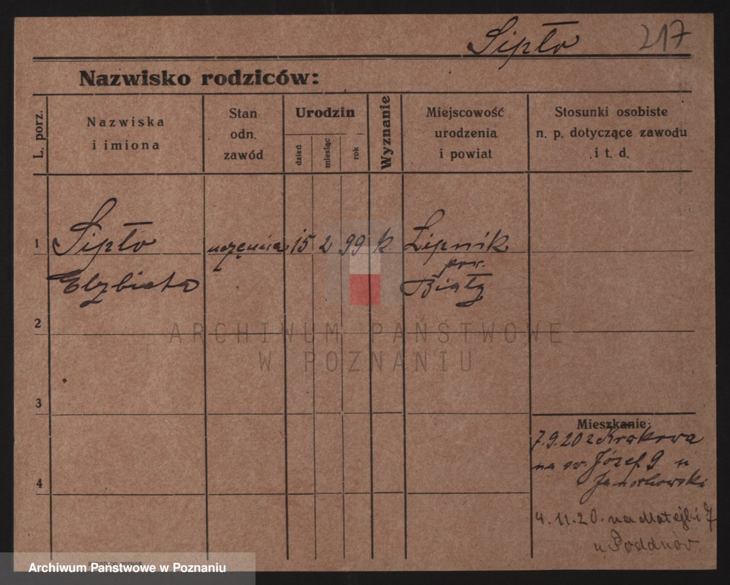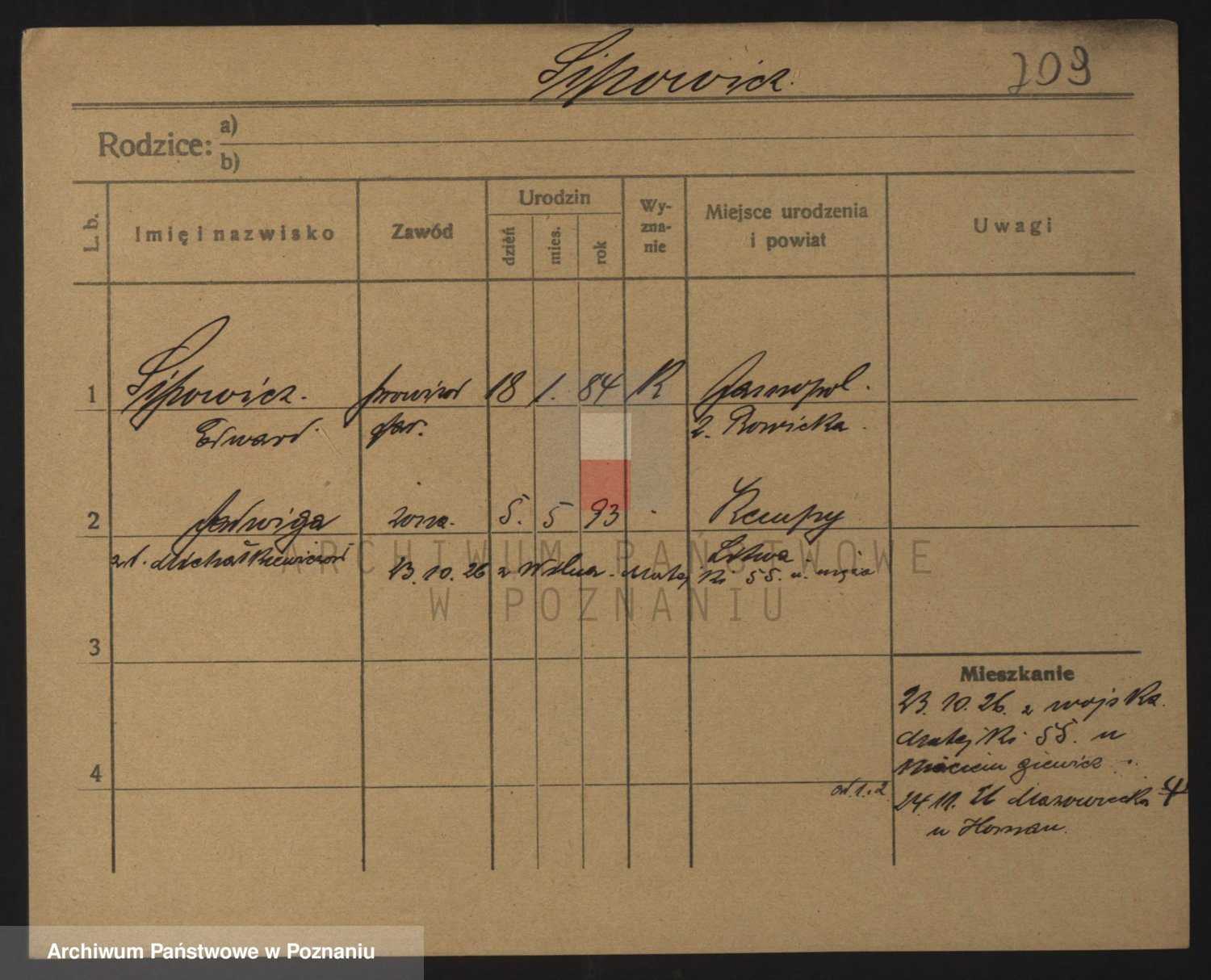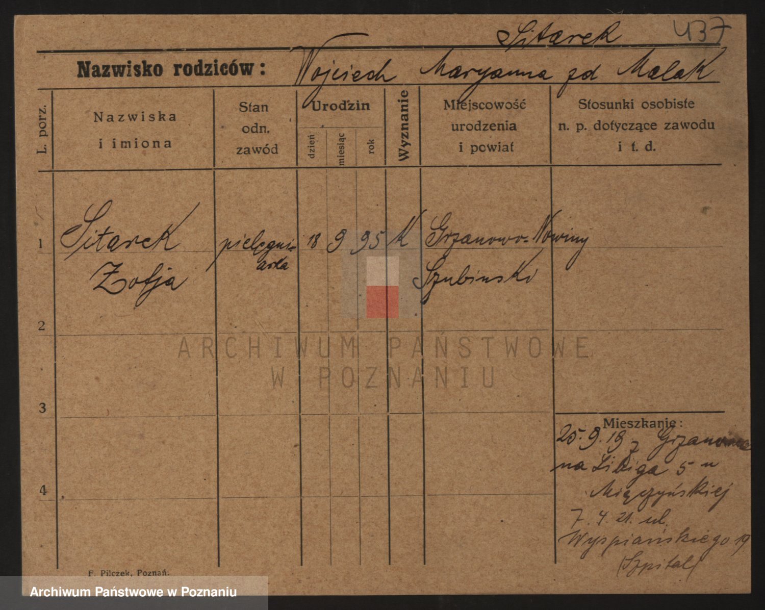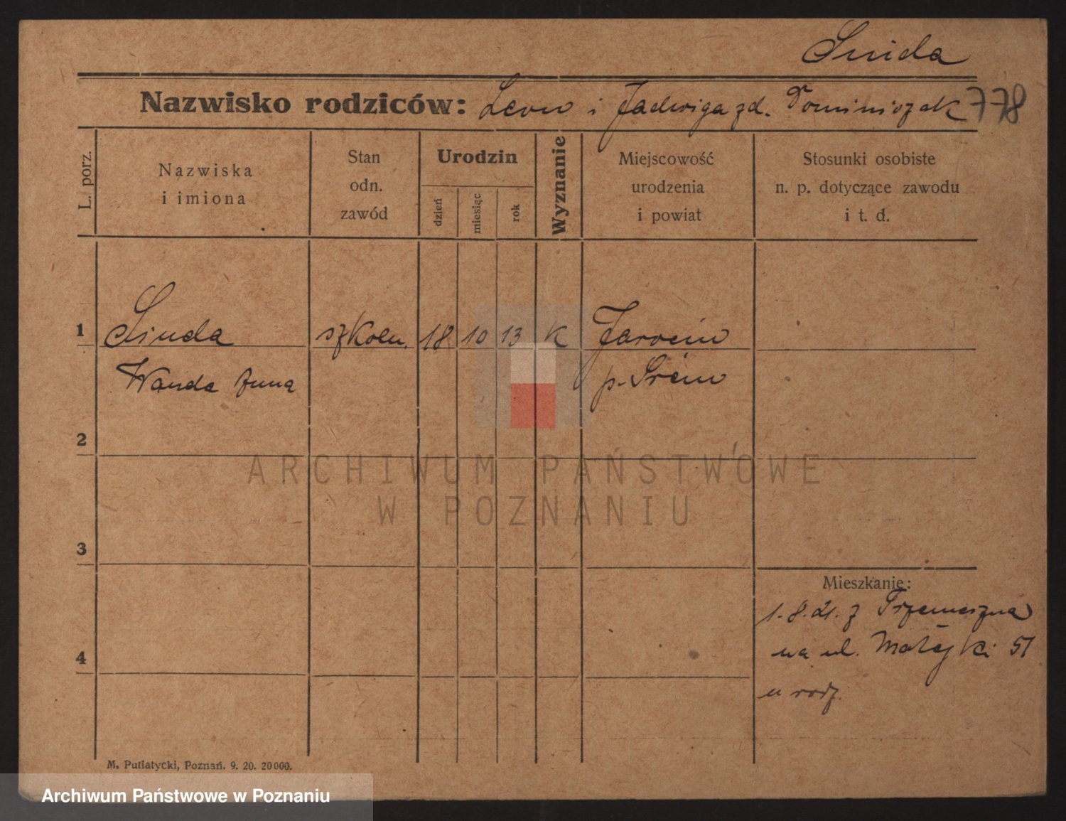 Podgląd karty osobowej dostępny jest po kliknięciu na nazwisko lub ikonkę karty. Można dokonywać powiększenia (ikony na górze) lub przechodzić między kolejnymi skanami (strzałki po bokach).