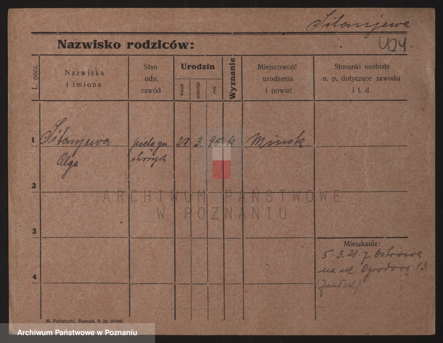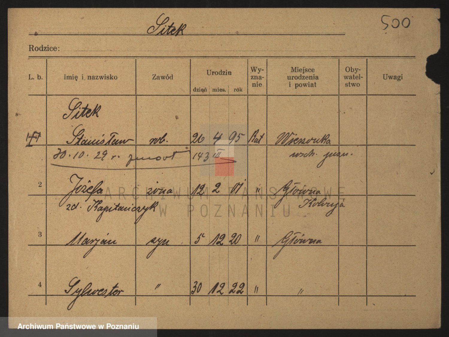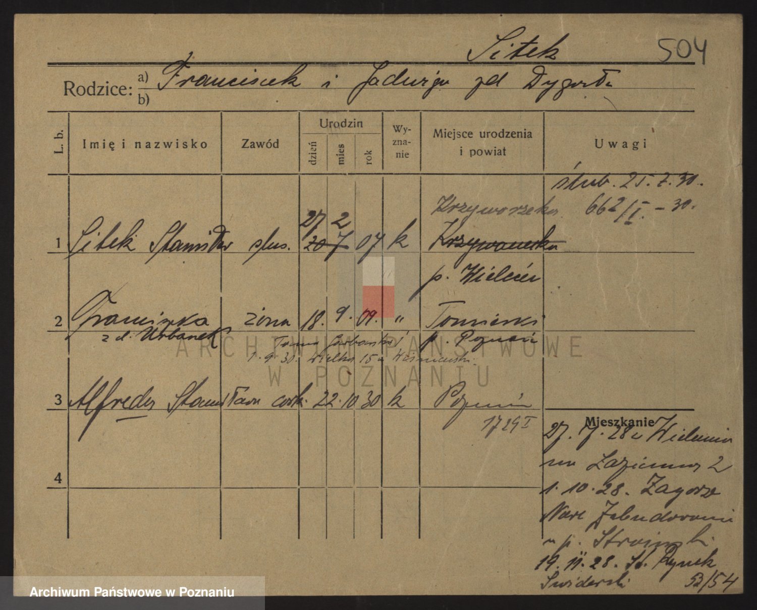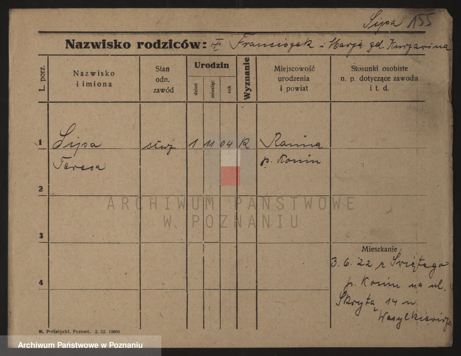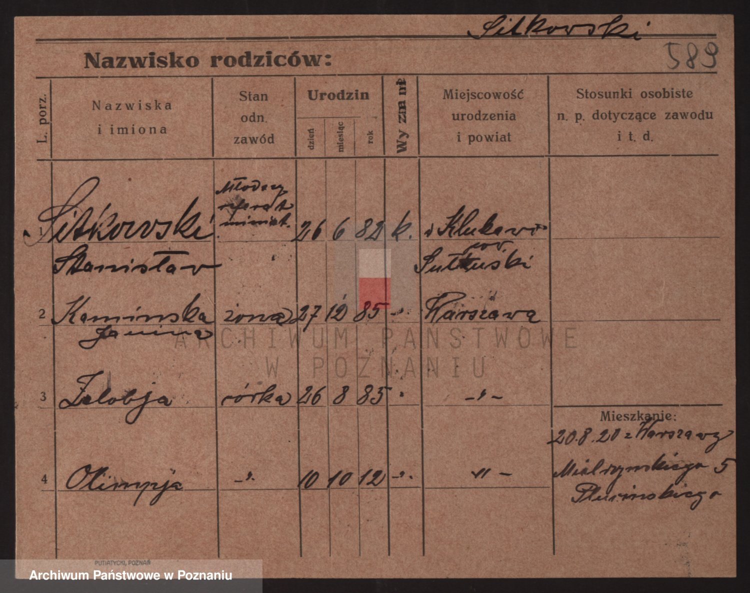 Podgląd karty osobowej dostępny jest po kliknięciu na nazwisko lub ikonkę karty. Można dokonywać powiększenia (ikony na górze) lub przechodzić między kolejnymi skanami (strzałki po bokach).