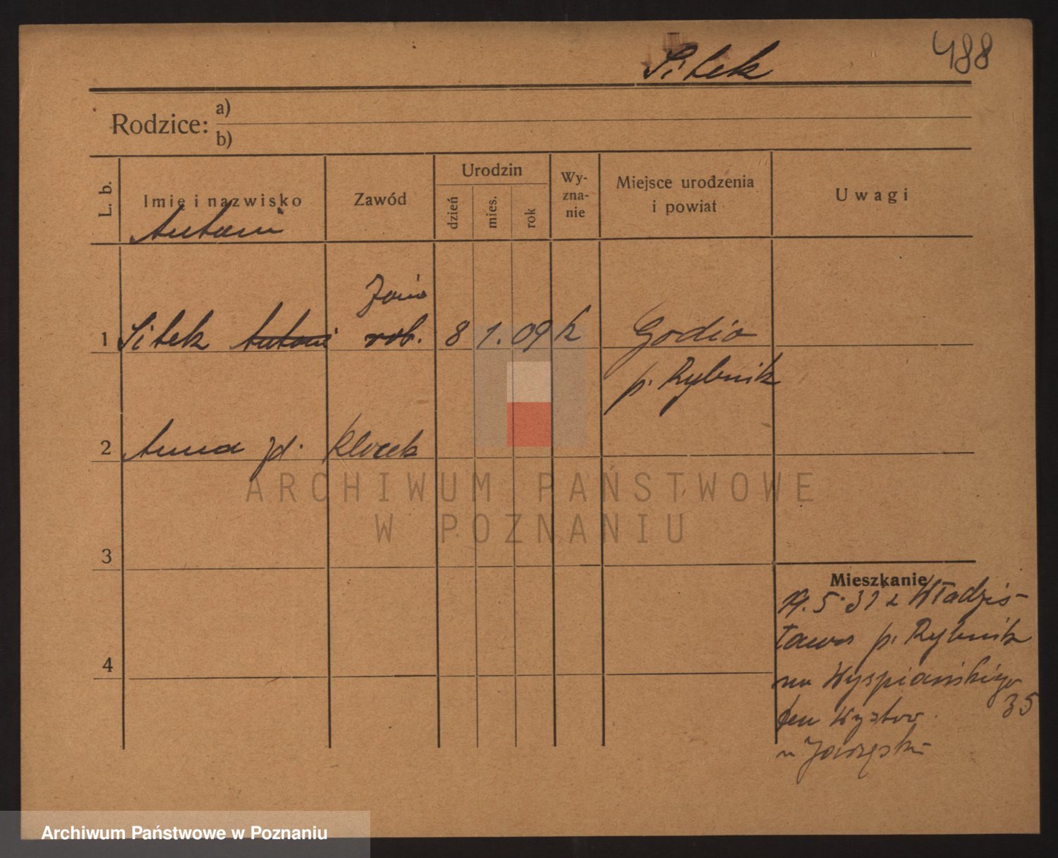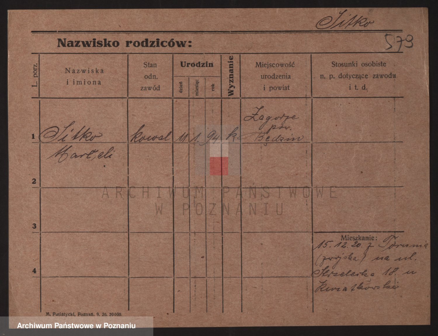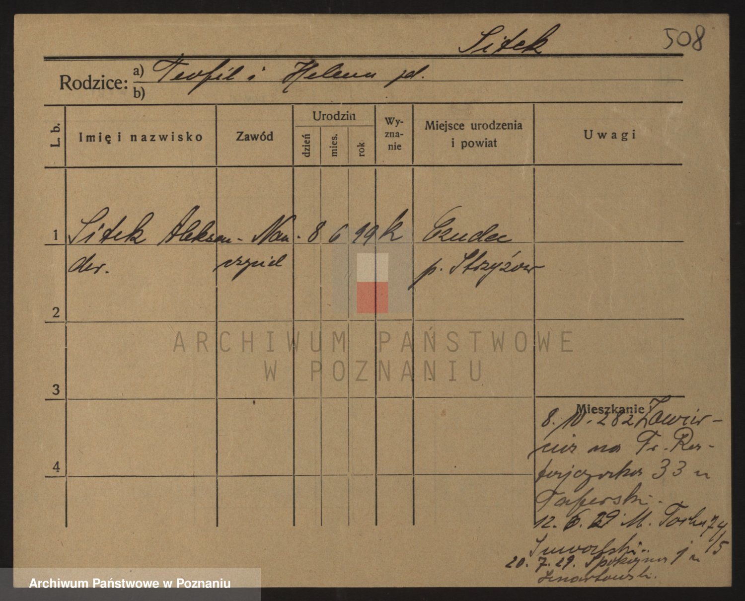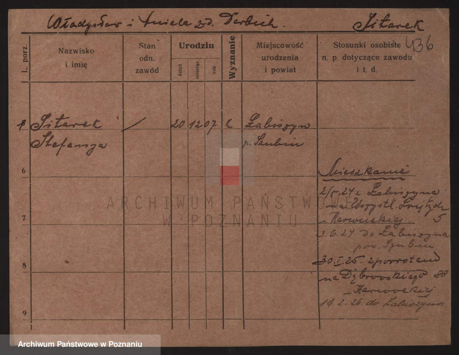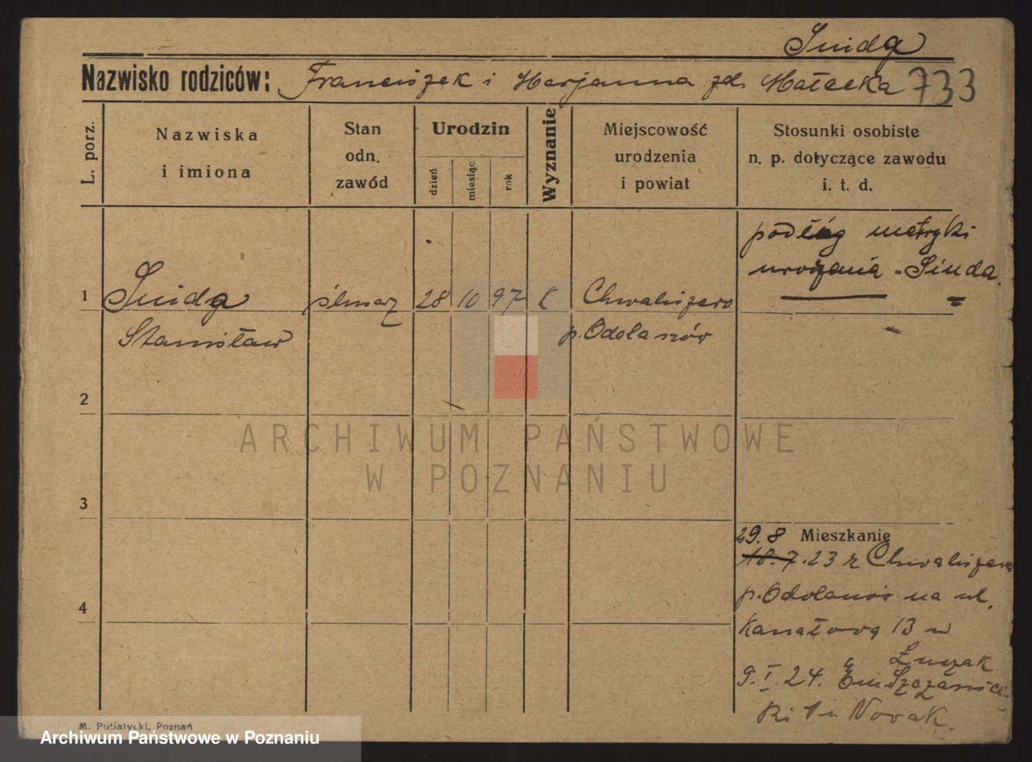 Podgląd karty osobowej dostępny jest po kliknięciu na nazwisko lub ikonkę karty. Można dokonywać powiększenia (ikony na górze) lub przechodzić między kolejnymi skanami (strzałki po bokach).