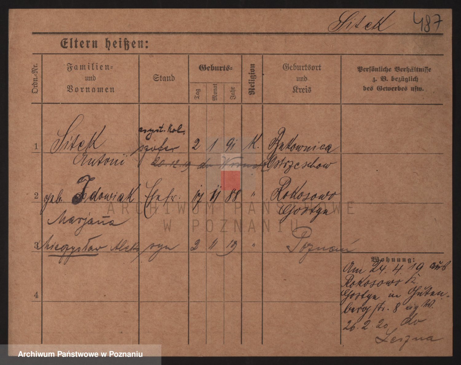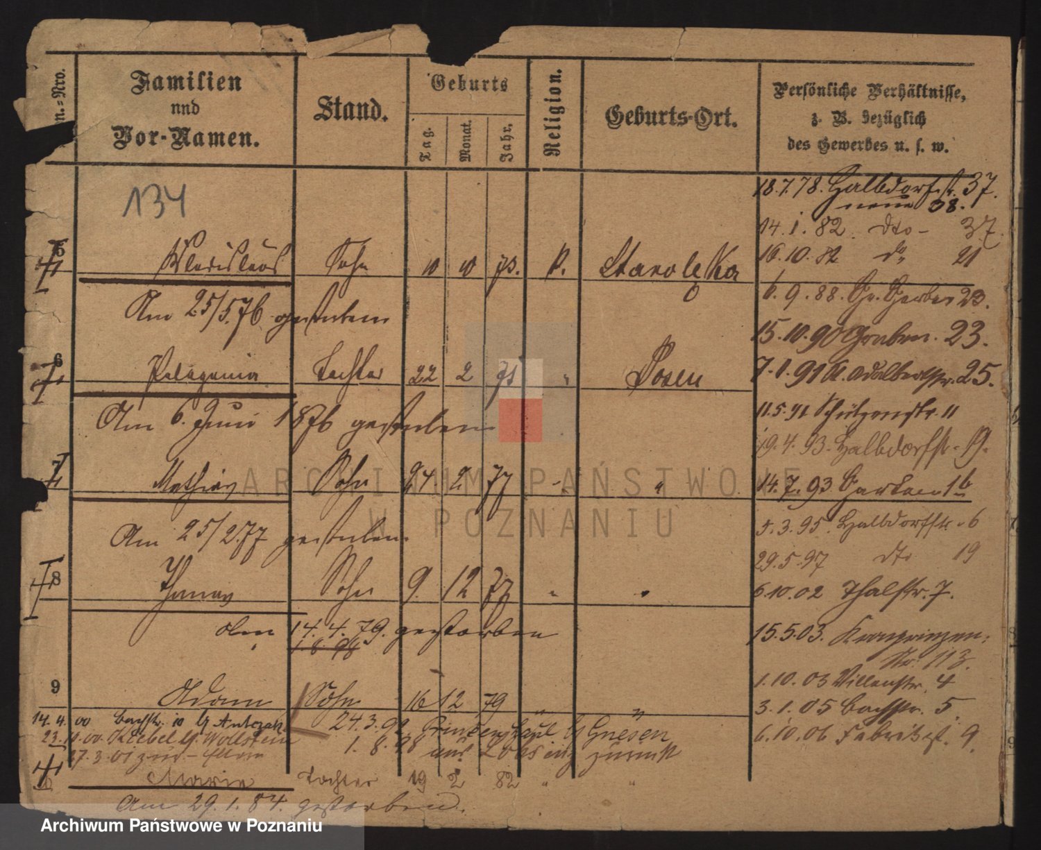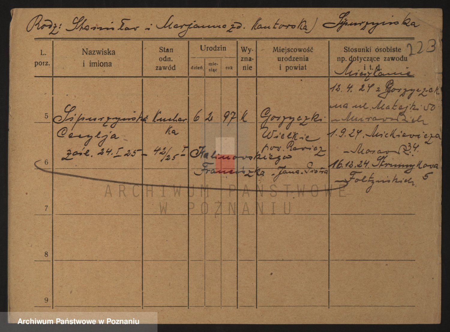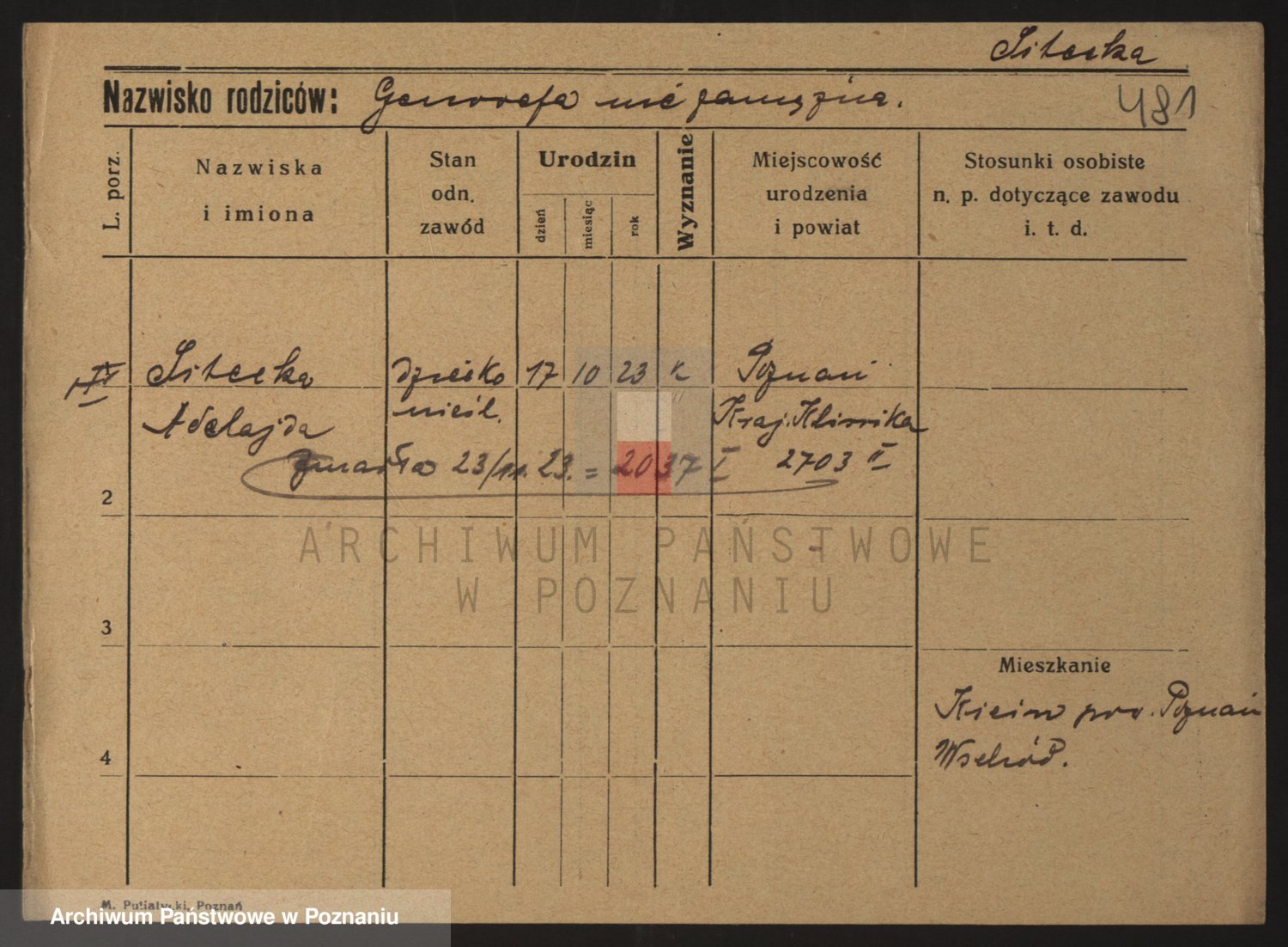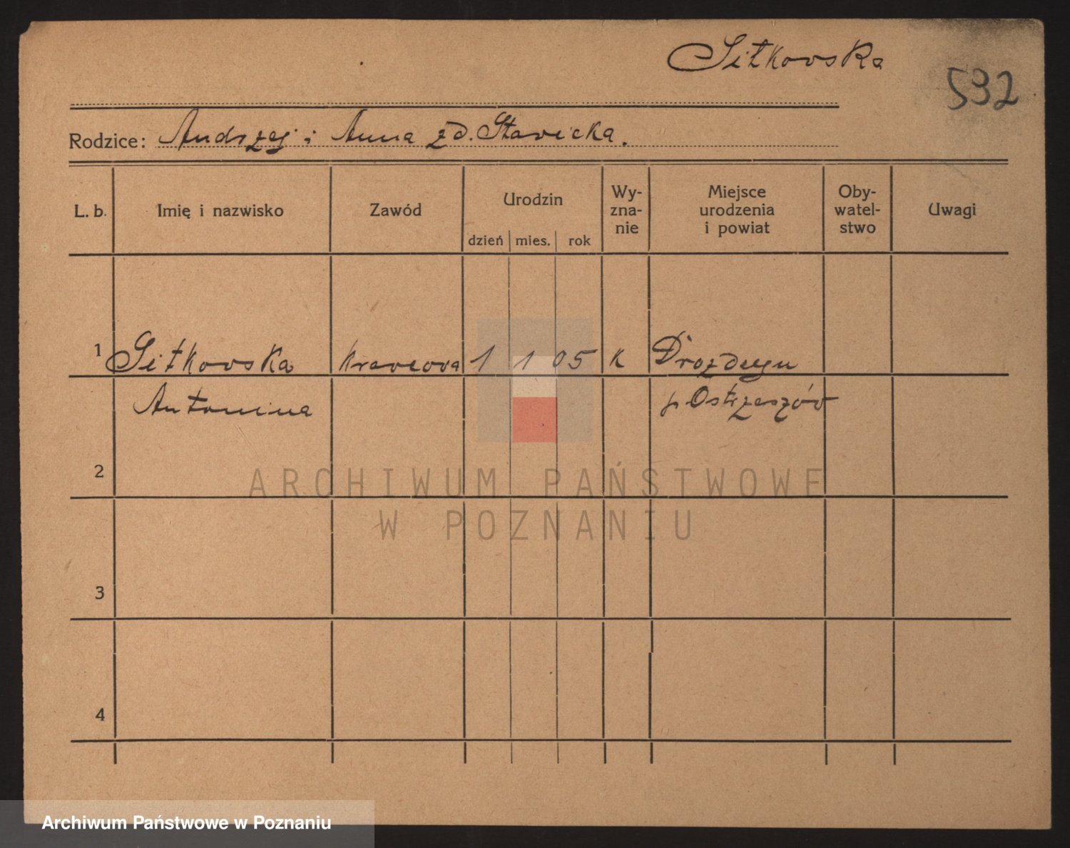 Podgląd karty osobowej dostępny jest po kliknięciu na nazwisko lub ikonkę karty. Można dokonywać powiększenia (ikony na górze) lub przechodzić między kolejnymi skanami (strzałki po bokach).