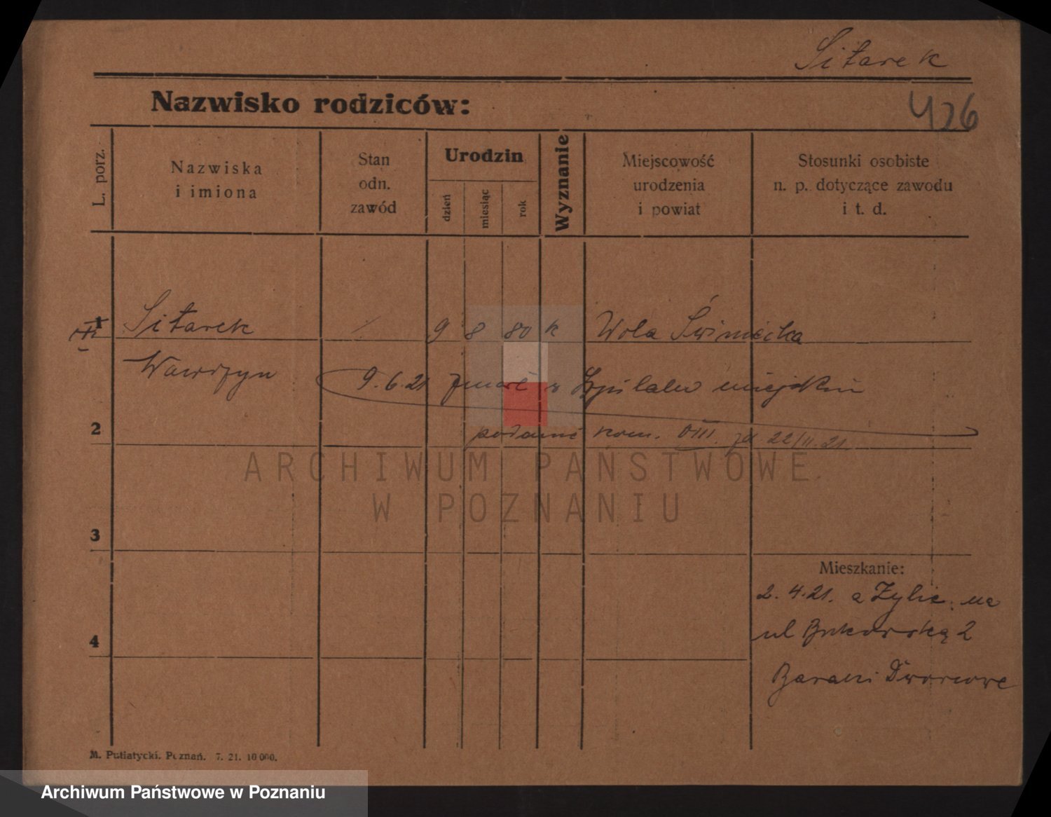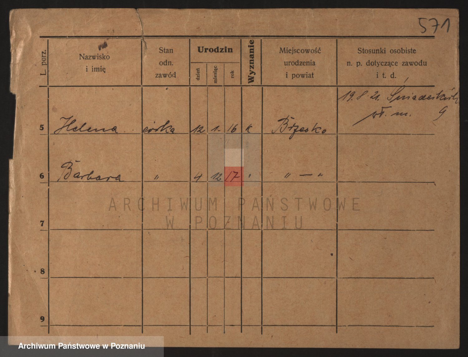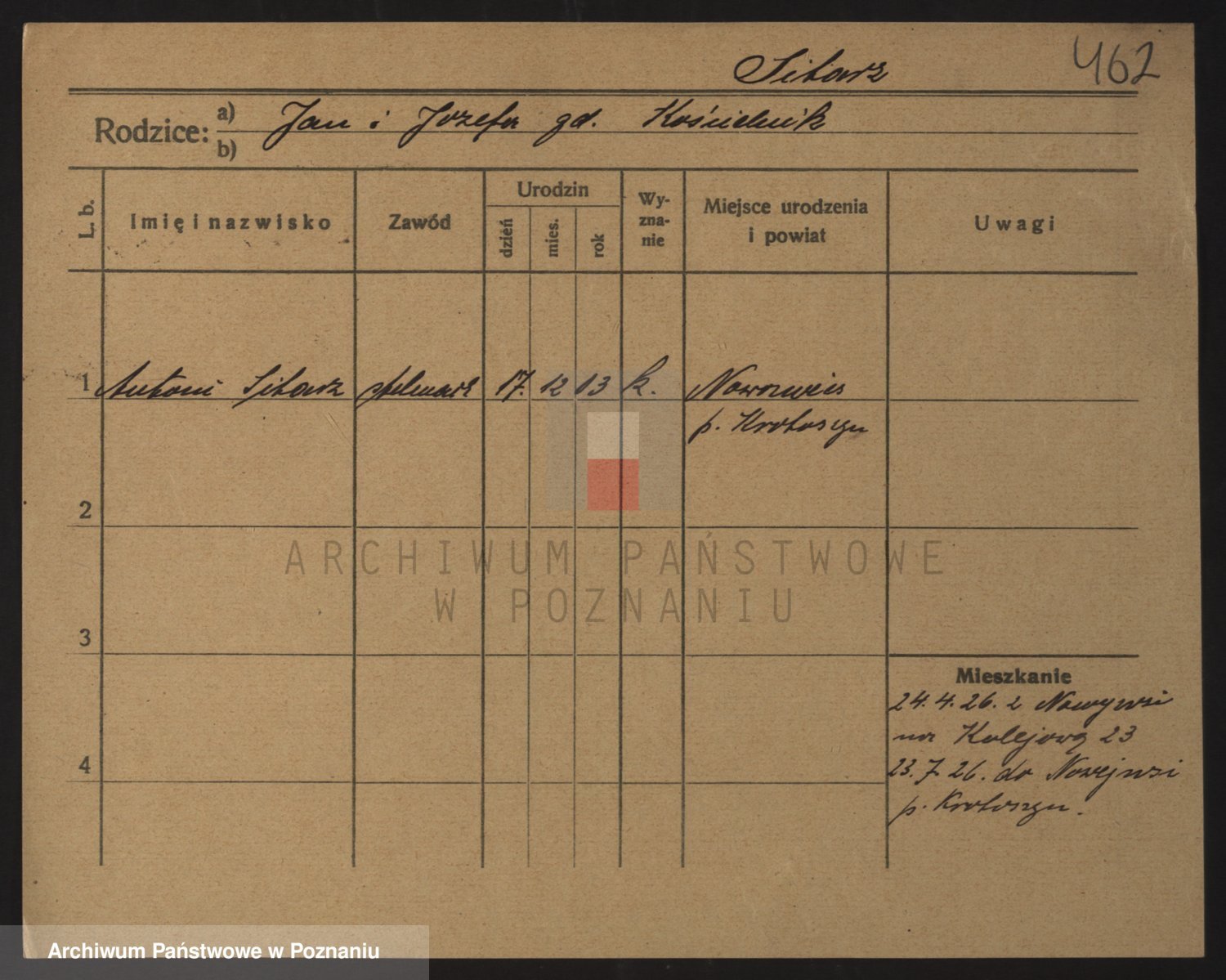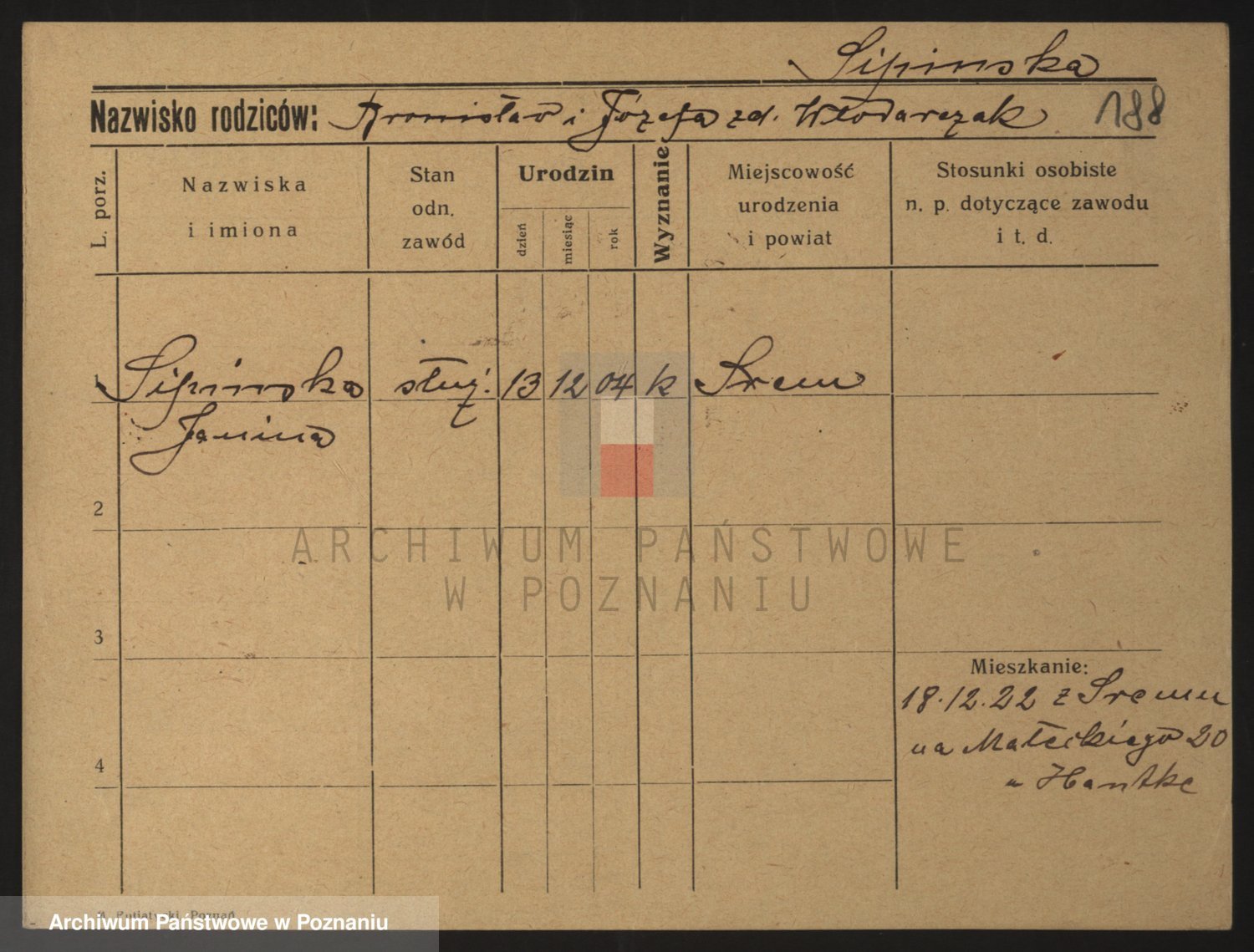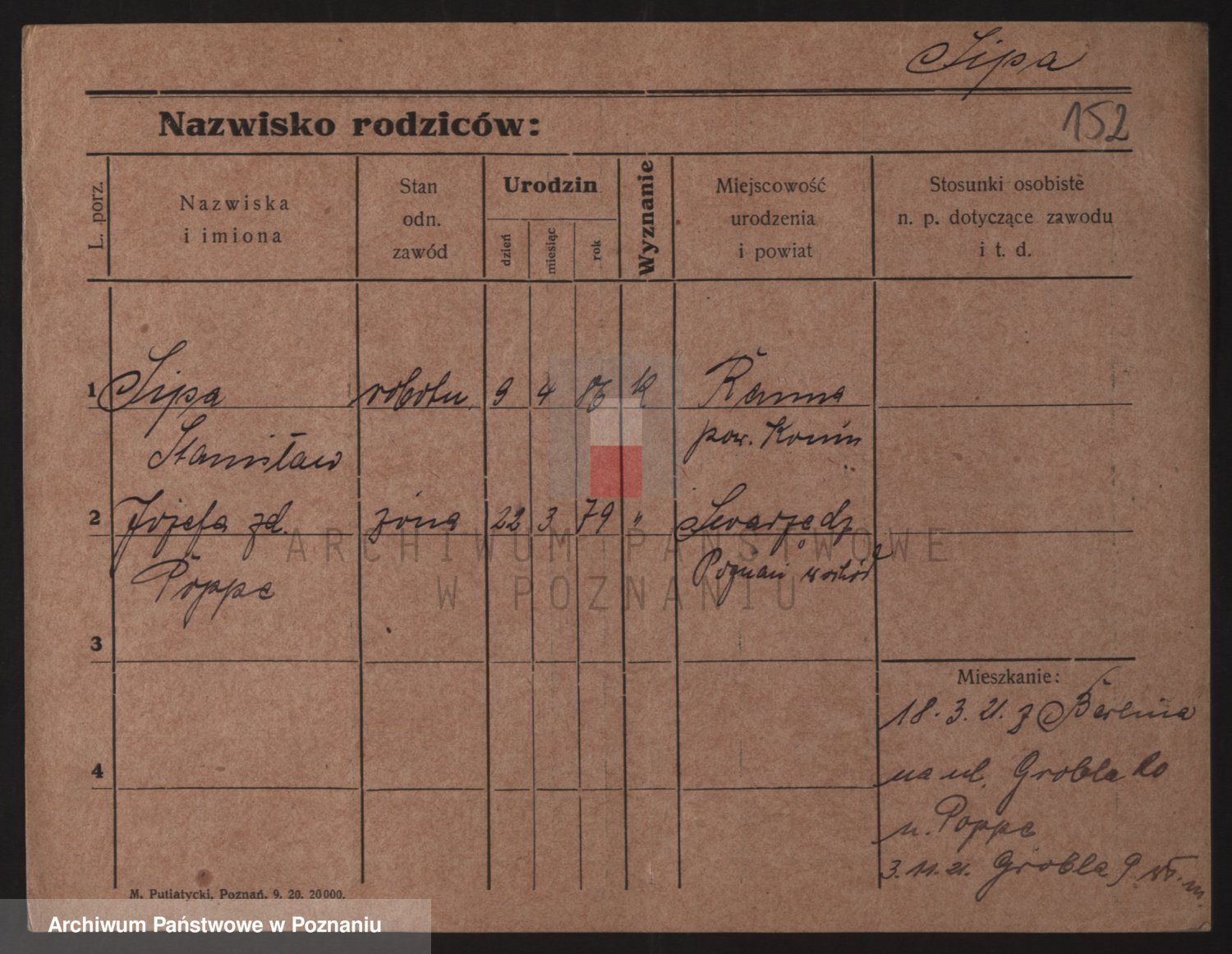 Podgląd karty osobowej dostępny jest po kliknięciu na nazwisko lub ikonkę karty. Można dokonywać powiększenia (ikony na górze) lub przechodzić między kolejnymi skanami (strzałki po bokach).