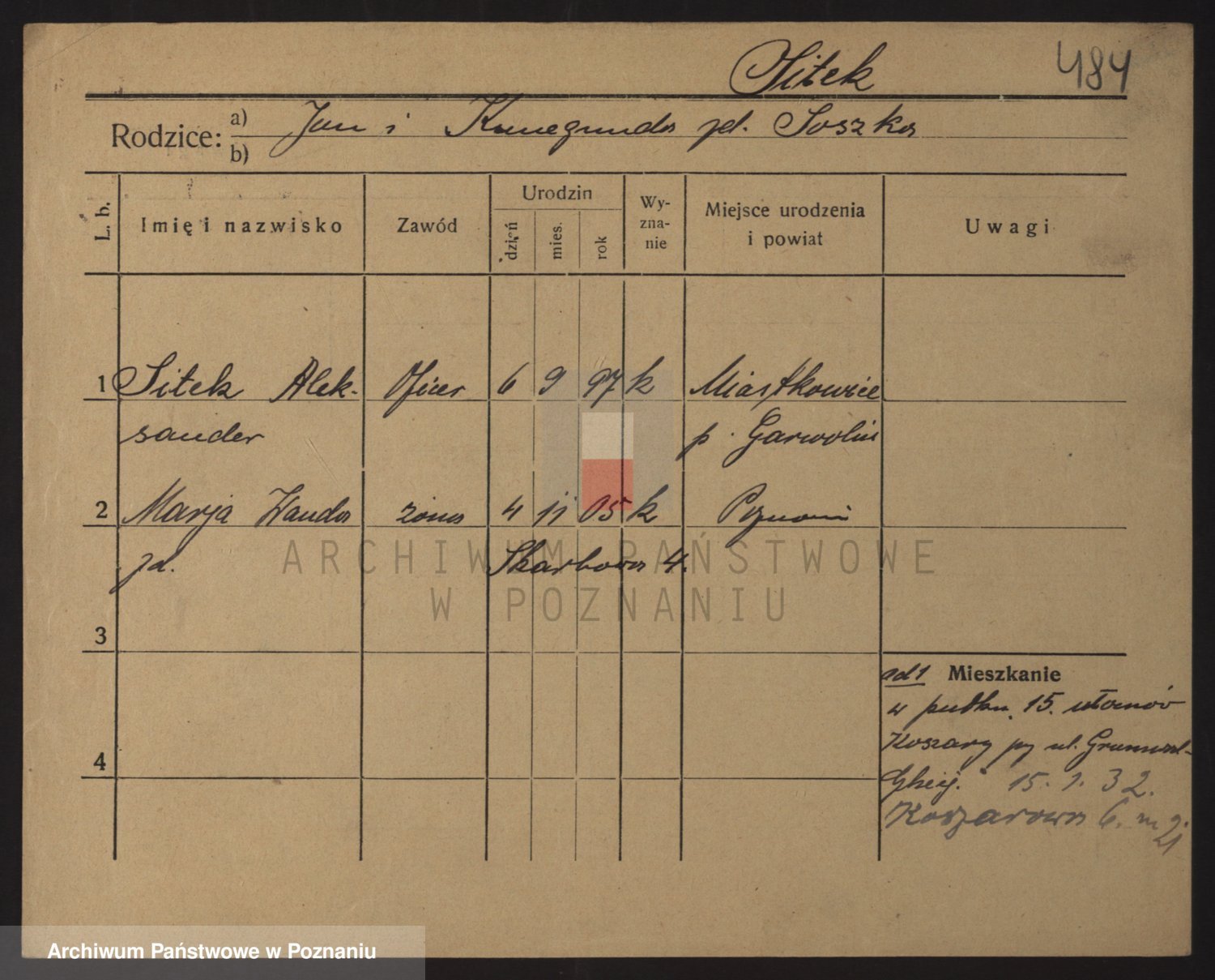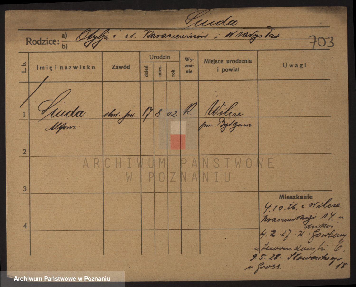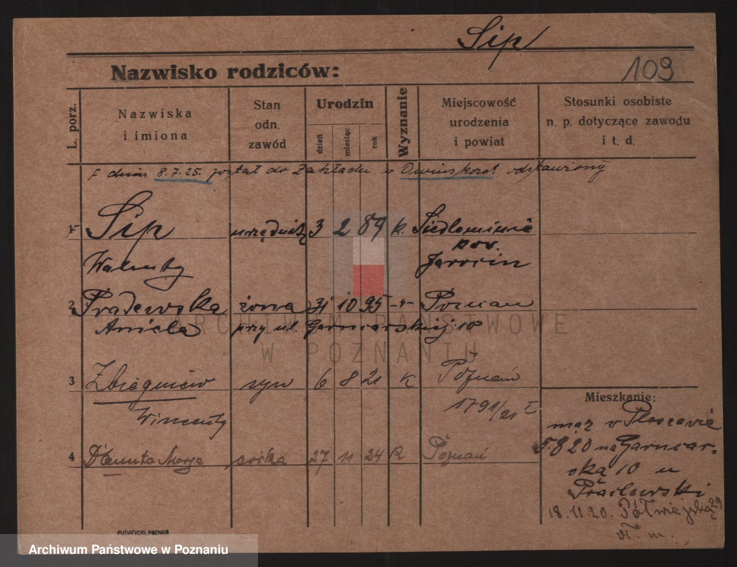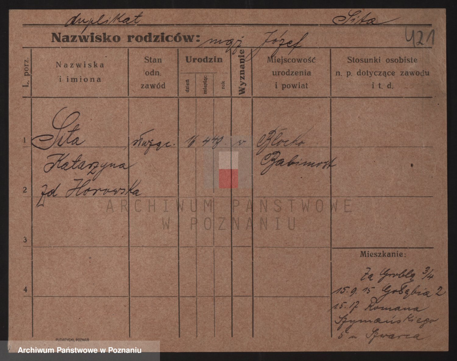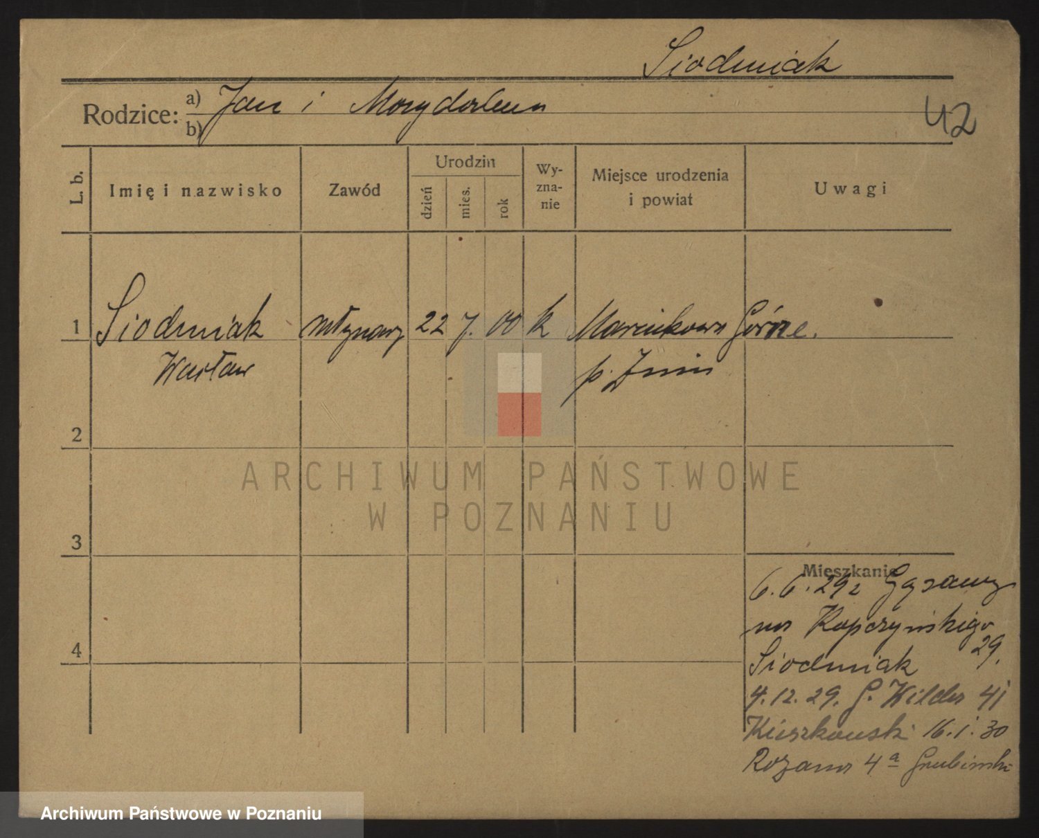 Podgląd karty osobowej dostępny jest po kliknięciu na nazwisko lub ikonkę karty. Można dokonywać powiększenia (ikony na górze) lub przechodzić między kolejnymi skanami (strzałki po bokach).