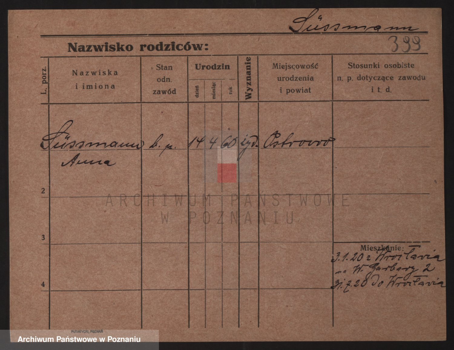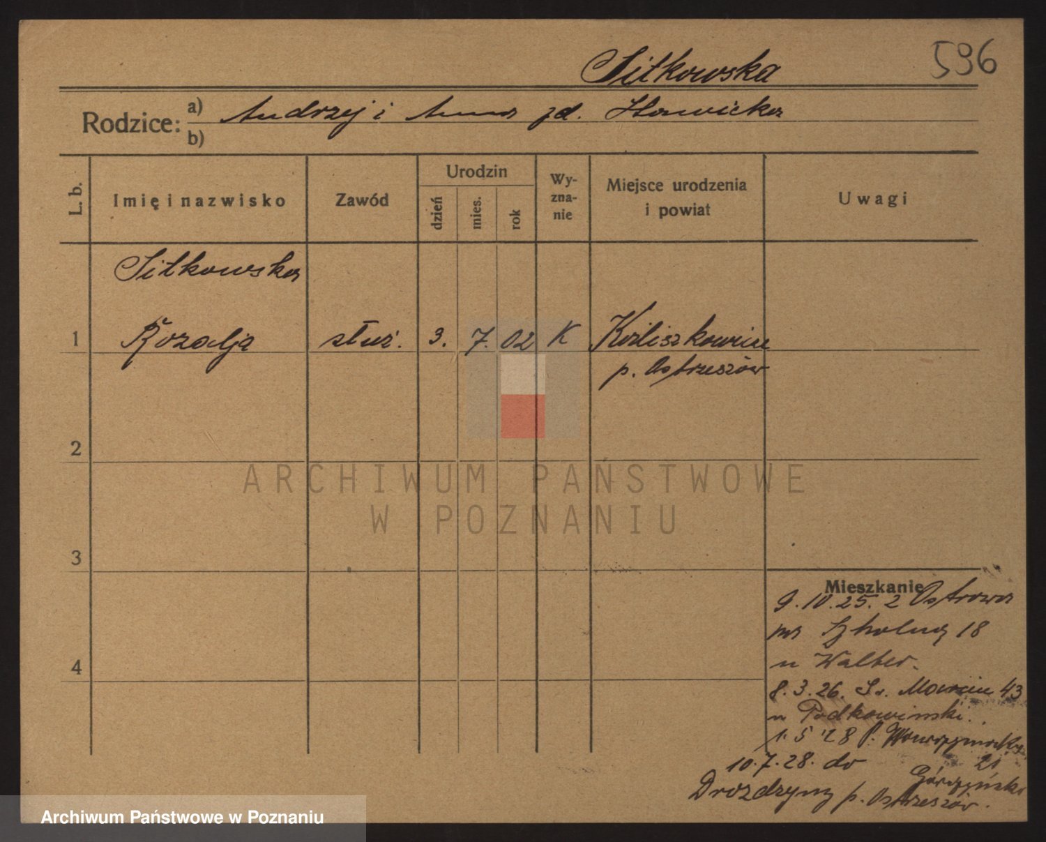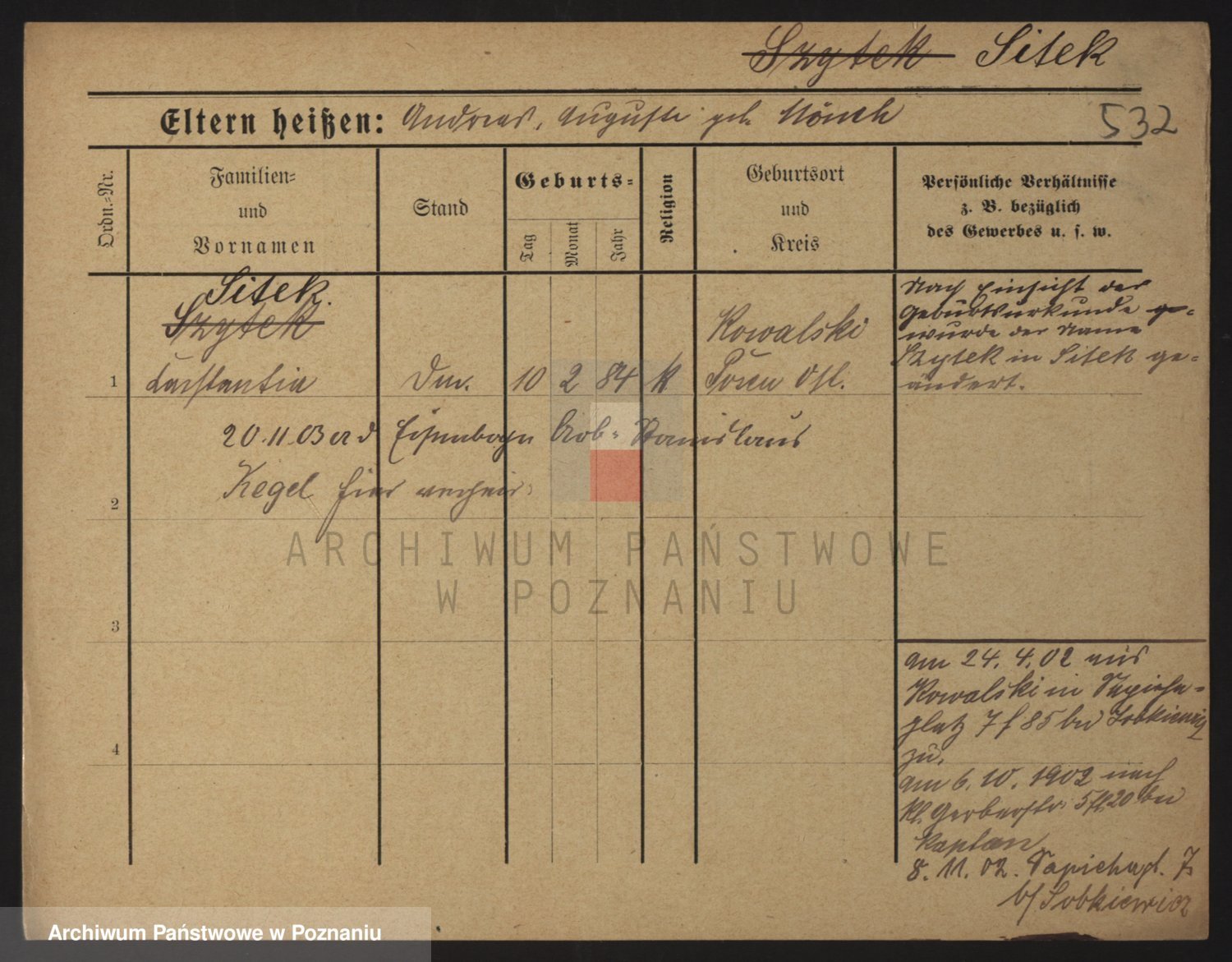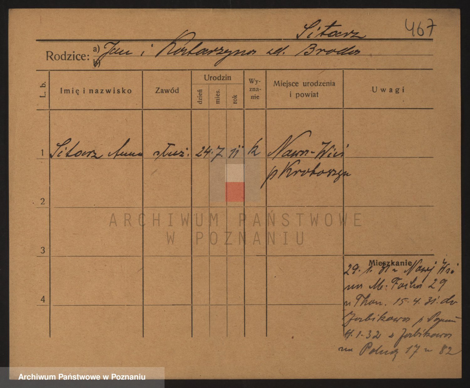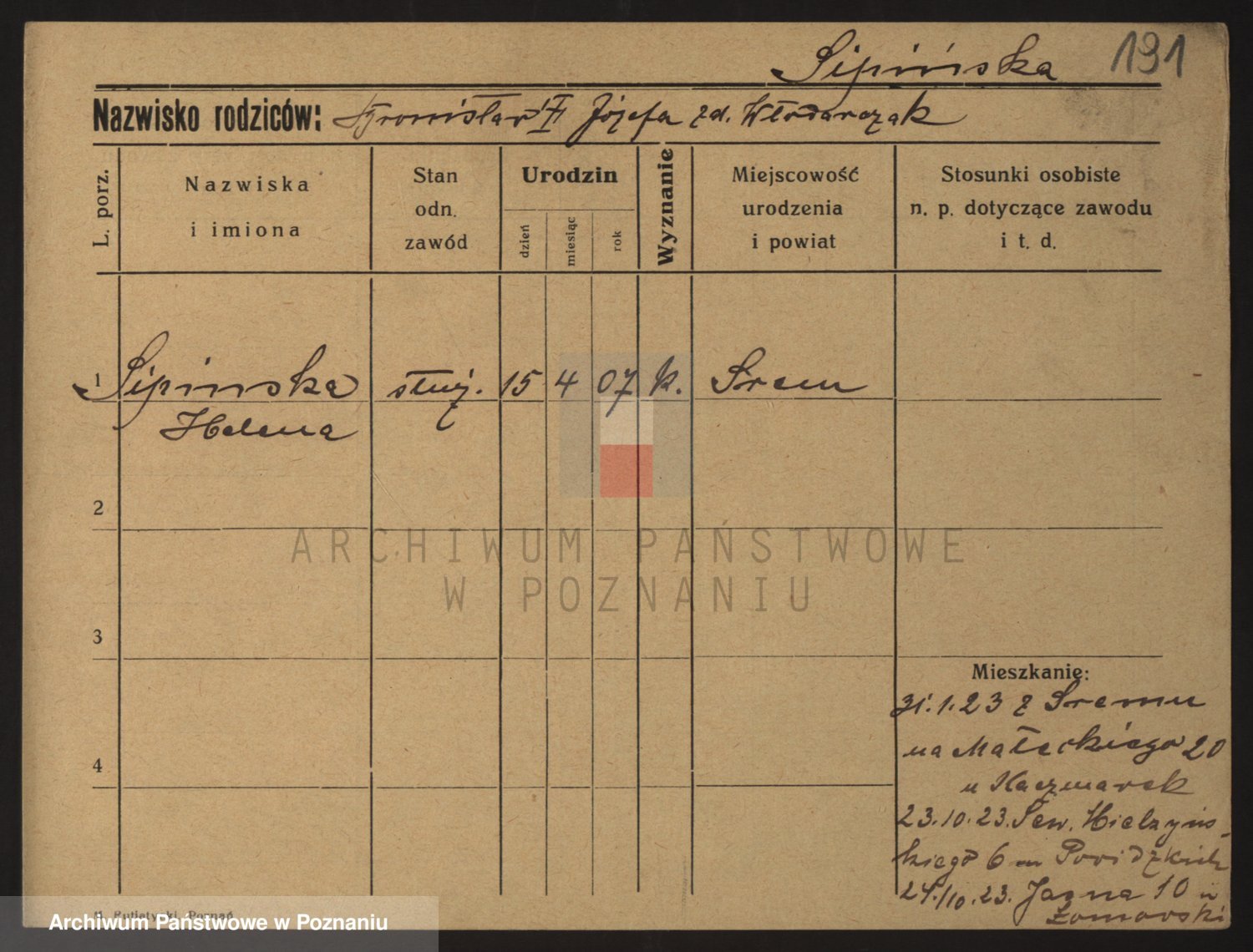 Podgląd karty osobowej dostępny jest po kliknięciu na nazwisko lub ikonkę karty. Można dokonywać powiększenia (ikony na górze) lub przechodzić między kolejnymi skanami (strzałki po bokach).