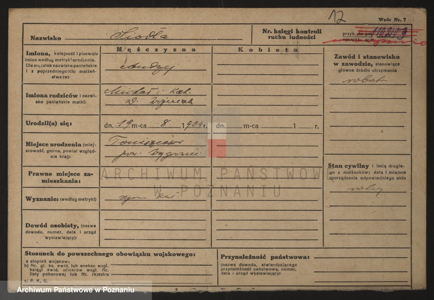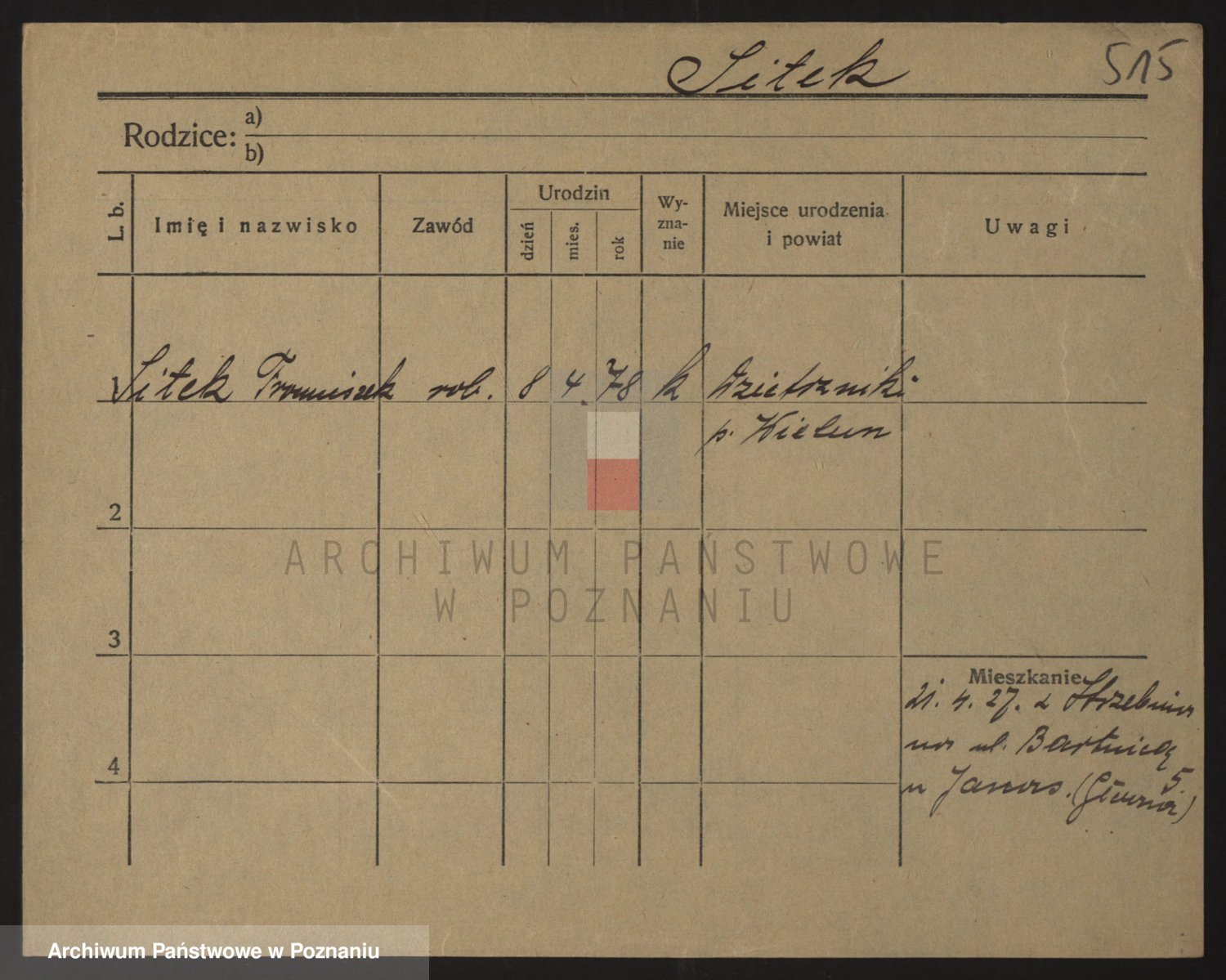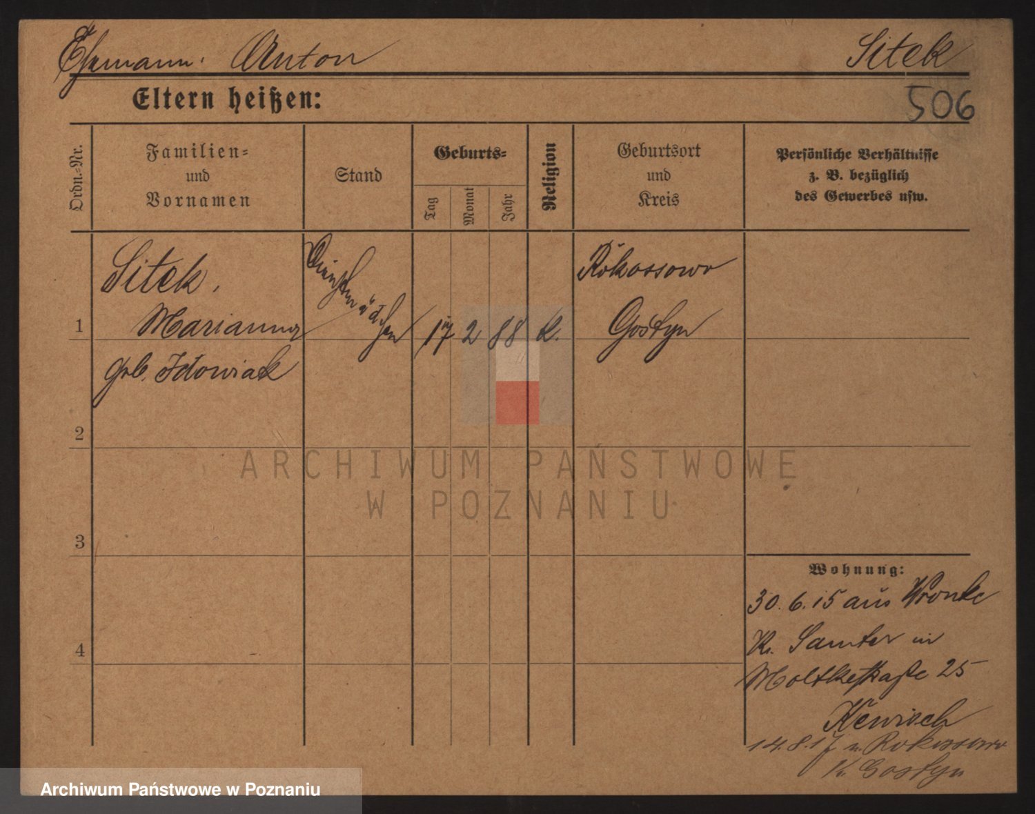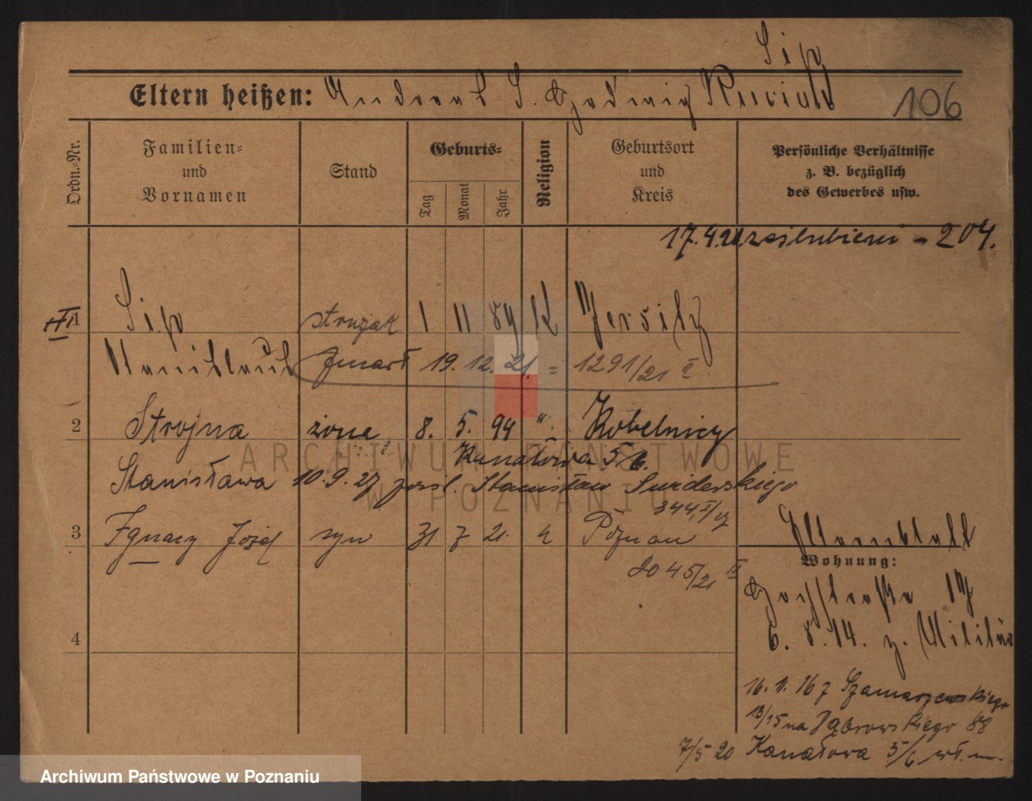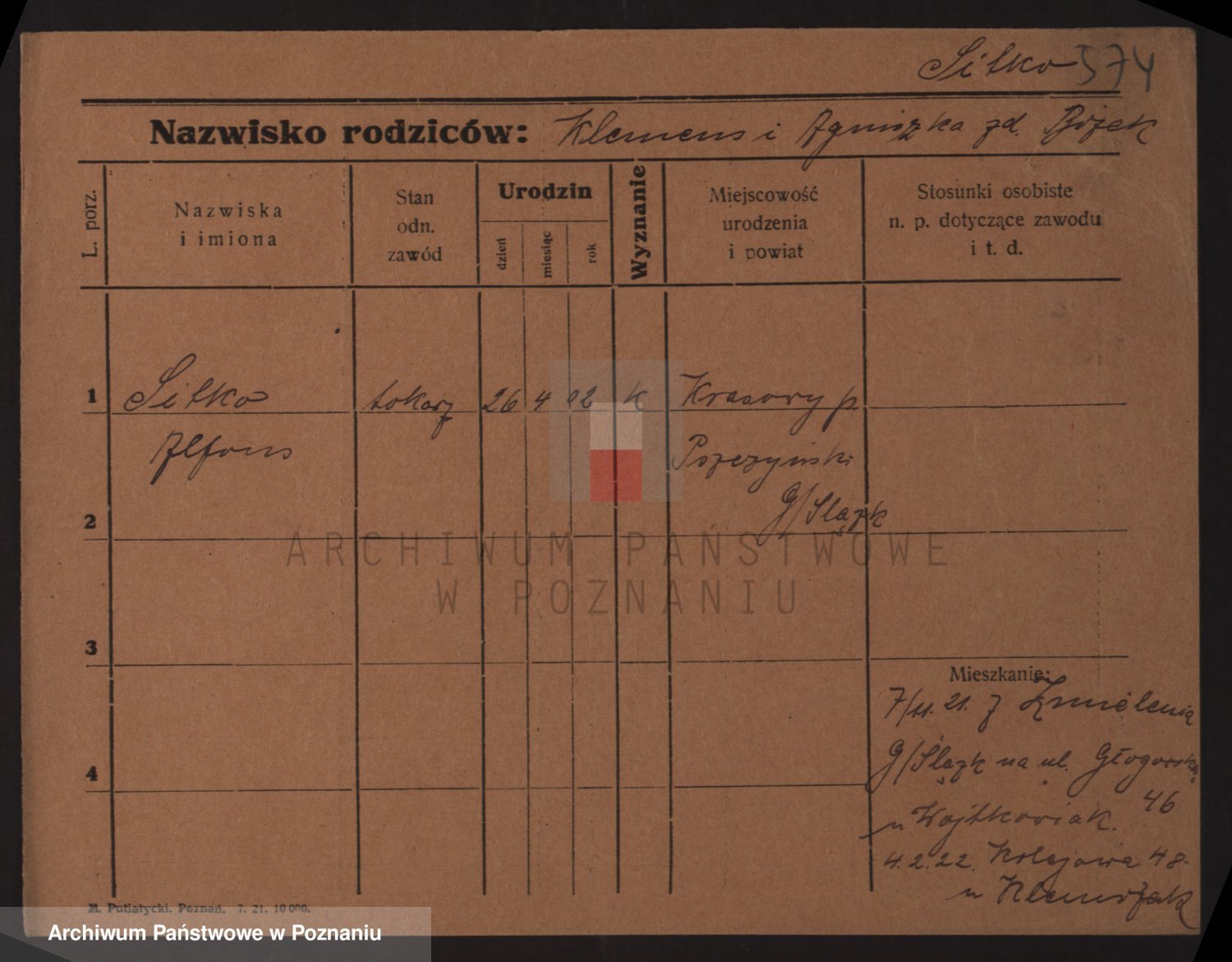 Podgląd karty osobowej dostępny jest po kliknięciu na nazwisko lub ikonkę karty. Można dokonywać powiększenia (ikony na górze) lub przechodzić między kolejnymi skanami (strzałki po bokach).