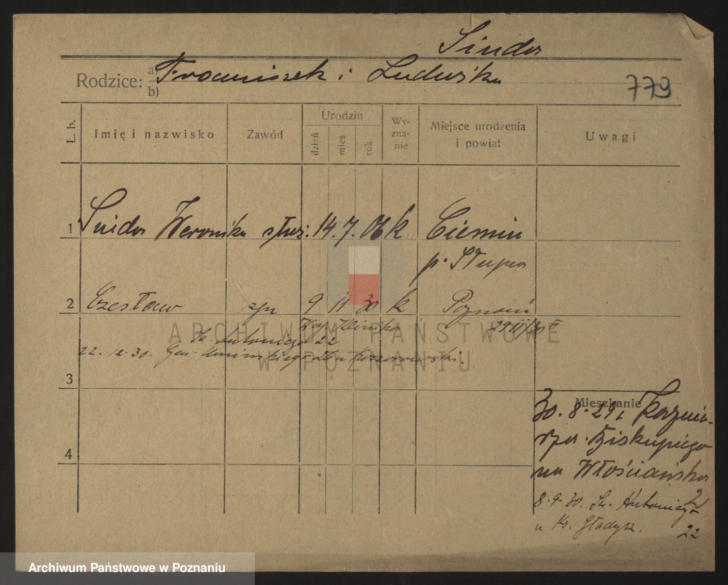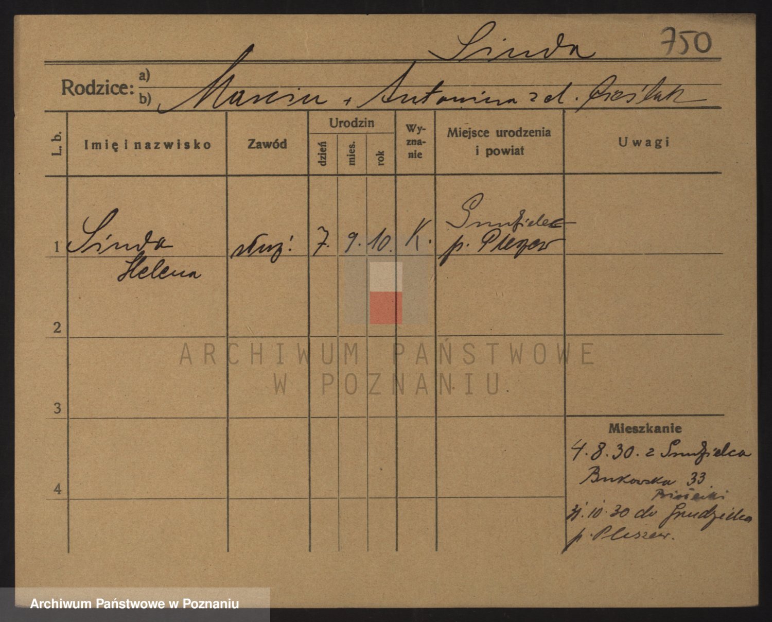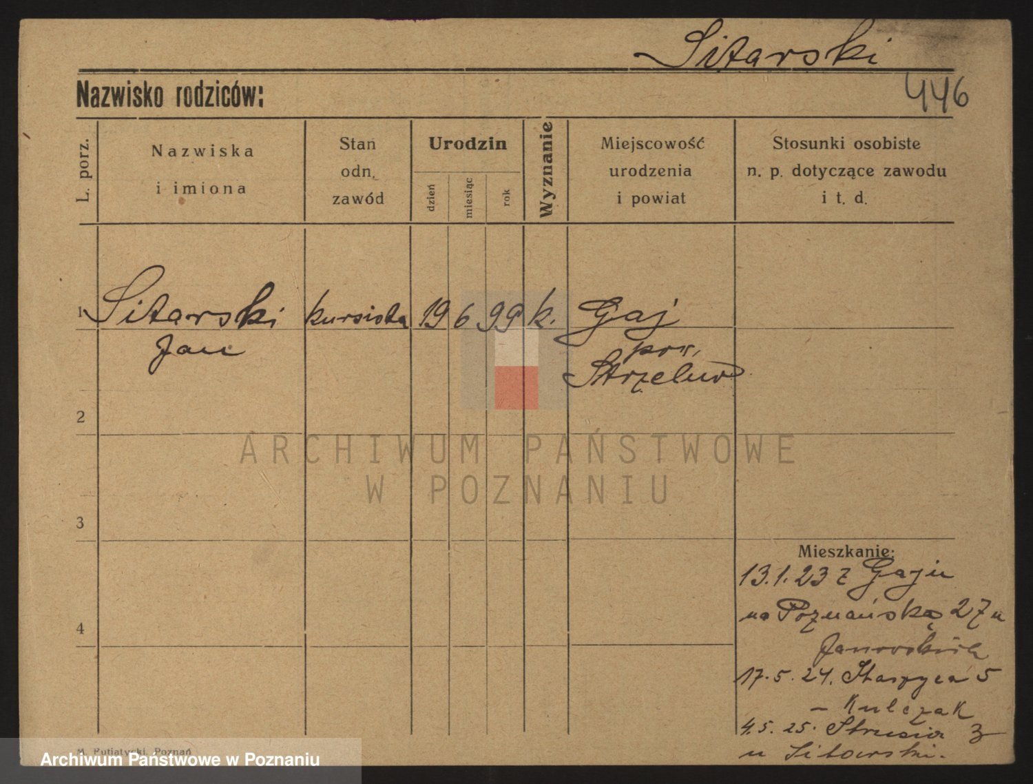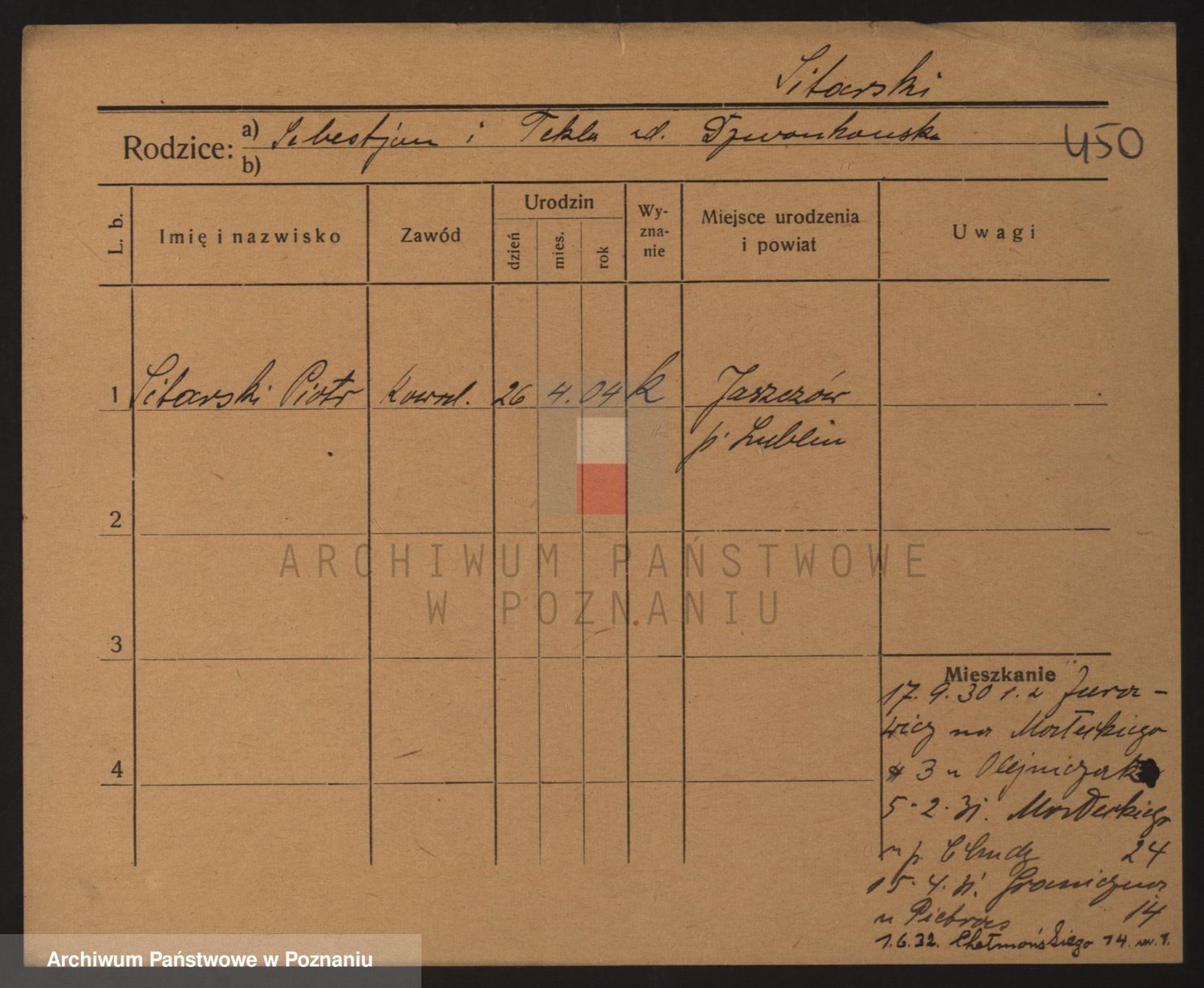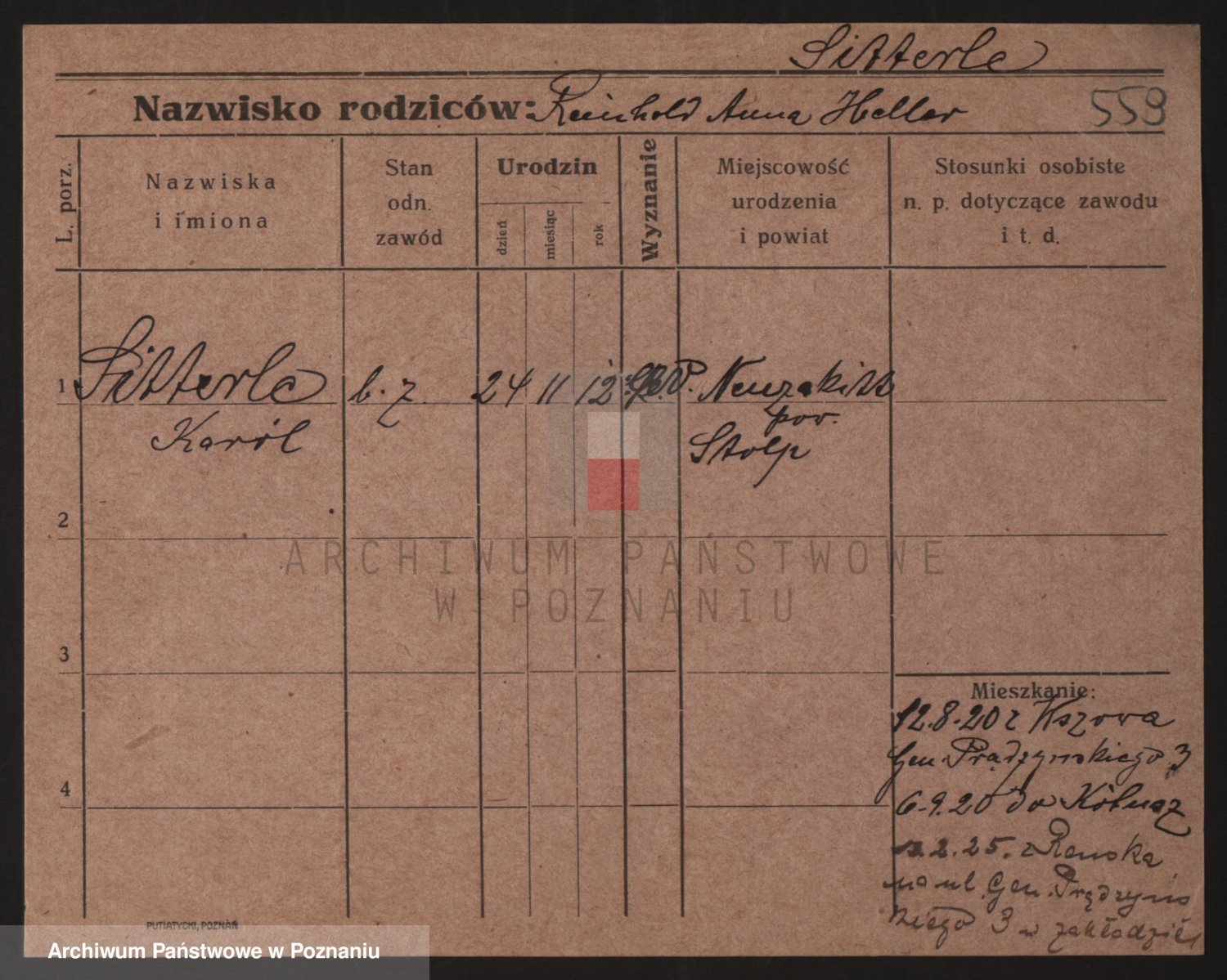 Podgląd karty osobowej dostępny jest po kliknięciu na nazwisko lub ikonkę karty. Można dokonywać powiększenia (ikony na górze) lub przechodzić między kolejnymi skanami (strzałki po bokach).