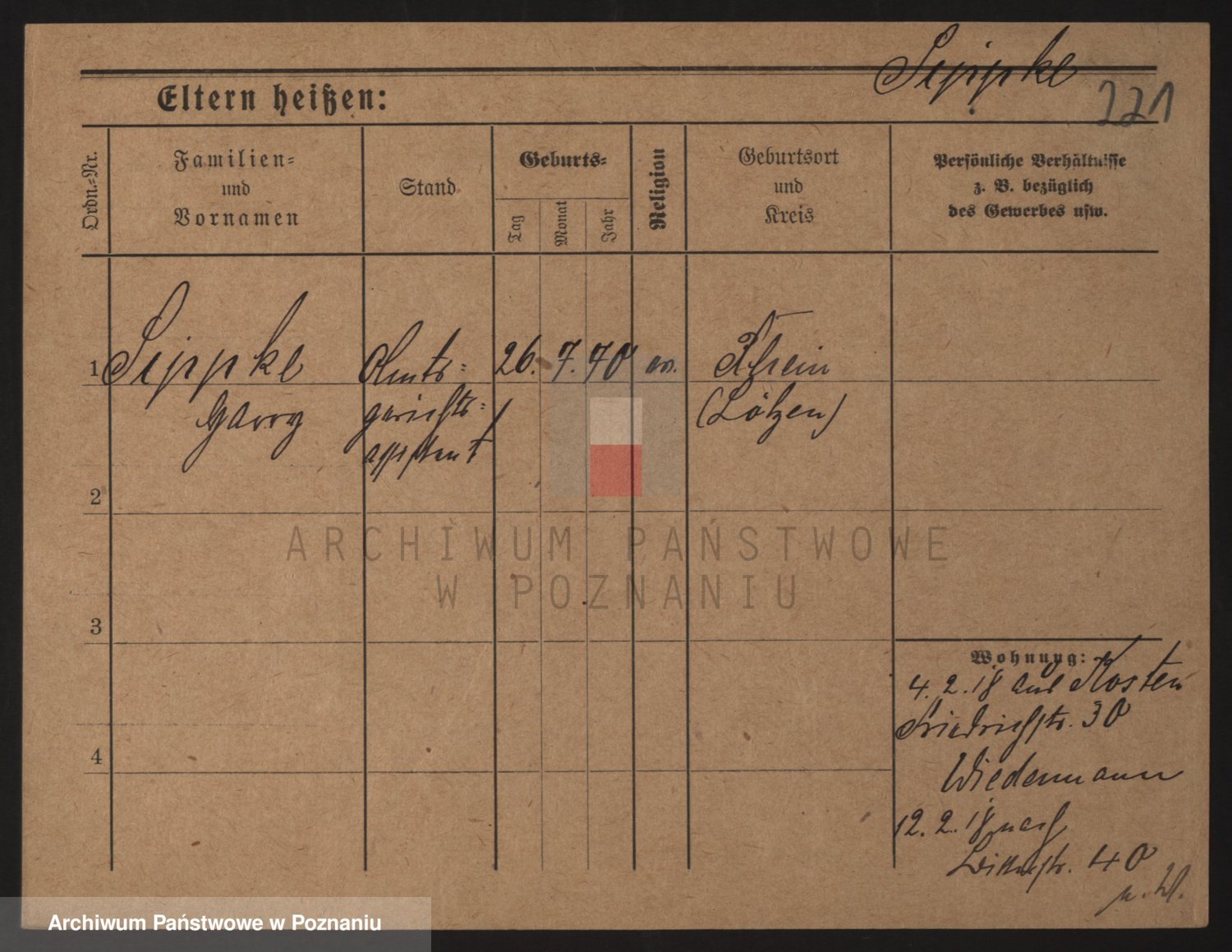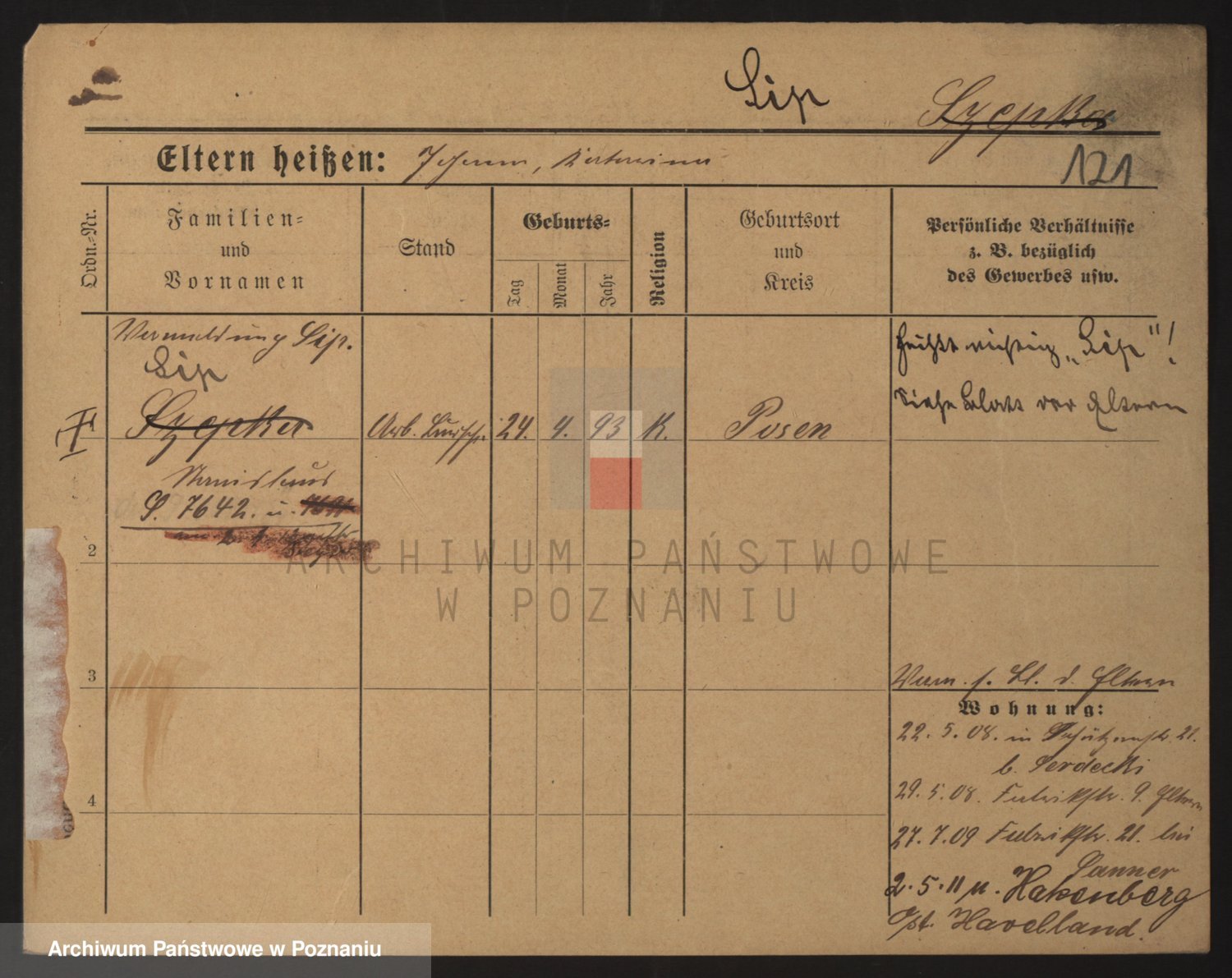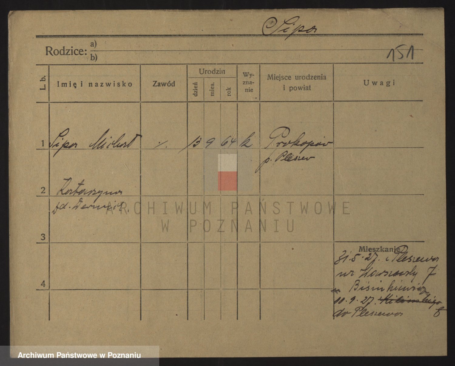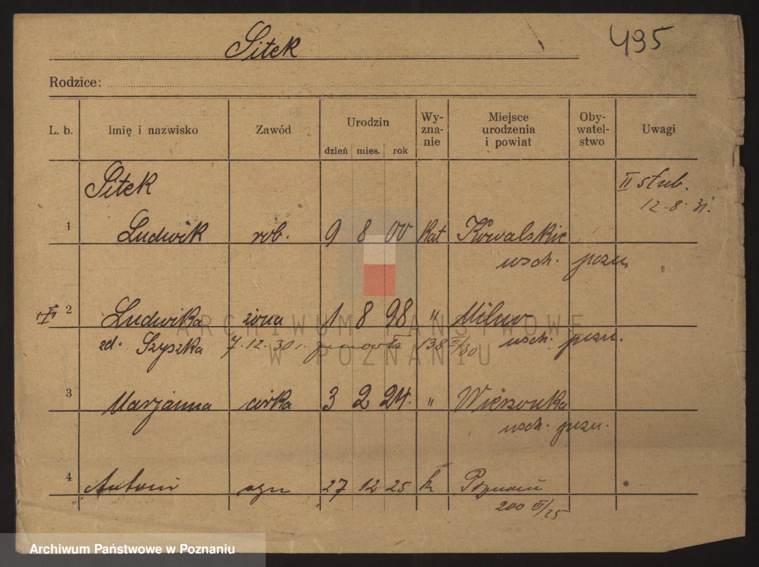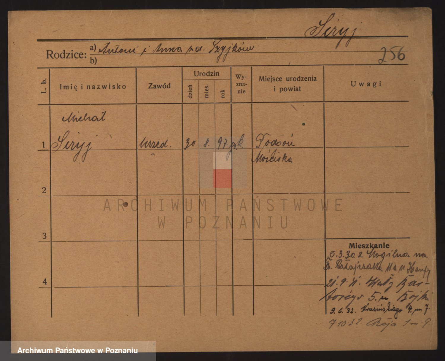 Podgląd karty osobowej dostępny jest po kliknięciu na nazwisko lub ikonkę karty. Można dokonywać powiększenia (ikony na górze) lub przechodzić między kolejnymi skanami (strzałki po bokach).