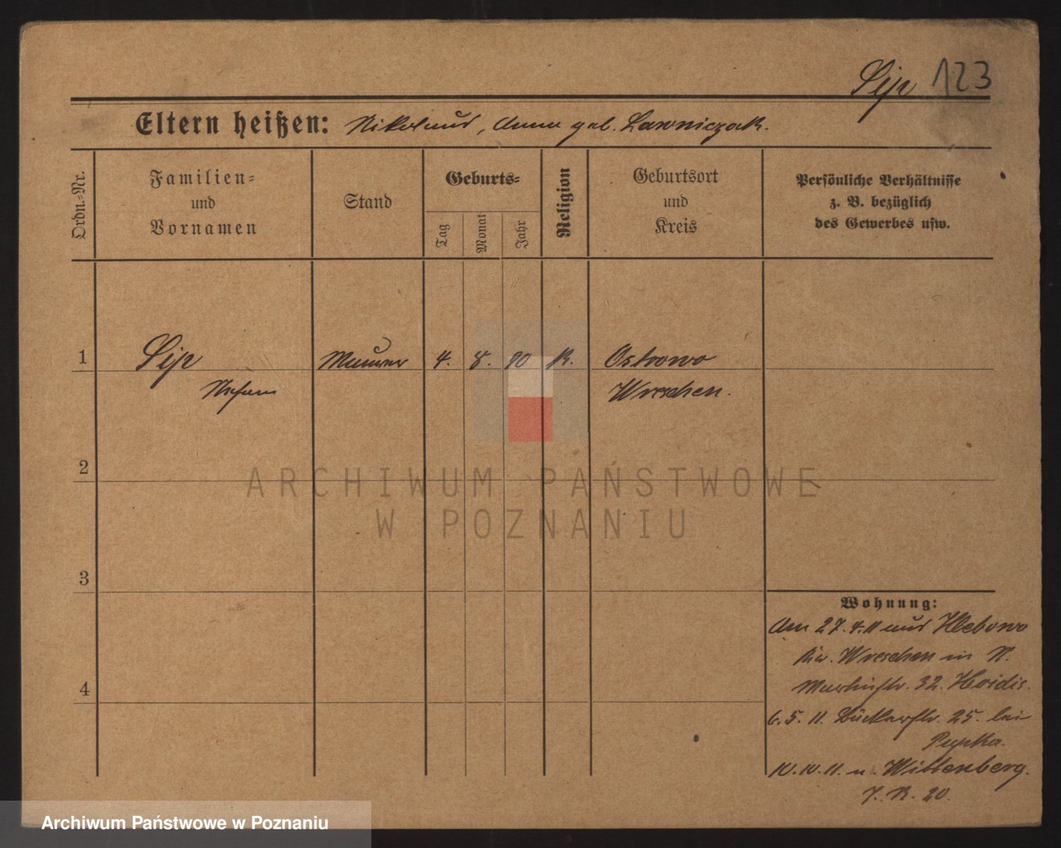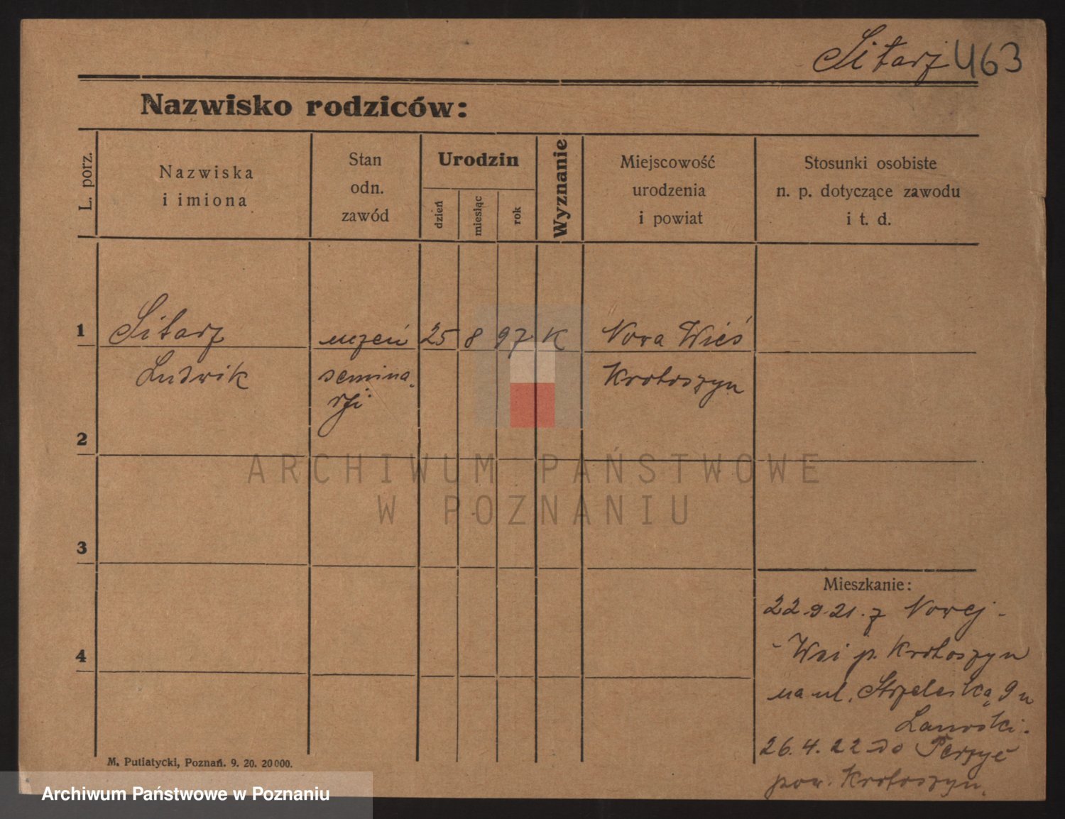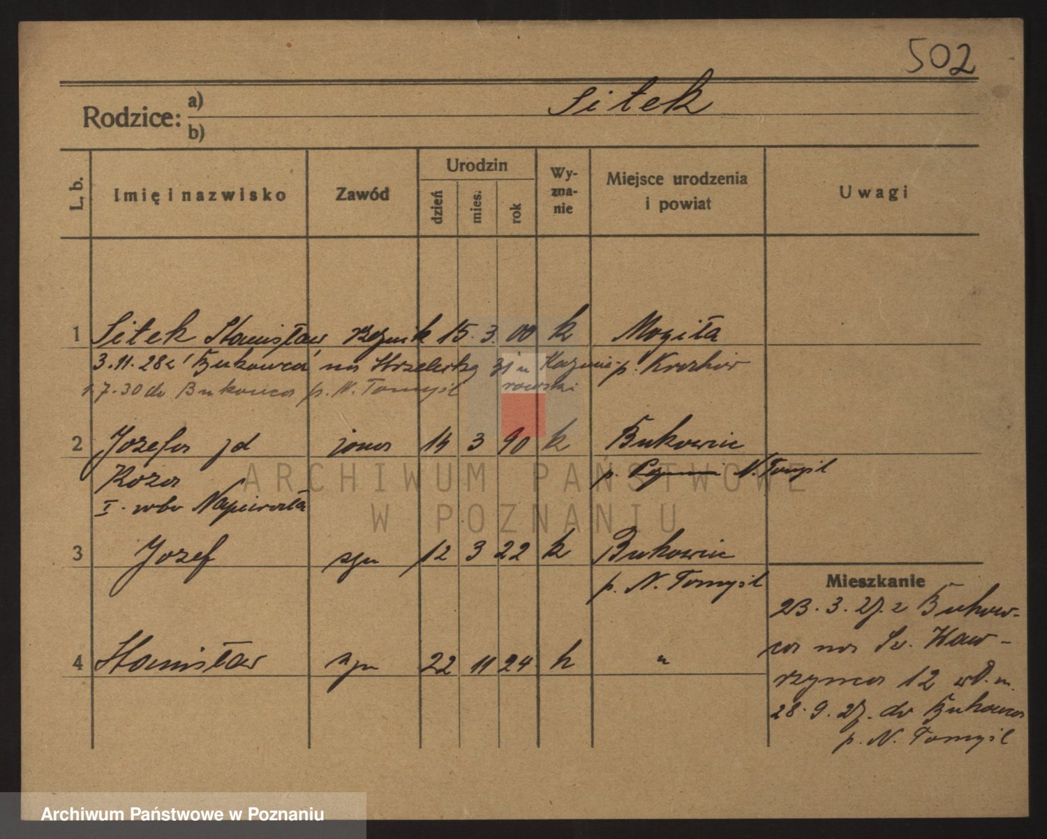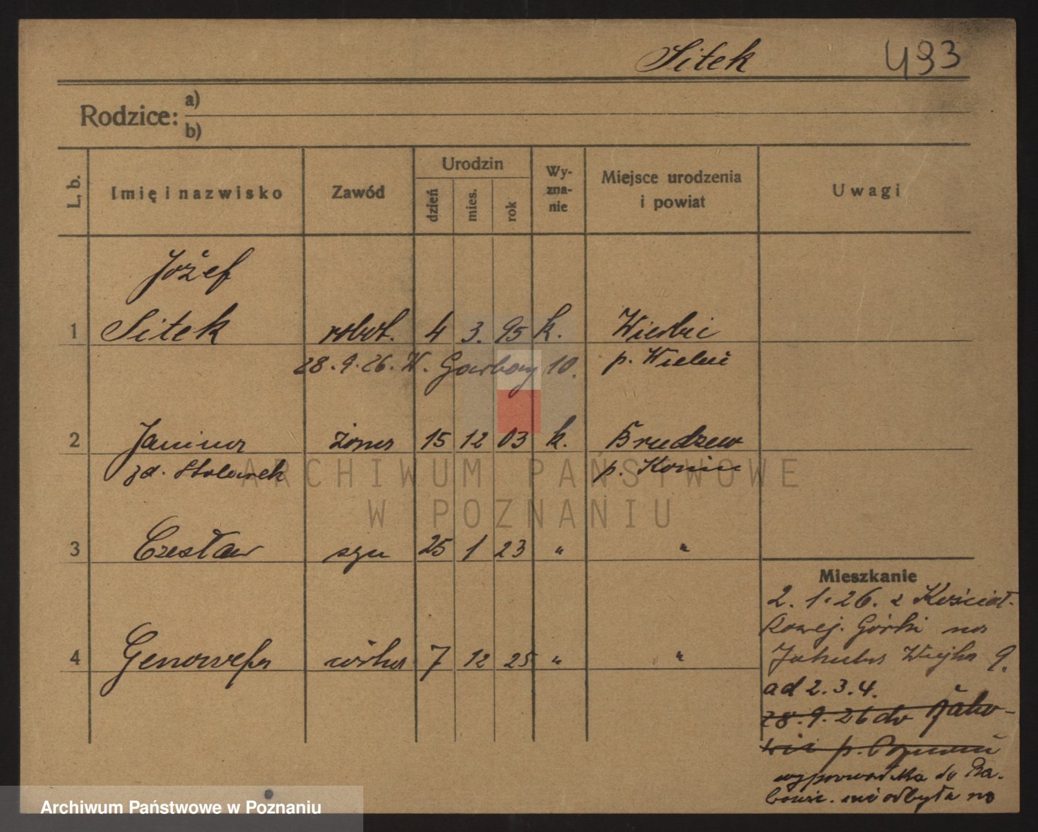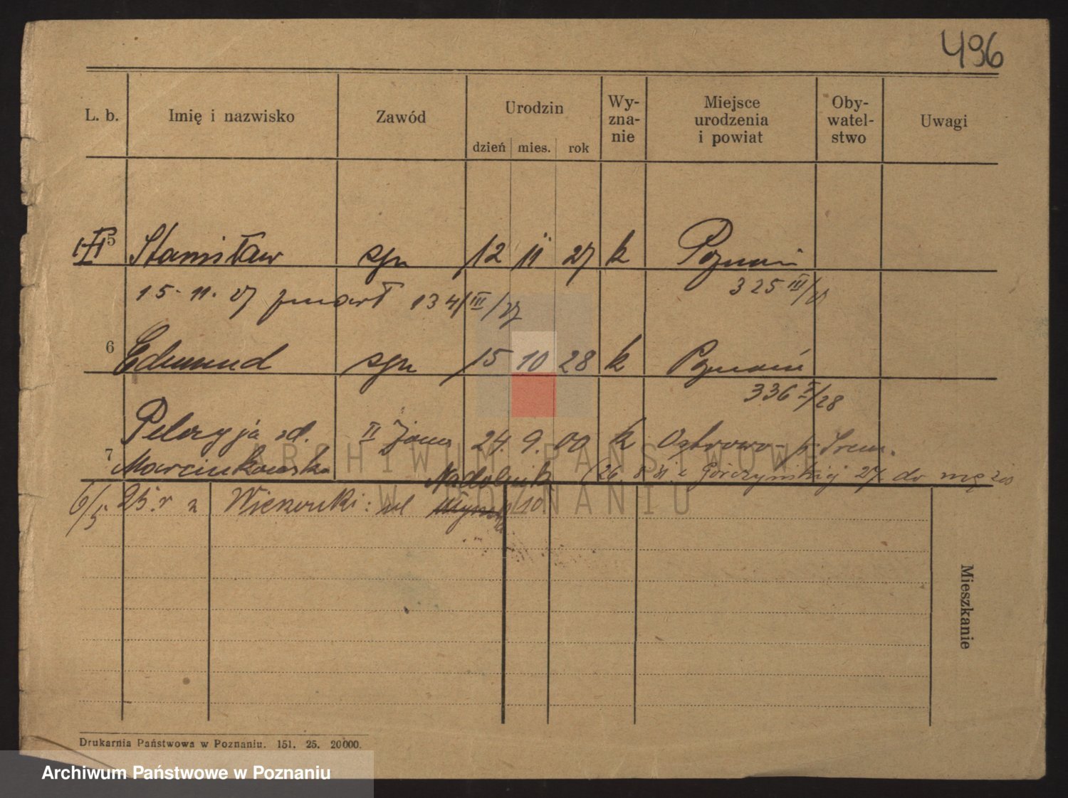 Podgląd karty osobowej dostępny jest po kliknięciu na nazwisko lub ikonkę karty. Można dokonywać powiększenia (ikony na górze) lub przechodzić między kolejnymi skanami (strzałki po bokach).
