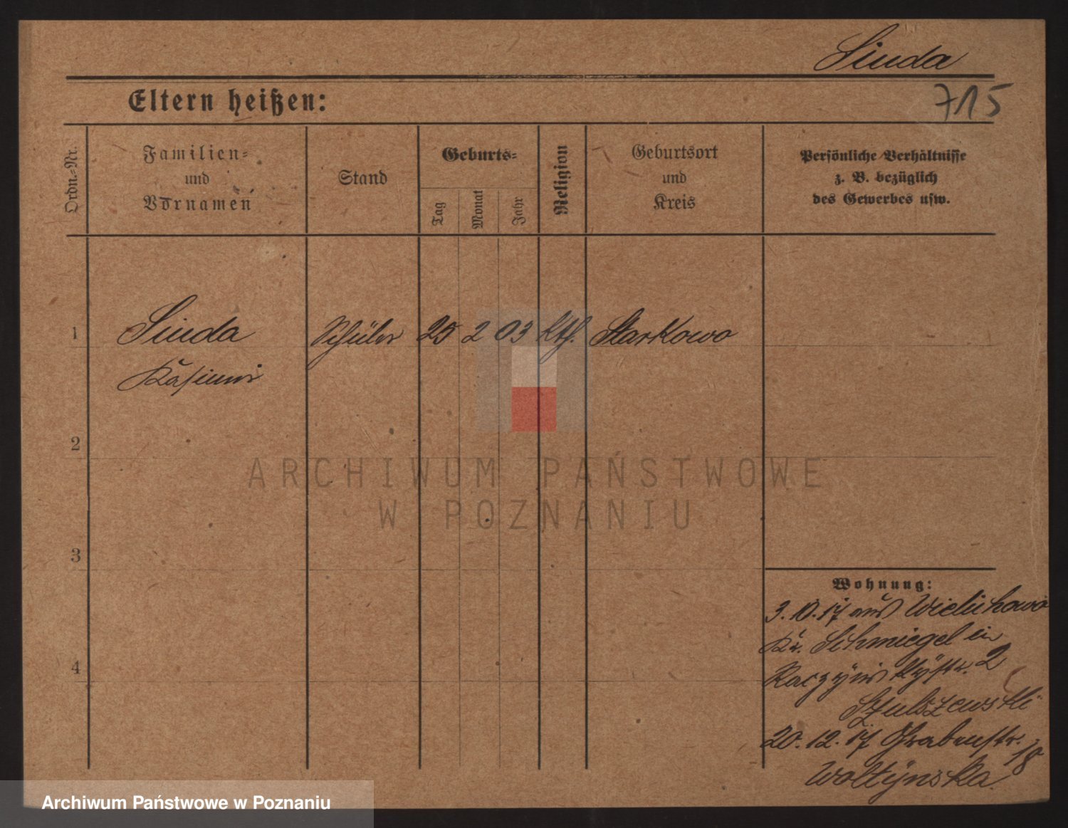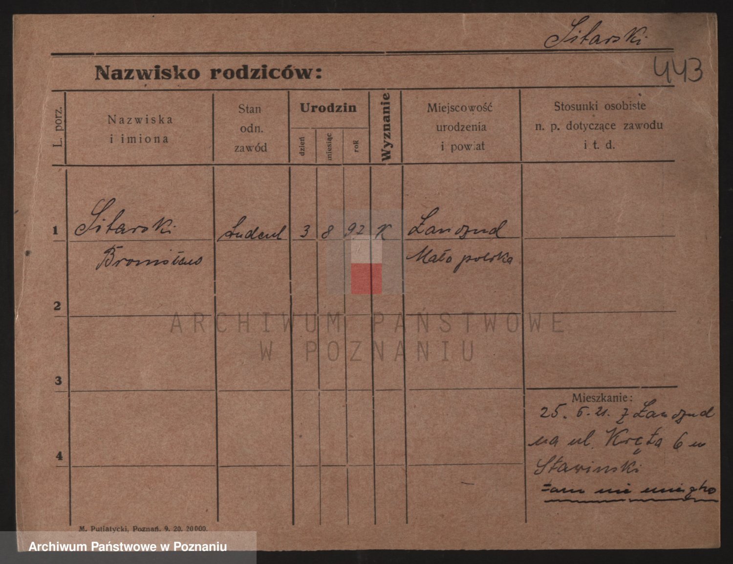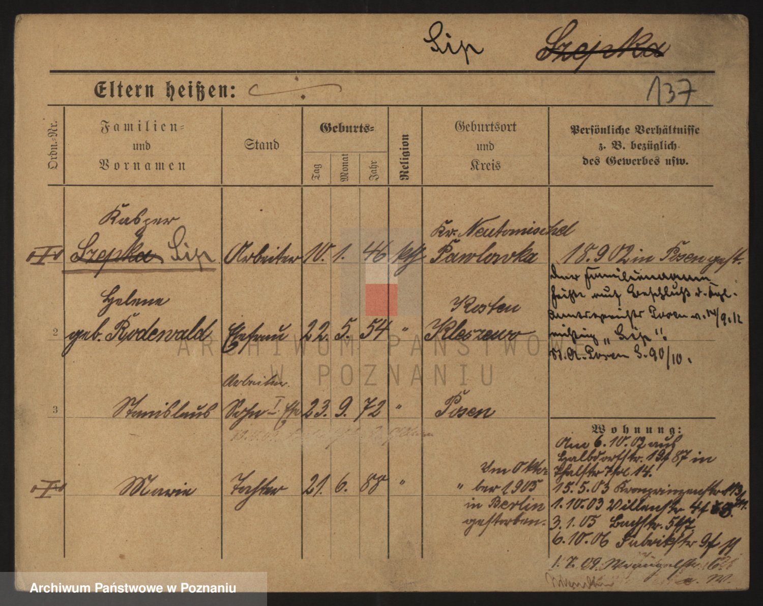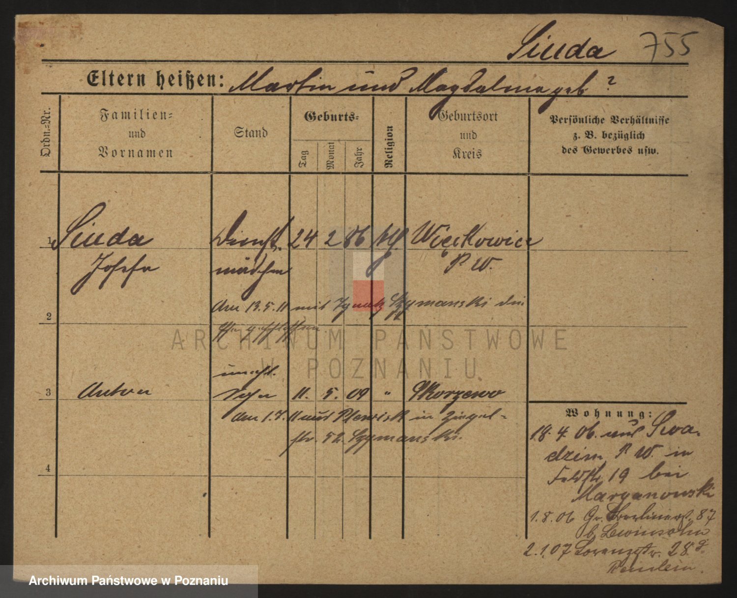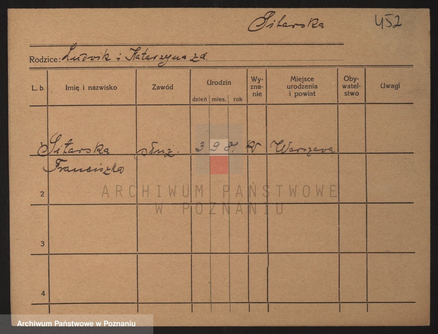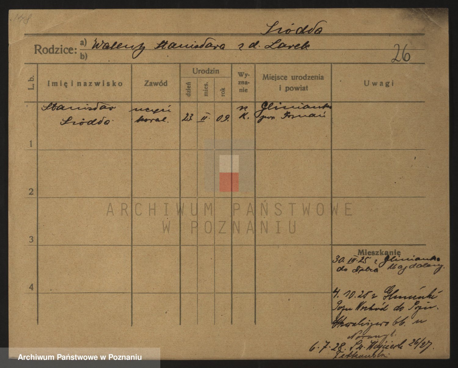 Podgląd karty osobowej dostępny jest po kliknięciu na nazwisko lub ikonkę karty. Można dokonywać powiększenia (ikony na górze) lub przechodzić między kolejnymi skanami (strzałki po bokach).