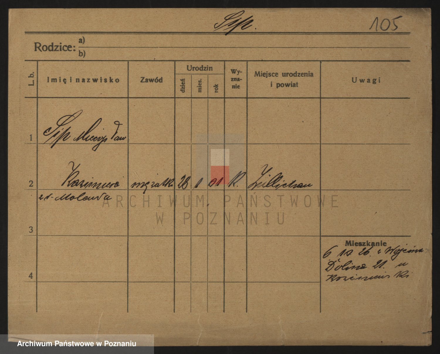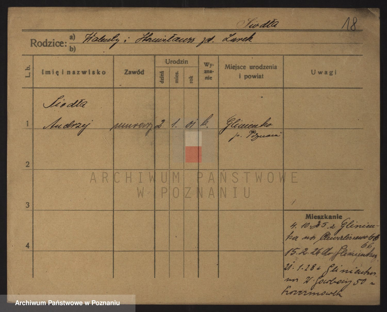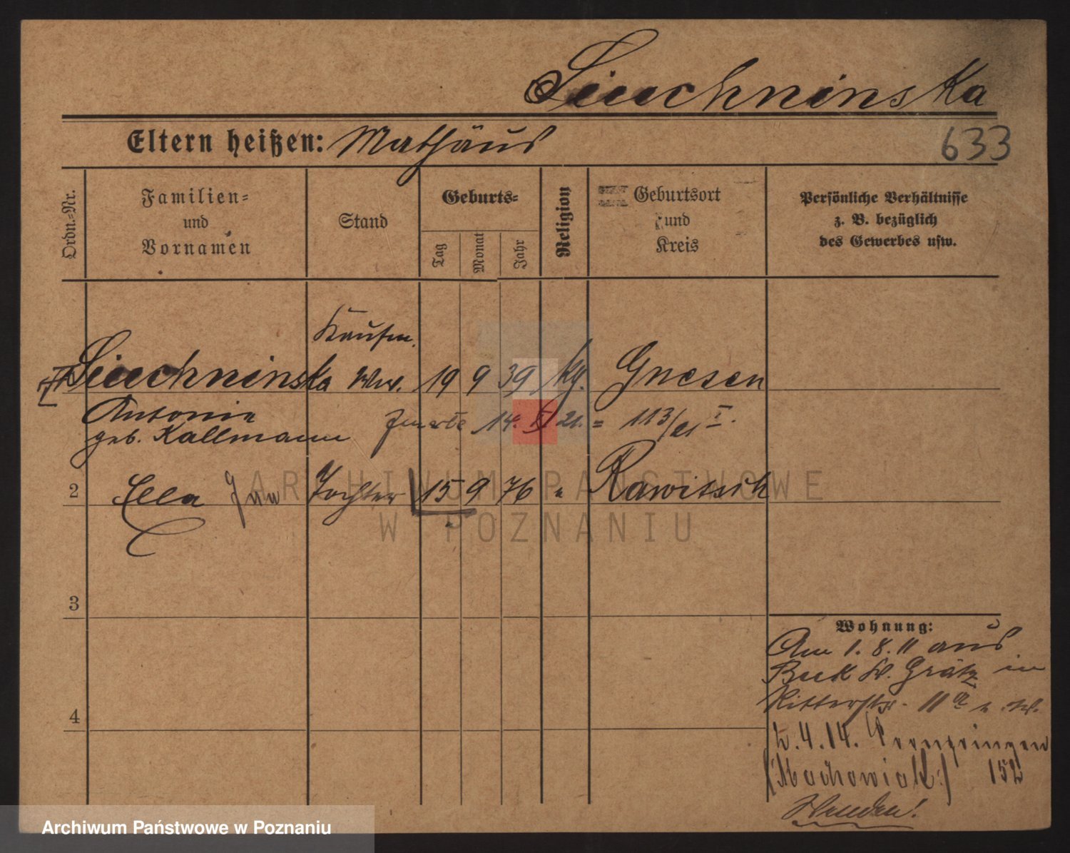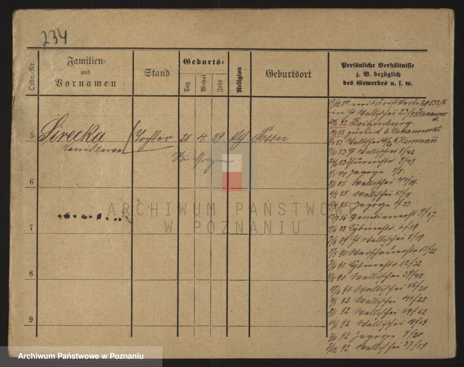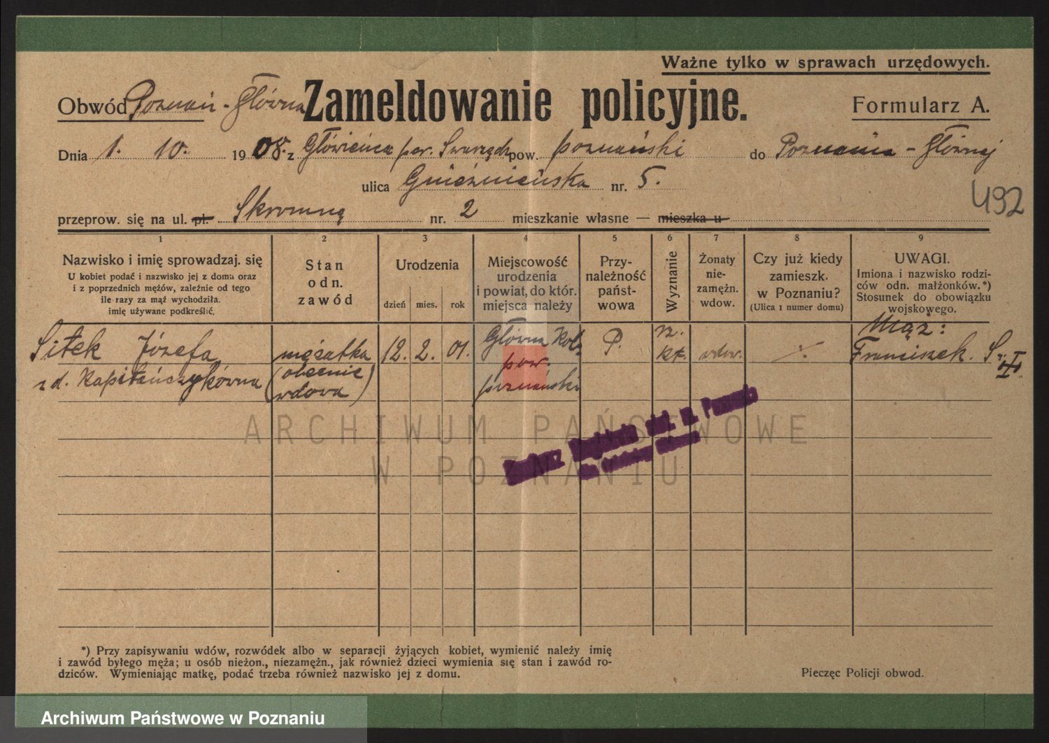 Podgląd karty osobowej dostępny jest po kliknięciu na nazwisko lub ikonkę karty. Można dokonywać powiększenia (ikony na górze) lub przechodzić między kolejnymi skanami (strzałki po bokach).