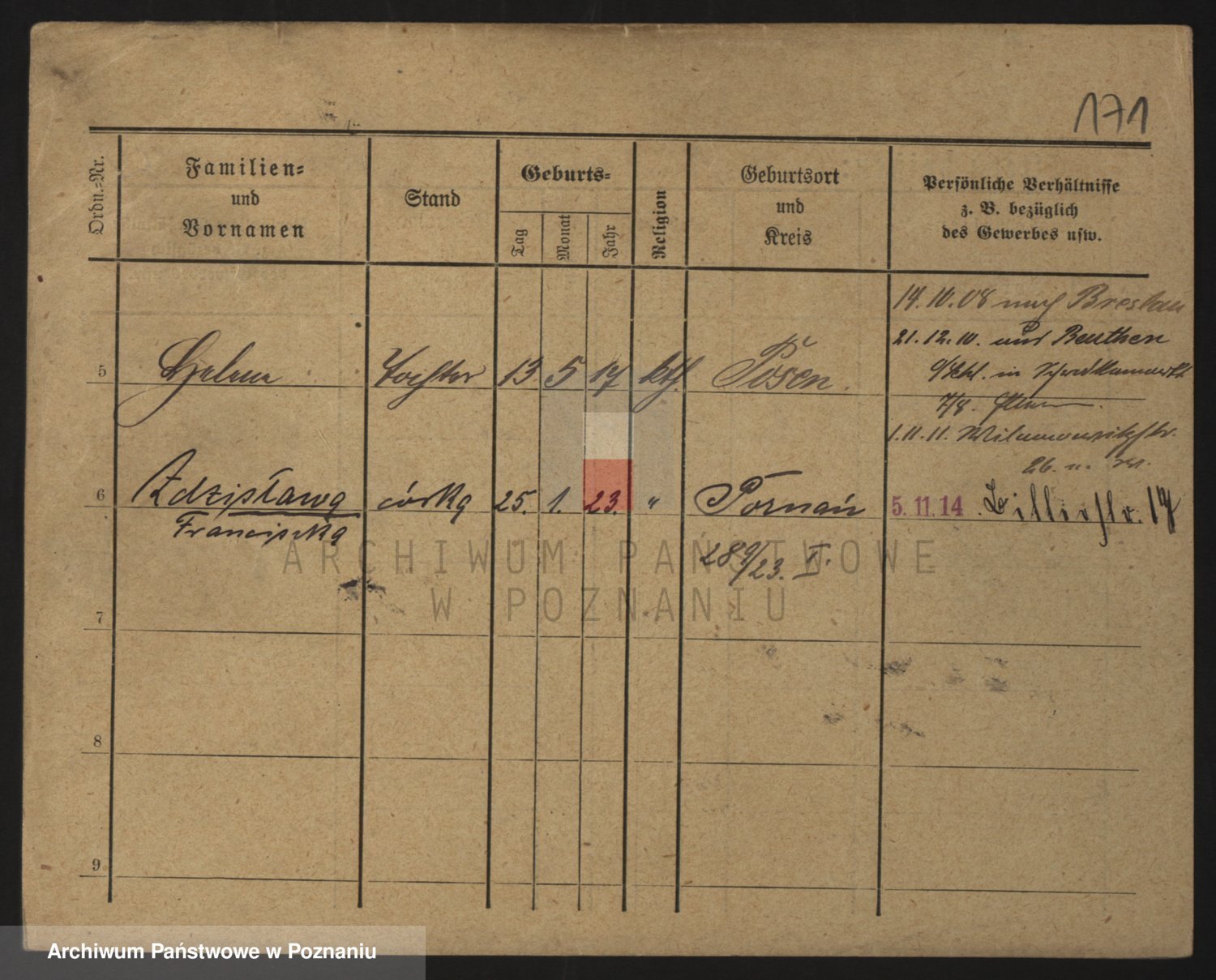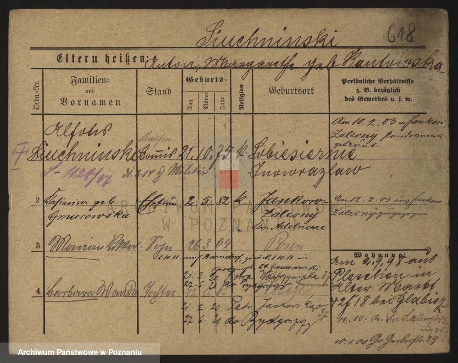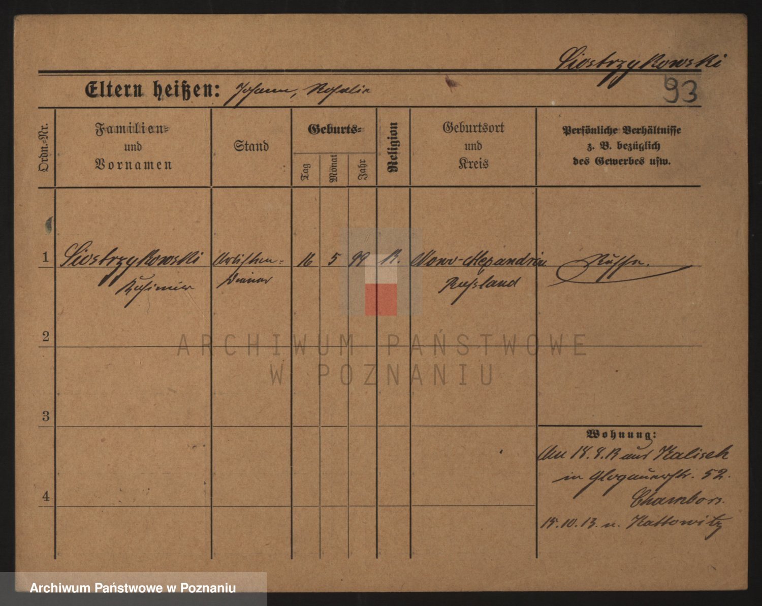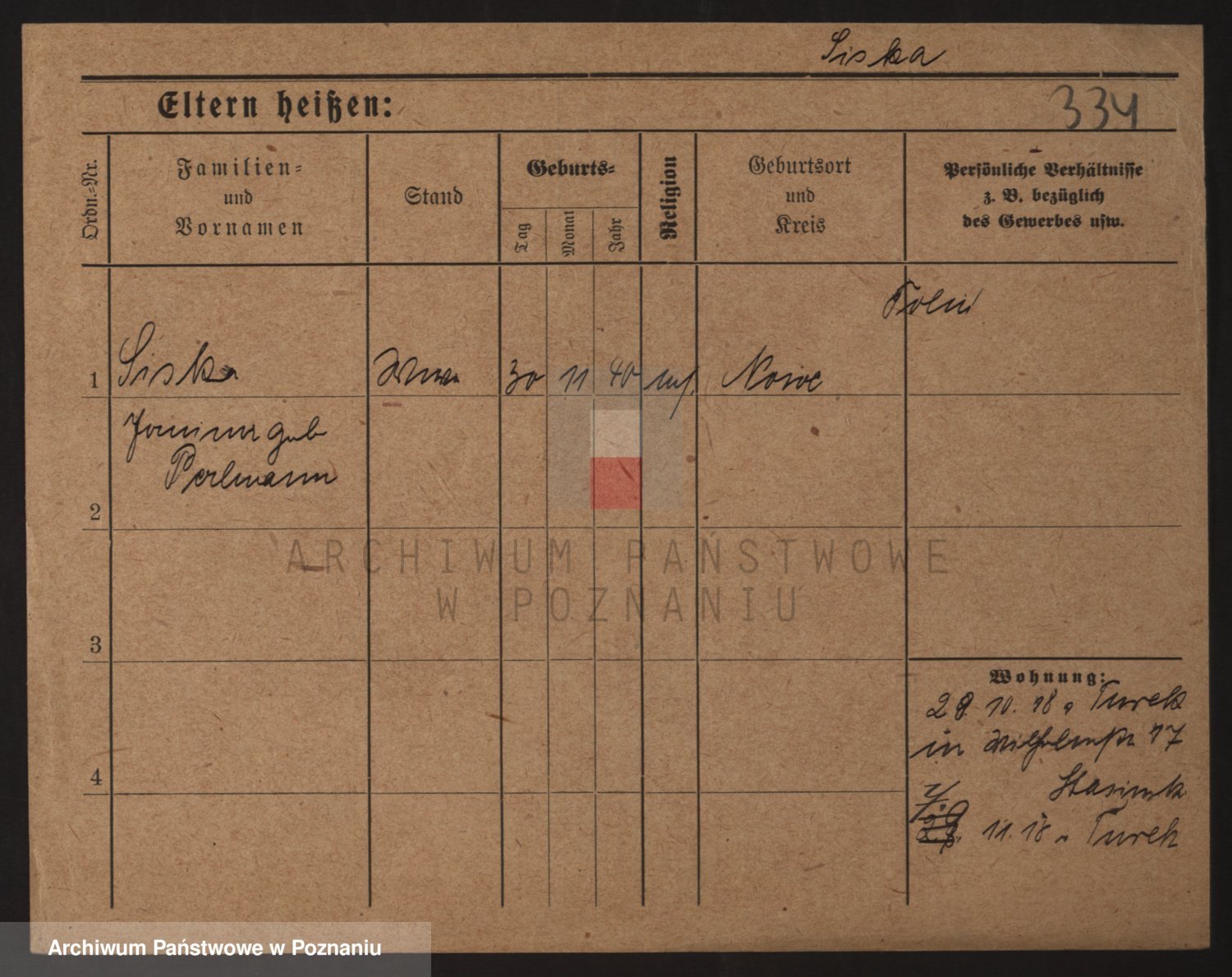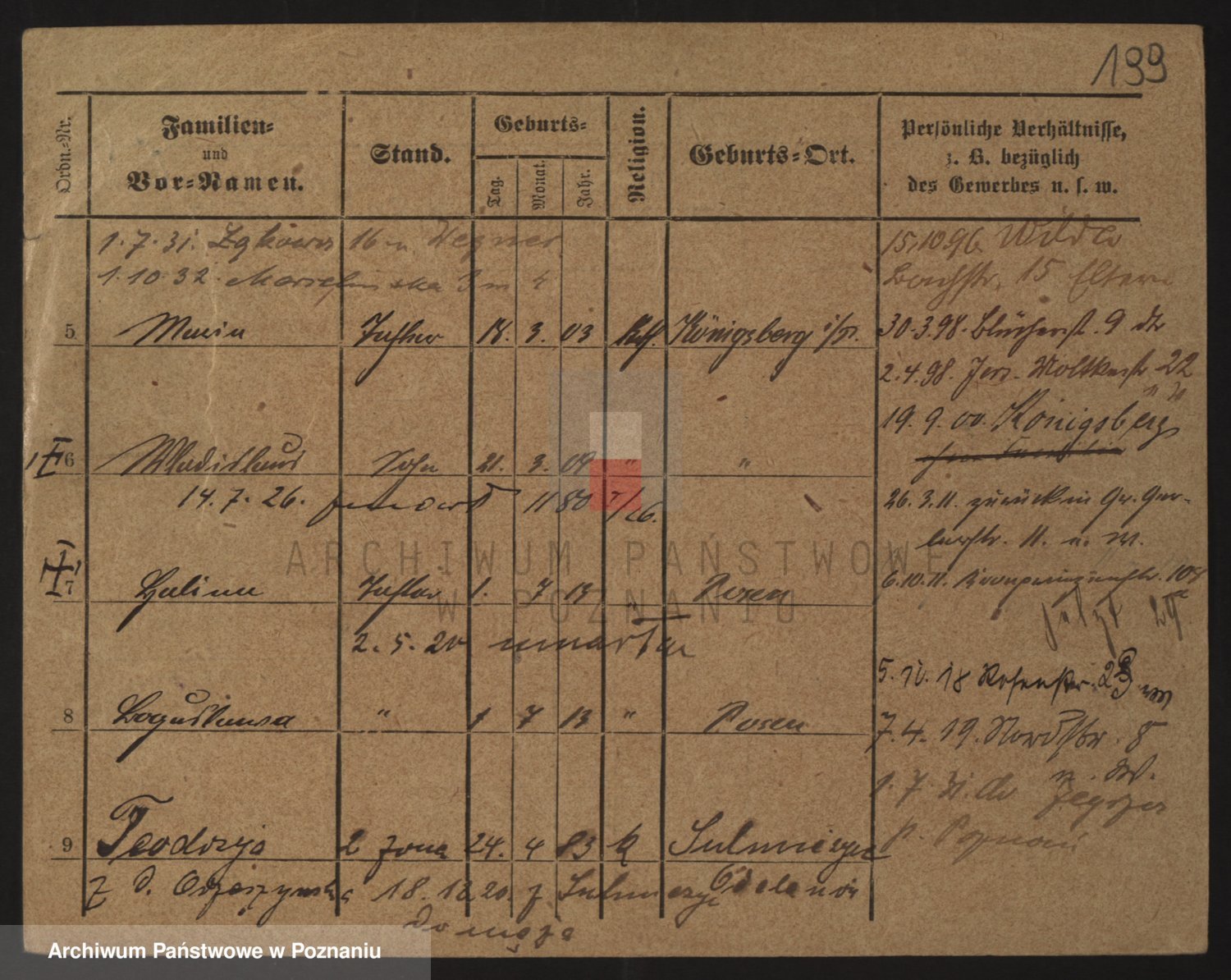 Podgląd karty osobowej dostępny jest po kliknięciu na nazwisko lub ikonkę karty. Można dokonywać powiększenia (ikony na górze) lub przechodzić między kolejnymi skanami (strzałki po bokach).