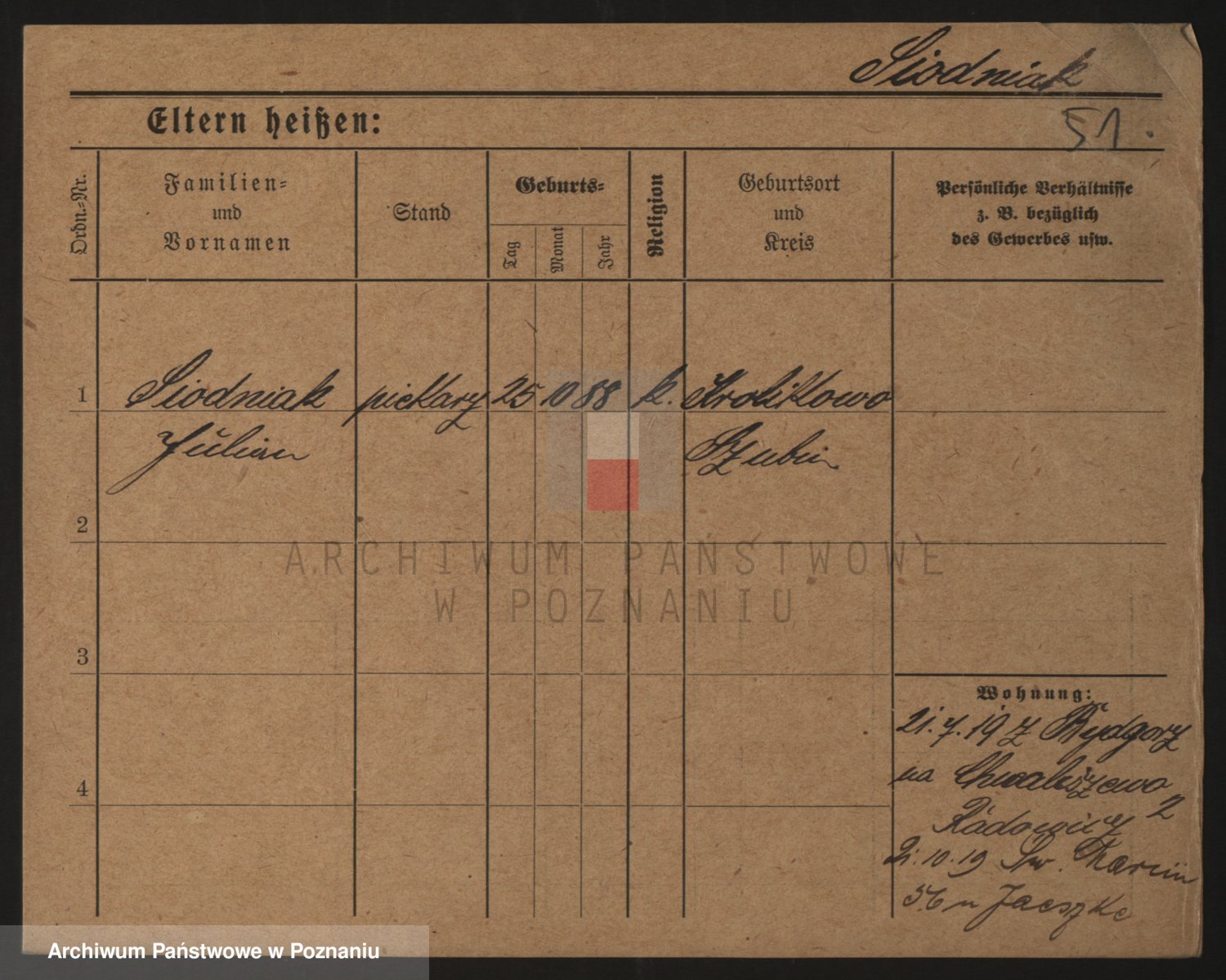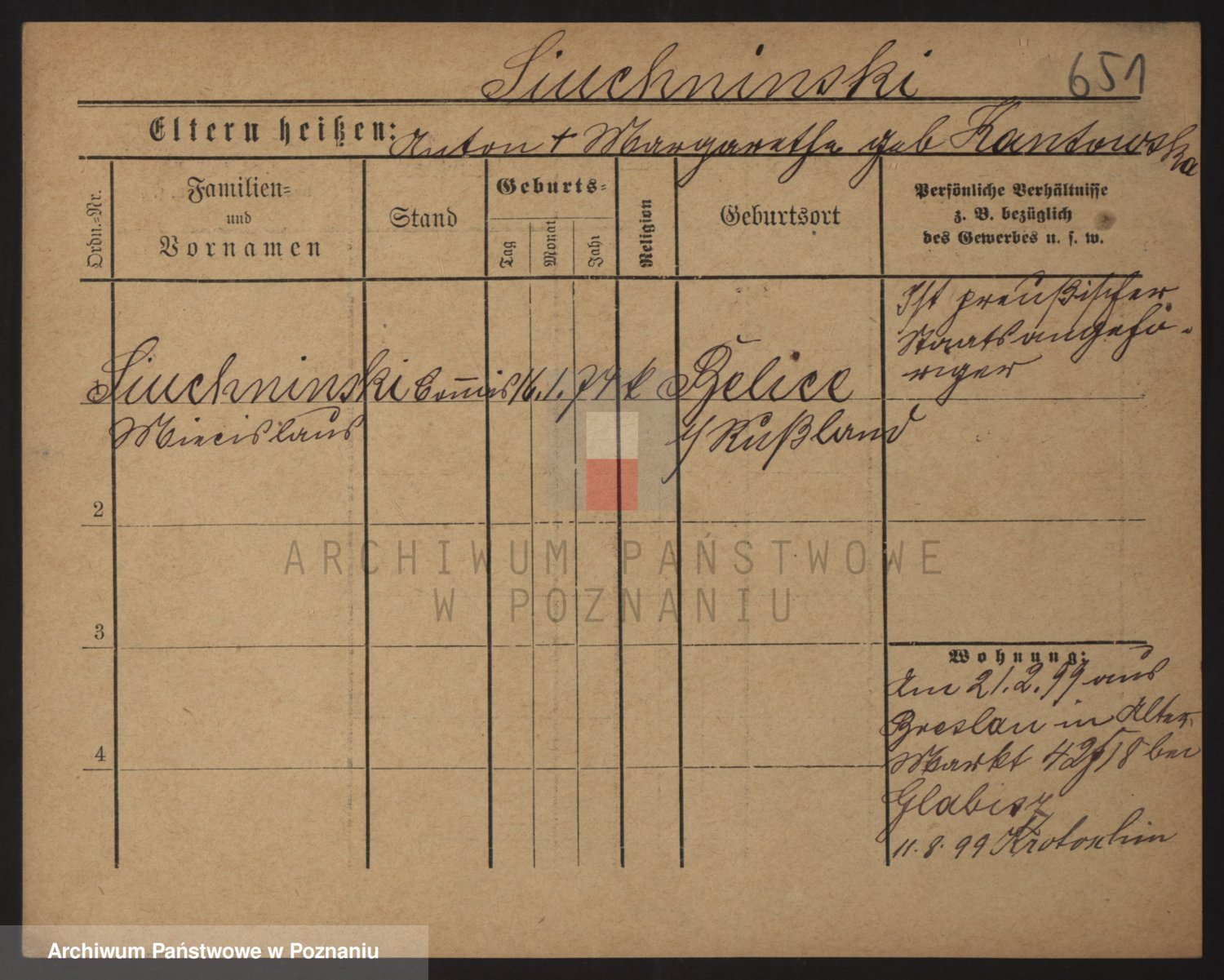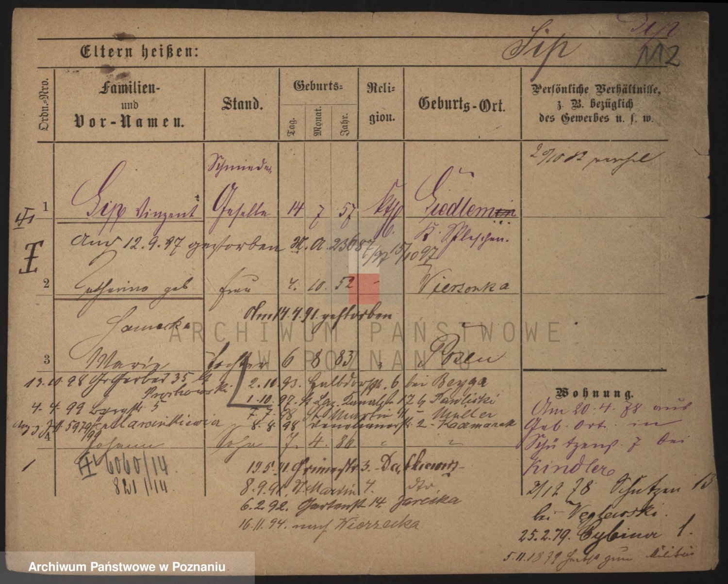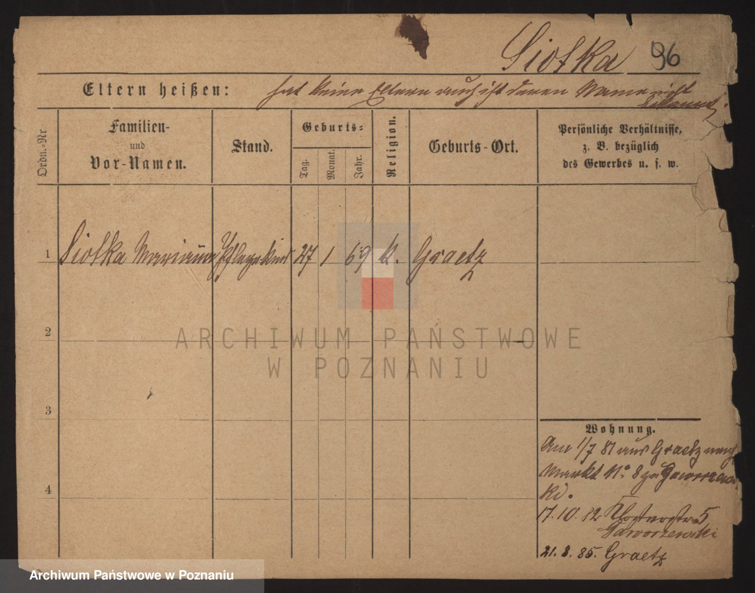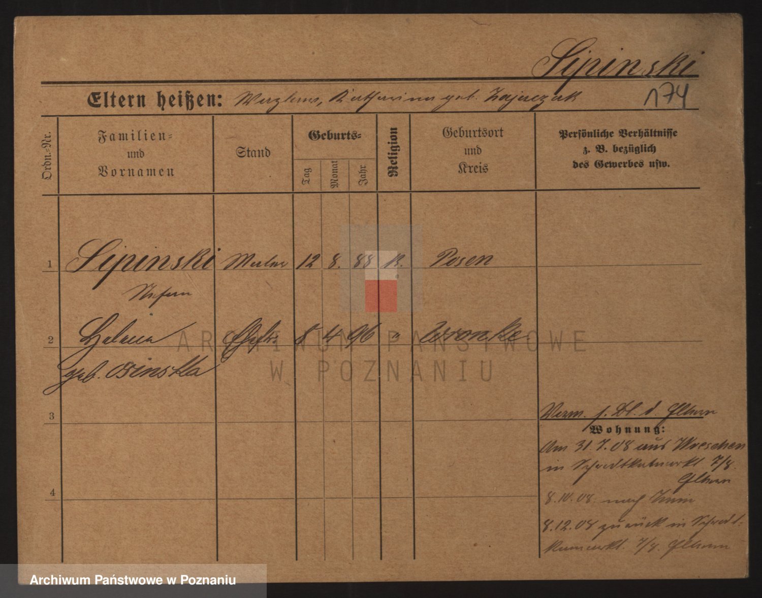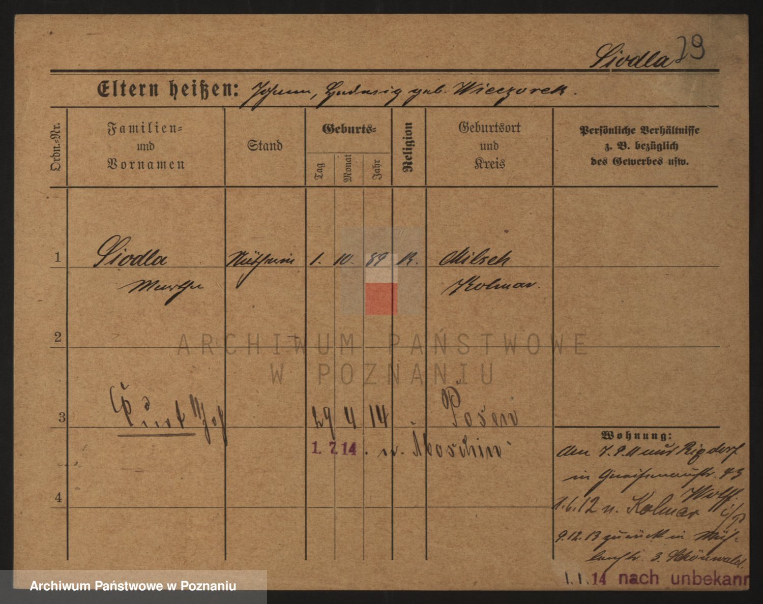 Podgląd karty osobowej dostępny jest po kliknięciu na nazwisko lub ikonkę karty. Można dokonywać powiększenia (ikony na górze) lub przechodzić między kolejnymi skanami (strzałki po bokach).