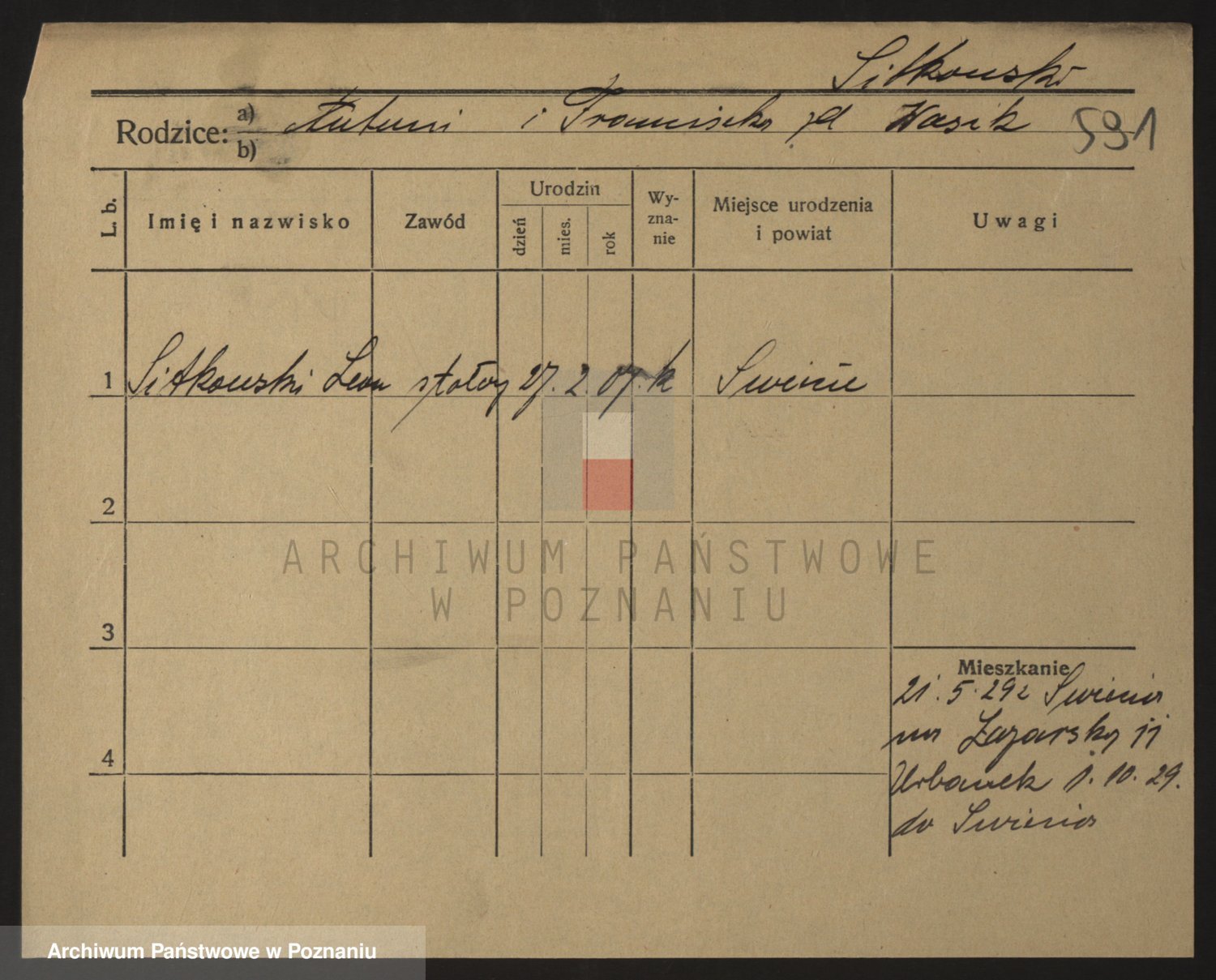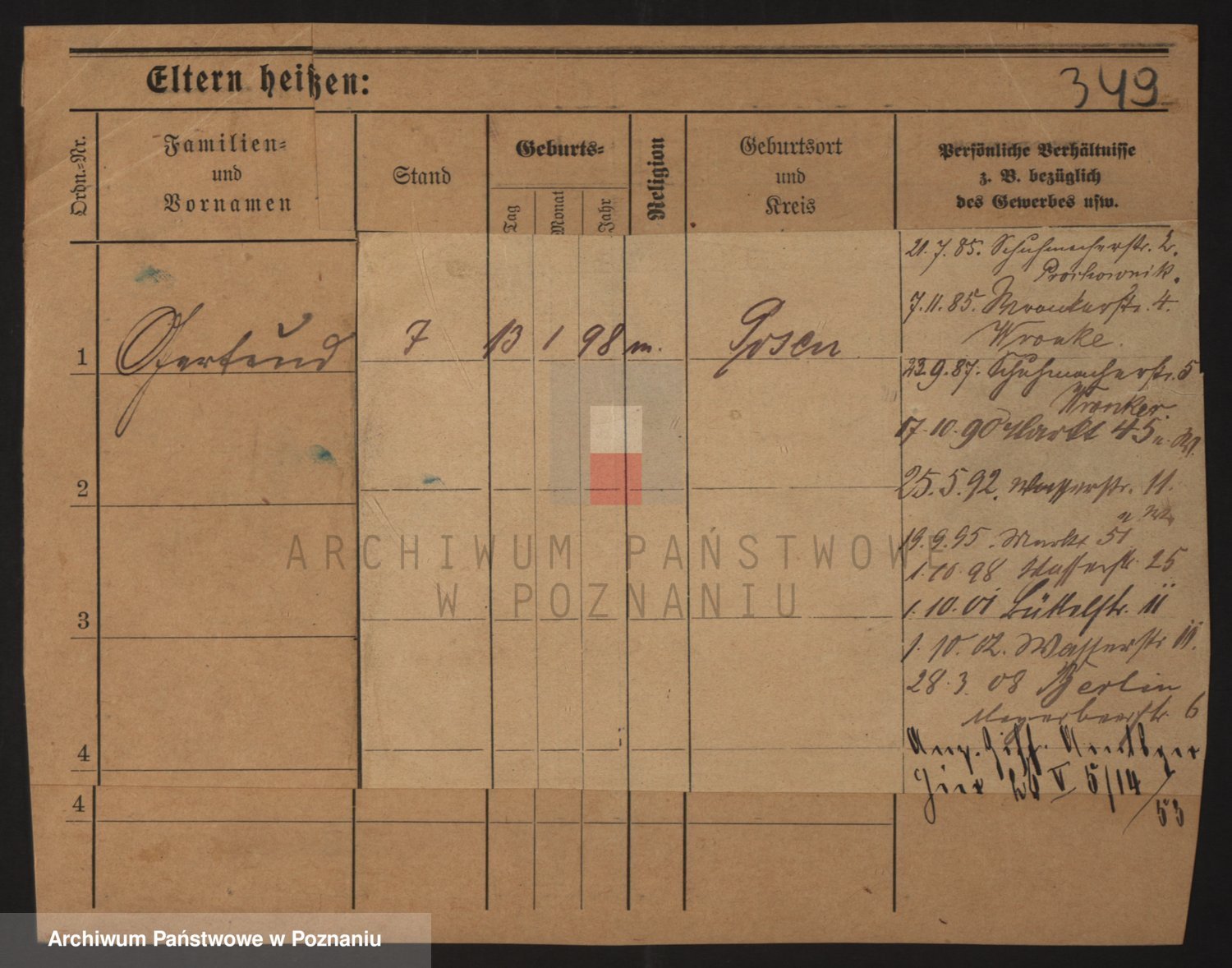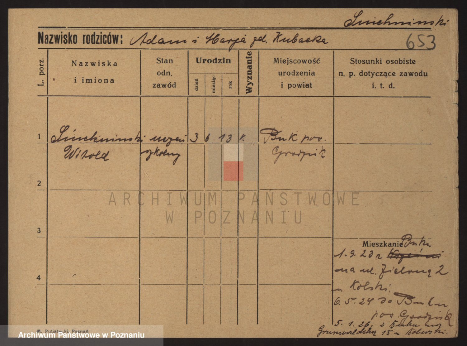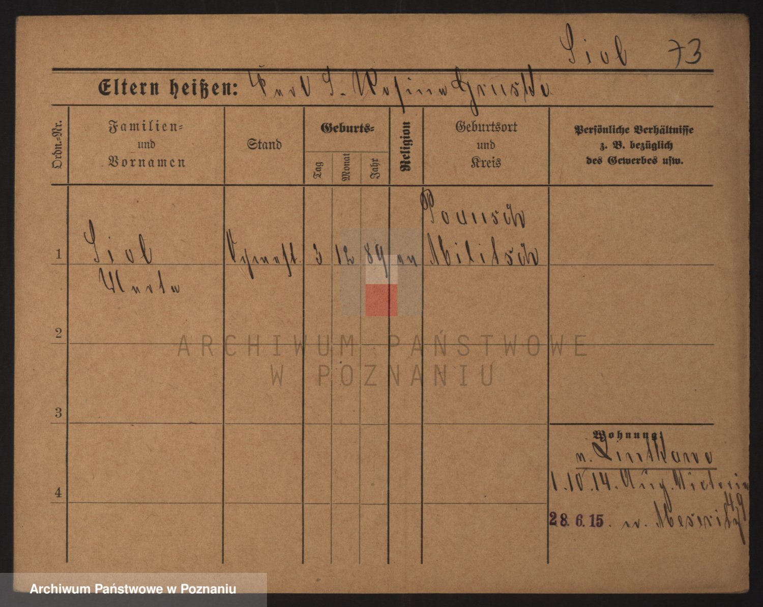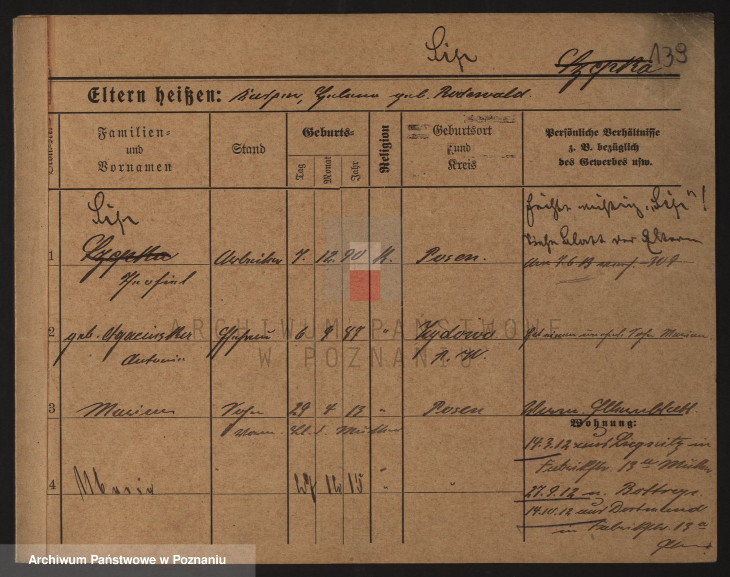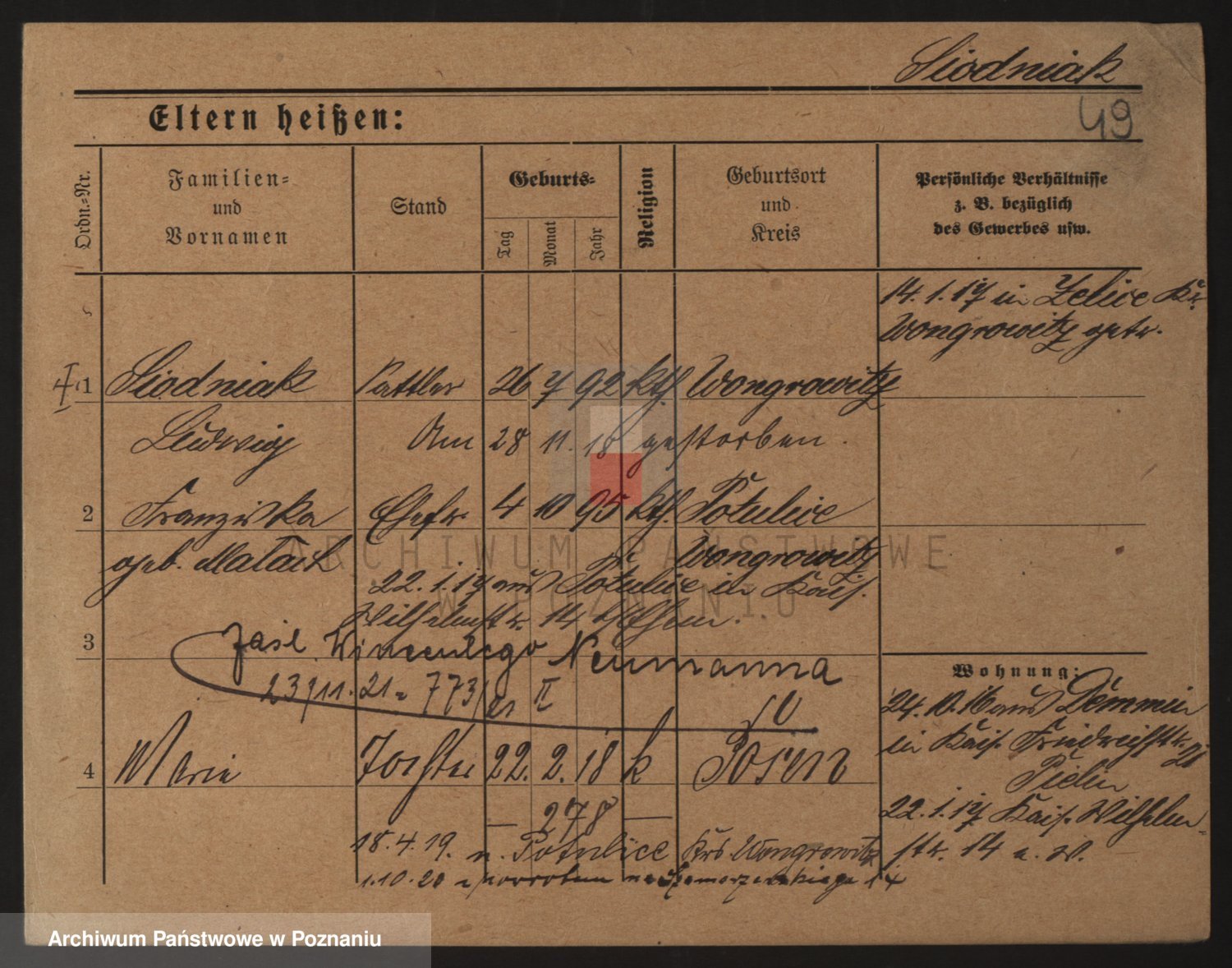 Podgląd karty osobowej dostępny jest po kliknięciu na nazwisko lub ikonkę karty. Można dokonywać powiększenia (ikony na górze) lub przechodzić między kolejnymi skanami (strzałki po bokach).