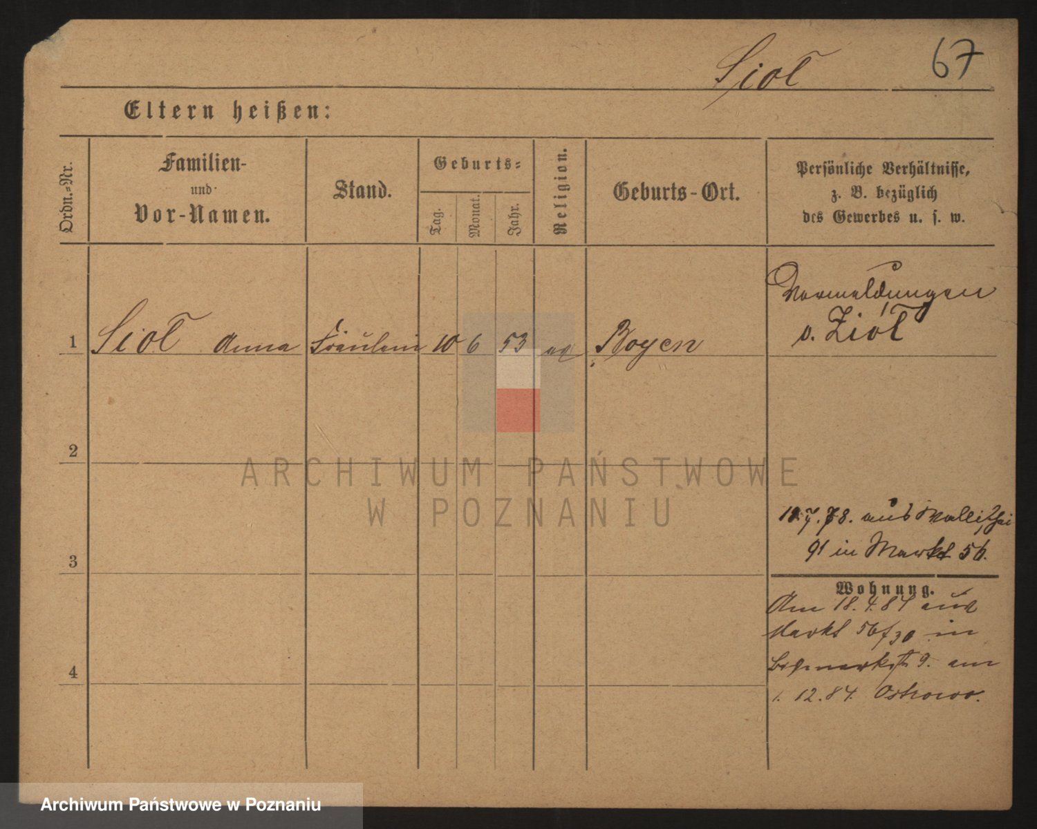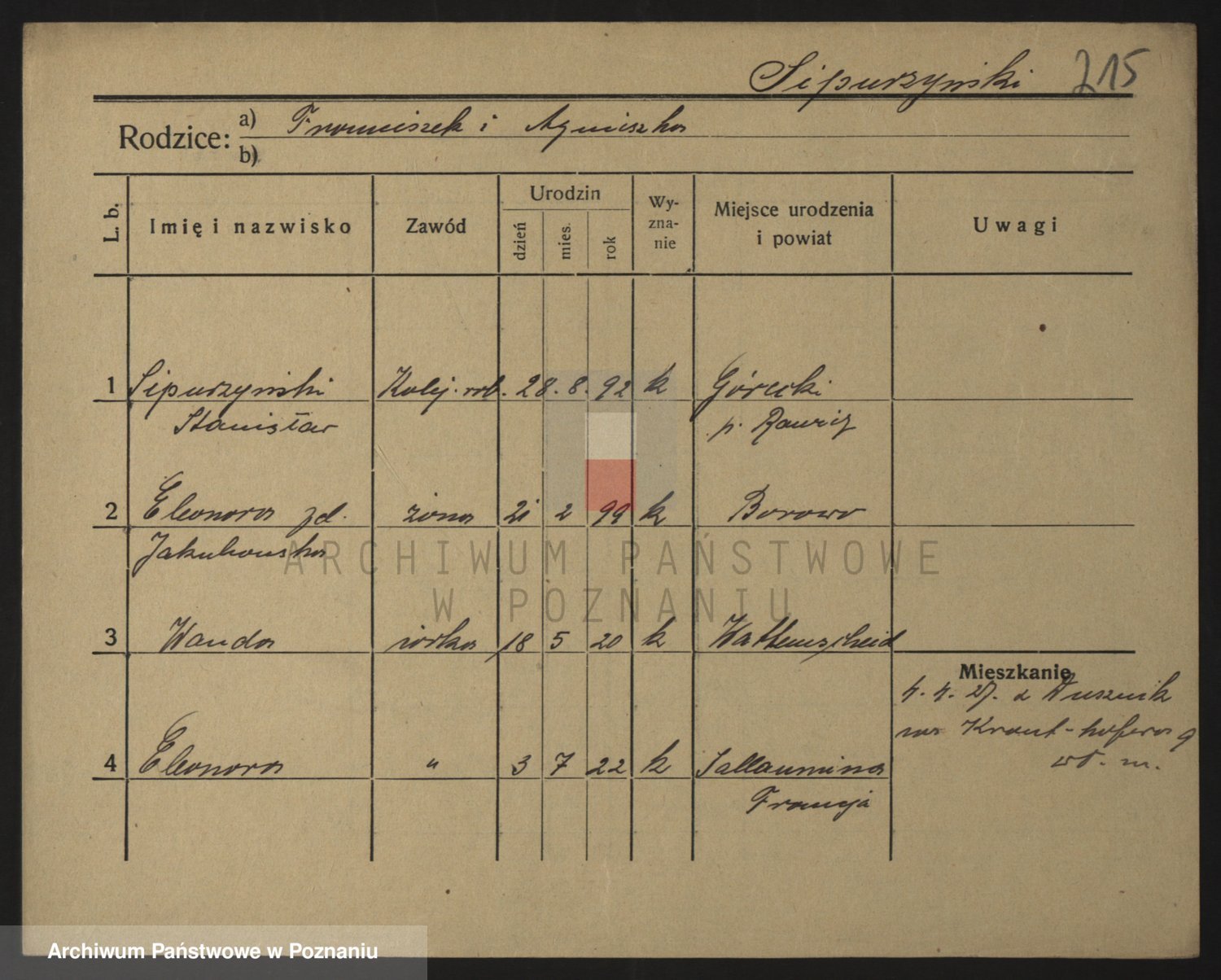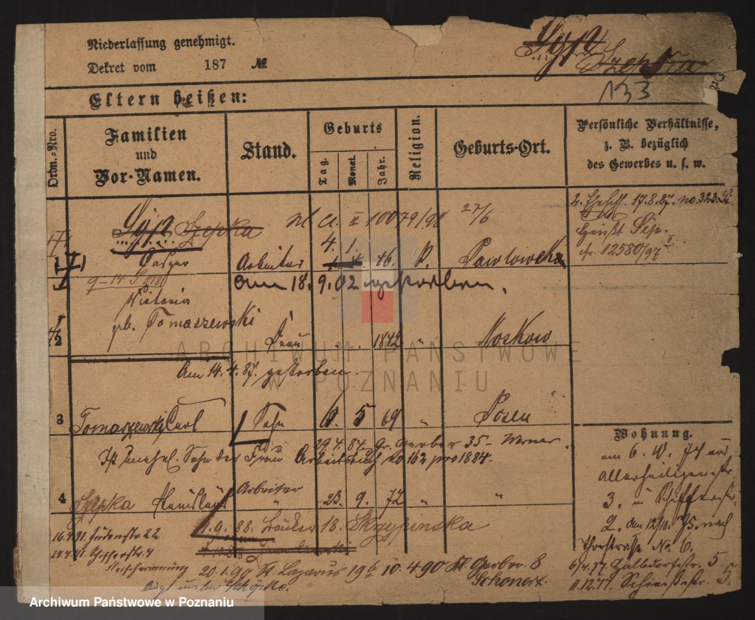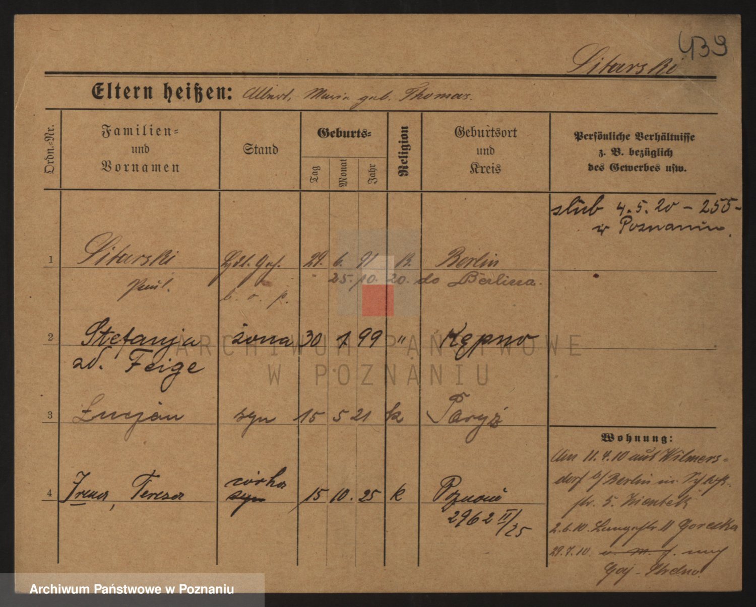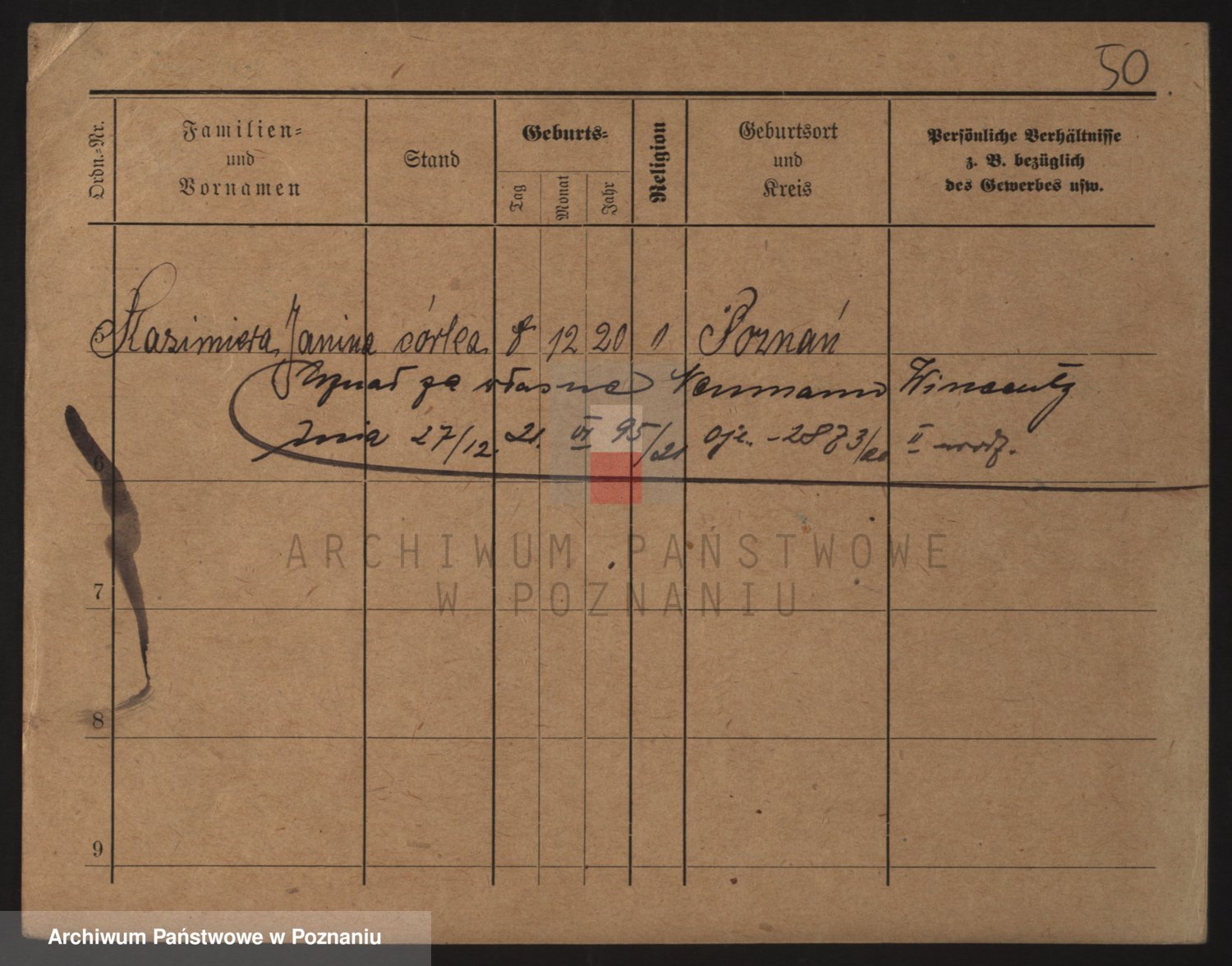 Podgląd karty osobowej dostępny jest po kliknięciu na nazwisko lub ikonkę karty. Można dokonywać powiększenia (ikony na górze) lub przechodzić między kolejnymi skanami (strzałki po bokach).
