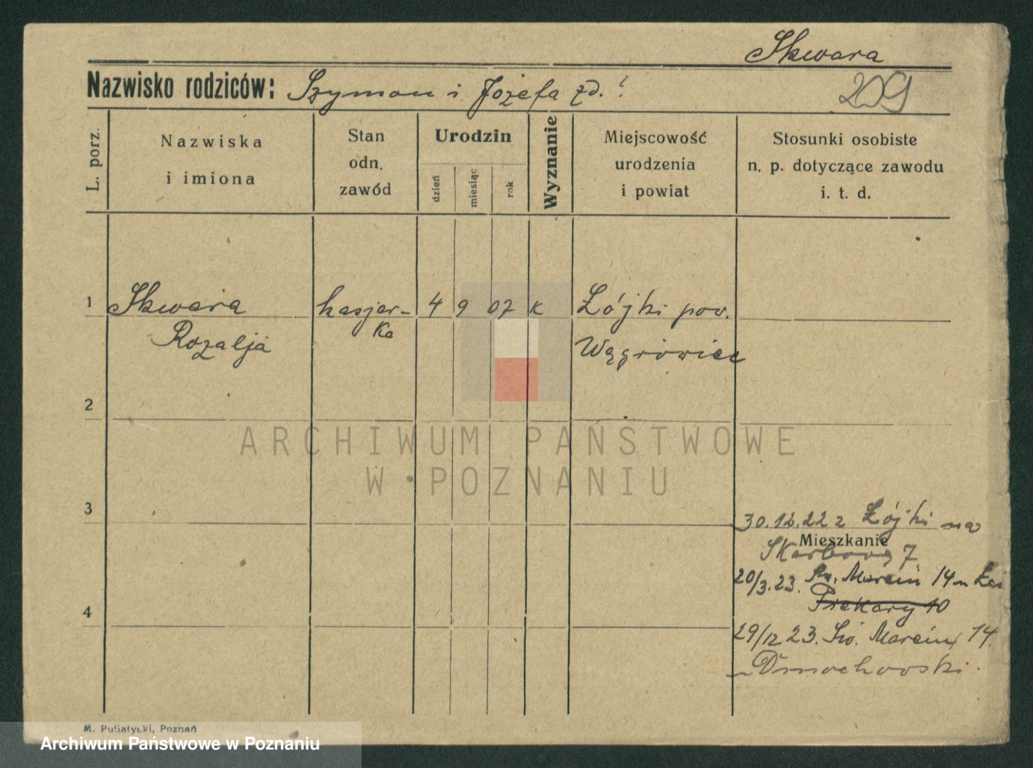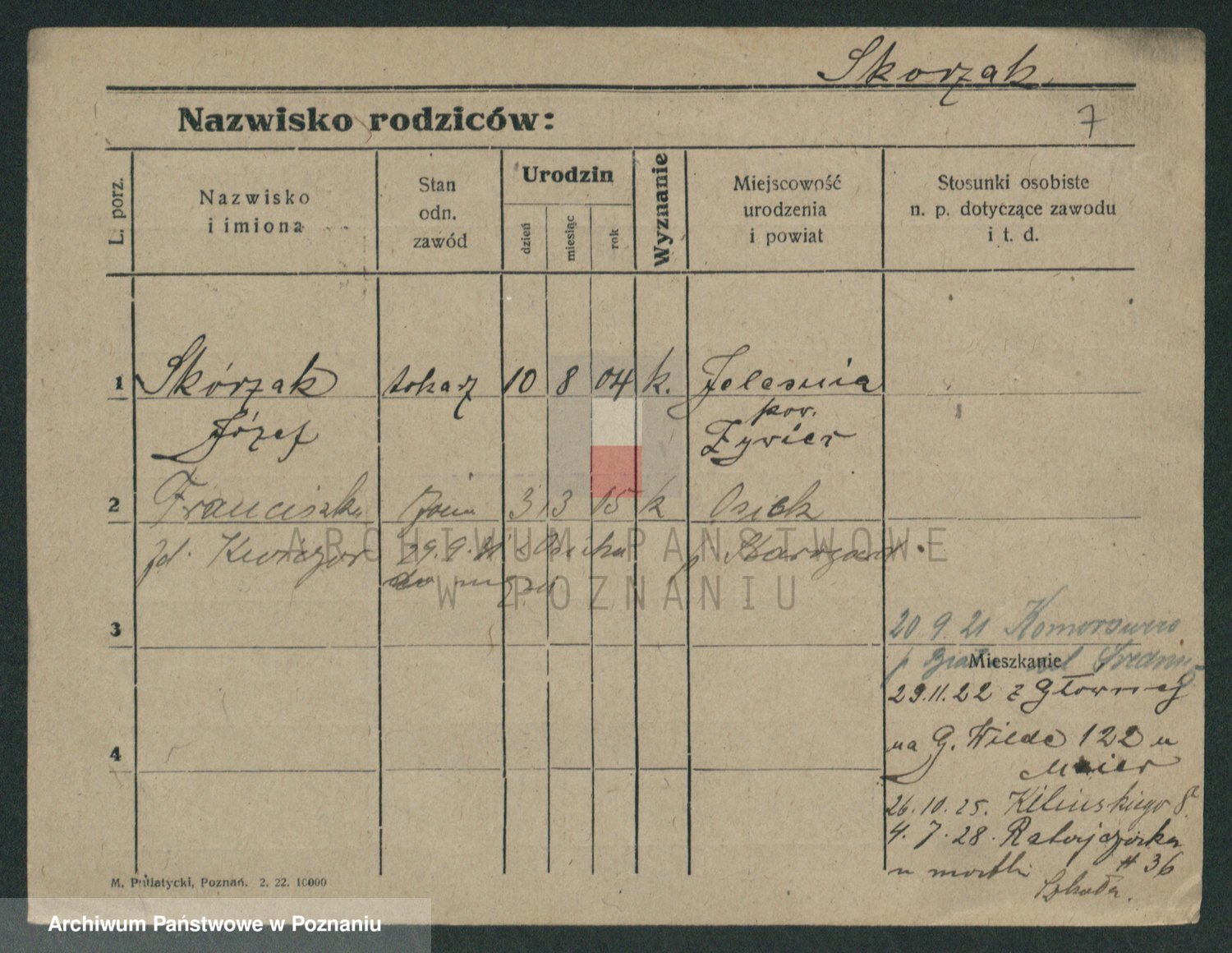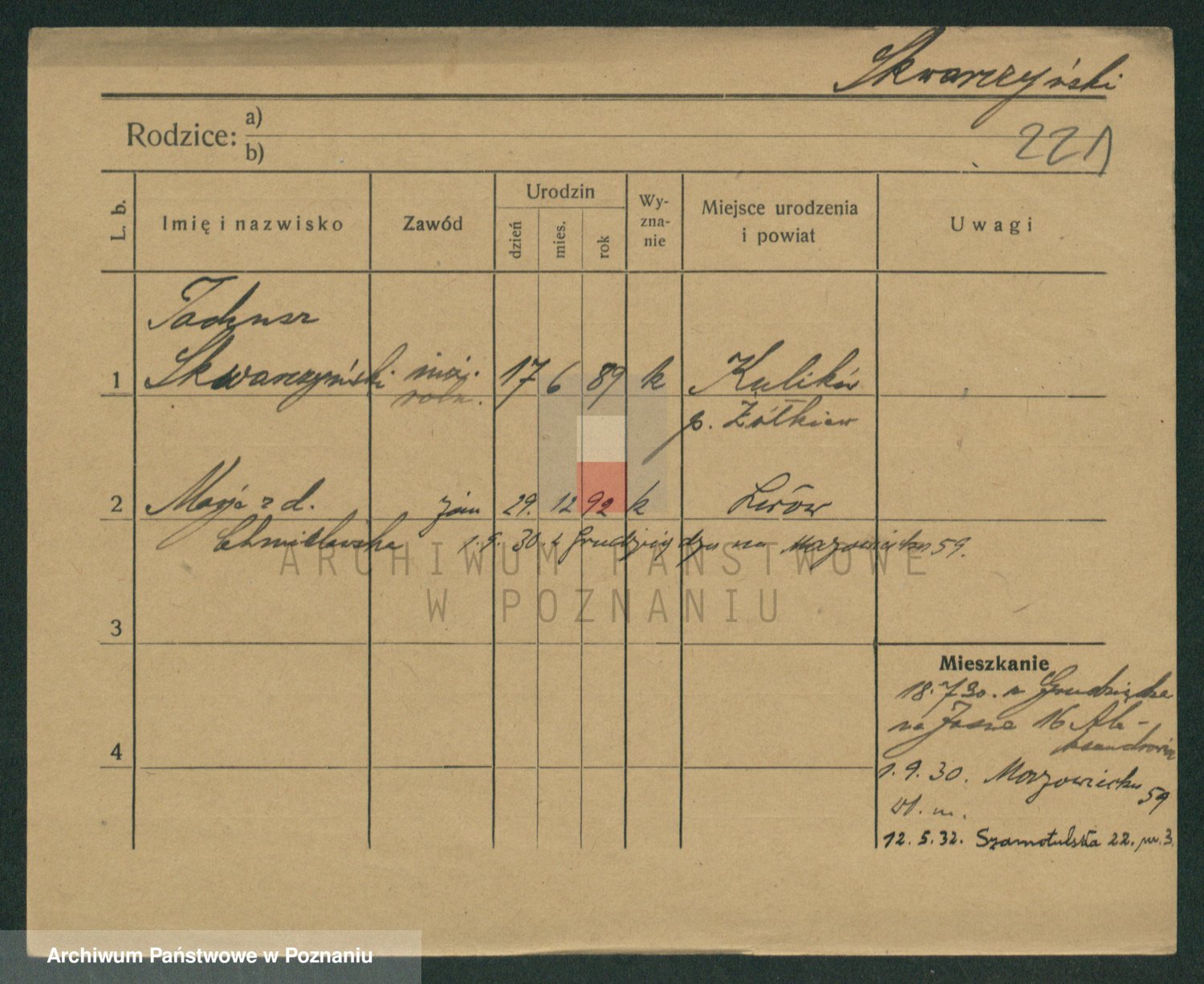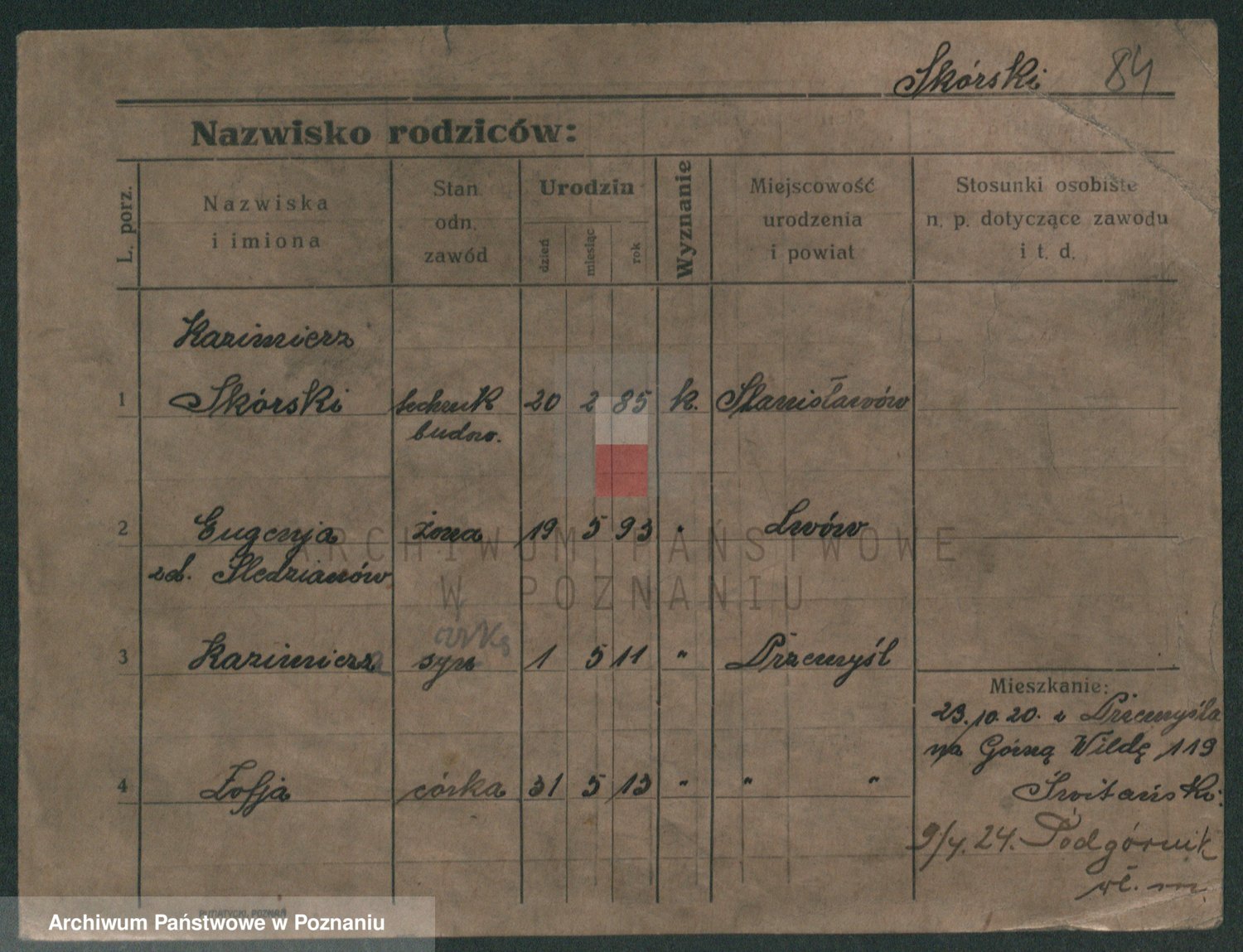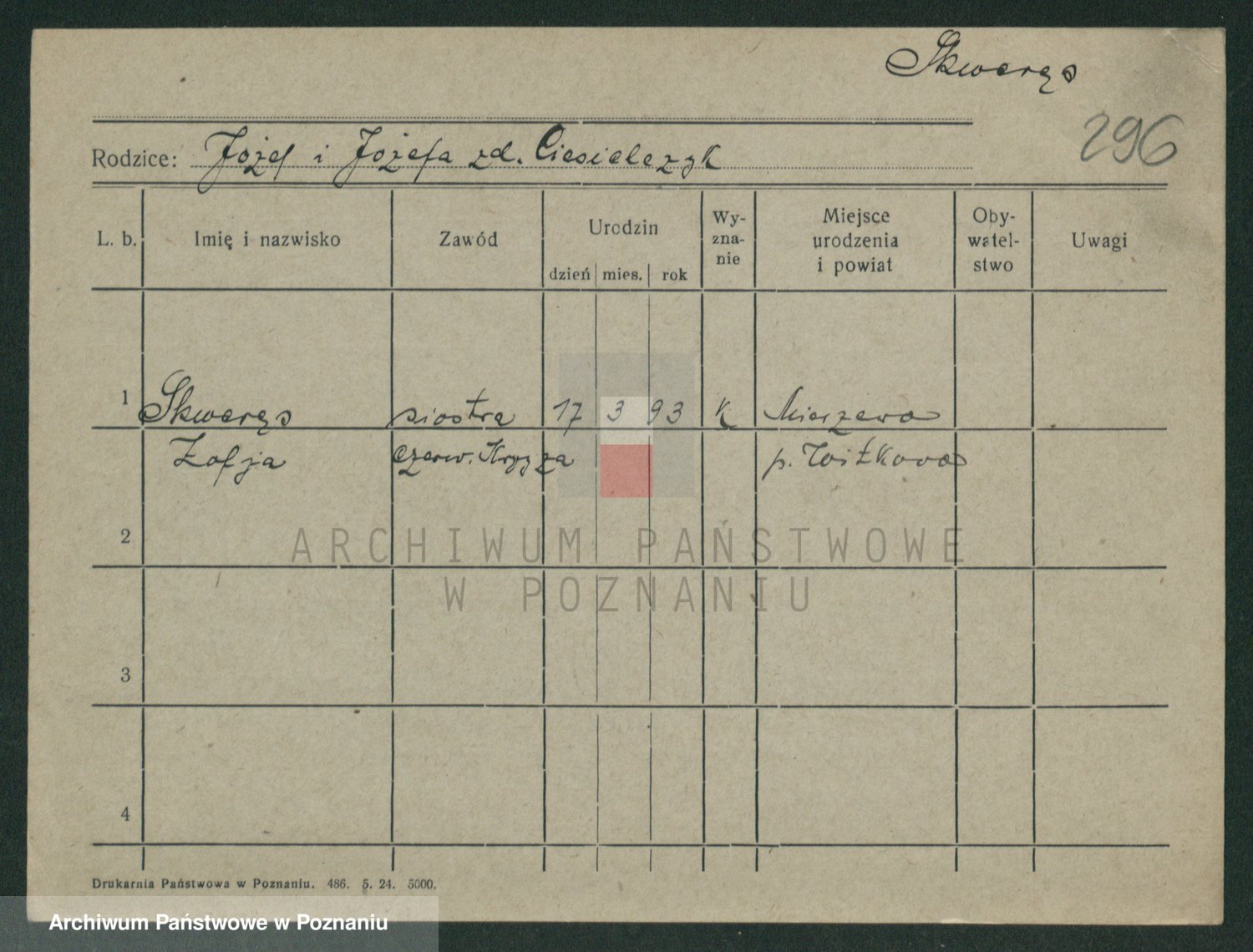 Podgląd karty osobowej dostępny jest po kliknięciu na nazwisko lub ikonkę karty. Można dokonywać powiększenia (ikony na górze) lub przechodzić między kolejnymi skanami (strzałki po bokach).