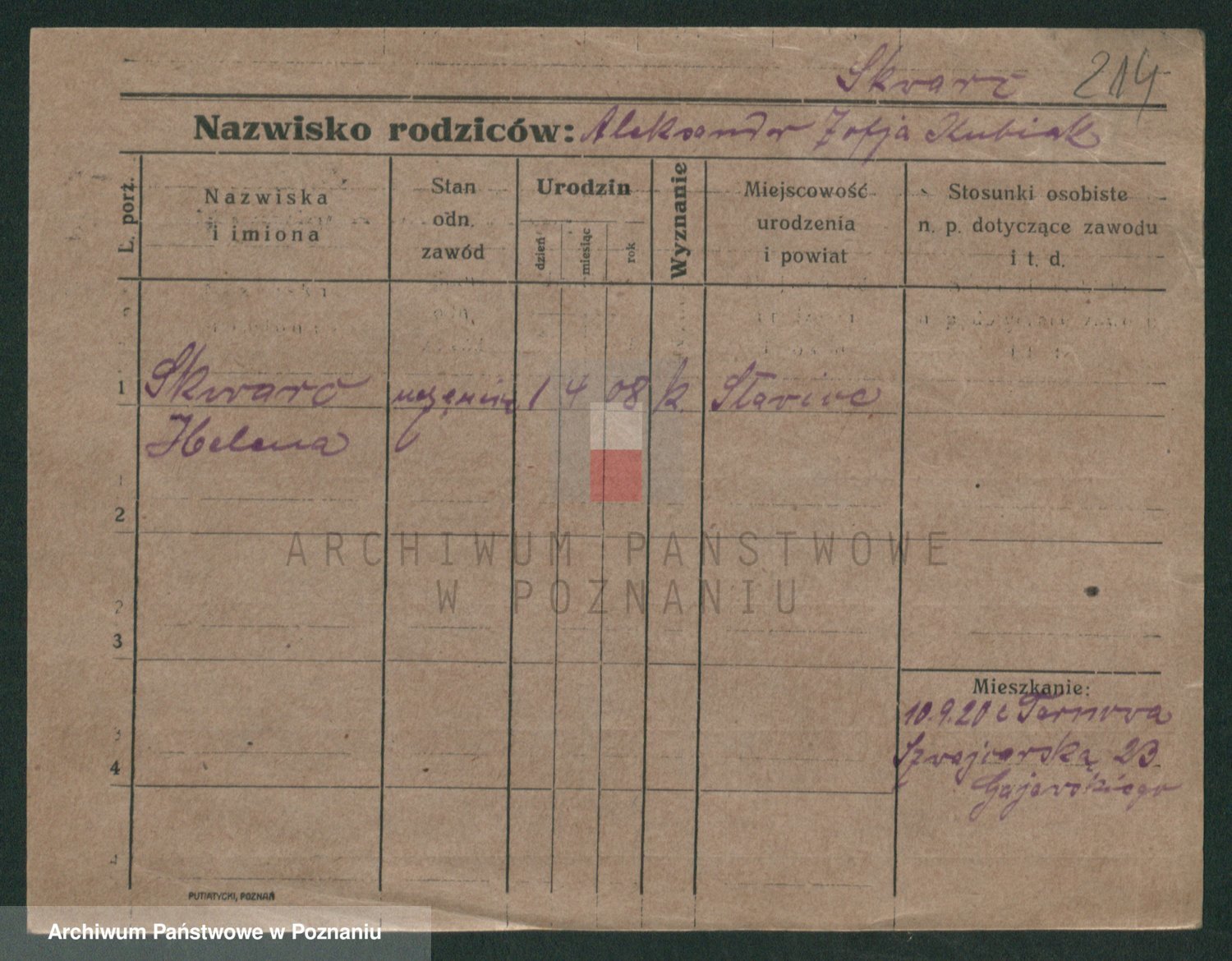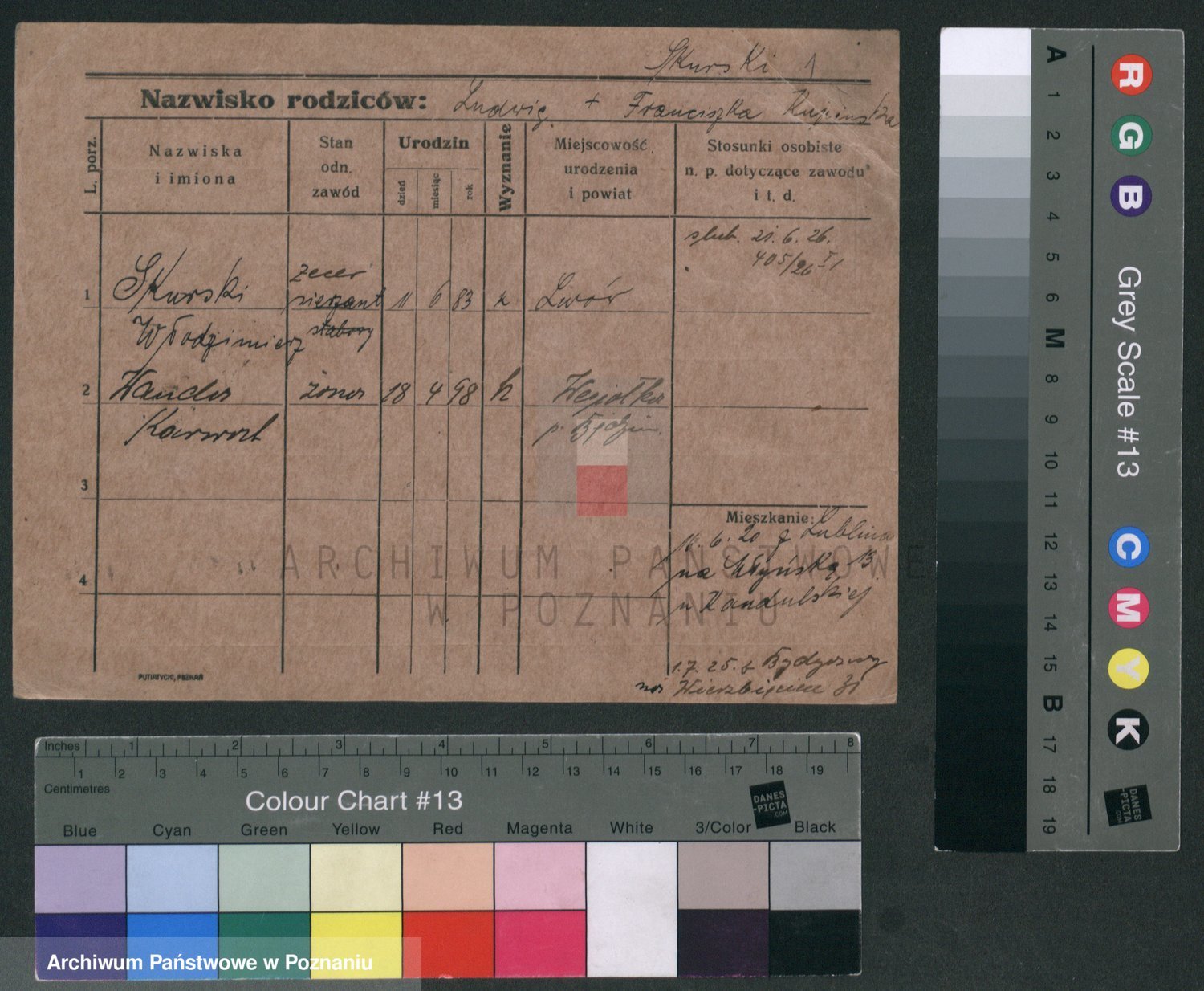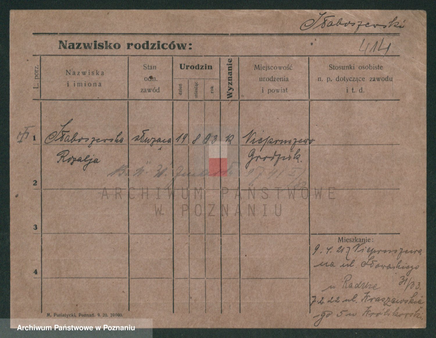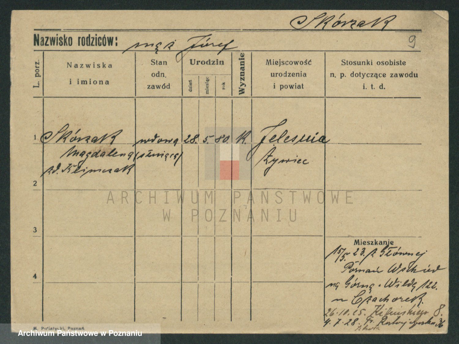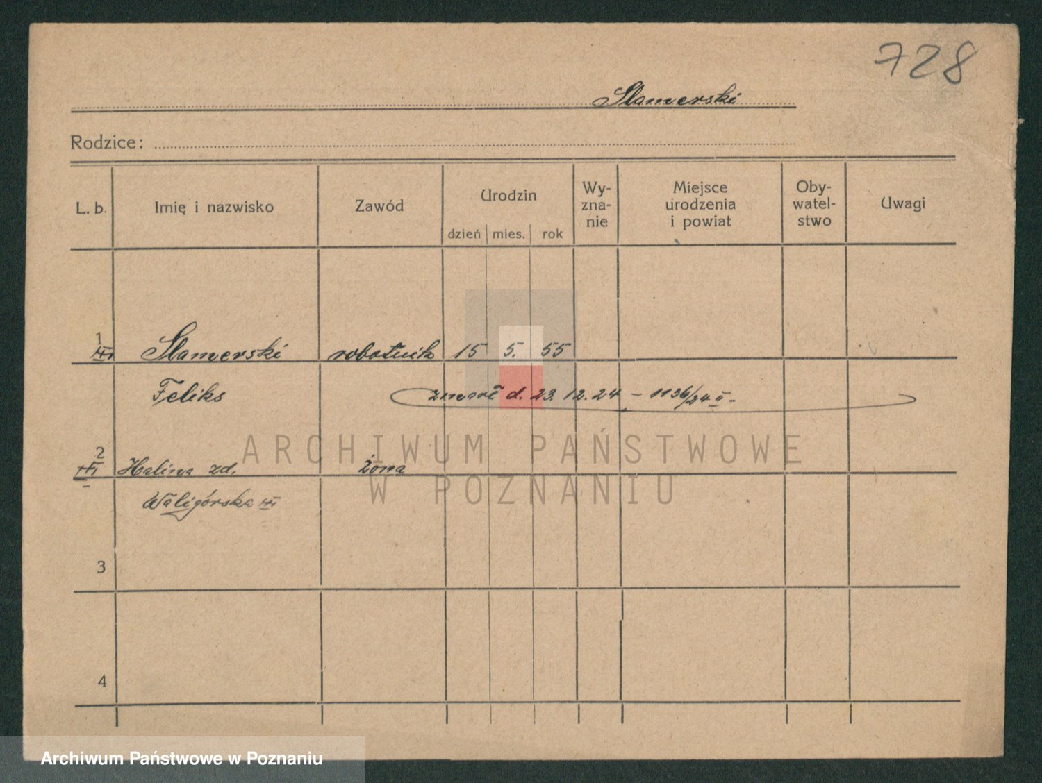 Podgląd karty osobowej dostępny jest po kliknięciu na nazwisko lub ikonkę karty. Można dokonywać powiększenia (ikony na górze) lub przechodzić między kolejnymi skanami (strzałki po bokach).