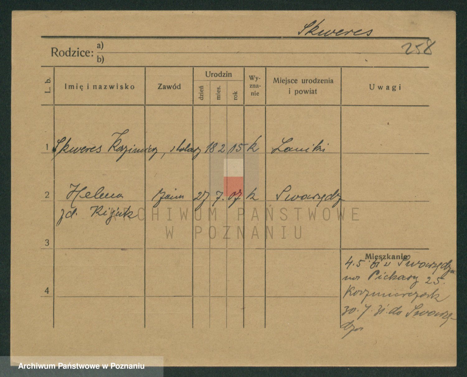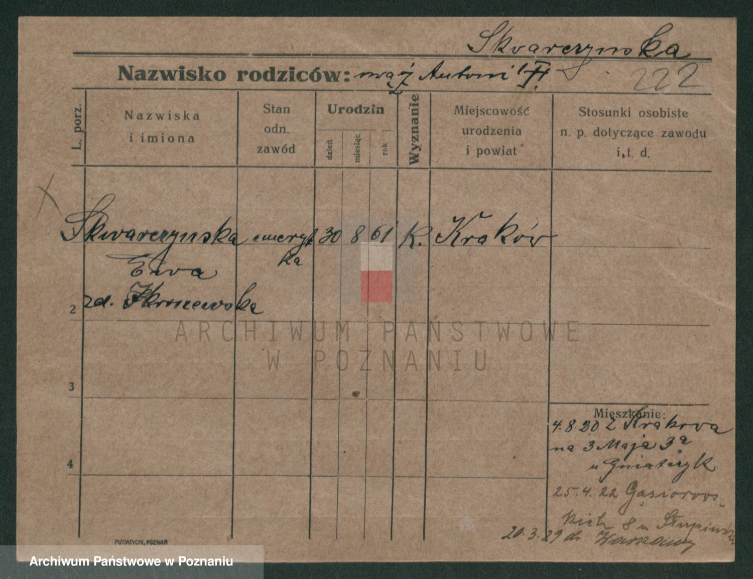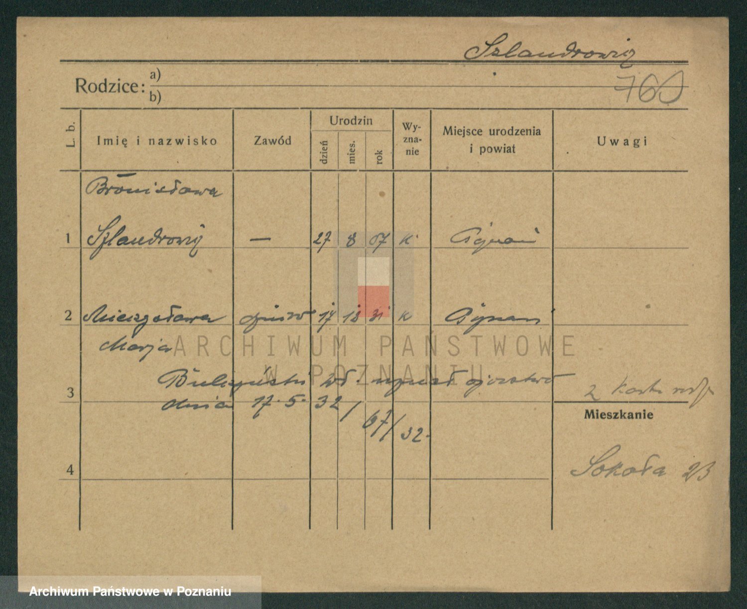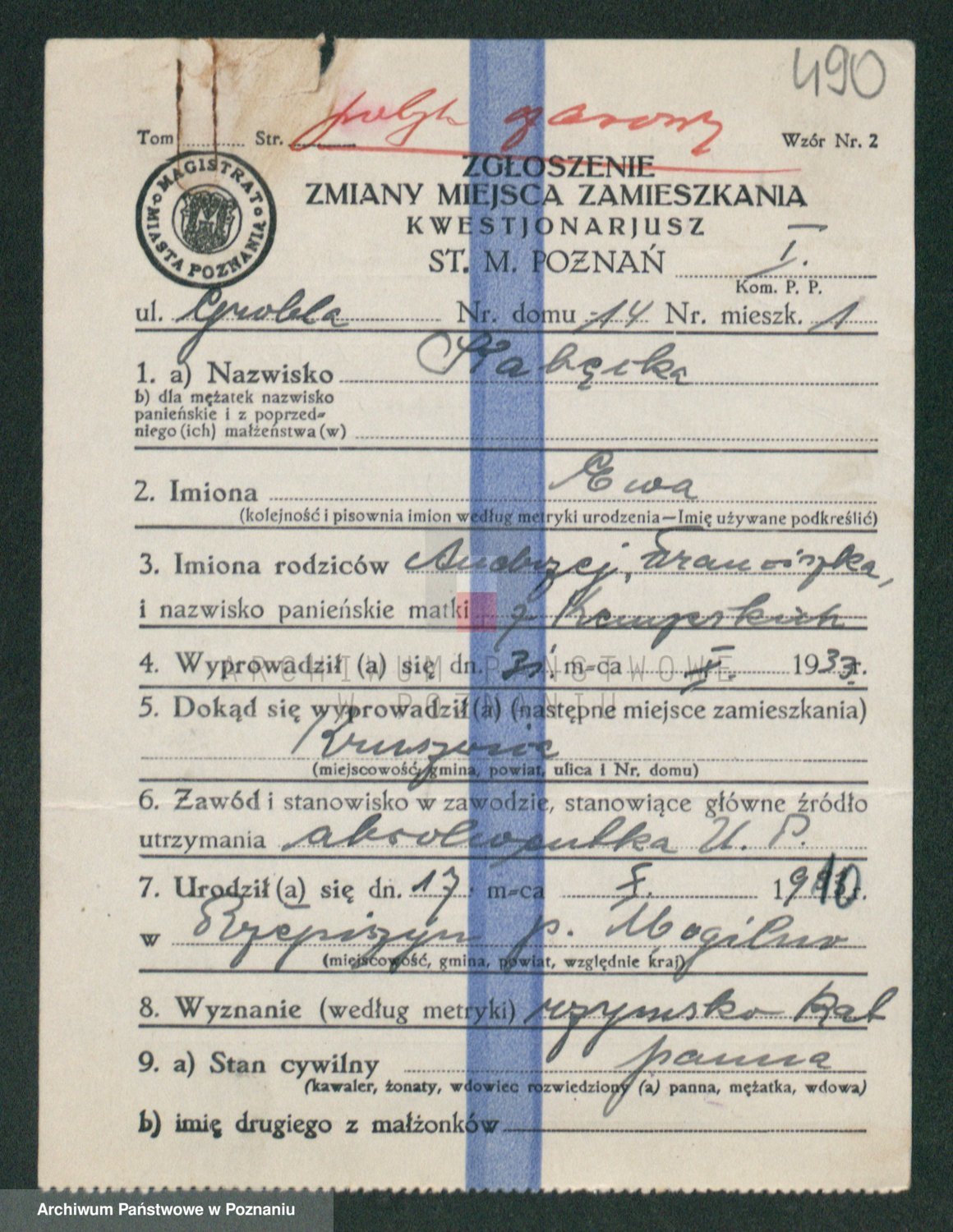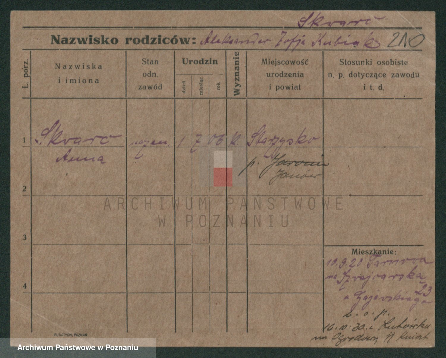 Podgląd karty osobowej dostępny jest po kliknięciu na nazwisko lub ikonkę karty. Można dokonywać powiększenia (ikony na górze) lub przechodzić między kolejnymi skanami (strzałki po bokach).