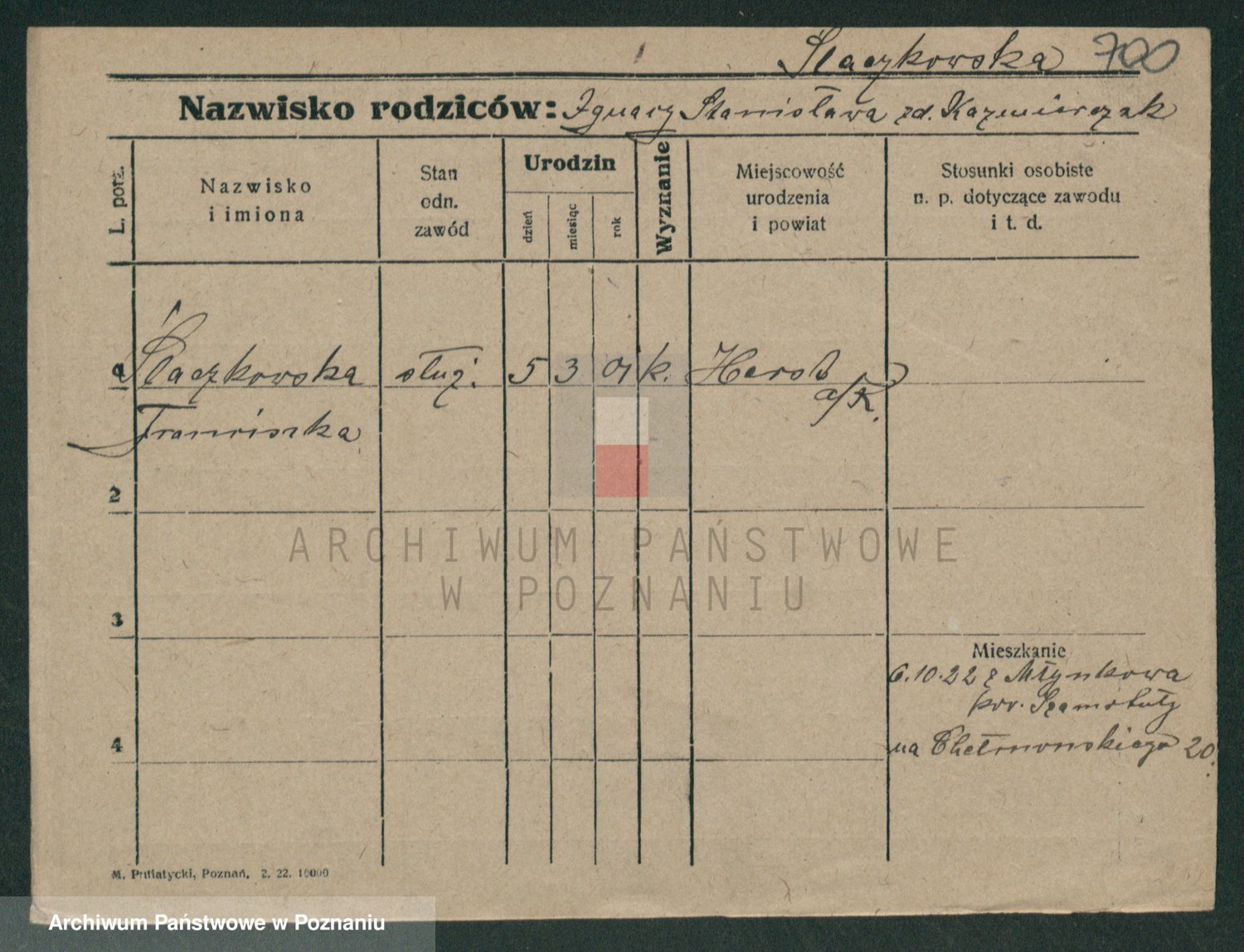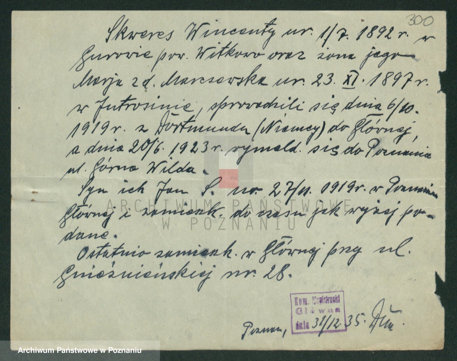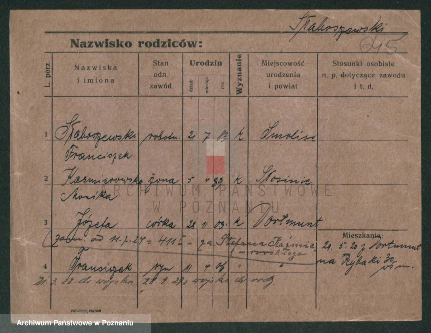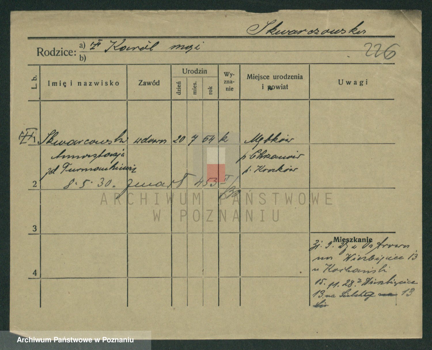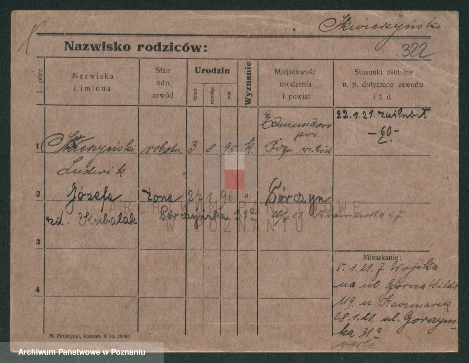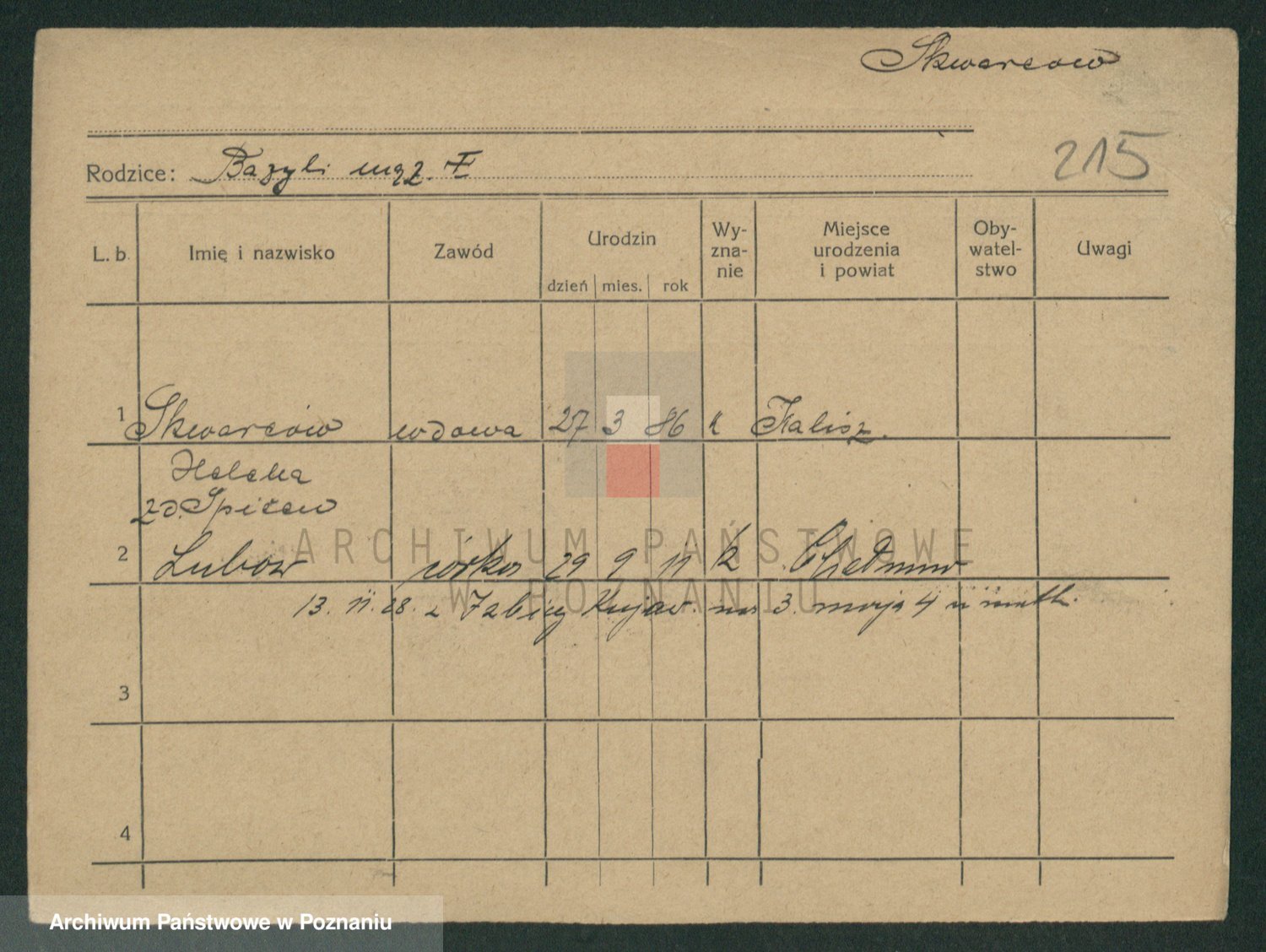 Podgląd karty osobowej dostępny jest po kliknięciu na nazwisko lub ikonkę karty. Można dokonywać powiększenia (ikony na górze) lub przechodzić między kolejnymi skanami (strzałki po bokach).