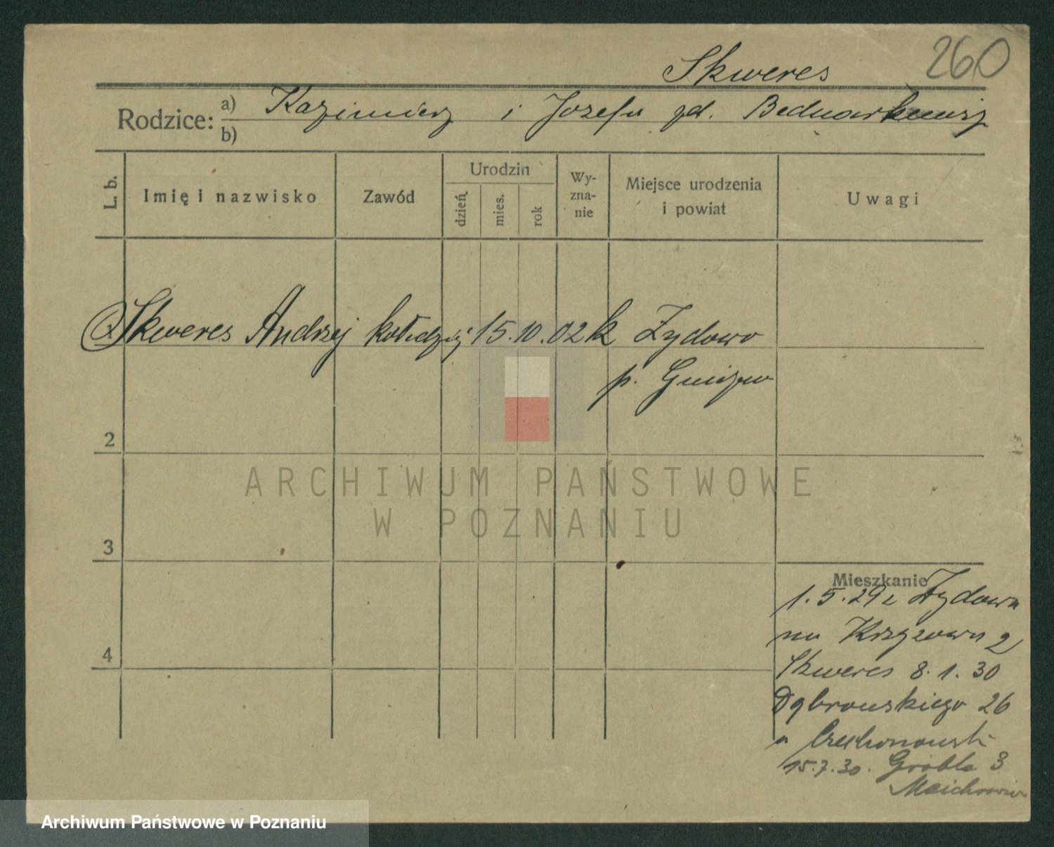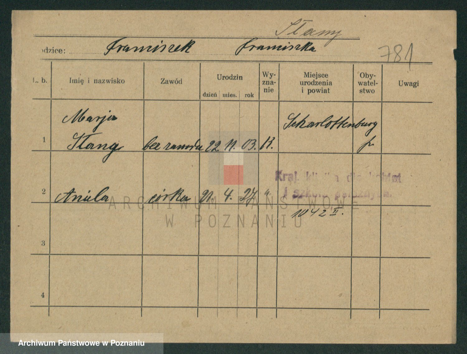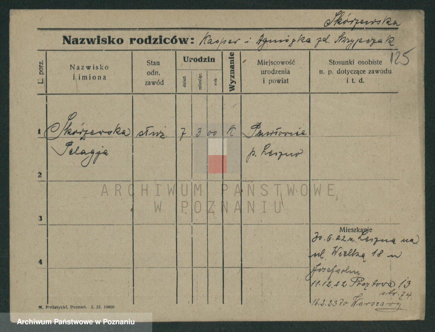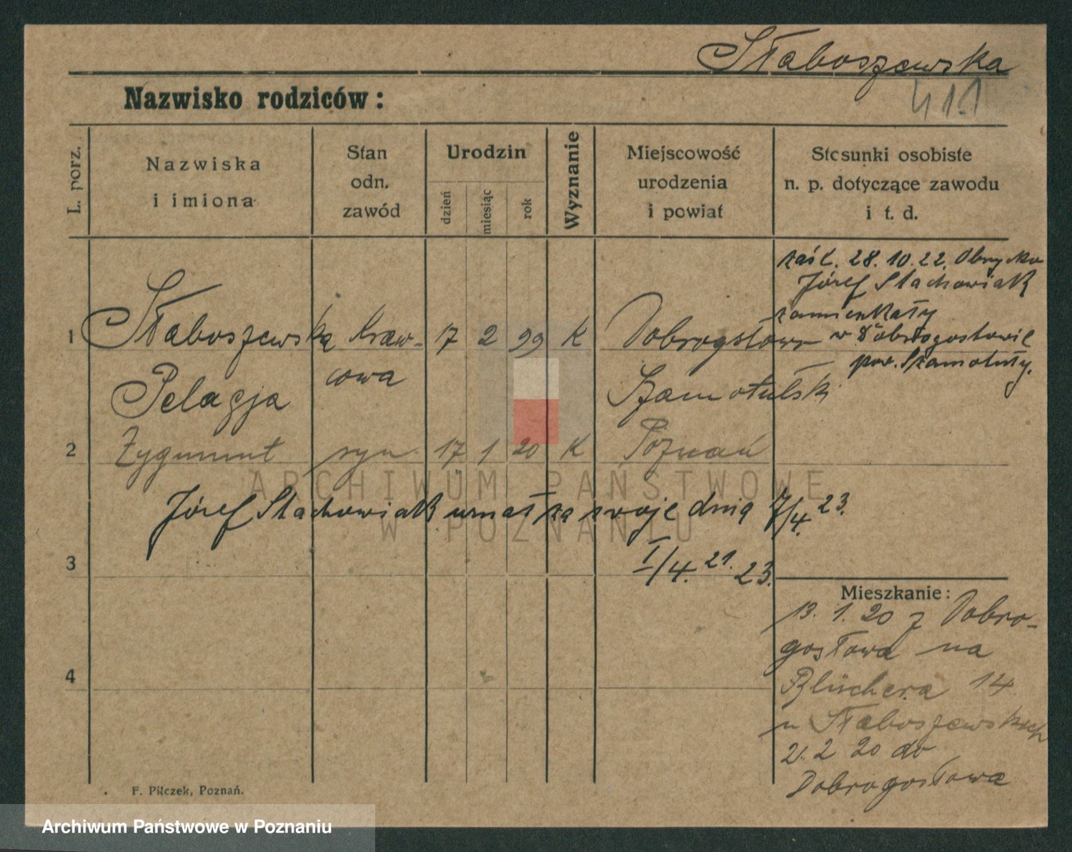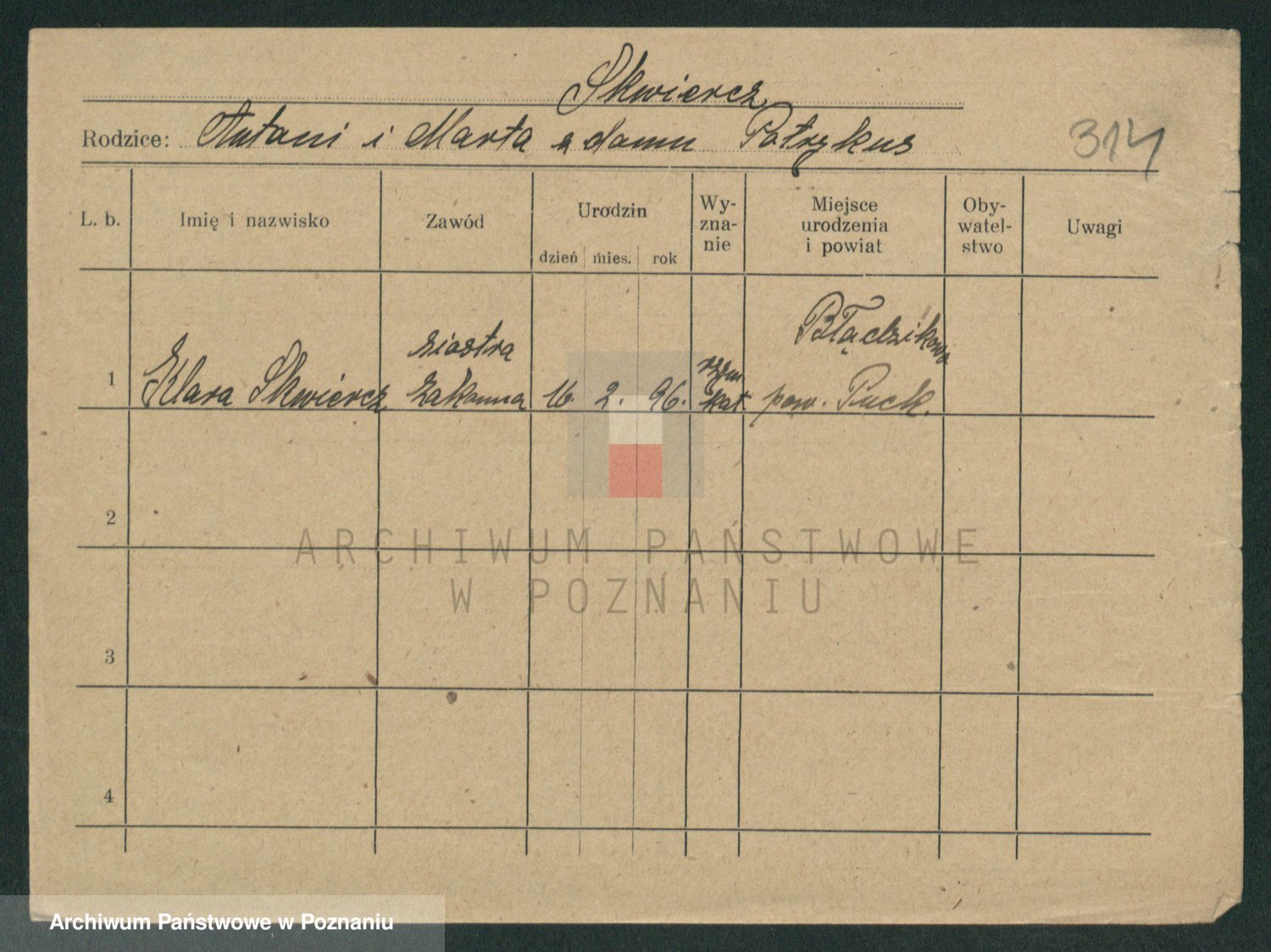 Podgląd karty osobowej dostępny jest po kliknięciu na nazwisko lub ikonkę karty. Można dokonywać powiększenia (ikony na górze) lub przechodzić między kolejnymi skanami (strzałki po bokach).