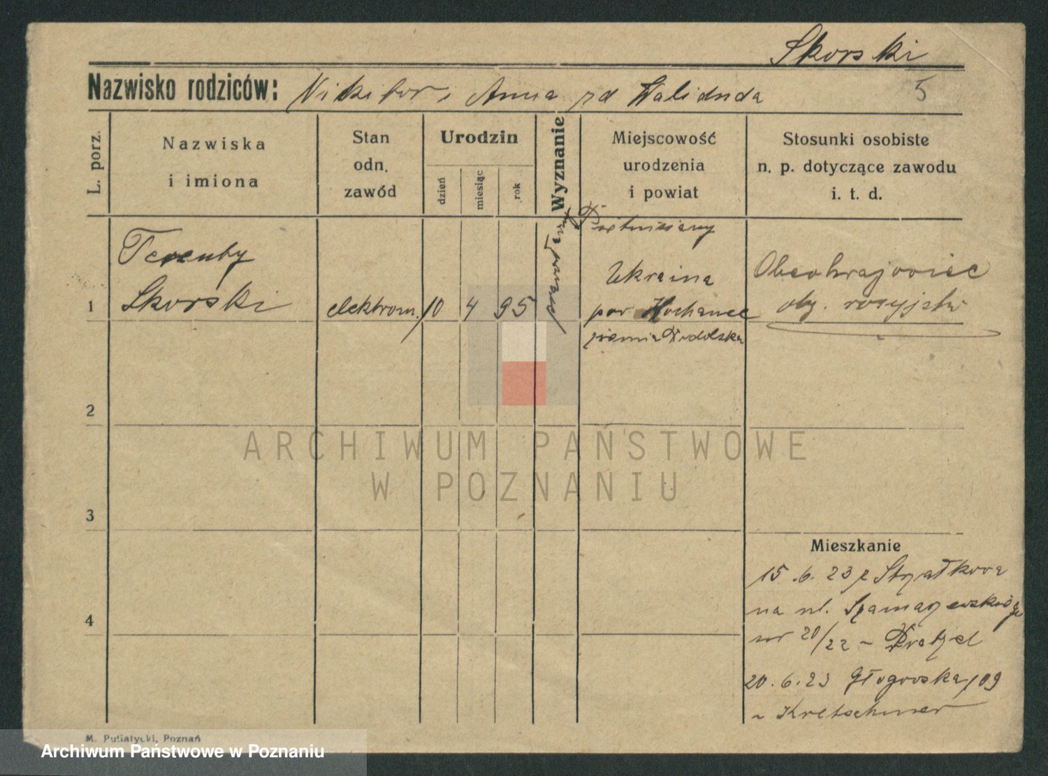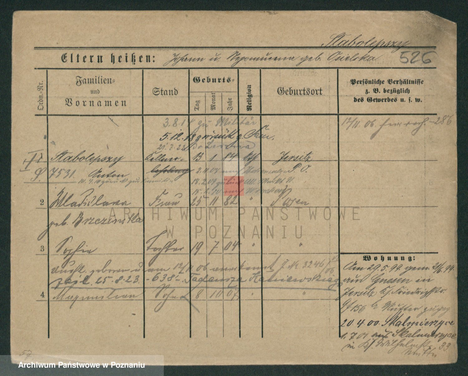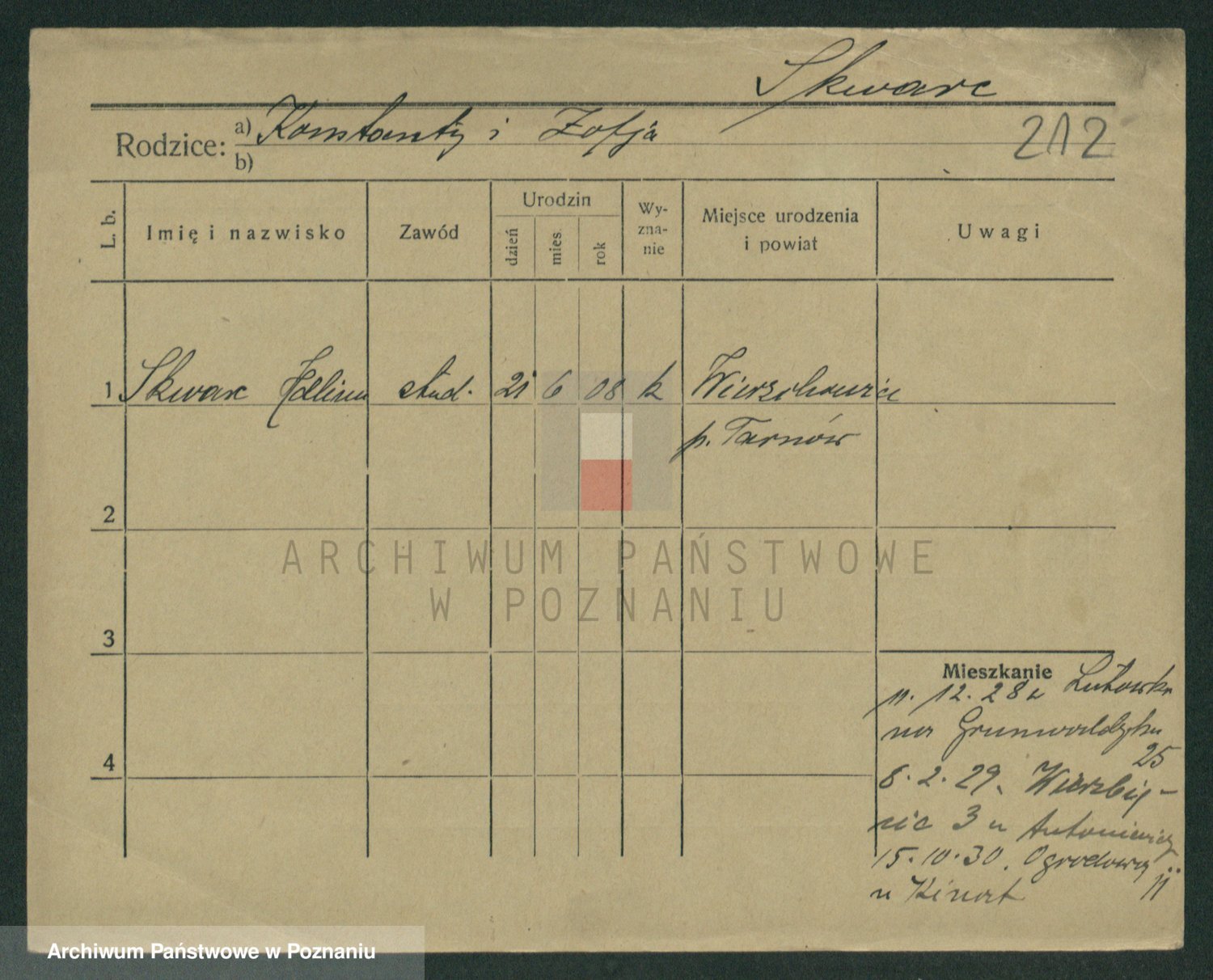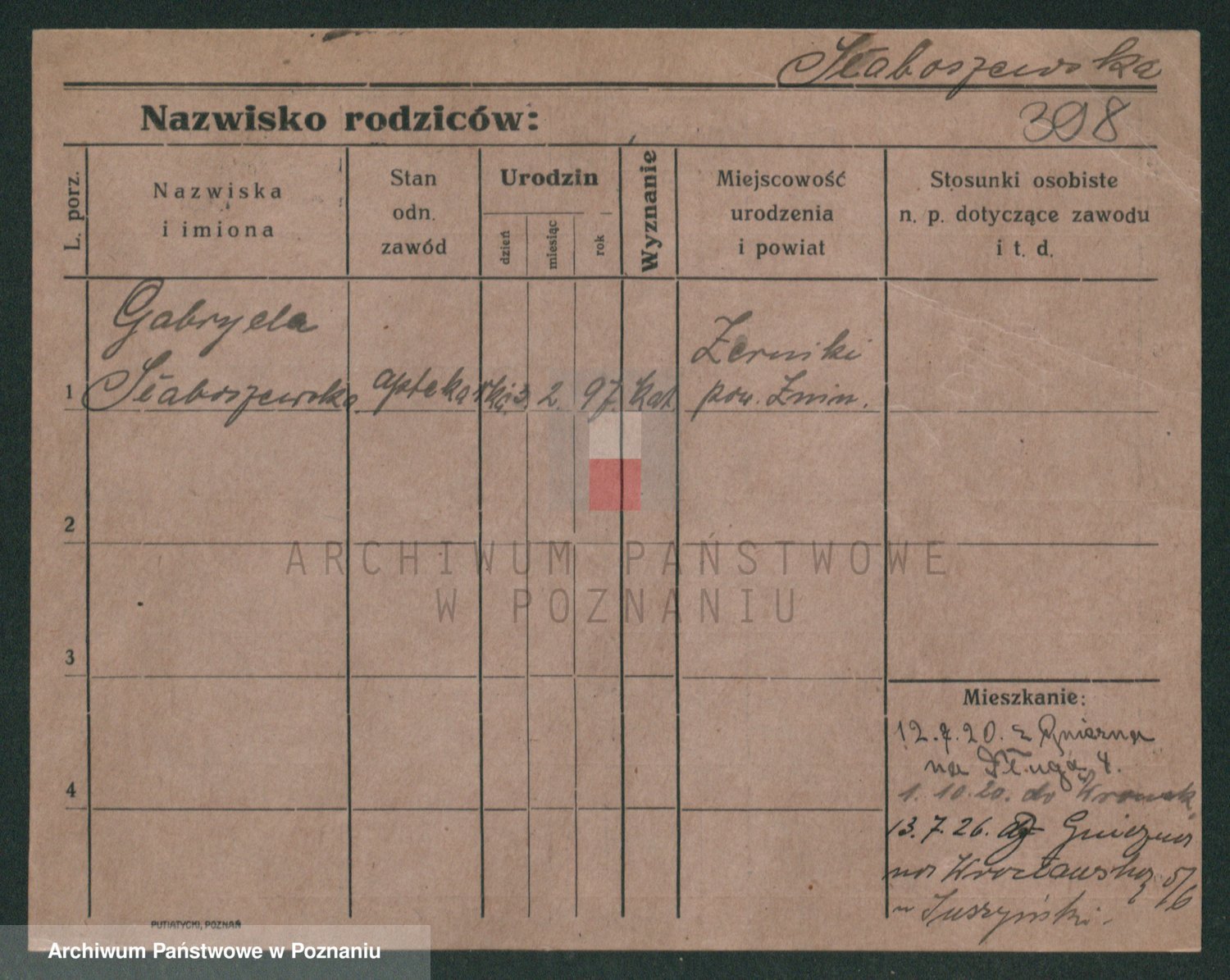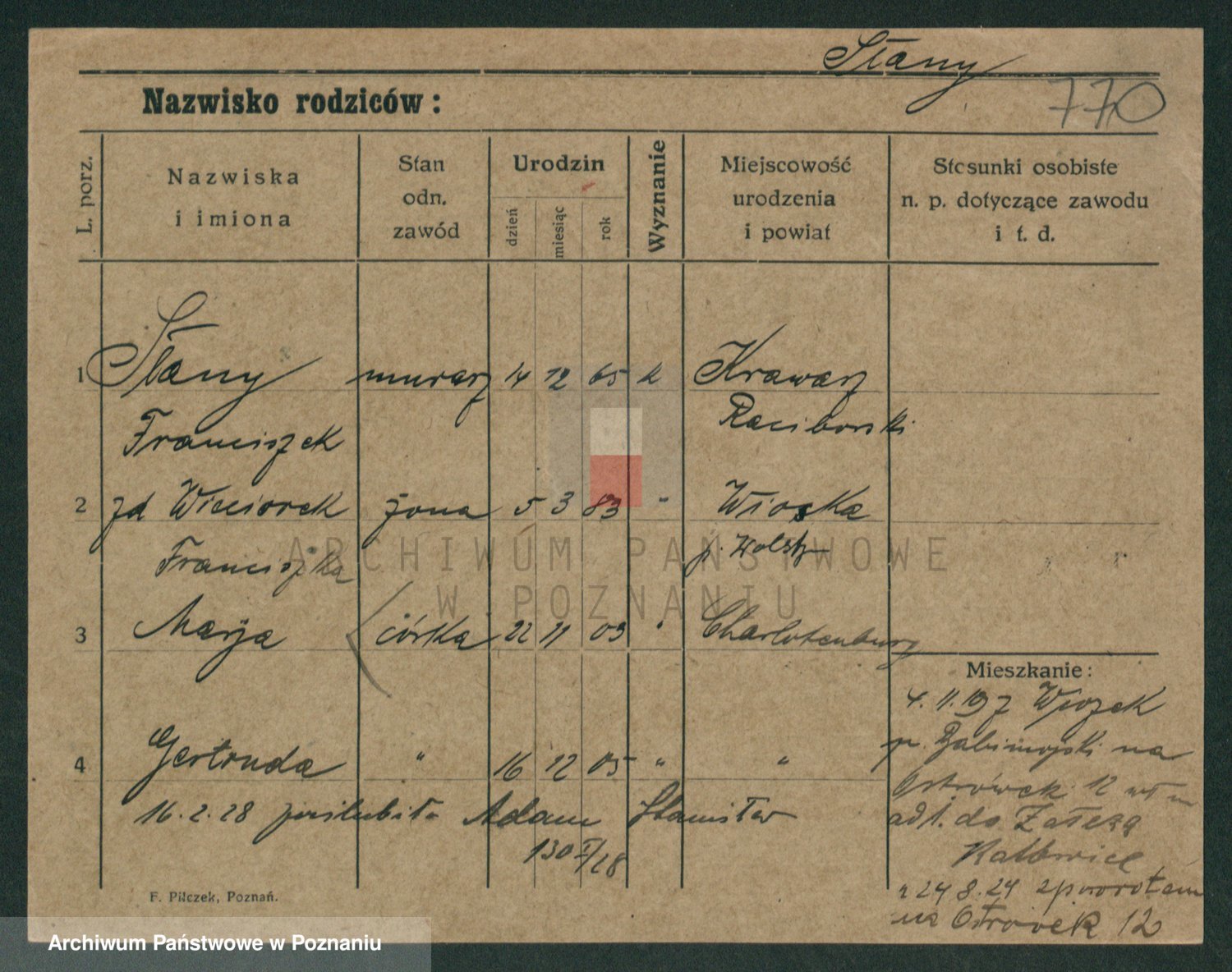 Podgląd karty osobowej dostępny jest po kliknięciu na nazwisko lub ikonkę karty. Można dokonywać powiększenia (ikony na górze) lub przechodzić między kolejnymi skanami (strzałki po bokach).