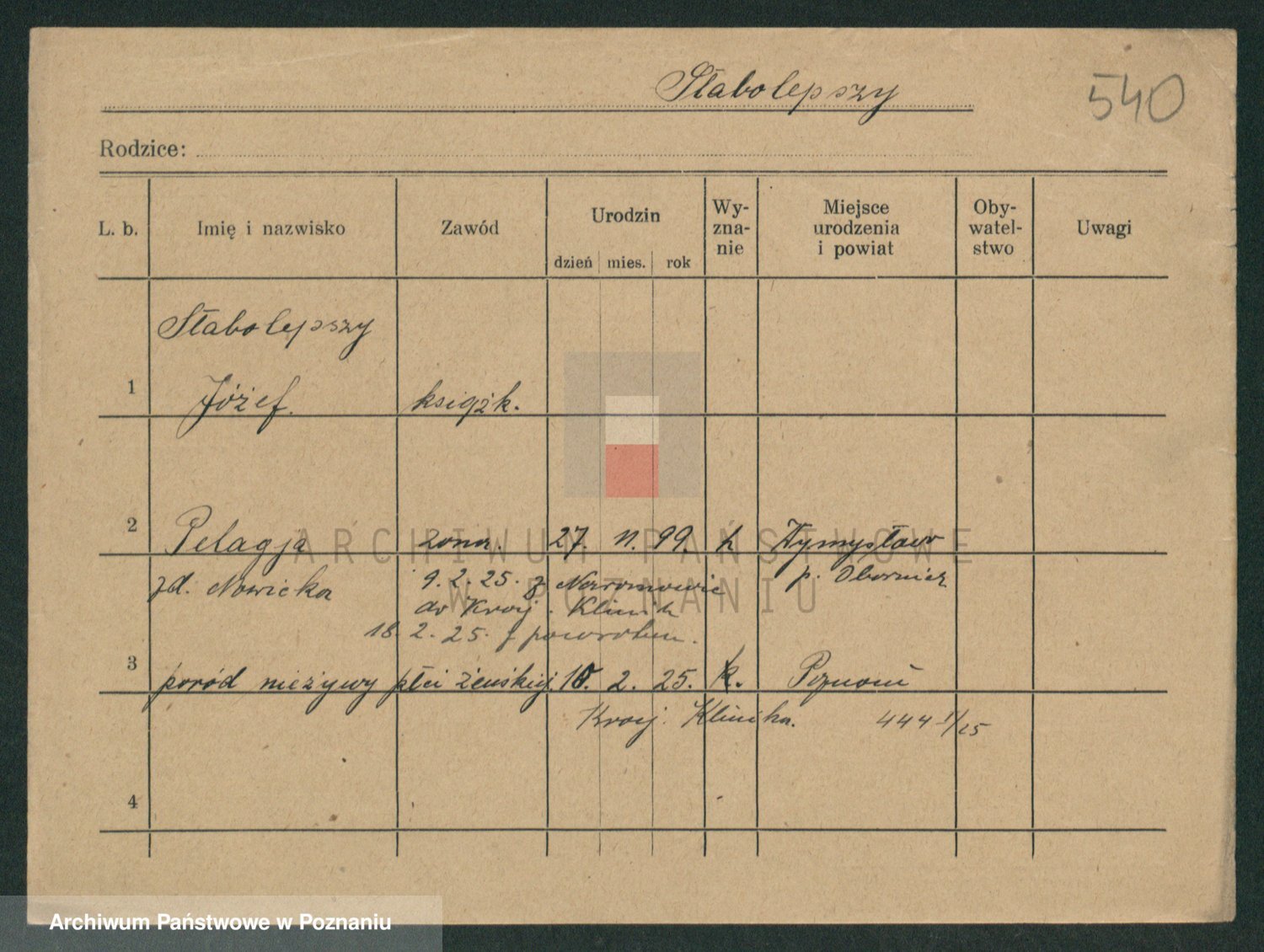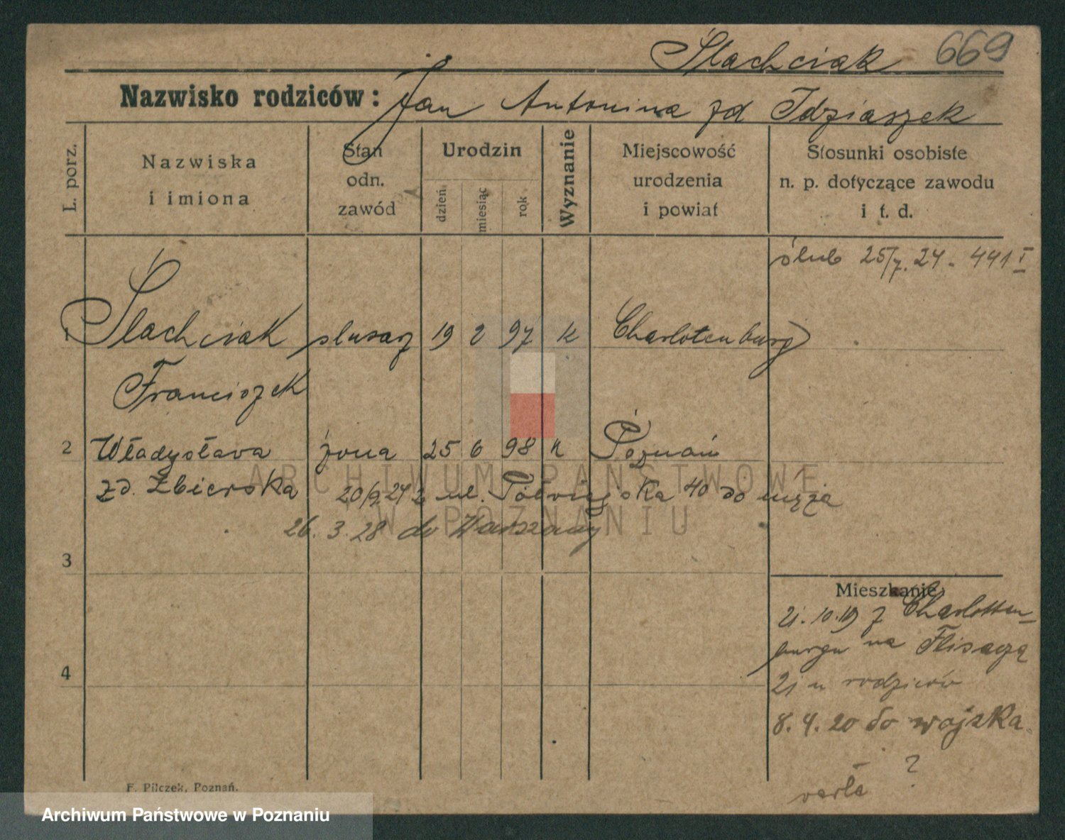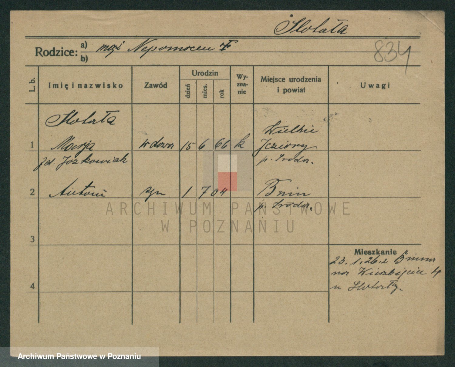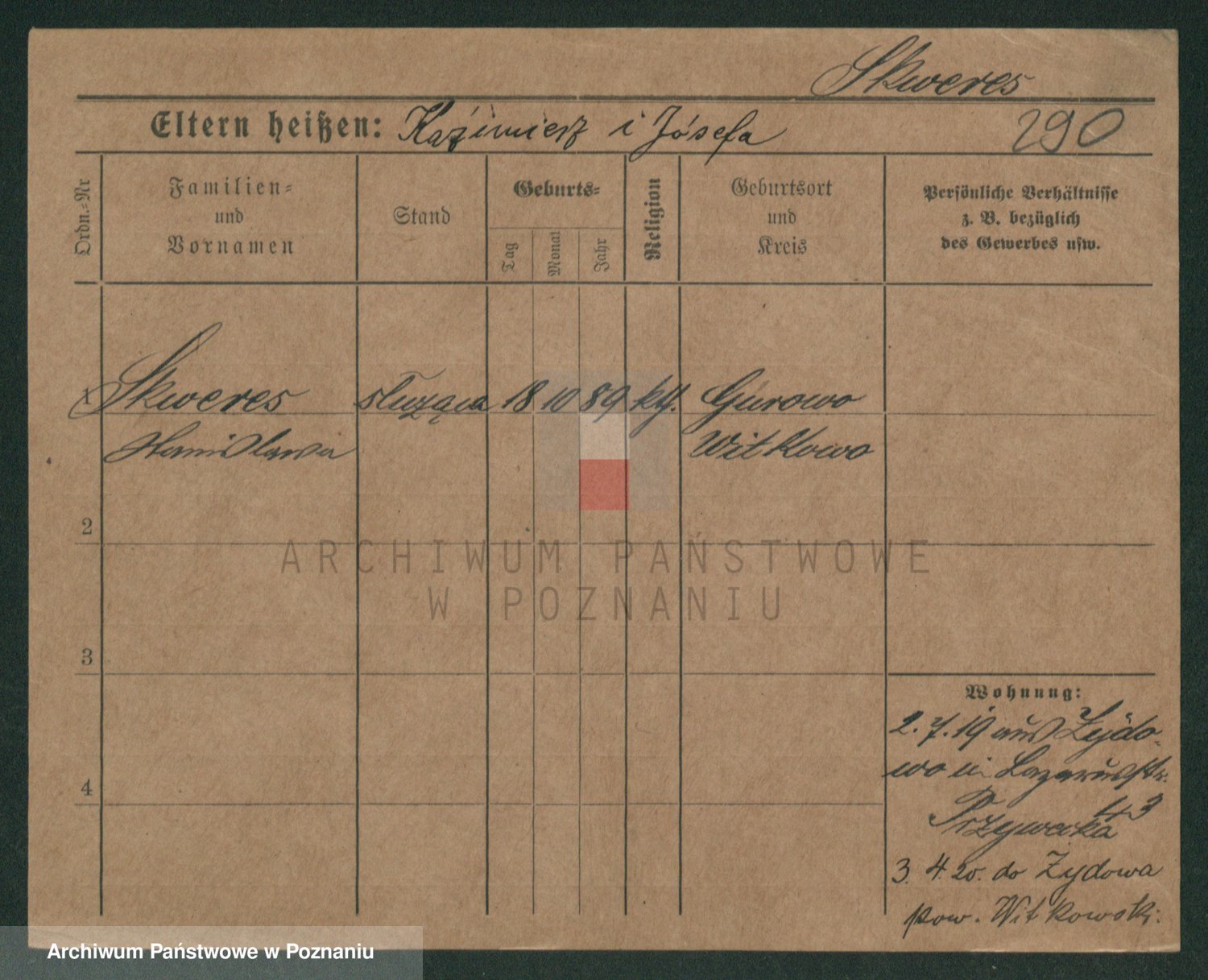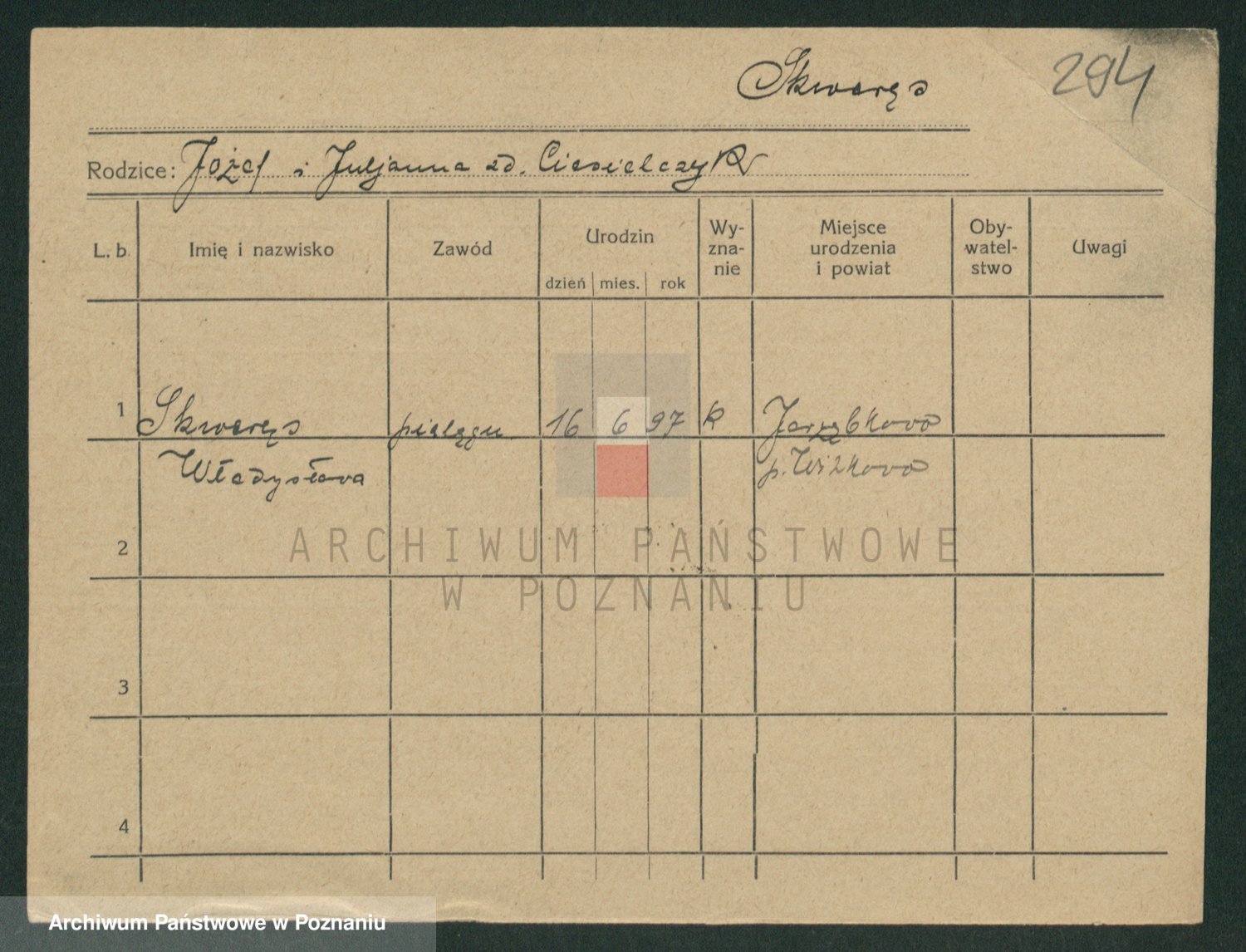 Podgląd karty osobowej dostępny jest po kliknięciu na nazwisko lub ikonkę karty. Można dokonywać powiększenia (ikony na górze) lub przechodzić między kolejnymi skanami (strzałki po bokach).