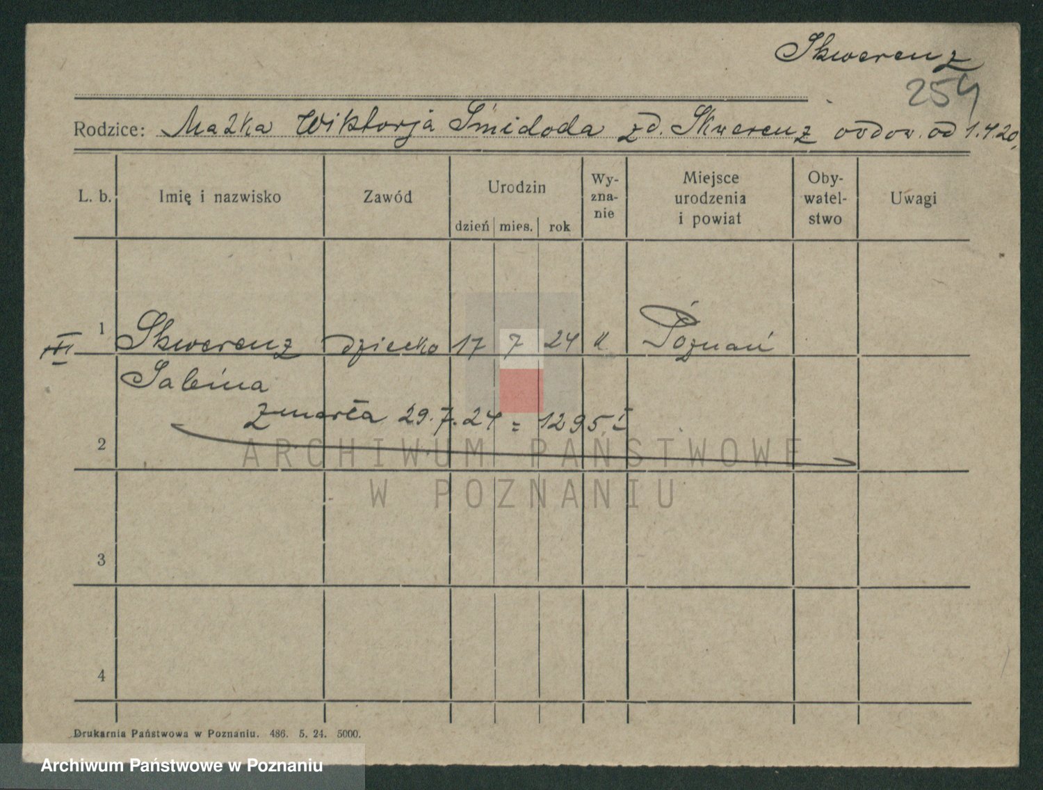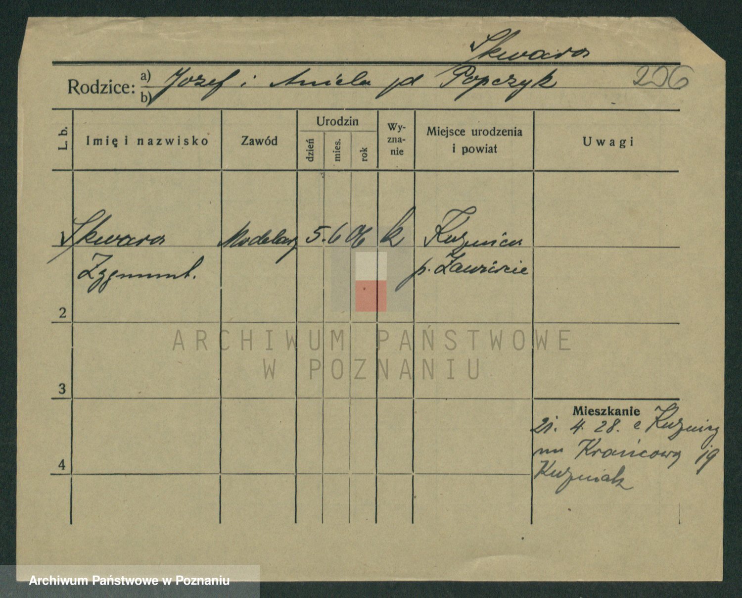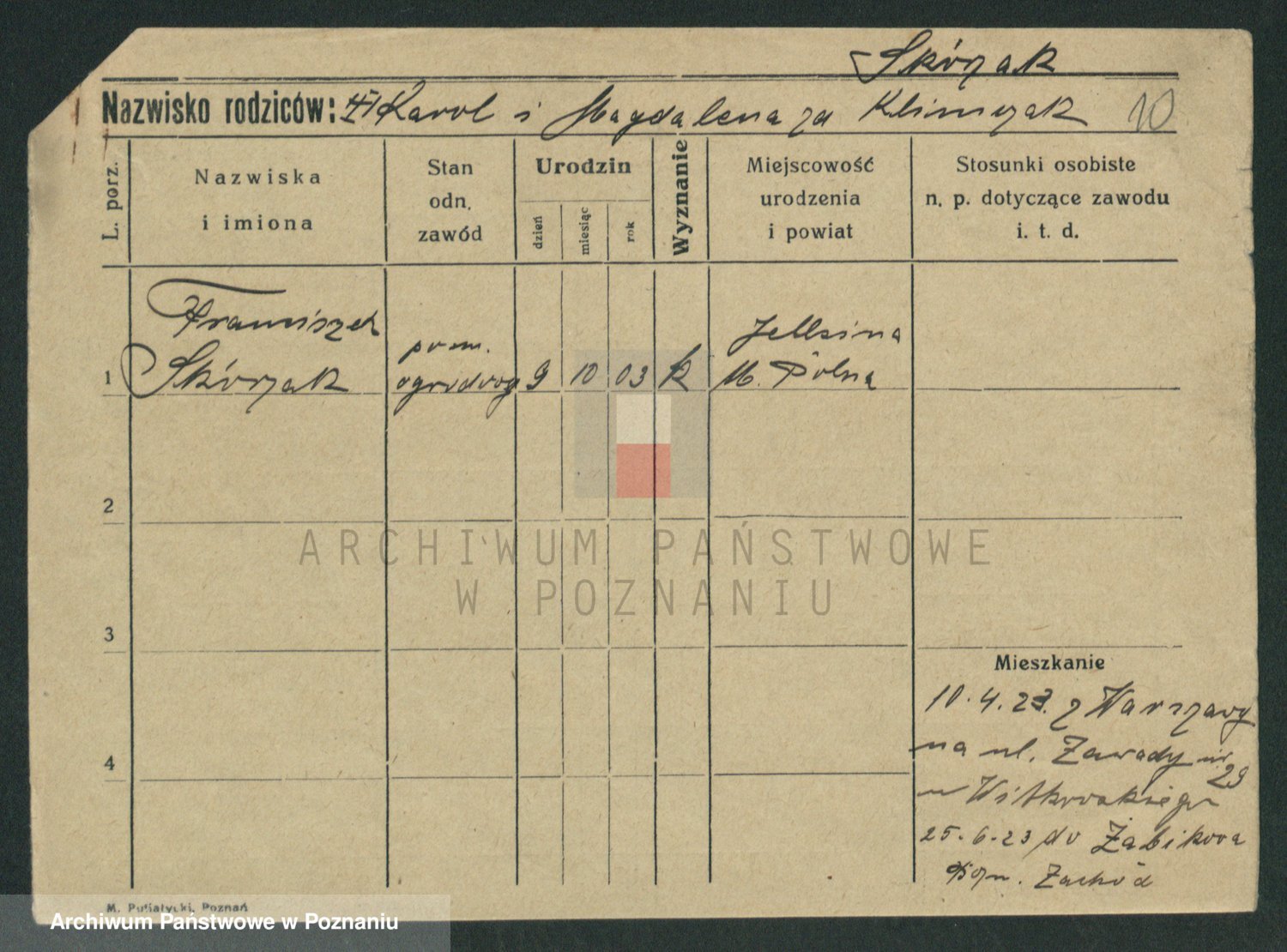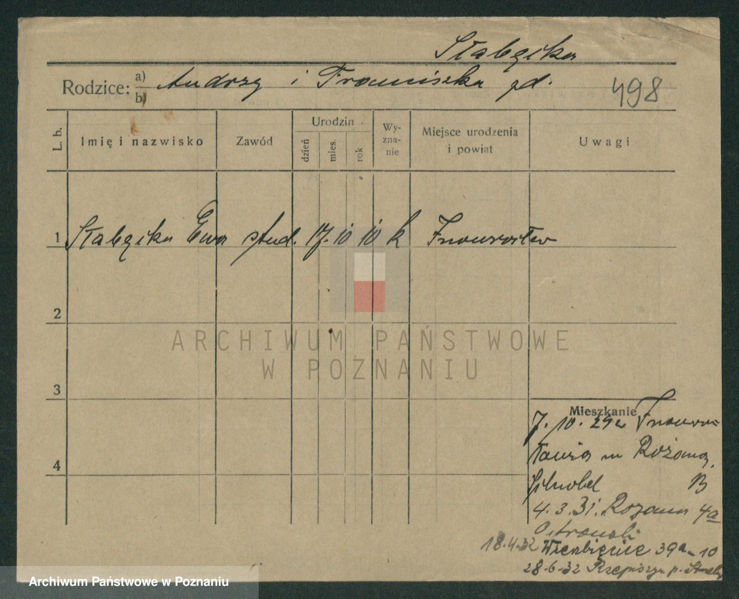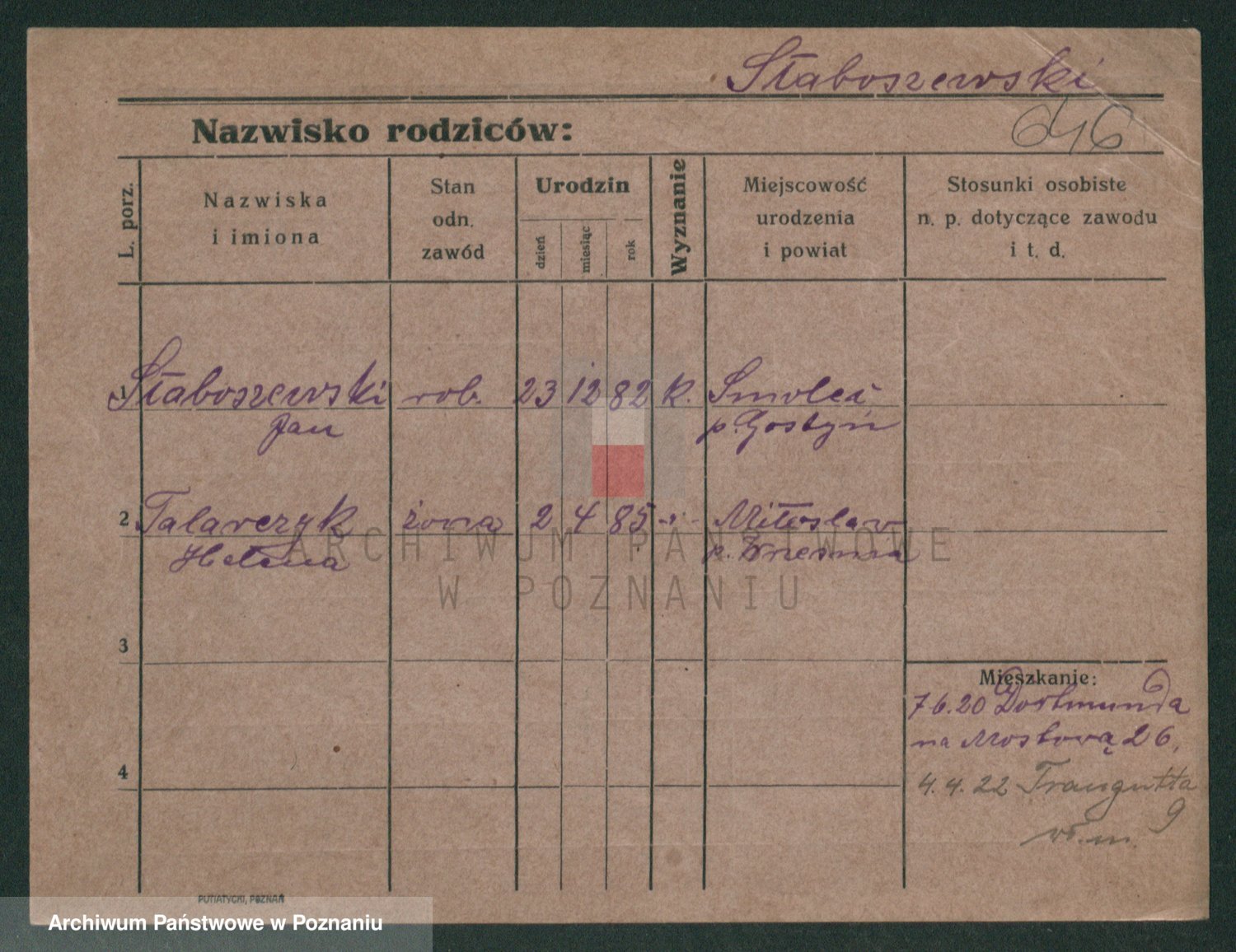 Podgląd karty osobowej dostępny jest po kliknięciu na nazwisko lub ikonkę karty. Można dokonywać powiększenia (ikony na górze) lub przechodzić między kolejnymi skanami (strzałki po bokach).