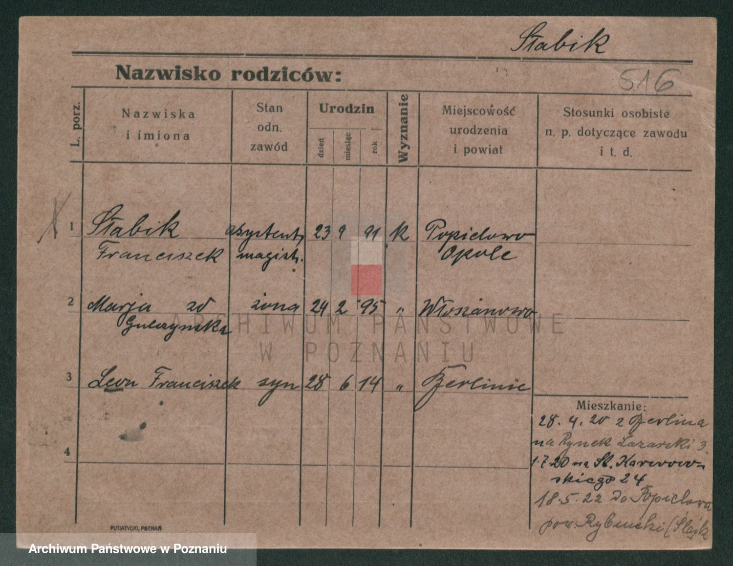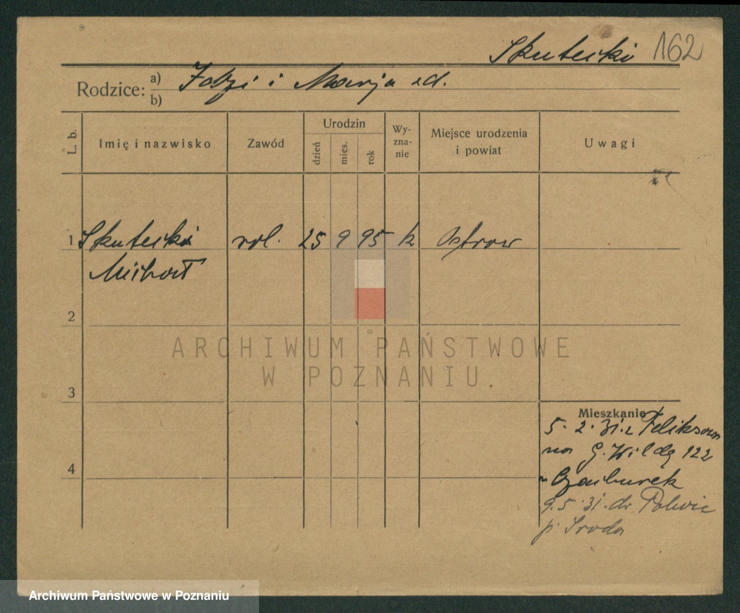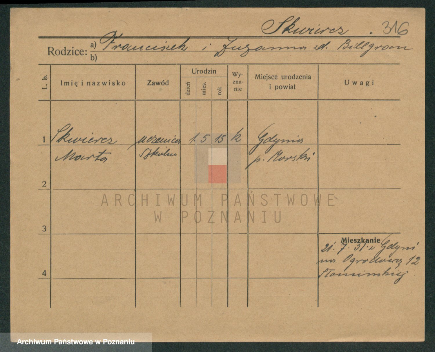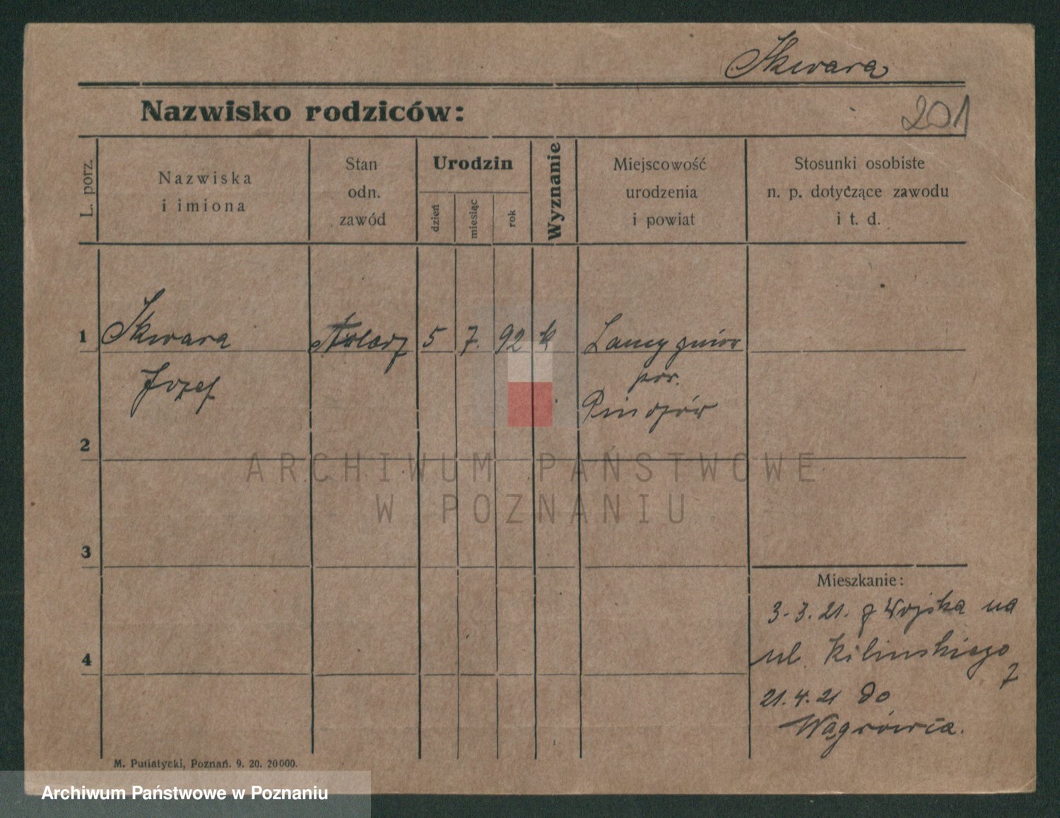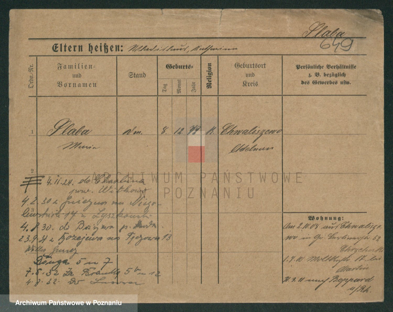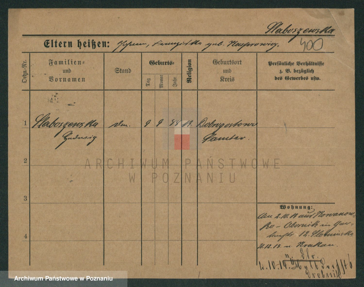 Podgląd karty osobowej dostępny jest po kliknięciu na nazwisko lub ikonkę karty. Można dokonywać powiększenia (ikony na górze) lub przechodzić między kolejnymi skanami (strzałki po bokach).