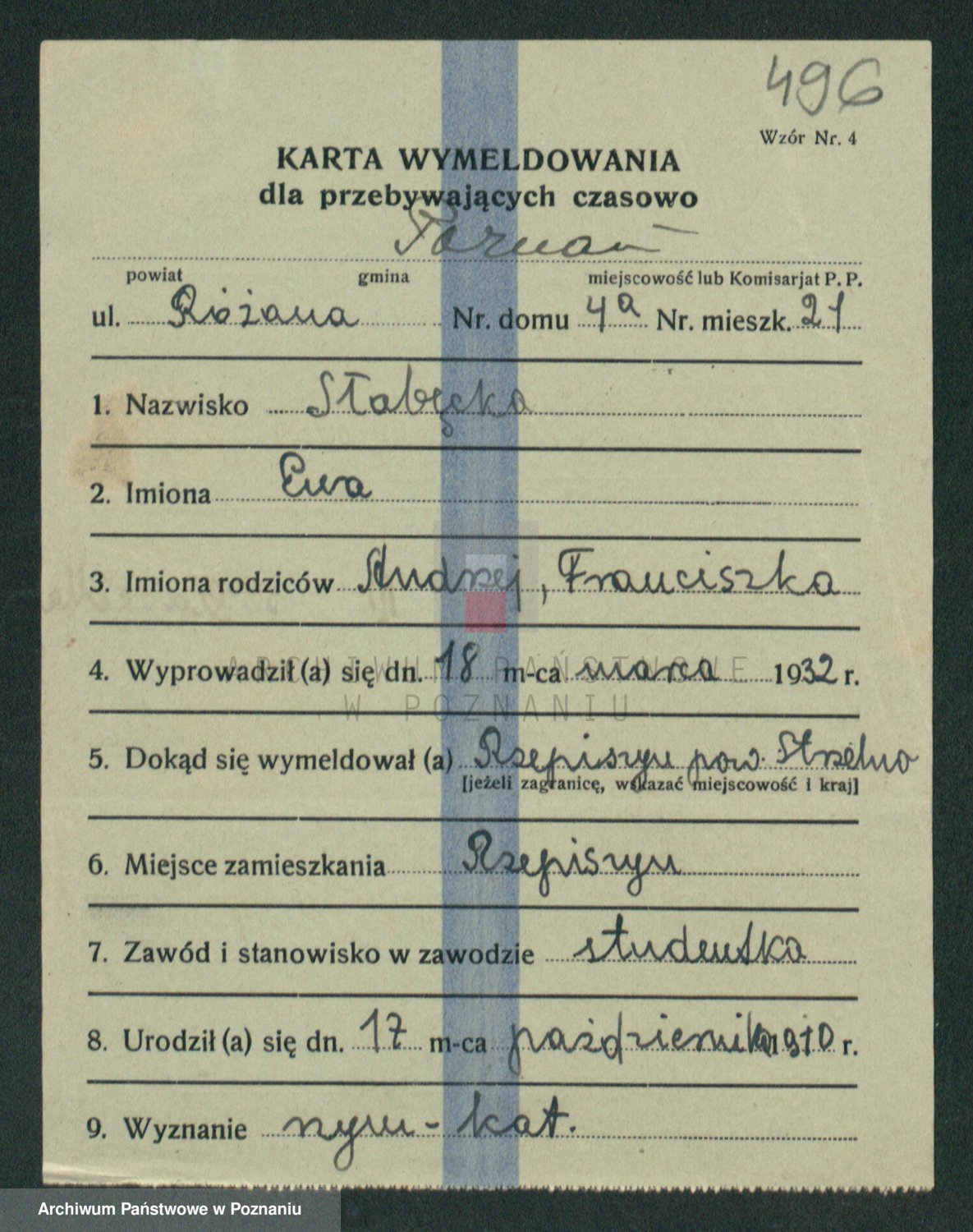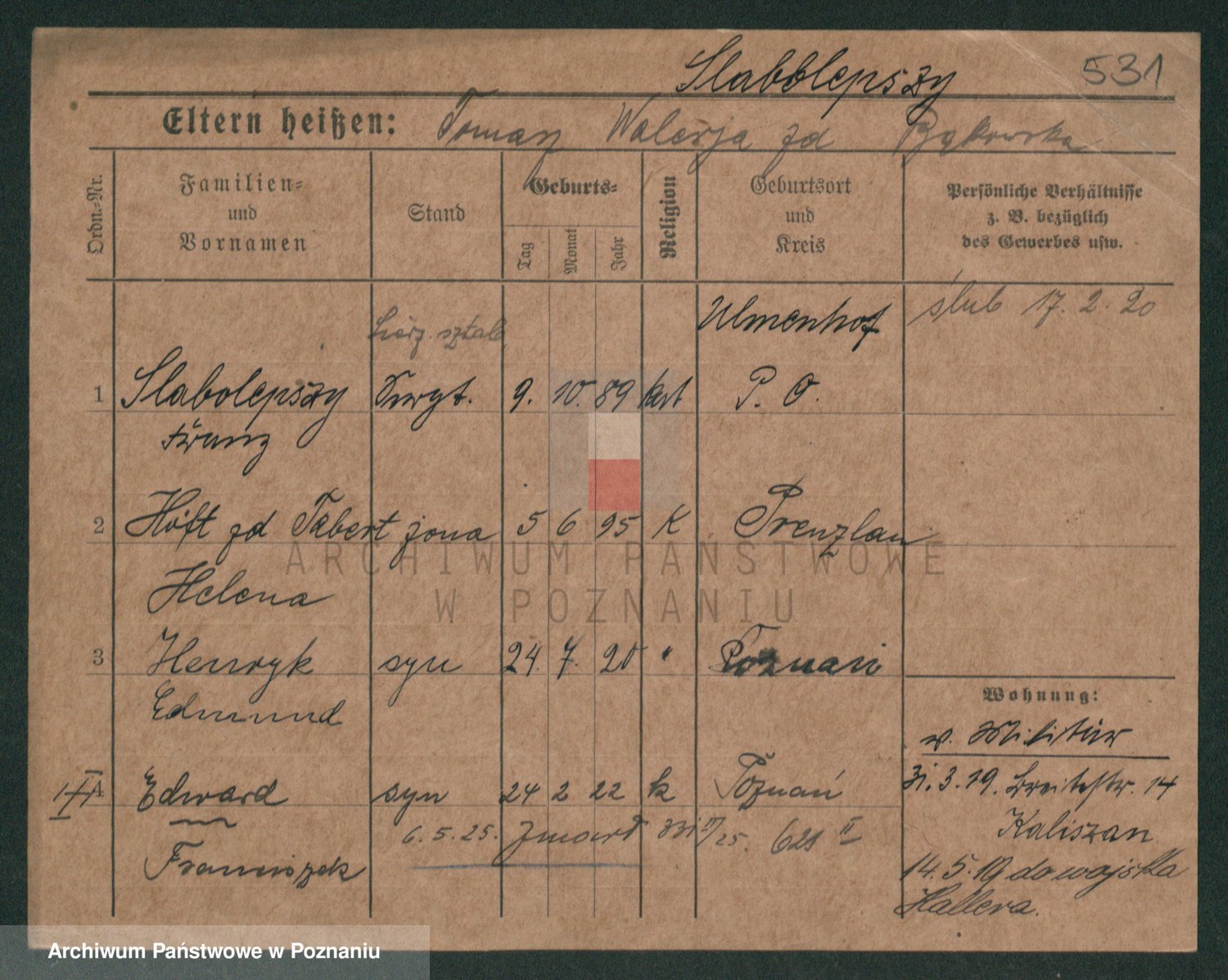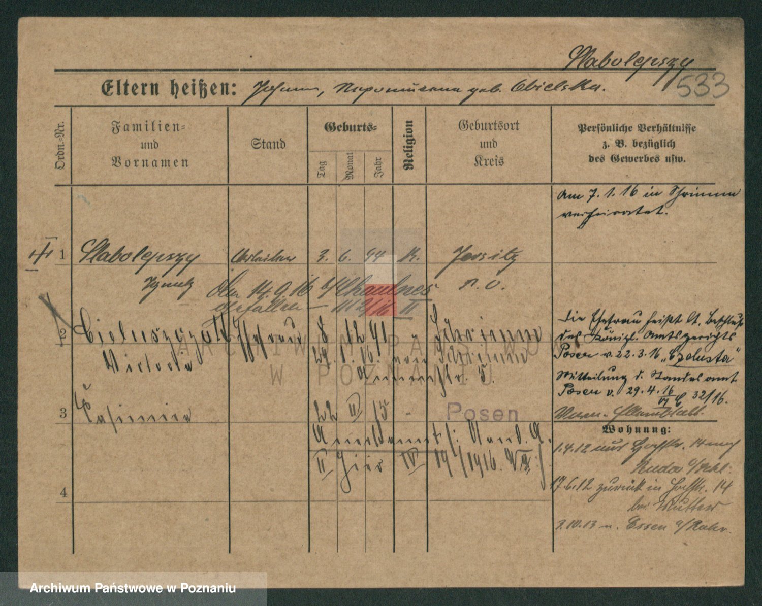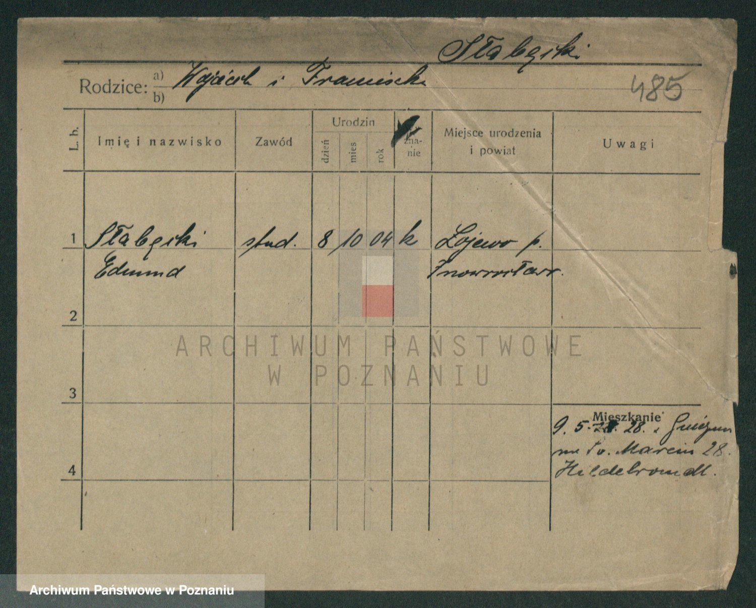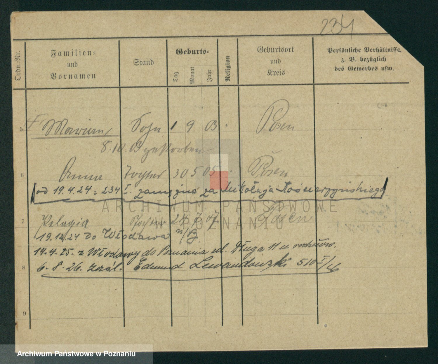 Podgląd karty osobowej dostępny jest po kliknięciu na nazwisko lub ikonkę karty. Można dokonywać powiększenia (ikony na górze) lub przechodzić między kolejnymi skanami (strzałki po bokach).