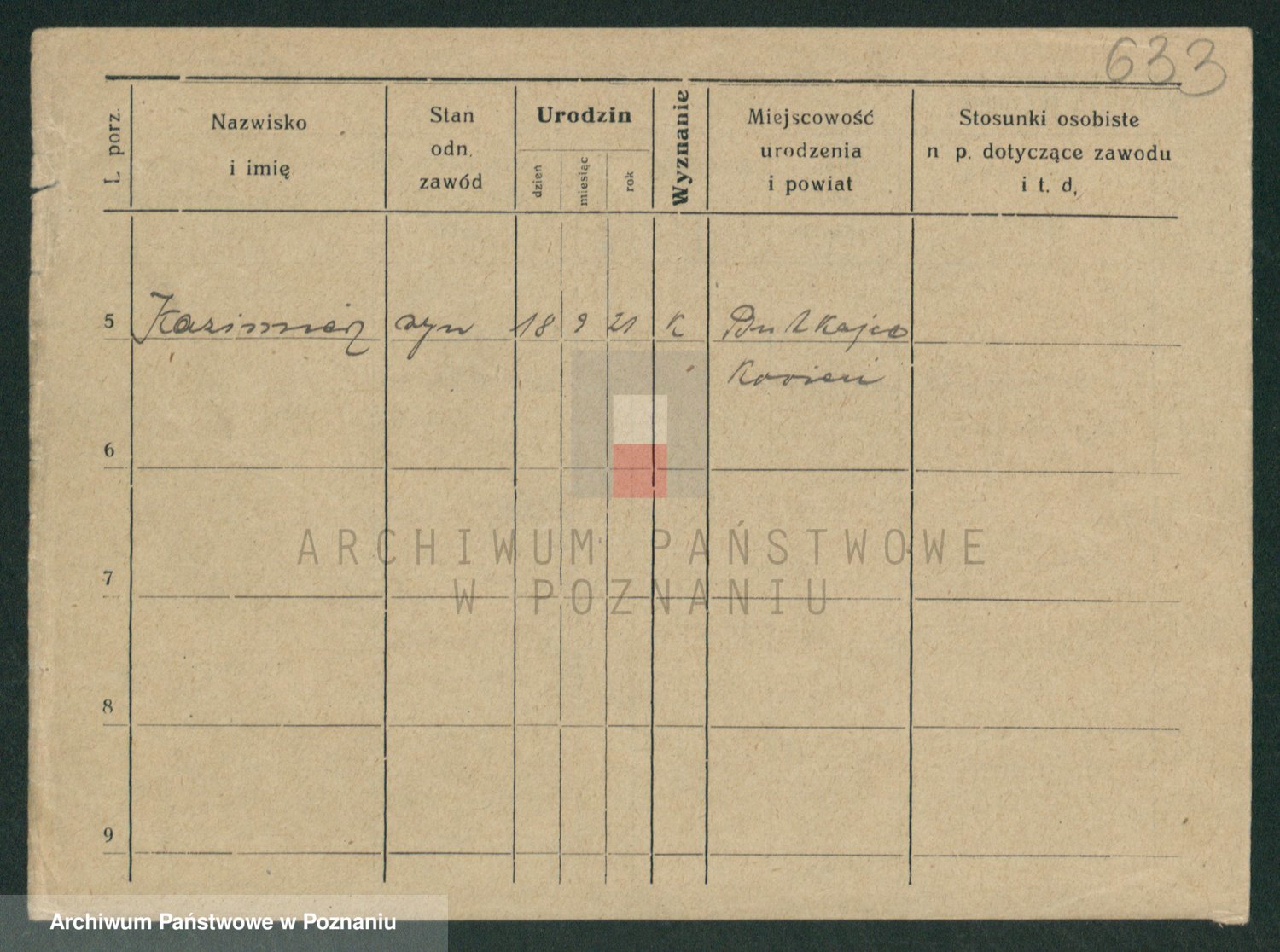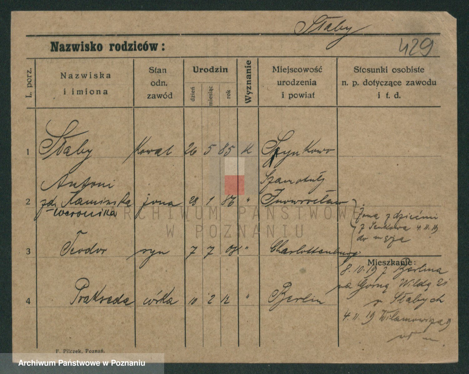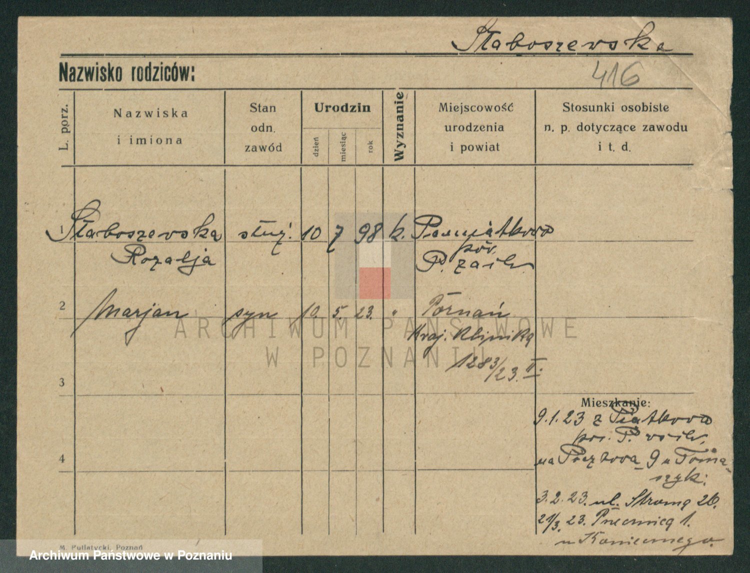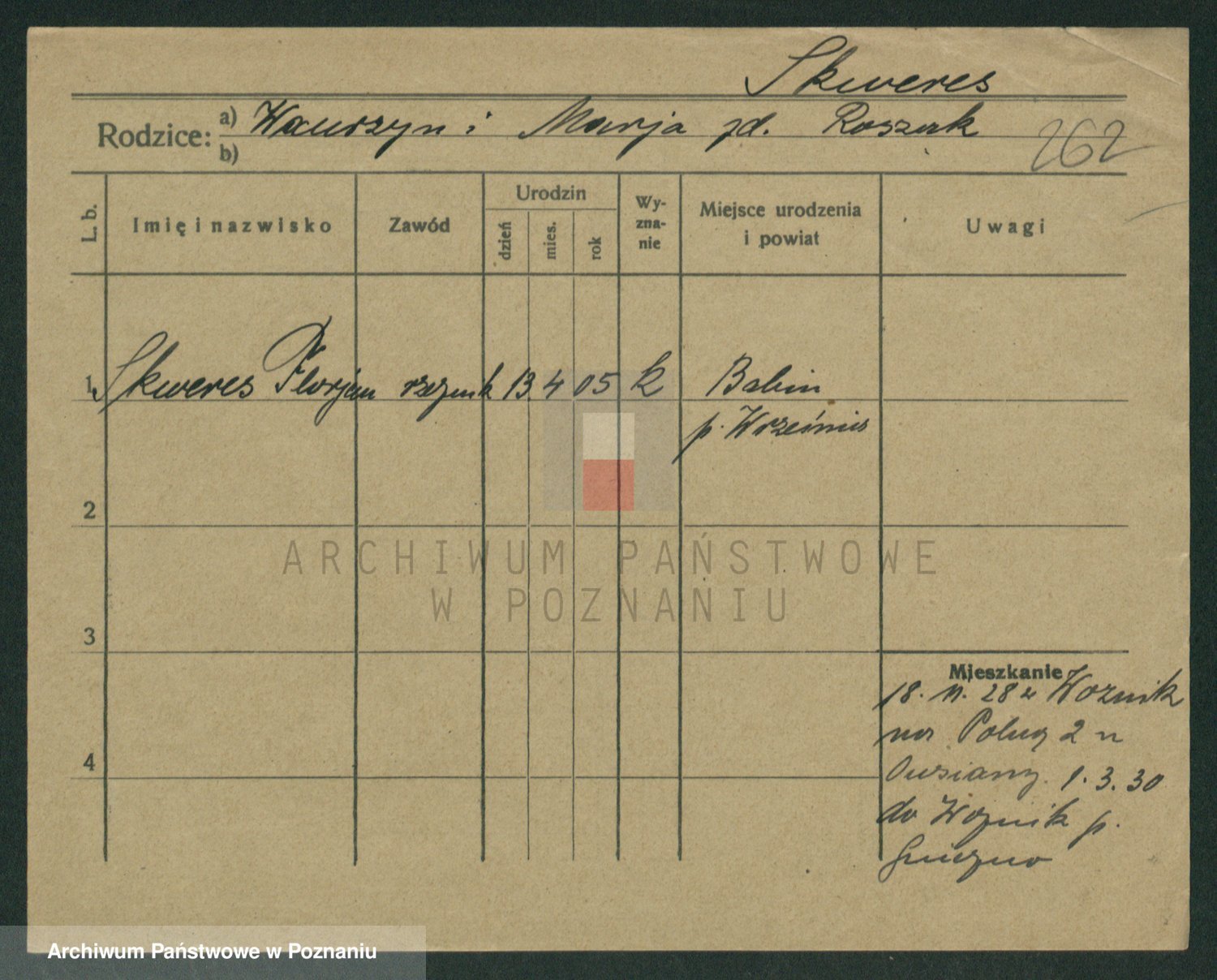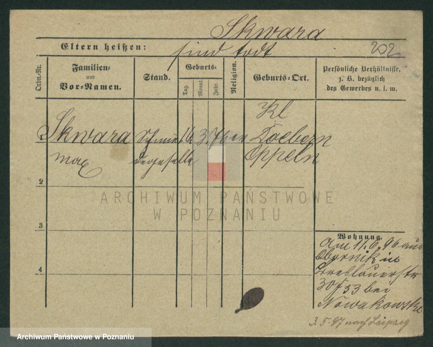 Podgląd karty osobowej dostępny jest po kliknięciu na nazwisko lub ikonkę karty. Można dokonywać powiększenia (ikony na górze) lub przechodzić między kolejnymi skanami (strzałki po bokach).