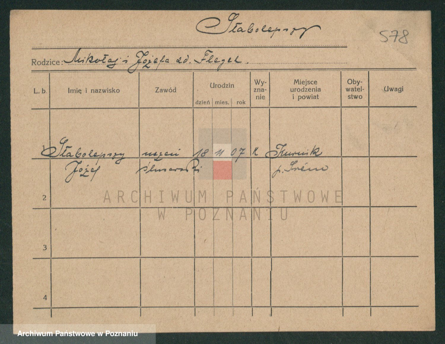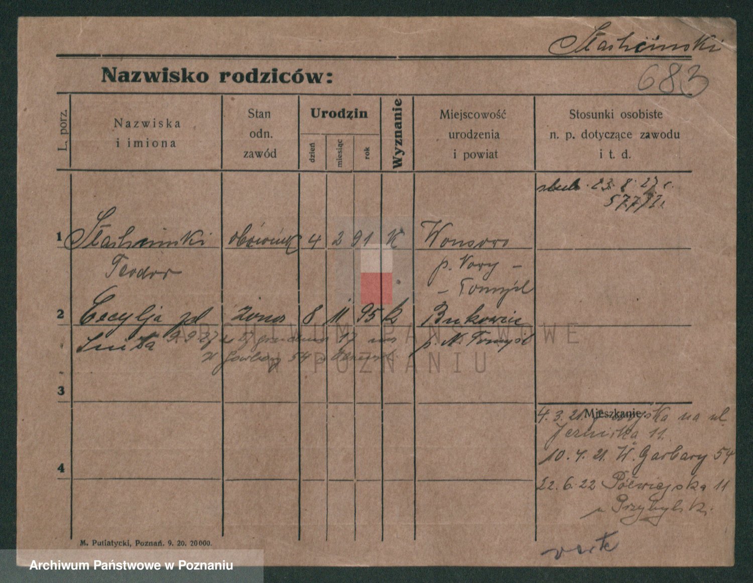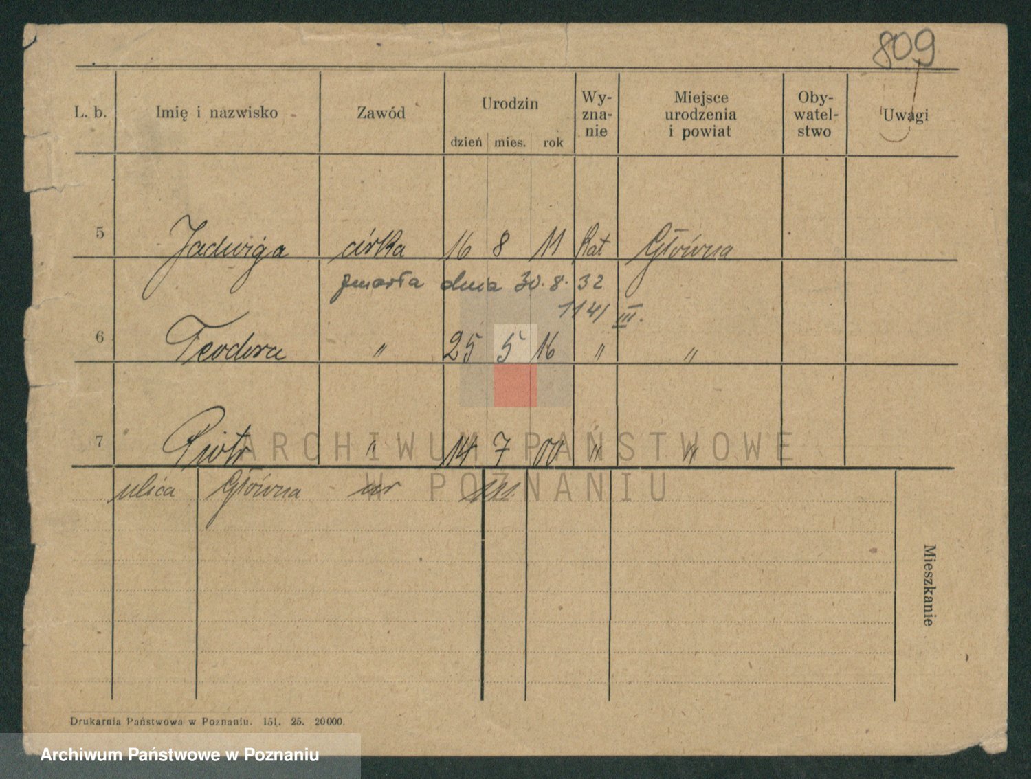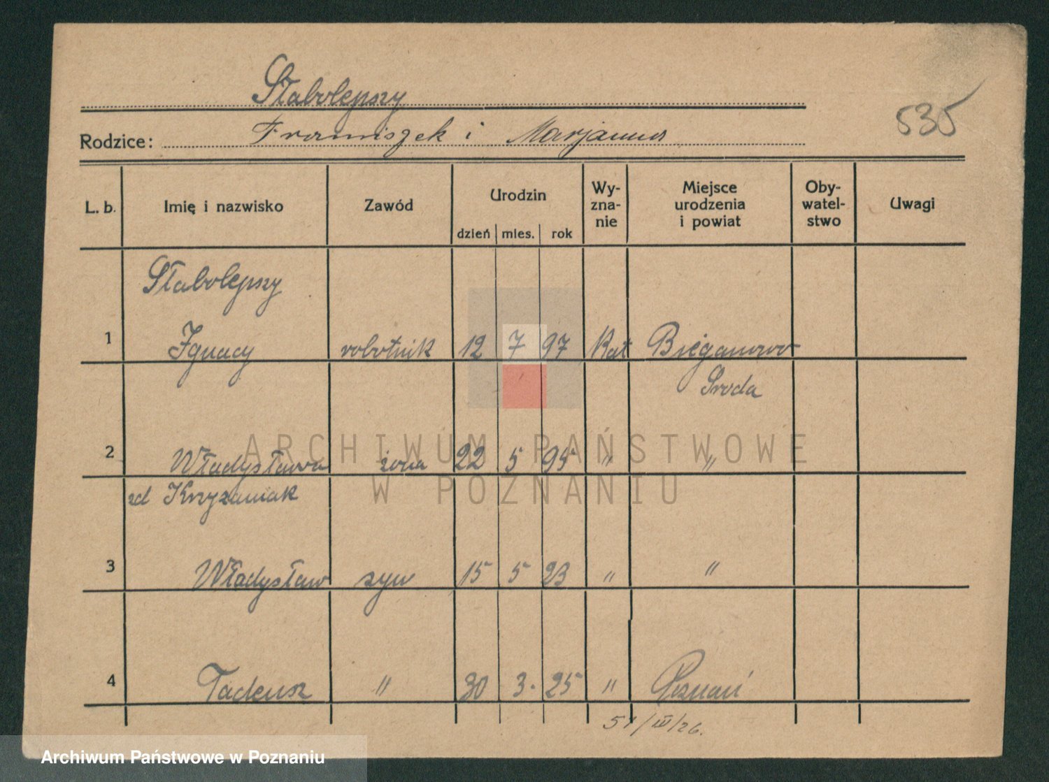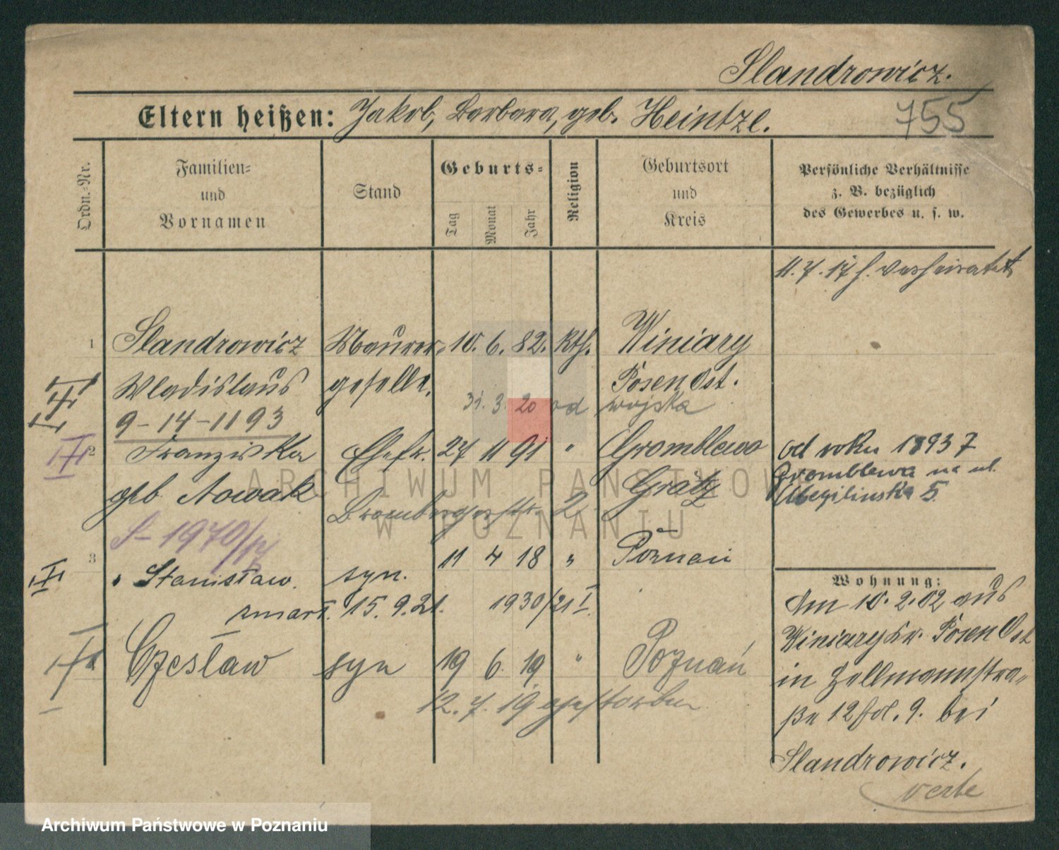 Podgląd karty osobowej dostępny jest po kliknięciu na nazwisko lub ikonkę karty. Można dokonywać powiększenia (ikony na górze) lub przechodzić między kolejnymi skanami (strzałki po bokach).
